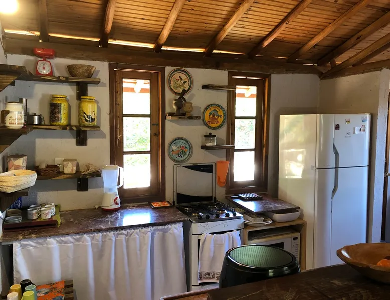 Kick back and relax in this calm, stylish space. Close to everything! Swimming pool and three bathrooms! The space Small cottage with unique architecture, simple, charming, and very comfortable! The house has two bedrooms: an en-suite with a king-size bed and full bathroom, and a bedroom with two single beds that can be joined together on request. In addition, there is a full social bathroom inside the house and a toilet outside next to the pool. The kitchen is complete and full of appliances, utensils, cutlery, glasses, and crockery. The living room has two sofas, one of which is a sofa bed and a chaise, as well as a TV with access to the basic SKY channels and Chromecast, enabling the mirroring of the customer's own streaming applications. The dining table seats 5-6 people. Outside, there is a balcony with a table, benches, chairs, and hammocks. Finally, there is an unheated swimming pool and a shower, both of which are restricted to the guests of the house, as well as a medium-sized barbecue! Guest access Take the street on the left when you arrive at the 3rd roundabout after the bridge. (Sicoob Bank Roundabout) Other things to note We prioritize reservations for at least two nights on weekends and offer discounts and special offers for inquiries and proposals in these situations!