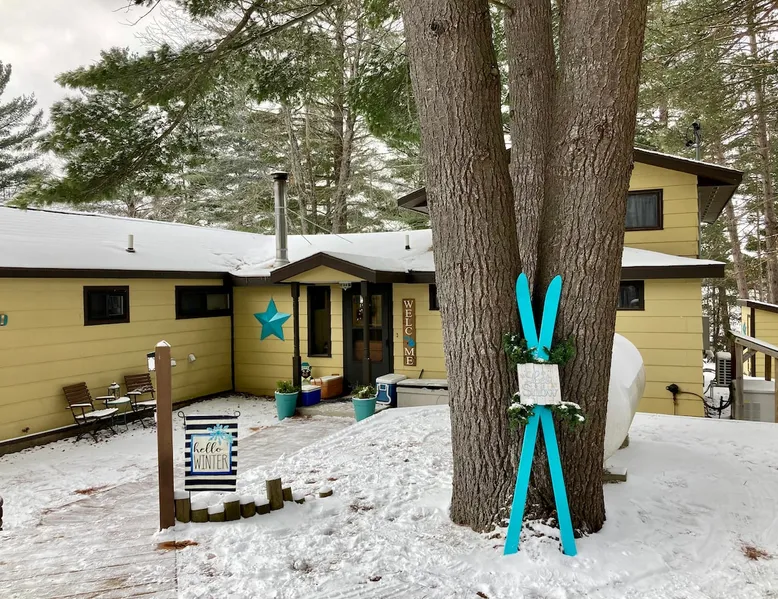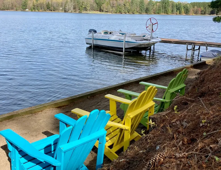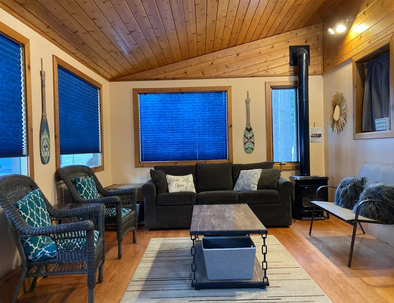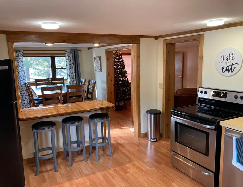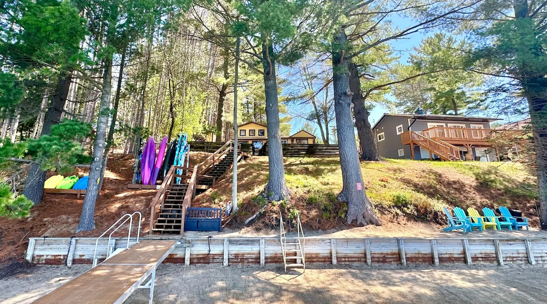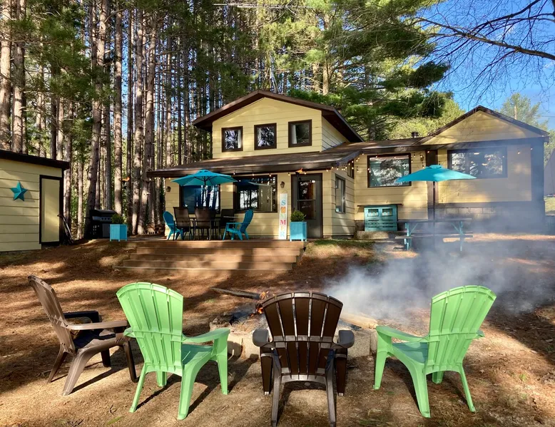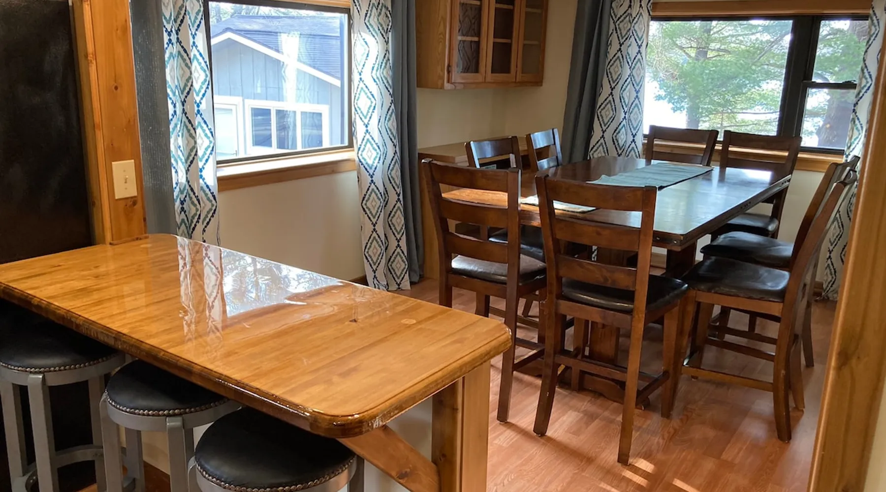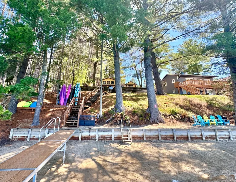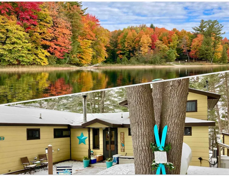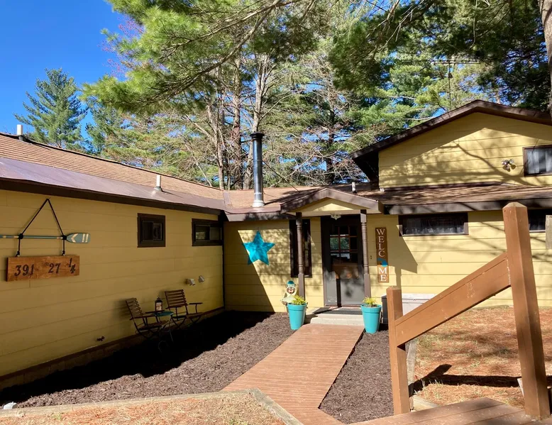 Calling all nature lovers! Experience the magic of all 4 seasons at this lakefront cabin situated on crystal clear "all-sports" Lake Meauwataka (10 mi N of Cadillac)! Open & spacious, this family friendly cabin is ideal for a multi-family get away. Unplug & relax amongst the majestic serene White Pines of the Manistee National Forest. An ALL SEASON destination for outdoor enthusiasts. Skiing, snowmobiling, snowshoeing, swimming, fishing, hunting, boating, scavenger hunts & more await! The space *25 Years old PREFERRED to book* *NOT A PARTY HOUSE* *NO PETS or PET REQUESTS* This countryside escape has a secluded and serene "Up North" feel, yet only a 10-15 min drive to shopping & restaurants in the City of Cadillac and only 1.5 miles away from the General Store which has almost everything you could need including delicious pizza, ice cream, alcohol & daily meal deals. Please Note: Our Cabin is located off a dirt road so if this doesn’t bother you keep reading….The property is surrounded by White Pines and perched upon 65 feet of lakefront sandy bottom access. Across the lake sits a township park, complete with a campground, hiking trails and sand dunes. There is also a 9-hole "volunteer-created" disc golf course. Location is well suited as a launch to many popular Michigan tourist destinations including Traverse City/Interlochen, Frankfort, Sleeping Bear Dunes National Lakeshore, Big Manistee River & the Ski/ Golf Resorts of Caberfae Peaks and Crystal Mountain. Hunters may inquire about local opportunities. This is a "Family-Friendly" Cabin. It is not high-end; however, it is lovingly cared for by the owners who use it often and take great pride in making it a fun and cozy place to make memories. It is 2000 square feet and features 2 FULL bathrooms. Sleeping: Sleeping Quarters include a Master Bedroom with gorgeous lakefront views (King & Single Bed Loft). The second bedroom (Queen) is tucked away and allows privacy and a bathroom nearby. The third bedroom (Bunkhouse) is the perfect spot to send the kids. Located on the lower level with it's own living area, this sleeping area features two sets of bunk beds (Full/Full & Twin/Twin). There are also sleeper sofas (great room/ lower living) twin futon in the laundry room, foldaway twin cot and pack & play. The open floor plan on the main level allows for lakefront views and interaction amongst guests in the kitchen, dining and great room areas. The great room features a wood burning stove, a large LED wall mounted Fire Feature & Smart TV. Wifi/TV: High speed internet for remote work. Smart TV with streaming options however you will need to use your own subscriptions for certain applications enabled through guest mode on the Roku TV. The TV also gets approximately 16 channels via antenna and there is a DVD player with many movie options to choose from. Many board games & crafty accessories are provided. Workspace: Desk with lake views in Master Bedroom. Kitchen: Our kitchen is fully equipped with all the appliances and tableware for your stay. There is a common pantry and spice basket. You are welcome to use any staples in the cabinets or condiments in the refrigerator if they are available, but we can't guarantee anything will be there for certain. It all depends on what people use and what people leave. Laundry Room: Washer/Dryer. Linens/Towels provided. Garage/Basement: Owner's private storage areas and not included in the rental. Shed: Open & available to use. Here you will find outdoor games, disc golf sets, campfire sticks, fishing poles etc.. Optional: Kids Clubhouse located above the garage. Inquire for Details. Heating/Cooling: The house has A/C in the master bedroom and Queen Bedroom. Tree cover, lake breezes and fans keep the rest of the house cool in the summer. The house has two furnaces, a wood burning stove and a propane stove. Backyard Amenities: Firepit, Dining Area, Pedal Boat, Kayak's (x3 Adult, x3 Youth), SUP's (x2), Tetherball, Corn Hole, fishing poles etc.. Seasonal Notes: The dock is removed Nov-April. Please inquire if booking during a transition period. Life Jackets Provided. Snow Removal: Removal service is triggered after an event causing more than 4 " accumulation since last removal. There will be occasions where there may be a few inches of snow on the driveway and walkway. A snow shovel and rock salt is provided. Please Note: There is an additional charge of $10 per night/Guest >6 guests to account for extra cleaning/laundry/septic charges. You will be communicating directly with the Property Owner and not a management company. Other things to note Pets are prohibited. Any evidence of pets will result in extra fees and potential rental termination. One exterior security camera monitors the front door.