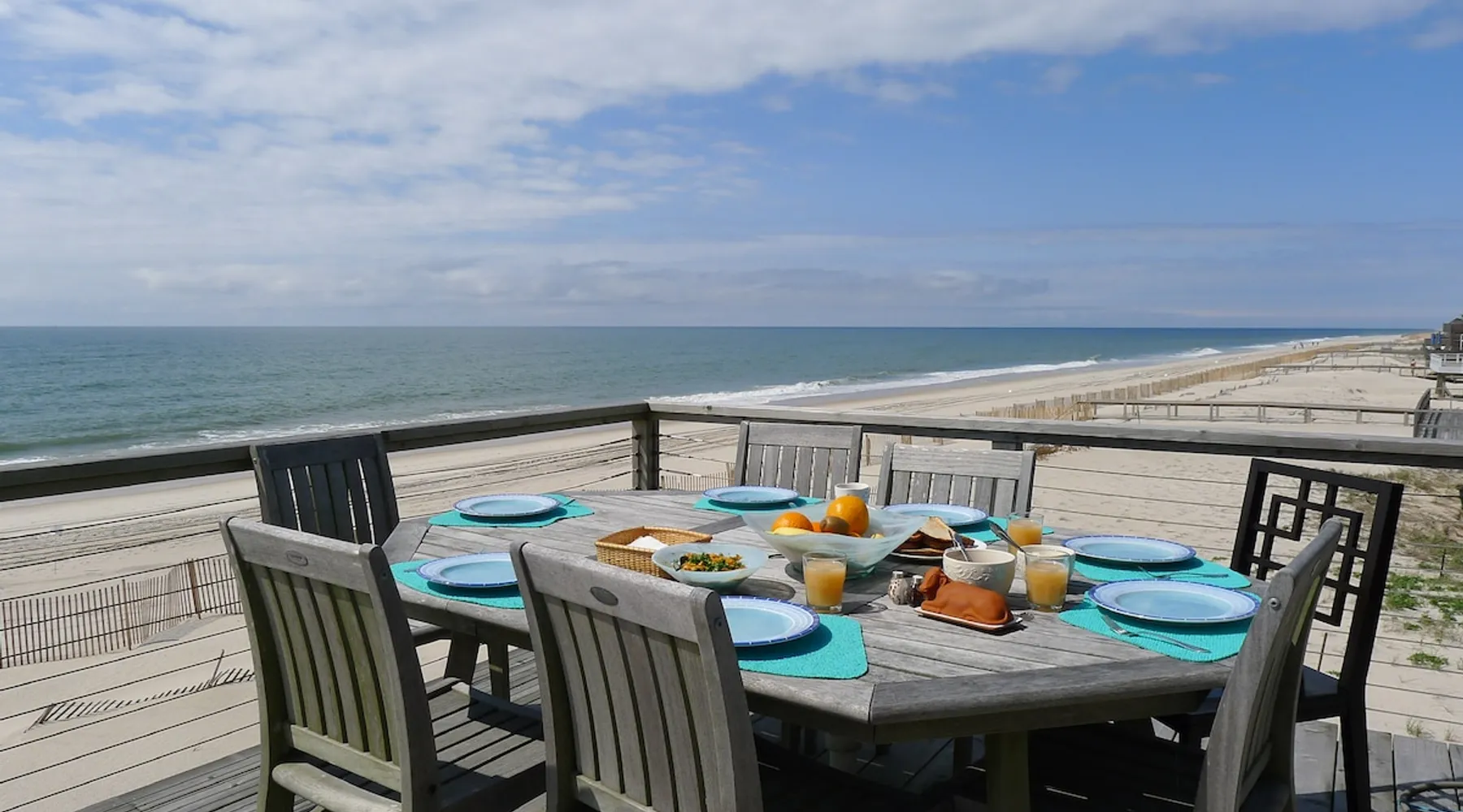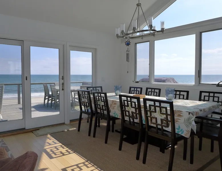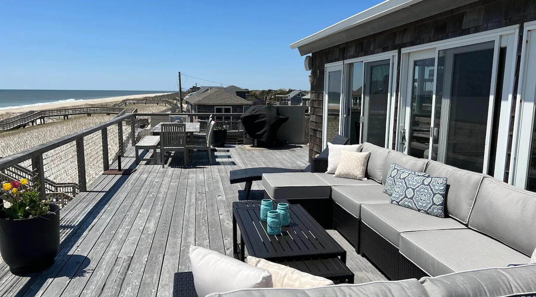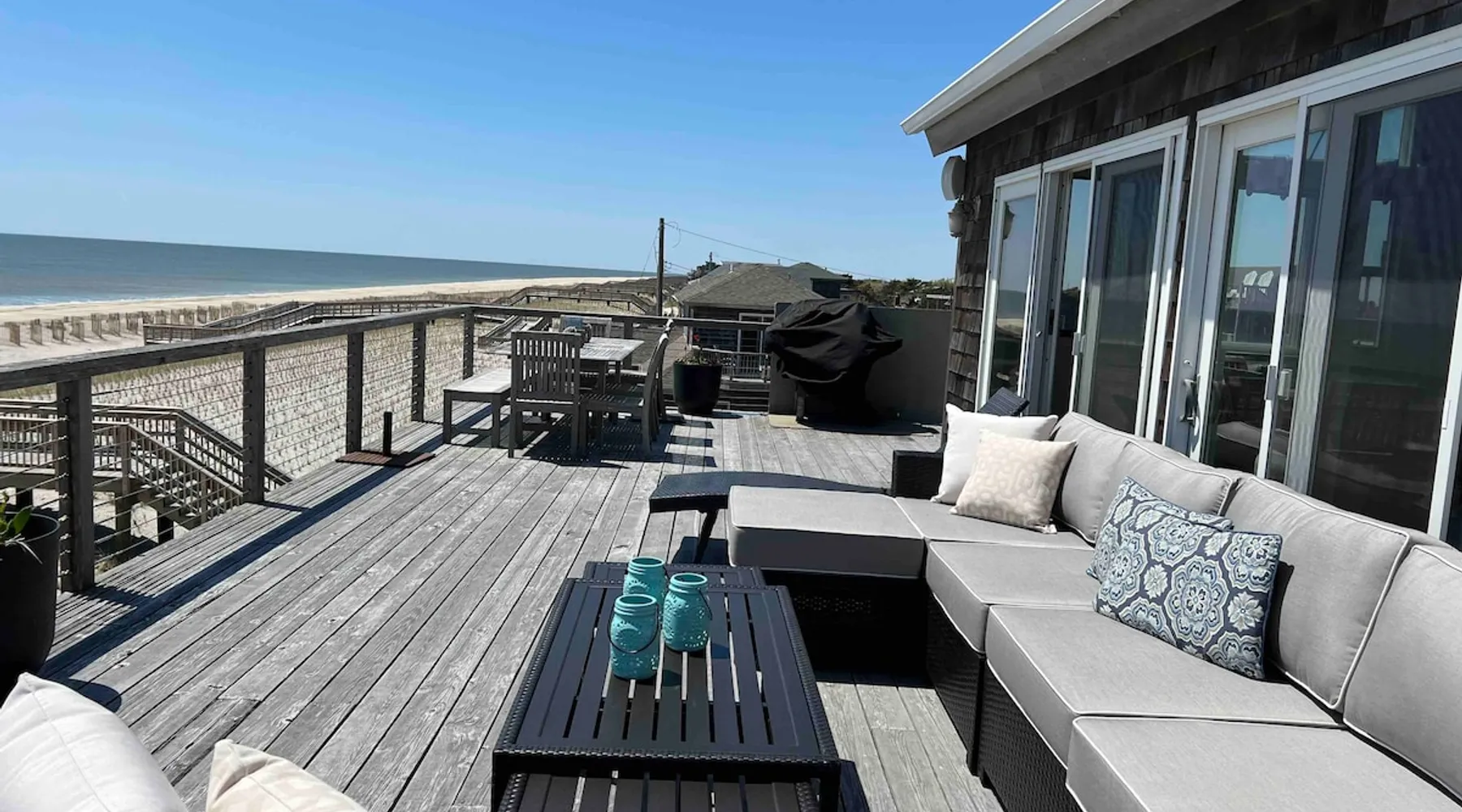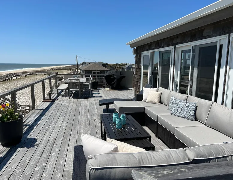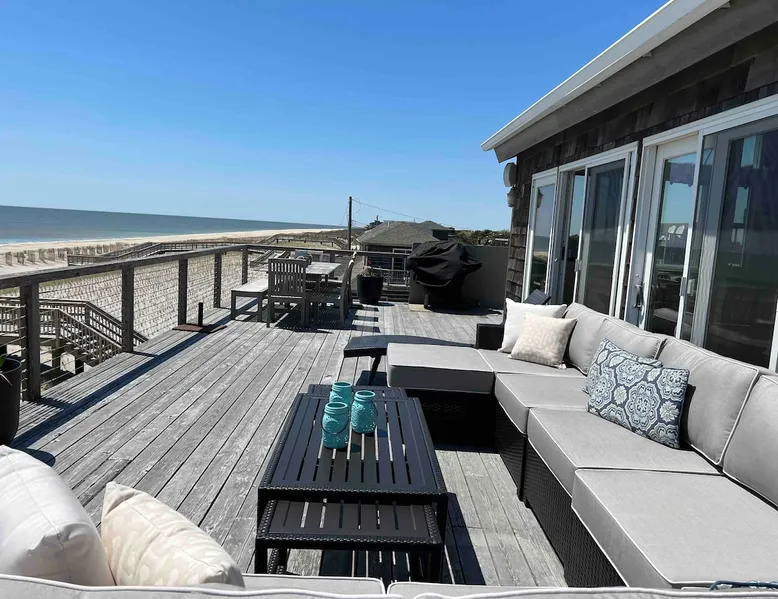 Oceanfront! Enjoy your coffee with the sunrise and your wine with the sunset overlooking the waves from our large wraparound deck. Comfy couches, teak table and chairs and deck umbrella. Clean well maintained home with space for friends and family. You’ll love my place because of the views, outdoor space, light, and the sound of the waves from every room. Great for families, friends, and good times! Memory Foam mattress pads and very comfortable beds! New Dishwasher - quiet! The space Amazing Fire Island Oceanfront Location can be yours! Enjoy frozen margaritas on the large deck of your own private modern retreat watching the waves roll in. View the ocean through walls of glass at this contemporary 5 bedroom 2.5 bath house with central a/c Best deck on the beach in Ocean Bay Park! Listen to the surf from your bed! 2 full modern bathrooms plus outdoor shower! large Smart TV, wireless internet, built in surround sound, built in deck speakers! Open living room/kitchen layout with 2 sets of sliding glass doors to large deck overlooking the ocean. Views views views! Everything you need for a perfect vacation including a BBQ, teak outdoor table, 2 outdoor sofa sets, beach chairs, toys, bikes, wagon, umbrella, kitchenware, linens and towels. House is recently renovated and meticulously maintained, including kitchen with granite countertops, bamboo floors and central air. Clean clean clean! Outdoor shower is a fire island necessity so you can listen to the waves while you shower. Fire Island has no cars in the summer, so the kids can walk and bike safely. You can watch them play on the beach from your cozy couch on the deck! There are plenty of bikes at the house and a wagon is left at the ferry dock for your convenience. Market/liquor store and several restaurants are a five minute walk from the house as well. Steps from the ferry. Nearby tennis, restaurants, shops. We also provide movies and games for your enjoyment! Guest access Entire Home Other things to note 5.5% Hotel Tax added to rent Please note guests will be required to sign a lease once property is booked .