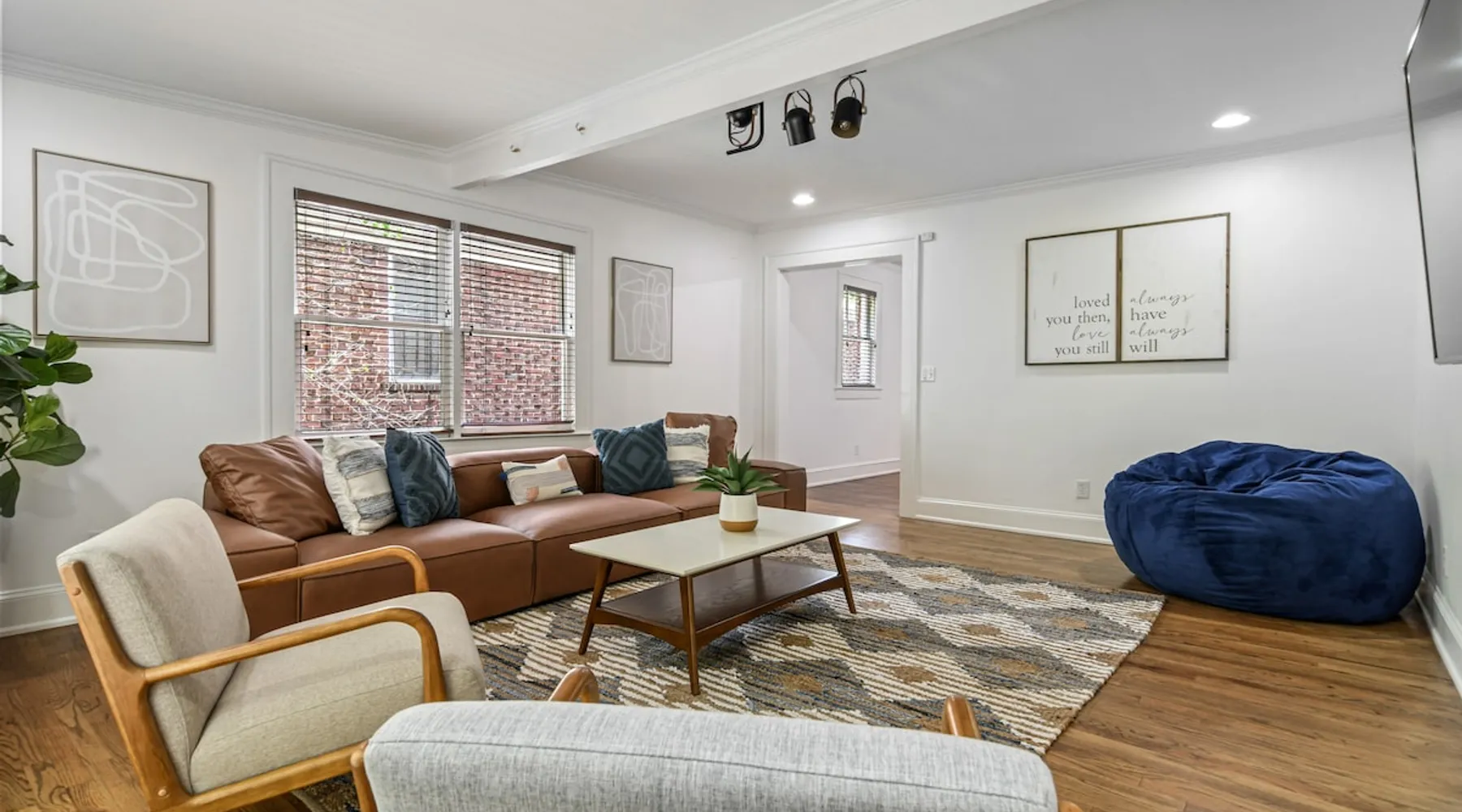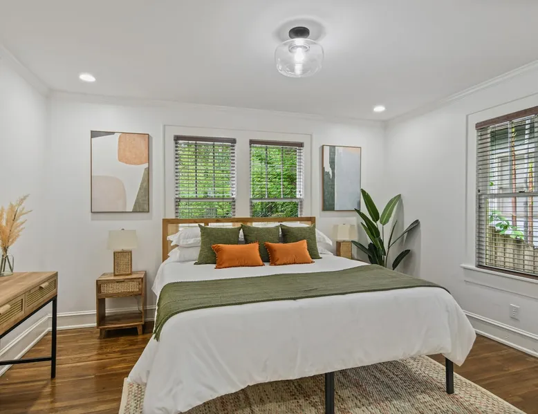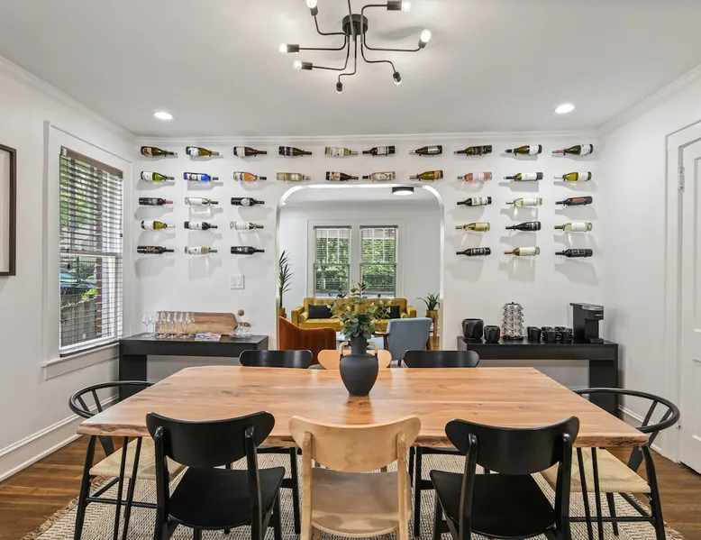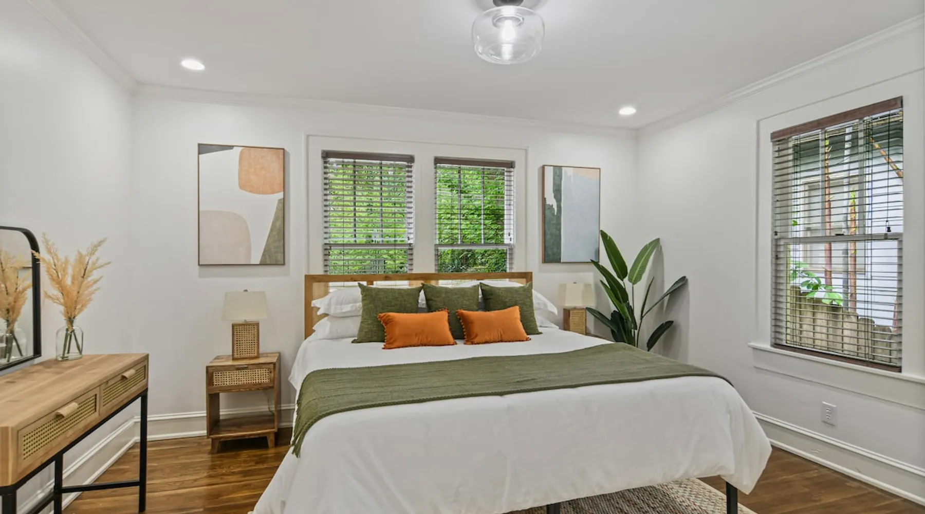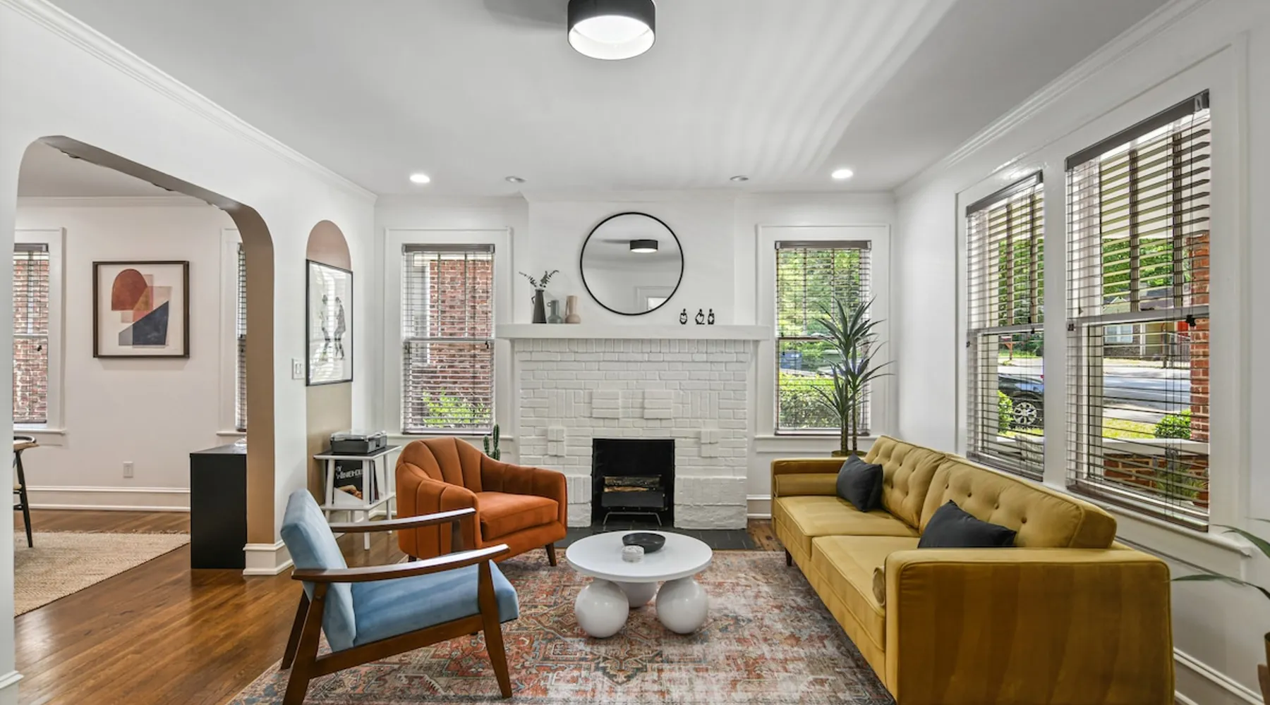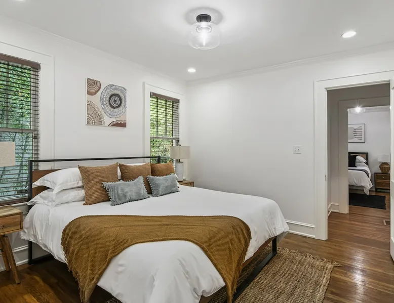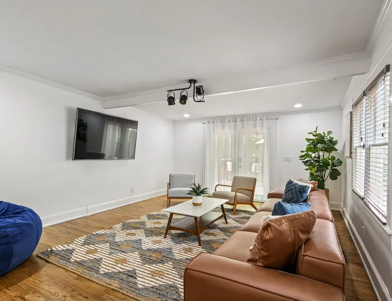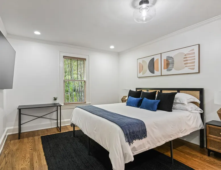 Filled with character, this 1920s bungalow offers a spacious layout perfect for family & friends. Artful, modern decor complements the newly renovated kitchen & bathrooms Key features include 2 LIVING ROOMS, 3 KING BEDS, THREE 70-INCH TVs, FAST WIFI, central heating & AC, plenty of fresh towels, 2 patios, a 2-car driveway & additional street parking Both of our homes are in the same neighborhood and ranked in the TOP 10% OF AIRBNB LISTINGS. Tap the profile picture to view the other house! The space Welcome to your "Home Away From Home" residential getaway. This 2,100-square-foot 1920s Bungalow is glowing with personality! From its original wood floors and doors to its newly renovated kitchen and bathrooms. We use Airbnb for overnight guest reservations only. Please find this home listed under the same name on popular production platforms for Film, Photography or other Creative projects! (RIGHT SIDE OF HOME) The front door opens to a spacious lounge room and workspace designed for conversational seating. You'll walk through an arch that leads to a full dining room and kitchen. The next opening will lead you to the main living room and back deck. (LEFT SIDE OF HOME) The spacious, comfortable bedrooms & bathrooms. Please note, these are the original windows and they do not open. LOUNGE ROOM (Right Side) • Colorful Mid-Century Modern Furniture fills the area • Conversational Seating around the decorative (only) fireplace • Pop-out your laptop to get some work done in an energetic space • Listen to records on the Vinyl player and enjoy the music DINING (Right Side) • This 8-seater live edge wood & iron table is great for a sit-down dinner • Wine Wall sets the vibe for a glass of wine (bottles available for purchase only) • The Coffee Bar was meant to give you a boost of energy • Alternative milk options are usually available KITCHEN (Right Side) • Cooking is made easy in this renovated kitchen equipped with pots, pans, baking sheets, utensils & silverware. • Cooking oil and Seasonings are also provided • Don't really cook? That's okay, use the microwave! • Clean up required: Hand wash or Dishwasher is available LIVING SPACE (Right Side) • Time to kick off your shoes and relax on a comfy 5-seater sofa • Enjoy the 70-Inch TV with Netflix, Hulu, Disney+, HBO Max, Amazon Prime TV, AppleTV & ESPN+ (all channels on all 4 TVs) _____________________________ MASTER BEDROOM (Left Side) • Relax on King Size bed while watching 70 Inch Samsung TV • Private en suite bathroom with Double Vanity, Large Tub, and Walk-in Shower with waterfall Shower Head • MakeShift closet in bathroom • Designated workspace with Desk & Chair THE GREEN ROOM (Left Side) • 1 King Bed • 70 Inch TV • Small Closet • Vanity Desk • Chair for seating THE BLUE ROOM (Left Side) • 1 King Bed • Nightstands + Reading Lamps • TV GUEST BATHROOM (Left Side) • Waterfall Shower • Sink LAUNDRY ROOM (Right Side) • Washer & Dryer • Laundry Detergent • Bleach • Dryer Sheets Guest access • Self Check-in with Smart Lock (custom code sent the morning of arrival) • Driveway holds 2 small cars. Additional free street parking is available • The backyard is not available to guests. Guests can access the entire inside of the property, front yard, driveway, and back deck. The backyard is blocked off as we do not upkeep it for guests. Other things to note COMMUNITY The Edgewood Retail District (a giant shopping center) is 2 minutes away and Includes a Starbucks, 5 Guys, American Deli, Smoothie King, Kroger, Target and many places to eat! FOR FAMILIES W/ SMALL CHILDREN • Pack & Play Crib & Bassinet • Baby bowls & eating utensils • High chair • Baby gate • Baby wash ATTRACTIONS • 1 mile to Little Five Points • 2.4 miles from The Beltline & Krog Street Market • 2 miles from Inman Park • 2.8 miles from Ponce City Market • 3 miles from Downtown • 3 miles from MLK museum • 3.3 miles from Virginia Highland • 4.1 miles from State Farm Arena (Atlanta Hawks) • 4.2 miles from Emory Hospital • 5 miles from Mercedes Benz football Stadium (Atlanta Falcons) • 5 miles from Georgia Aquarium and Coca-Cola Museum • 7 miles from Midtown and Piedmont Park • 11 miles from Buckhead • 12 miles from Atlanta Hartsfield-Jackson Airport Registration Details STRL-2022-00830
