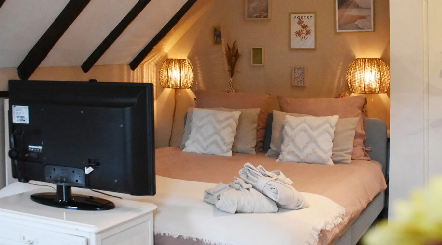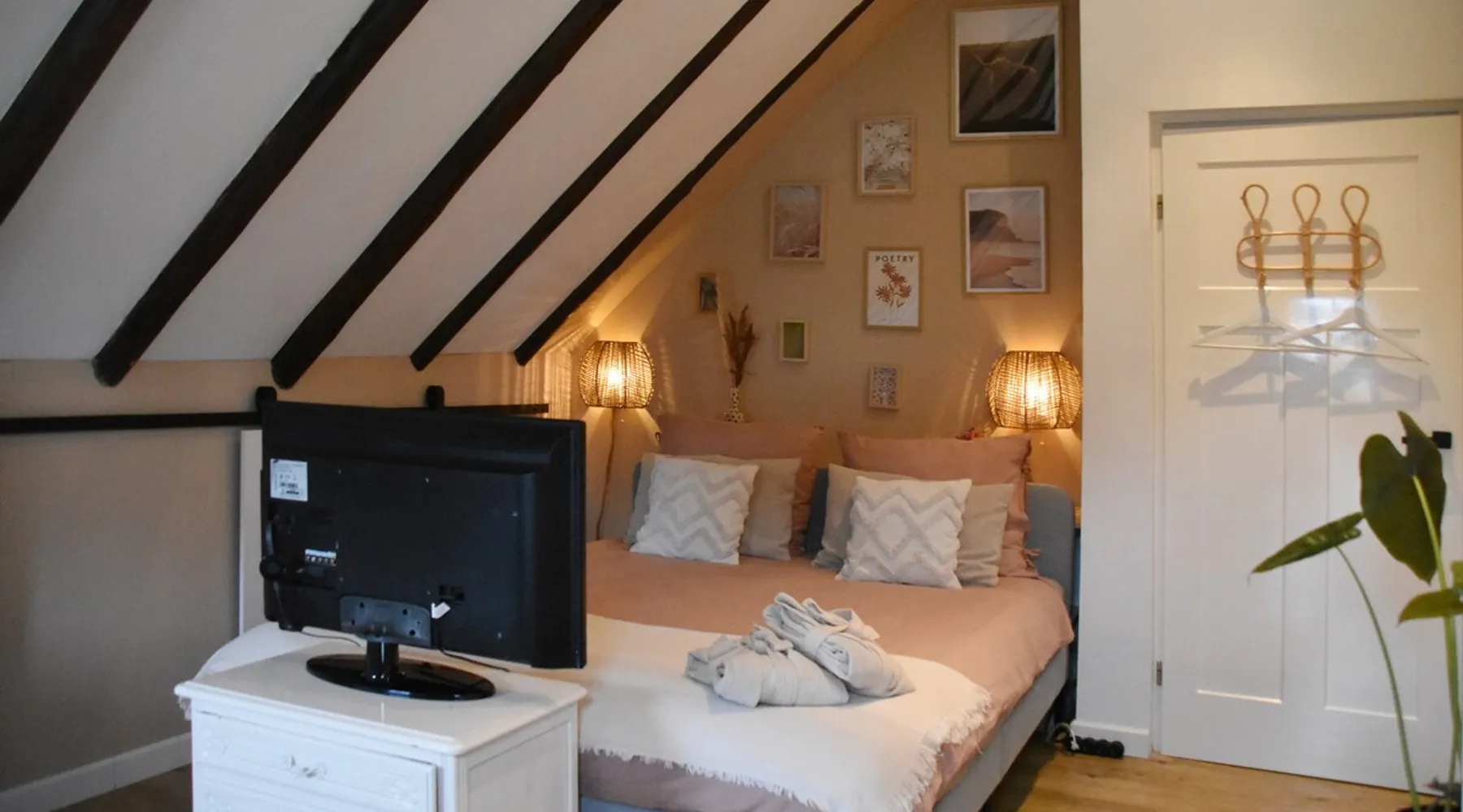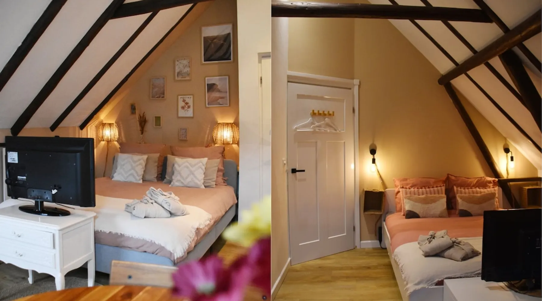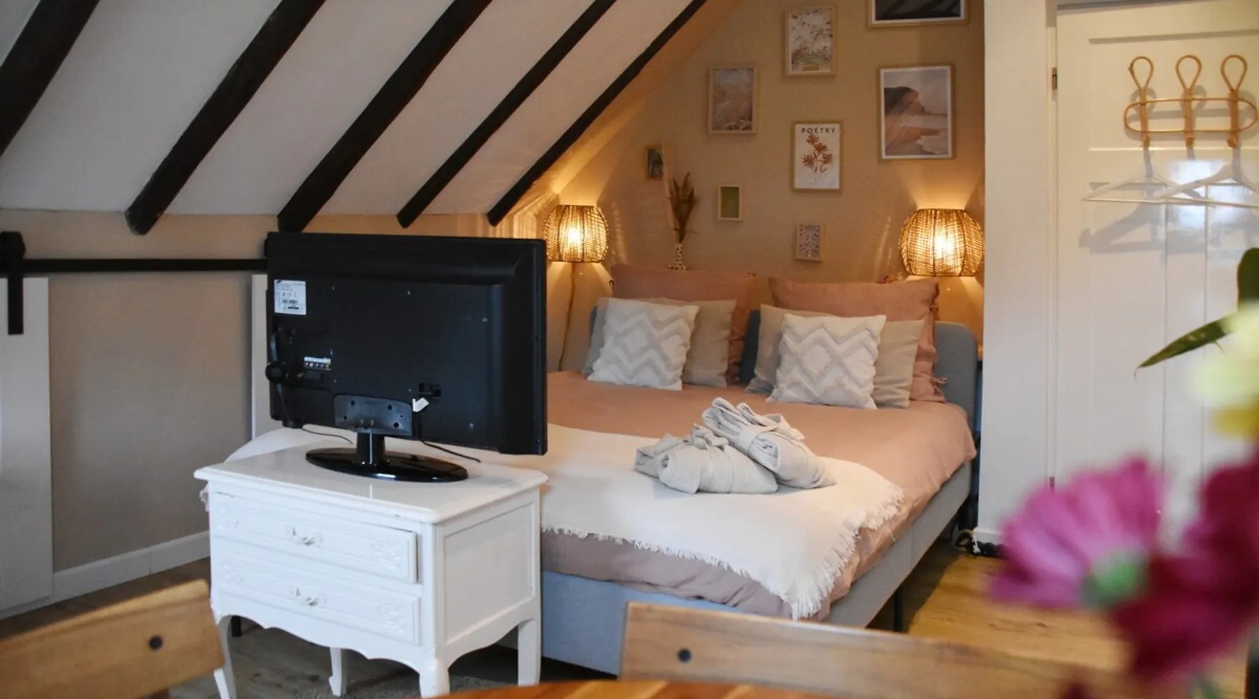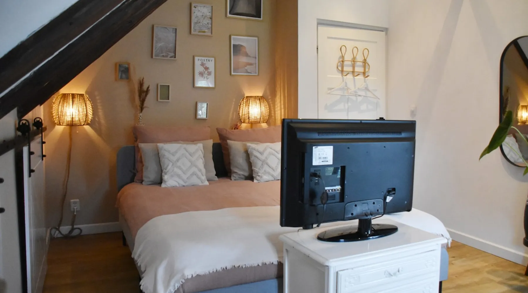 The B&B is located in a municipal monument from 1871. You can stay overnight with a maximum of four people in two authentic double rooms. If you come with 4 people, you will share the bathroom. If you come with 1 or 2 people, the luxurious bathroom is only for you. The rooms have a beautiful old beamed ceiling, double bed, table and chairs and a TV. Parking is available in front of the door and the center is within walking distance. Also enjoy the garden, with a canopy and an fireplace. The space The rooms are located in the house, on the first floor and accessible via a beautiful staircase. The rooms are attractively and warmly decorated and both have a lovely double bed, ample storage space, coffee corner, table with chairs, television, games, books and a refrigerator. You also have your own luxurious bathroom at your disposal, which is located in the hallway. You share this when you come to spend the night with 3 or 4 people. If you come as a couple, the other room is closed and the bathroom is private for you. This bathroom has a spacious walk-in rain shower, double sink and toilet. Both the room and the bathroom are fully equipped. So all you have to do is pack your toothbrush. From the rooms you have a view over the deep garden. In this garden there is a spacious table with chairs and a large parasol and at the back of the garden there is a lovely canopy with a fireplace where you can enjoy a drink in the evening or in winter. Guest access During your stay you can use your attractive room with a place to have breakfast or dinner and the bathroom on the same floor. In addition, the entire garden can be used, both the terrace and the space under the canopy. Do you want to use the kitchen to cook? Then this can be done in consultation. You will also receive your own key for your own entrance at the back of the house. During your stay During your stay there will always be someone in or around the house, because we also live here. If this is not the case because we quickly run an errand, you can always reach me on mobile or send a message via AirBnB. Other things to note Would you like to enjoy breakfast in bed or together in the room during your stay? Then it is possible to book this on site. Please indicate this when you make your reservation and we will be happy to serve you a fresh and varied breakfast.