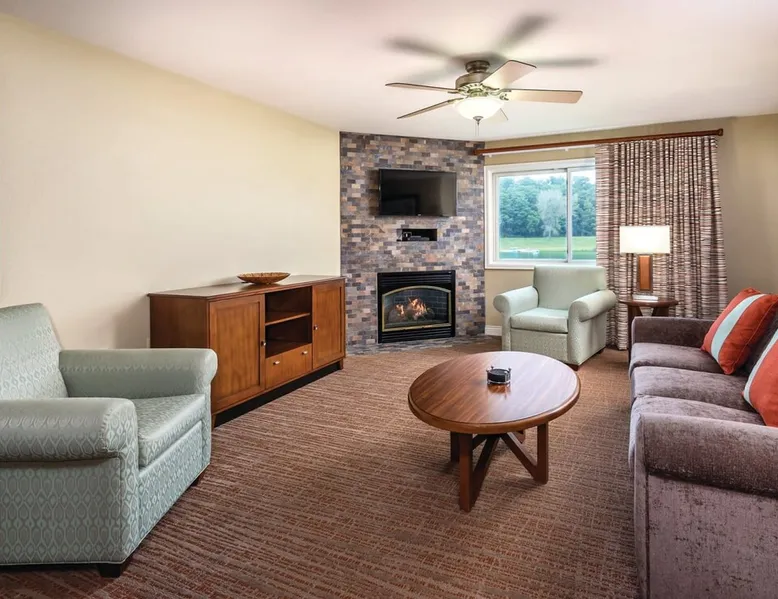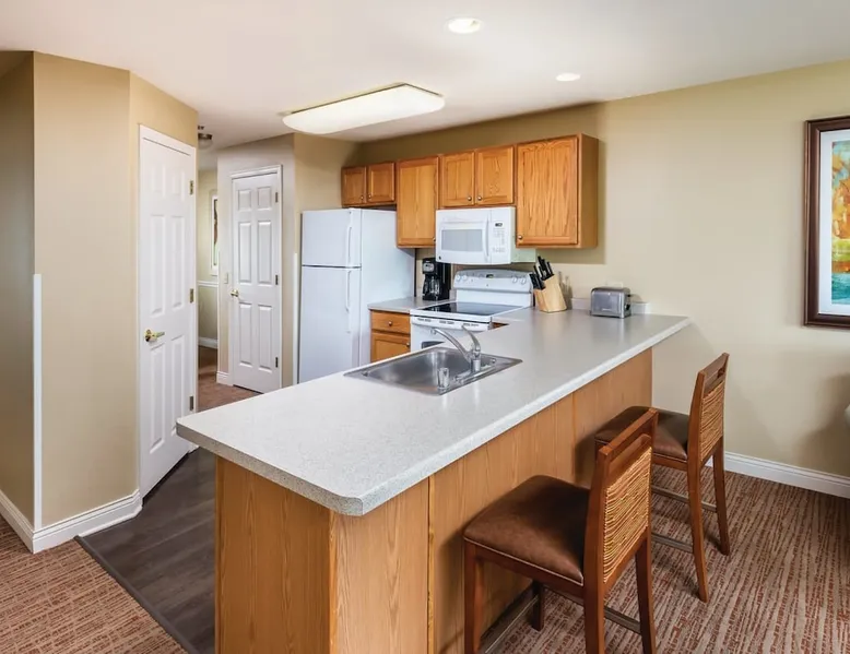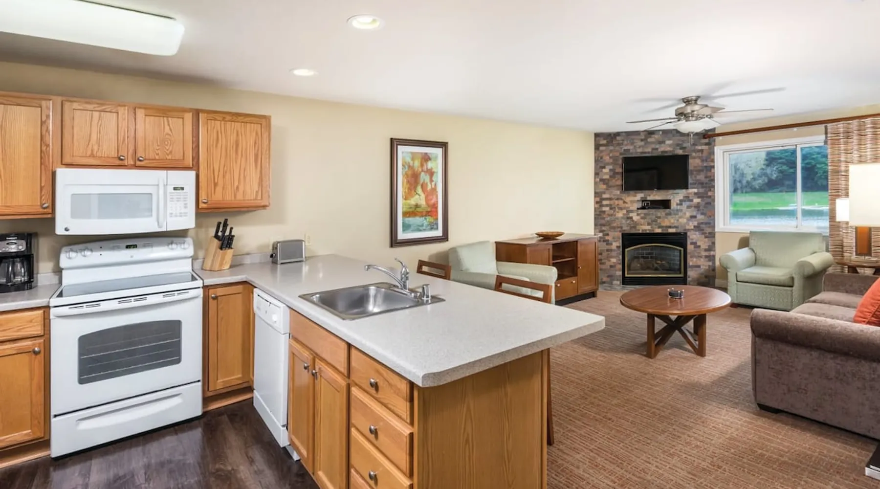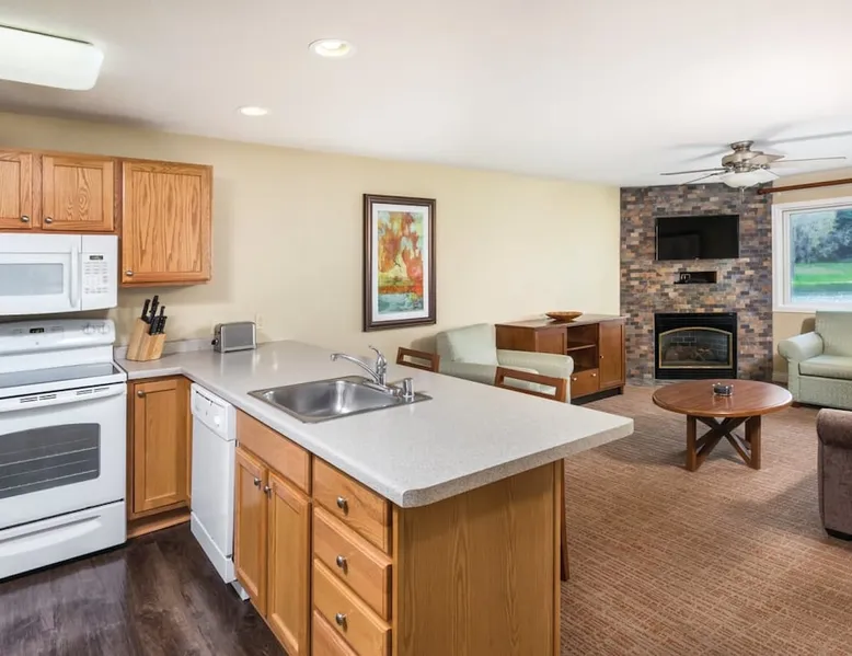 Surrounded by sandstone rock formations, this resort is ideally located in a quieter spot with plenty of fresh air and wide-open spaces. The mixture of nearby forests, lakes, rivers, and streams makes for a perfect landscape full of outdoor adventure. Wyndham Tamarack Resort|1BR/1BA King Balcony Suite • Size: 795 - 795 • Kitchen: Full • Baths: 1 • Accommodates: 4 Guests • Beds: King Bed - 1 Queen Sleeper Sofa - 1 The space Room Amenities • Pack ’n Play/travel crib available upon request • Barbecue Grill (Outdoor) • Hairdryer • Washer/Dryer In Unit • Broadband Internet Access • DVD Player • Television • Balcony/Patio • Fireplace Resort Amenities • Activities Center • Activities Desk • Arcade Games • Barbecue Area • Basketball • Catch-And-Release Pond • Children's Playground • Children's Pool (Indoor) • Computer With Internet (Shared) • Concierge Services • Conference Room • Fitness Center • Game Room • Horseshoes • Hot Tub (Indoor) • Lap Pool (Indoor) • Locker Rooms • Movie Rentals • Owner Lounge • Picnic Area Guest access • Some suites do not have a lake view. A lake view can be requested but cannot be guaranteed. • Check in is located at Wyndham Vacation Resorts at Glacier Canyon, 45 Hillman Road, Baraboo, WI 53913. Physical address is 874 Xanadu Road, Lake Delton, WI 53965. • Super store and groceries, less than half a mile away; good selection of area restaurants • Car recommended to fully enjoy area • This is a non-smoking resort • A credit card is required for the $250 security deposit requested at check in. • We require the guest information for the primary guest (should at least be 21 years old) checking in to be provided as soon as possible to avoid check-in issues. Other things to note • Photos are not of the specific suite you are renting and your suite may vary slightly from the photos. • You have full access to all resort amenities for the duration of your stay, including on your arrival and departure day. • We will always place you in the best suite available, however we cannot guarantee a specific location in the resort. • Your suite may be a mobility accessible unit. • Information in this listing is provided by the resort and not independently verified. • We are not affiliated with the resort, you are renting directly from a timeshare owner. We help timeshare owners cover their HOA and maintenance costs when they can't use their properties. • You may be asked to watch a timeshare presentation, however you are under no obligation to do so and we recommend politely declining if you are not interested. • The guest checking in must be 21+ years old and present a valid credit card for a refundable damage deposit due at check-in. • Guests are required to accept additional terms and conditions in accordance with the resort's policies, including any applicable taxes and fees paid to the resort. • No refunds or credits will be granted outside of the listing's cancellation policy.