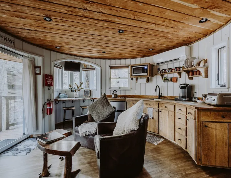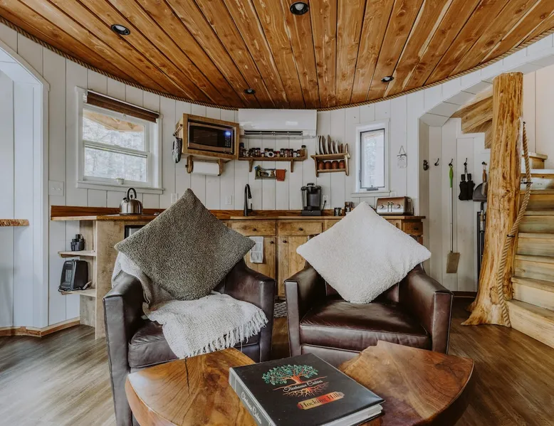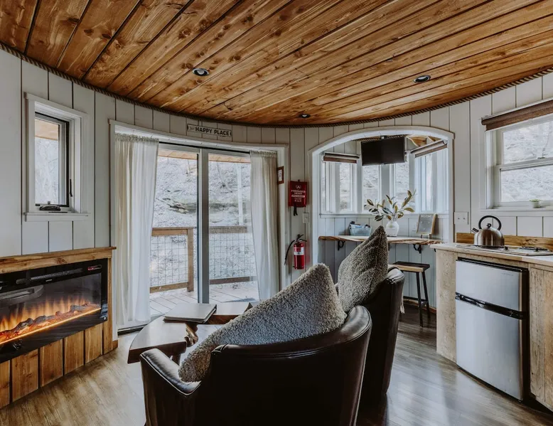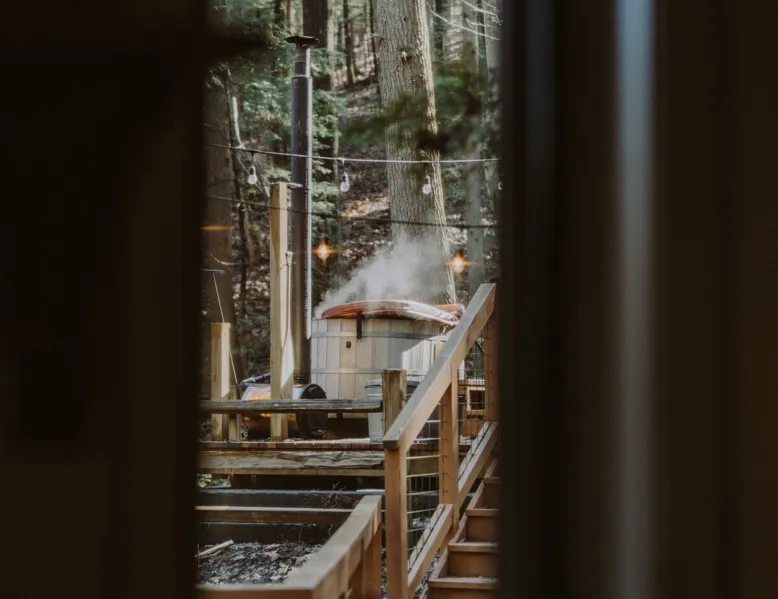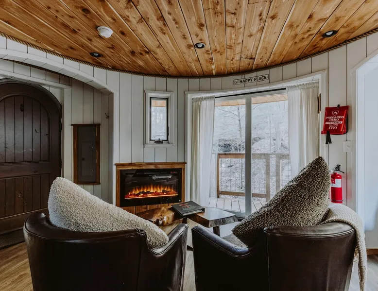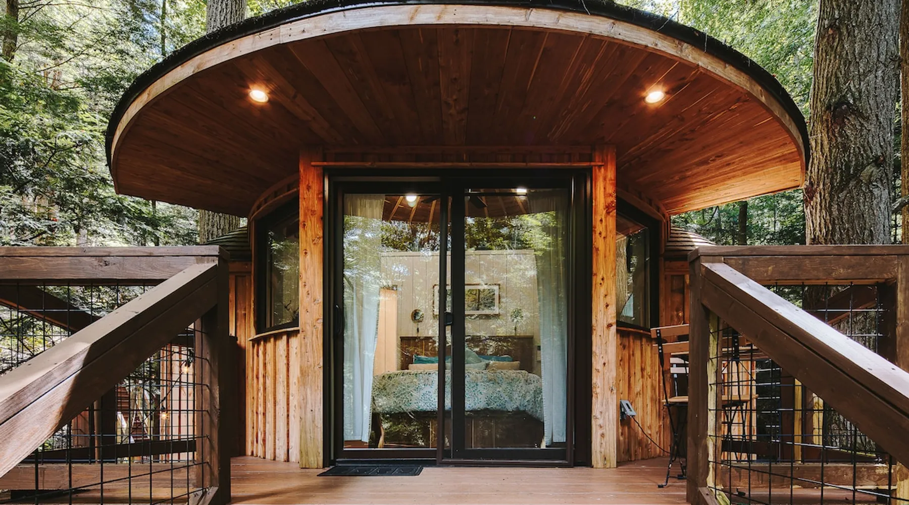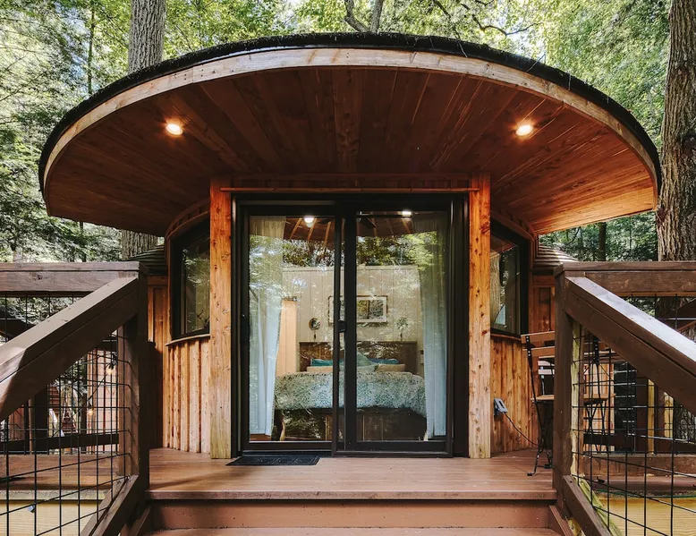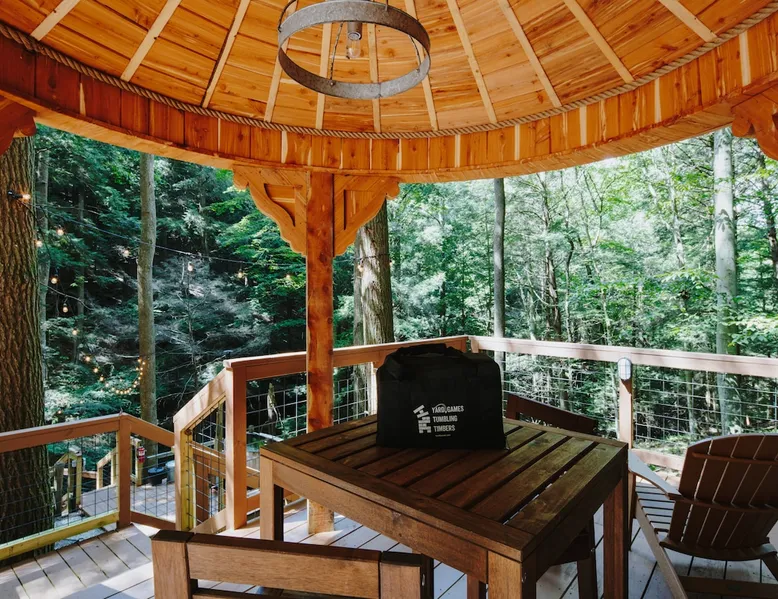 Authentic treehouse cabins in the scenic Hocking Hills region in SE Ohio. Located on 15 private acres, minutes from Hocking Hills State Park and popular attractions. If you're looking for a unique and memorable reTREET for your family, then look no further than our original treehouse, The Hemlock. The space This Treehouse features incredible views (our best yet!), with our first infinity view en suite. We have designed the upper deck so there are unobstructed views of the treetops from the comfort of the bed. The Hemlock is the most secluded of our treehouses with the most commanding views. Over 70 steps to reach your private reTREEt. The Hemlock is the ultimate treetop getaway for two. Sleeps: sleeps up to two one-bedroom (Queen),linens, and pillows Bath: indoor bathroom and seasonal outdoor shower, towels, shampoo, conditioner, soap, hairdryer Kitchenette: dishes, glasses, and utensils for two cookware, mini-fridge, electric 2-burner cooktop, microwave, Keurig, kettle, and French Press, toaster, Crock-Pot, electric griddle, basic spices, starter supply of K-cups, and ground coffee A/C and Heat WiFi, TV, DVD player, variety of DVDs, board games, books, electric fireplace Outside: charcoal grill, grill tools, charcoal, lighter fluid, lighter, fire pit set with extra wood, outdoor seating areas, wood-fired hot tub, additional firewood available onsite for purchase Pet-Friendly - with an additional fee please include them in the optional extras. Pet bed, waste bags, pet towel, pet bowl. Guest access Check-in is between 4:00 pm - 6:00 pm. However, we ask that you arrive by 5:30 pm so that we have time to properly check you in and show you how to use the wood-fired hot tub. Without being adequately checked in, you will not be able to use the hot tub wood stove. Please call to make alternate check-in arrangements if you can not check-in before 6:00 pm.* Guests will need to provide a credit card at check-in.