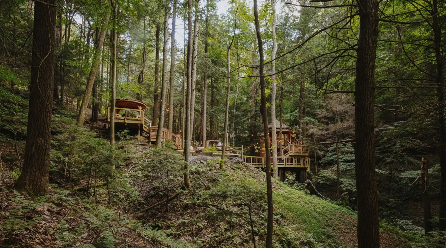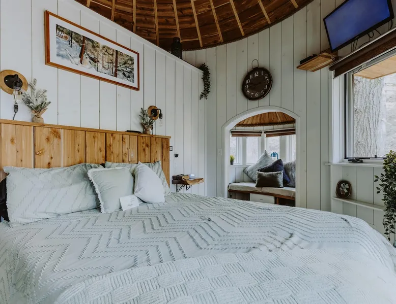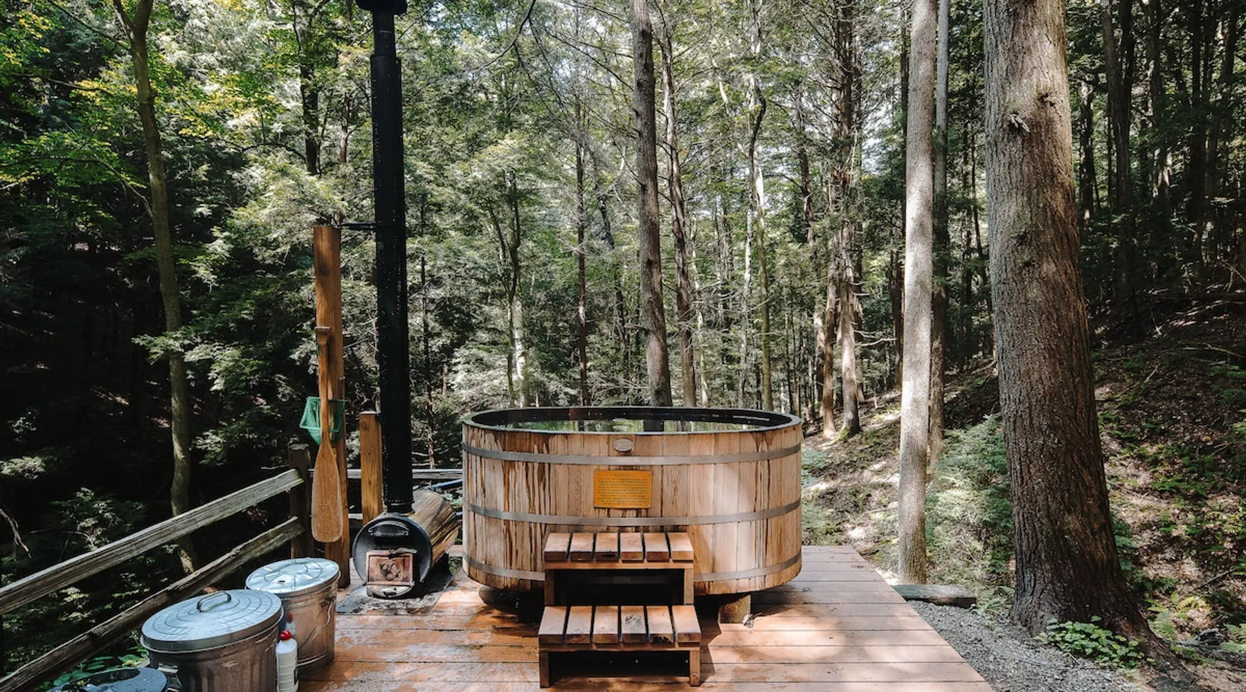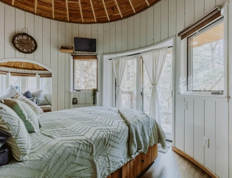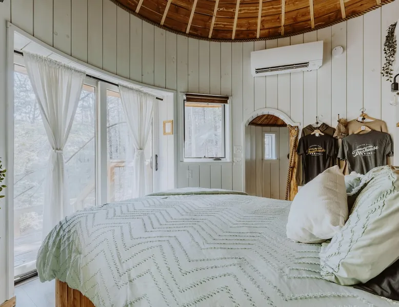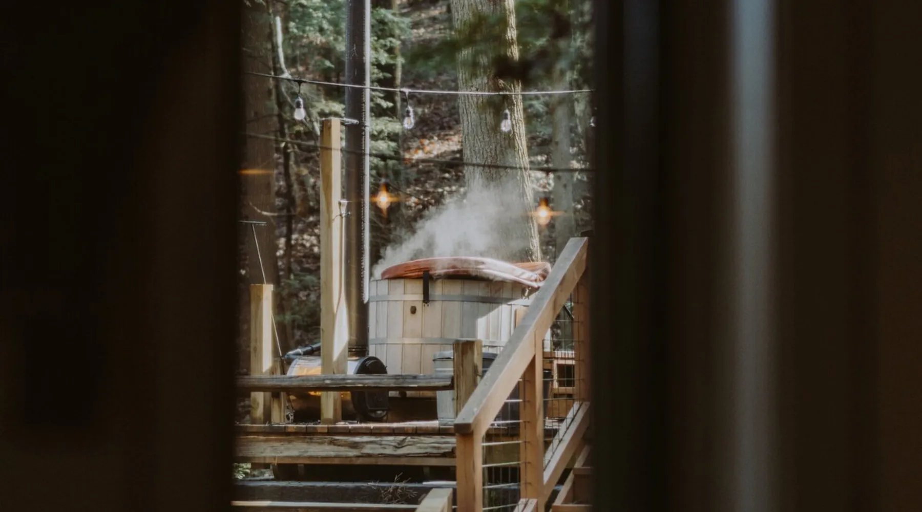 Authentic treehouse cabins in the scenic Hocking Hills region in SE Ohio. Located on 15 private acres, minutes from Hocking Hills State Park and popular attractions. If you're looking for a unique and memorable reTREET for your family, then look no further than our original treehouse, The Hemlock. The space This Treehouse features incredible views (our best yet!), with our first infinity view en suite. We have designed the upper deck so there are unobstructed views of the treetops from the comfort of the bed. The Hemlock is the most secluded of our treehouses with the most commanding views. Over 70 steps to reach your private reTREEt. The Hemlock is the ultimate treetop getaway for two. Sleeps: sleeps up to two one-bedroom (Queen),linens, and pillows Bath: indoor bathroom and seasonal outdoor shower, towels, shampoo, conditioner, soap, hairdryer Kitchenette: dishes, glasses, and utensils for two cookware, mini-fridge, electric 2-burner cooktop, microwave, Keurig, kettle, and French Press, toaster, Crock-Pot, electric griddle, basic spices, starter supply of K-cups, and ground coffee A/C and Heat WiFi, TV, DVD player, variety of DVDs, board games, books, electric fireplace Outside: charcoal grill, grill tools, charcoal, lighter fluid, lighter, fire pit set with extra wood, outdoor seating areas, wood-fired hot tub, additional firewood available onsite for purchase Pet-Friendly - with an additional fee please include them in the optional extras. Pet bed, waste bags, pet towel, pet bowl. Guest access Check-in is between 4:00 pm - 6:00 pm. However, we ask that you arrive by 5:30 pm so that we have time to properly check you in and show you how to use the wood-fired hot tub. Without being adequately checked in, you will not be able to use the hot tub wood stove. Please call to make alternate check-in arrangements if you can not check-in before 6:00 pm.* Guests will need to provide a credit card at check-in.