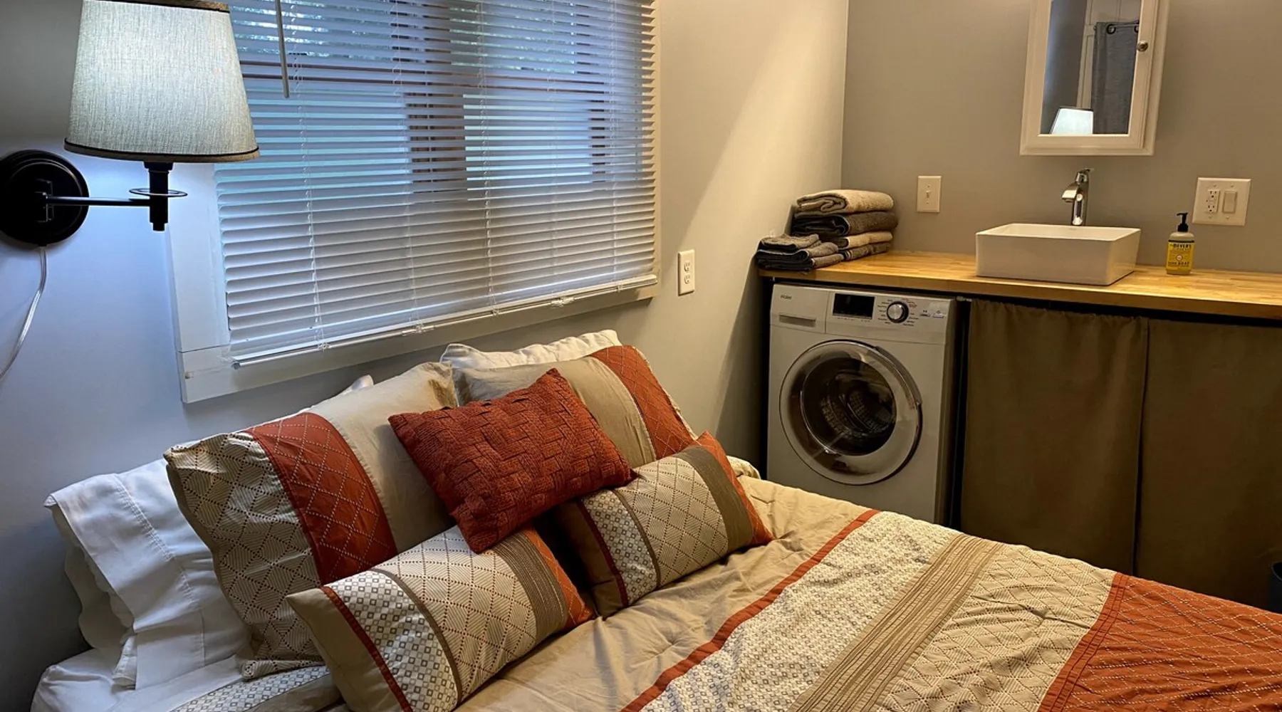 A unique setting with a functional modern style. Surrounded by a whimsical and unruly garden, this little guest house incorporates modern materials and aesthetic. A fifteen minute walk on a paved path will get you to Switchyard Park where you will find a state-of-the-art playground, dog parks, a pavilion where there are at different times food trucks and a farmers' market. There is also a skate park, pickle ball courts, a community garden, a splash pad and a stage for music events.