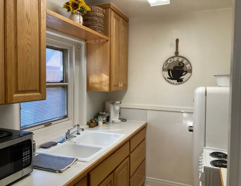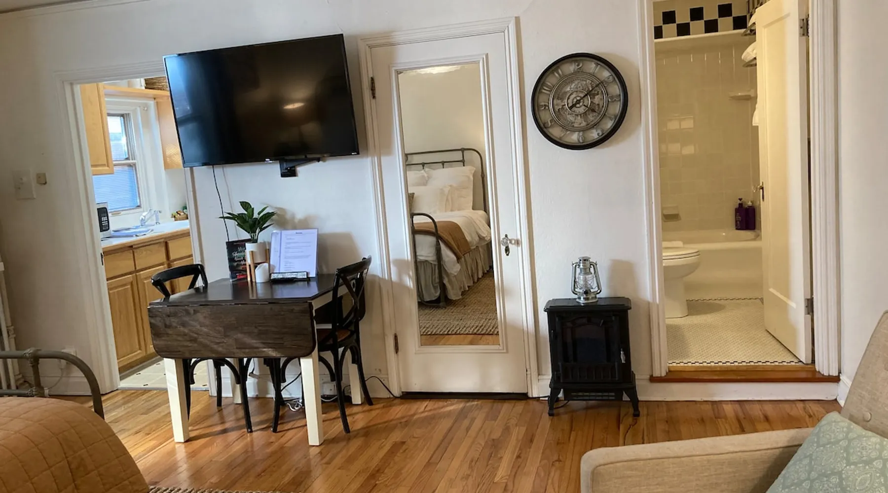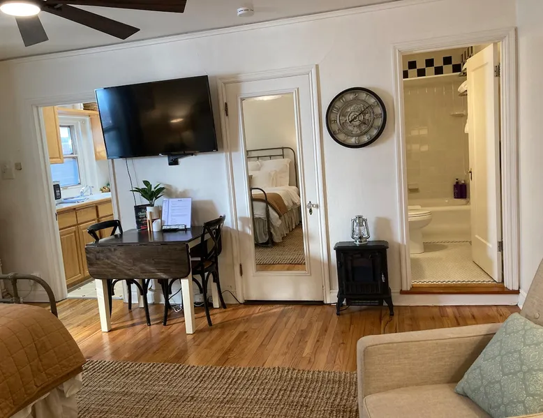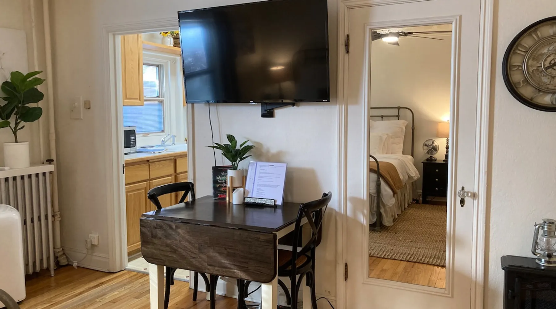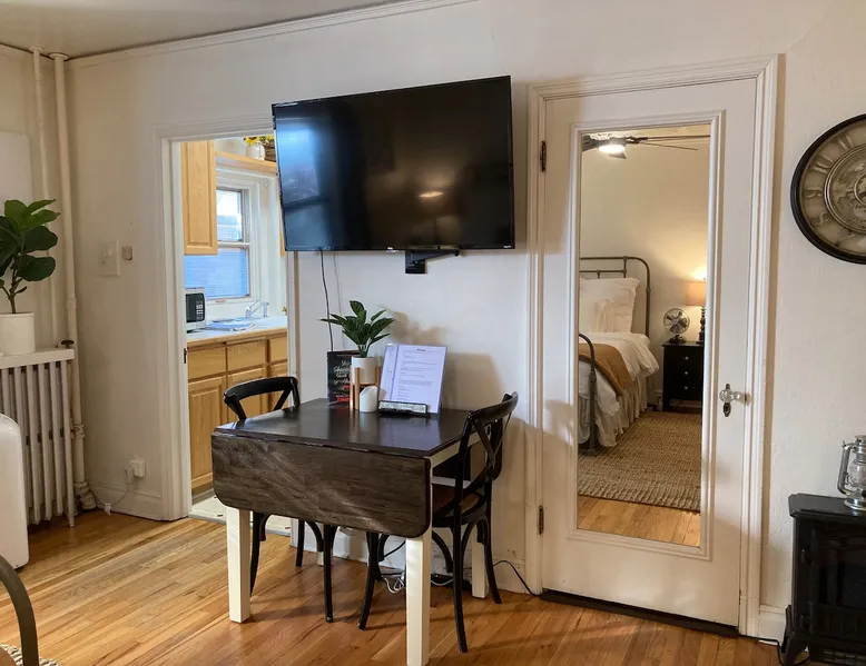 Enjoy easy access to everything from this perfectly located home base. Located on the main floor of our apartment building. This studio apartment has a king size bed, two reclining chairs, dining area, full-size bath and fully equipped kitchen. The apartment is just over 4 blocks from downtown and 2 blocks away from campus. The space This studio apartment is located on the main floor of the apartment building. So there is a half a flight of stairs to get to it. As for noise, the door to it is in the middle of the hallway, so you may hear other guests and tenants passing by. There is an apartment above it, with the hardwood floors, you do hear the tenants above, walking around. Parking for the apartment is all street parking around the residential area. There’s a few areas that require permits during the week, so I have a map in the apartment to let you know where these spaces are.