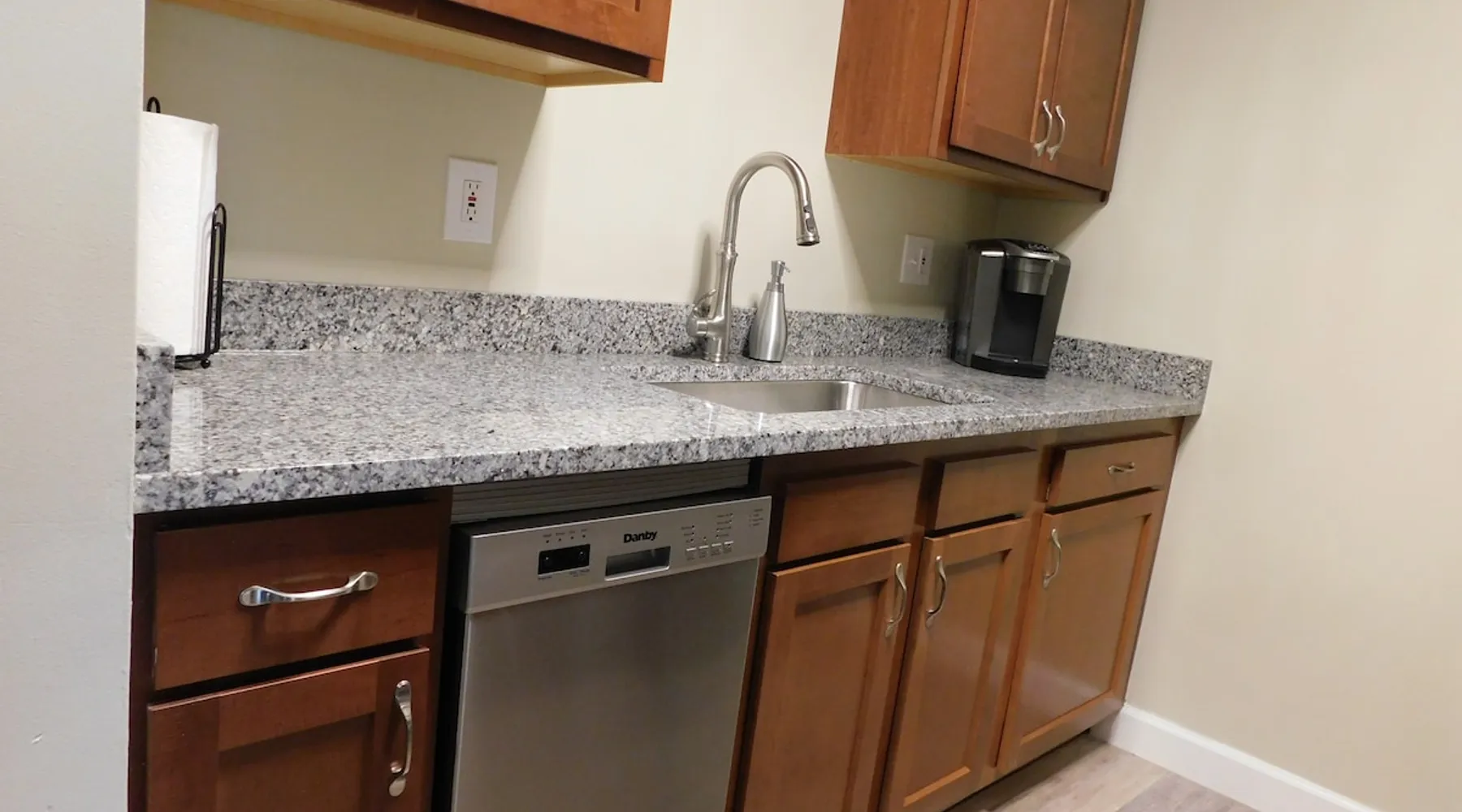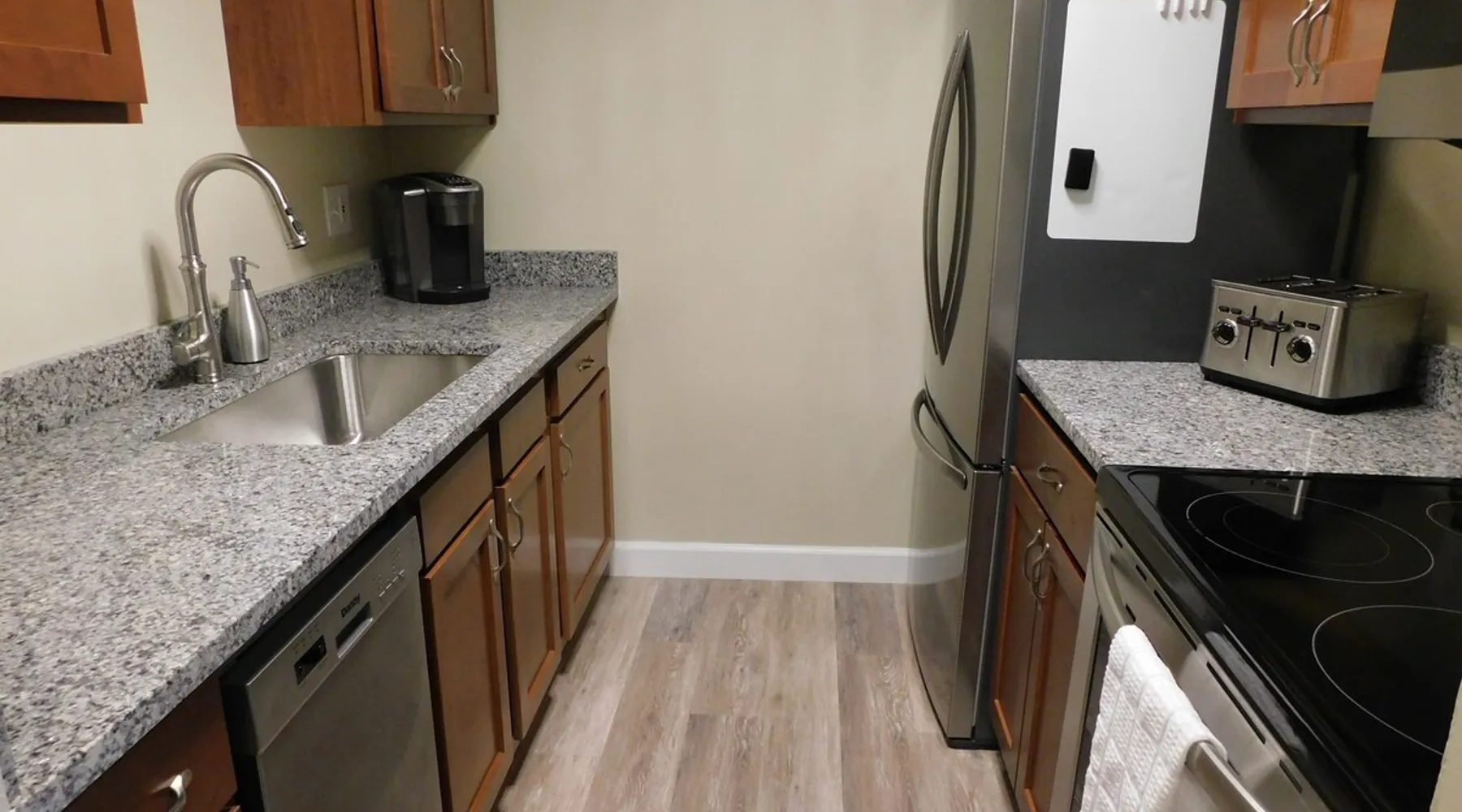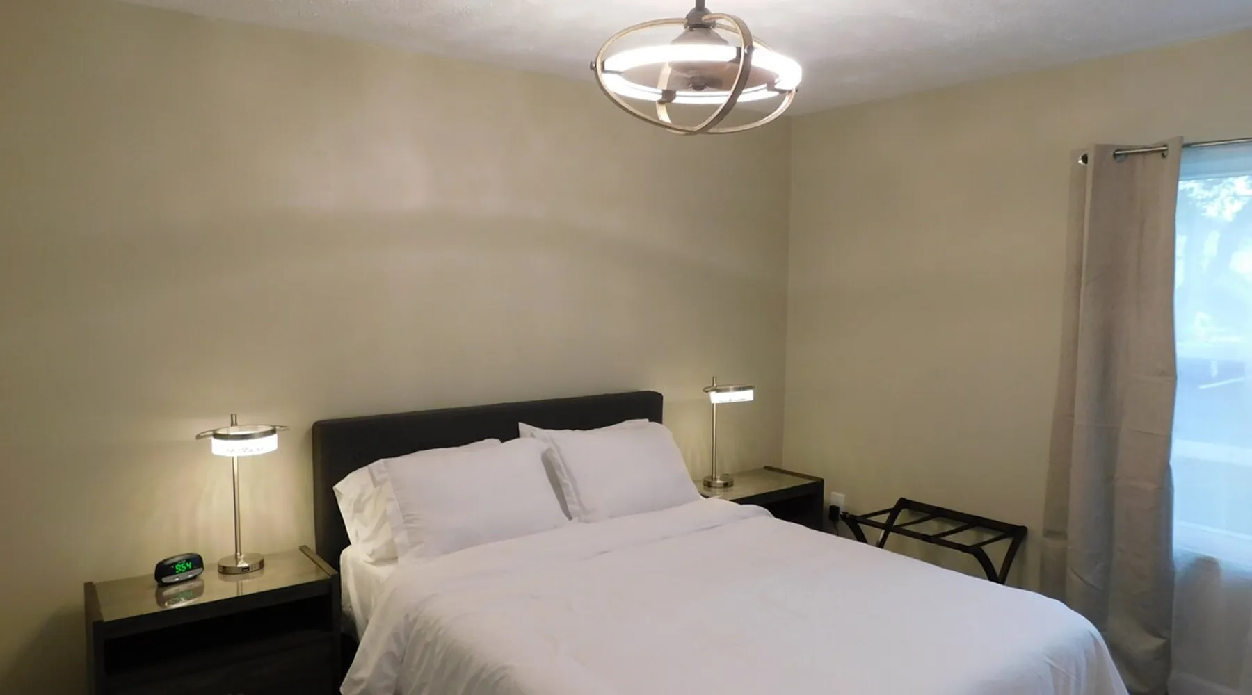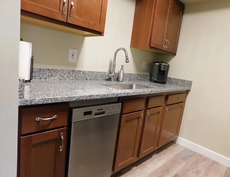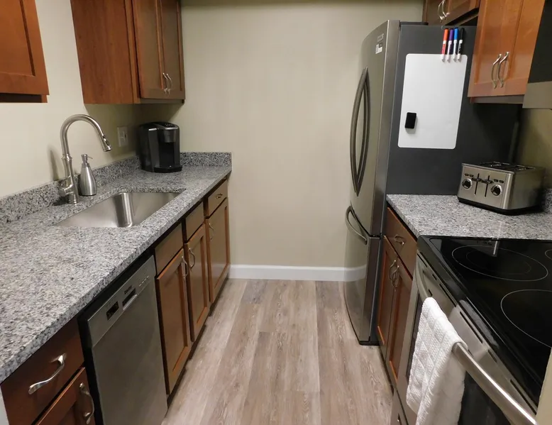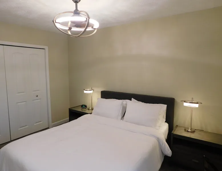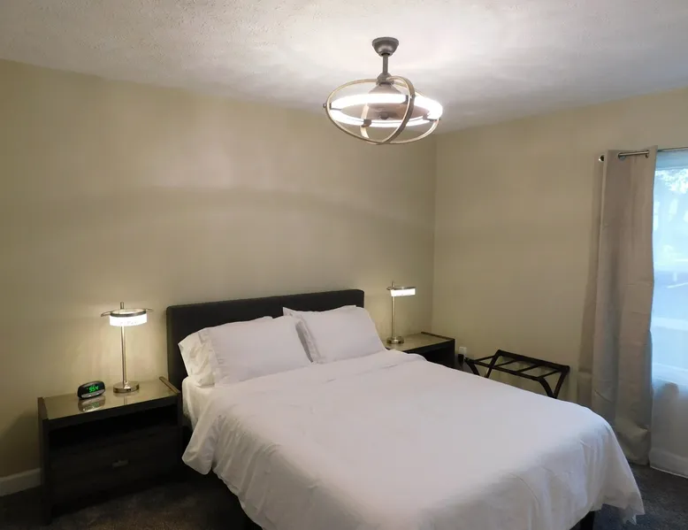 Close to restaurants, bars, shopping, local attractions, and the Meridian Mall. Okemos is an affluent community minutes from East Lansing where you can attend MSU sporting events, Wharton Center performances, rodeo and agricultural events, horticulture gardens, and museums including the Eli & Edythe Broad Art Museum. Furthermore, Downtown Lansing and the State Capitol building is less than seven miles away. The space Fully furnished 2BR unit featuring over 900 square feet of living space, as well as a private patio accessed from a large slider door with blackout drapes. The large living room offers plenty of seating to relax around the fireplace or watch your favorite shows on the 55-inch HD LG Smart Television. The dining space can fit four comfortably around the table with a fifth chair located in the adjacent closet if desired. You will also find some fun family games in the rollout cabinet facing the dining table. You will love the kitchen with new cabinetry, granite countertops, high-end fixtures, and stainless-steel appliances. The kitchen is stocked with pots/pans, dinnerware and silverware (6 places), cooking utensils, wine glasses, can/bottle/wine bottle openers, vacuum wine bottle stopper, and all the basics necessary to make your stay comfortable. Also, there is a below-counter microwave for ease of access, a 4-slice toaster, dishwasher, and a Keurig K-Elite Coffee Maker featuring a hot water dispenser and iced coffee capability (limited coffee pods and tea bags provided). Each bedroom has a queen-sized bed with soft quality linens and four pillows for a full night’s rest, as well as a luggage rack, closet, dresser, fandolier w remote, nightstand(s), high-end lamp(s) with USB ports, and an alarm clock with two USB ports. The bathroom has a full-sized walk-in shower with glass doors and is stocked with plush towels. The vanity features a granite top with high-end fixtures and accessories. There is a hairdryer for your convenience under the sink and a stacked washer/dryer free of charge (limited detergent pods provided). Guest access You will have access to one covered parking space (Unit 1) and ample on-site surface parking adjacent to the building. There is a nice outdoor patio with four Adirondack chairs (400 pound capacity) to relax and unwind. The unit has direct access via a secure Schlage Encode smart lock system, with an additional key storage box on premises in case of a Wi-Fi outage. Other things to note This is one of the finest units you will find in the greater Lansing area!