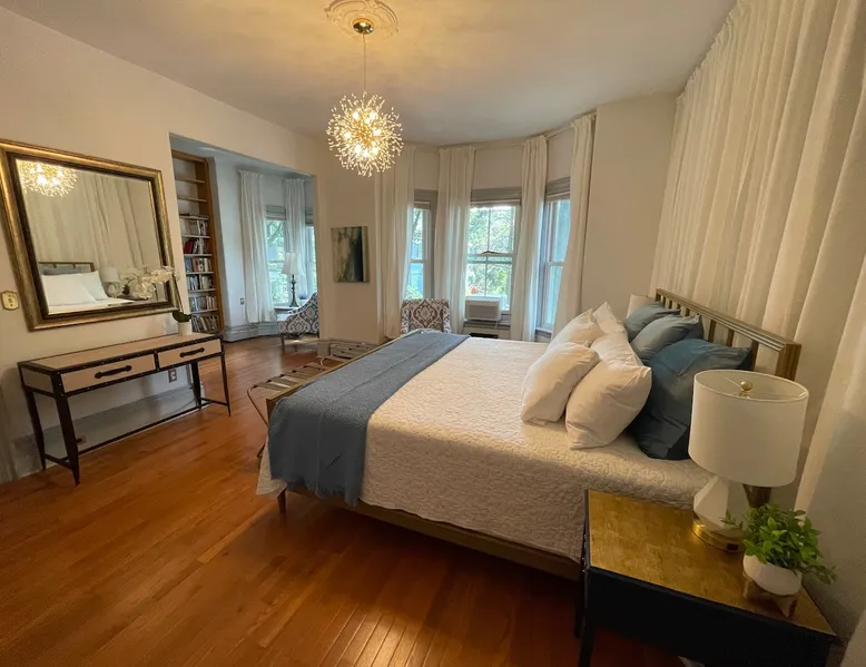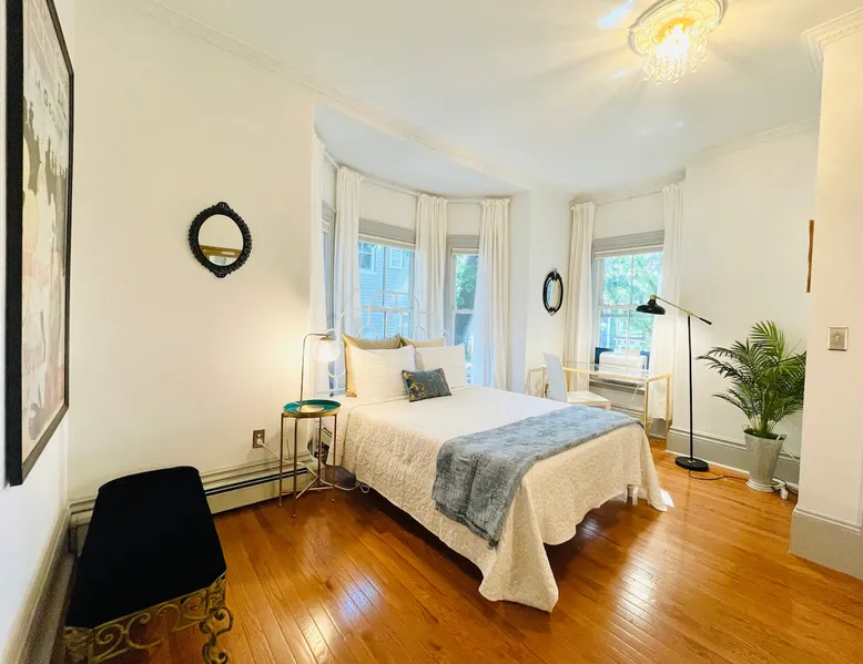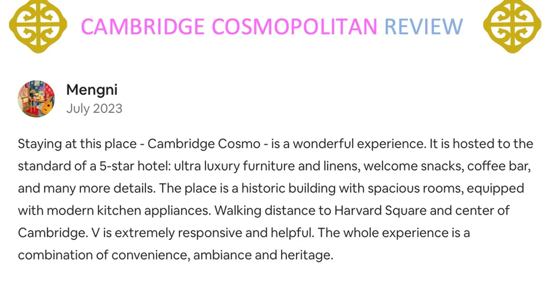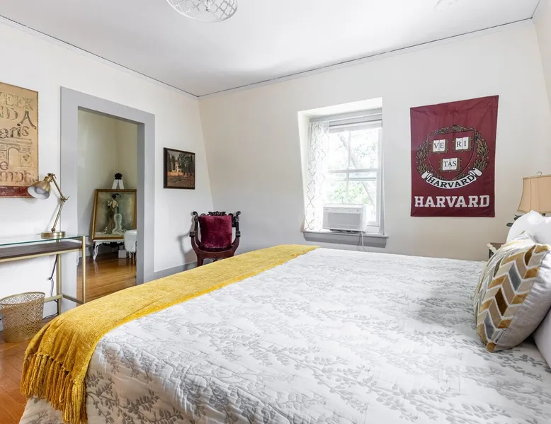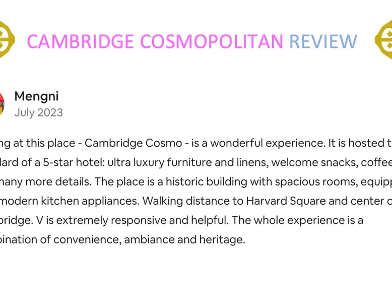 Experience the best of Boston: a luxurious blend of historic elegance & modern convenience in the spacious original wing of a Victorian mansion. The Cambridge Cosmopolitan is ideally located on a lovely side street a short walk to Harvard; red line T, restaurants, & shops; easy access to Kendall/MIT & Boston. Visit, work, or play with ample space to gather as a group or relax in privacy in expansive bedrooms & grand living rooms. Free parking, no smoking/vaping. The space Immerse yourself in the glamour of la Belle Époque (the "Beautiful Age") in this gracious historic home, thoughtfully updated with modern conveniences, comfortable furnishings, and reflecting a century of design. Inspired by our own travels to wonderful places around the world, we aim to make the “Cambridge Cosmo” luxurious, memorable, and welcoming. Along with grand living areas and an expansive and well-equipped chef’s kitchen, the Cosmo's 4+ spacious bedrooms include two king rooms, a queen room, a room with two single (twin) beds, and a study with a daybed and trundle, as well as 3.5 bathrooms. Ideal for visiting professionals, academics, colleagues, and families. We will consider hosting small events such as small dinner parties, retreats, or mini conferences: please note that these events require prior permission from the hosts. THE ROOMS: 1st floor: living rooms 10 foot ceilings: historic entry hall; elegant living room with 55" smart tv; grand dining room with mahogany table seating 10; large eat-in kitchen with induction stove, quartz counters, coffee bar, bay window and breakfast table; powder room. 2nd floor: two very large en suite bedrooms + bonus study / den PRIMARY: palatial king suite with a library bay; adjoining study / den with desk, 55" smart tv, twin daybed and trundle; and full bathroom EAST: gracious queen suite with a walk in closet with stained glass window, whimsical “butterfly” desk, and full bathroom 3rd floor: two spacious bedrooms form a third suite sharing a full bathroom (shower only, no tub) SOUTH: stately king bedroom with a desk and delightful dressing room NORTH: charming twin bedroom with two single beds and a desk Additional smaller TVs suitable for bedrooms / working are available if needed. The kitchen is exceptionally well-equipped, with Viking cookware, Henckels knives, roasting pan, rice cooker, induction wok, blender, food processor, basic baking supplies, Nespresso, Keurig, French press, drip coffee maker with grinder, electric kettle, toaster, and generous supplies of glassware, dinnerware, and cutlery. We aim to provide many items you may need, and are a short walk (4 blocks) to two supermarkets. See “amenities” below for more detail. Guest access The Cambridge Cosmopolitan is on the first, second, and third floor of the original wing of the mansion. (The basement is part of your hosts’ space). Parking is available if requested in advance of your stay. Guests are welcome to use the front garden which is visible from the street; please respect your hosts’ privacy and do not enter areas reserved for hosts’ use (in the back & down the driveway). Laundry is located in the basement. Guests are welcome to use the laundry - please contact us for permission to enter our space. Standard check in time is 4 pm. Depending on the timing of your booking, same day reservations may require an additional 2 to 4 hour lead time to ensure the property is ready for check in. Note: This is a SMOKE-FREE property - absolutely no smoking or vaping allowed. Other things to note The Cambridge Cosmopolitan is a licensed short term rental, in compliance with local law + mandated fire & safety inspections. Welcome to our home! As required by Cambridge laws, your hosts live on the property and may be at home in the adjacent wing. The wings are self-contained, have separate entrances and are thoughtfully oriented to provide peace and privacy, giving a single family feel. Perfect location: Short walk to Harvard Yard, Lesley, Porter, Harvard Square; convenient for the Charles River, Kendall Square, MIT, Davis Square, Tufts, Boston hospitals, downtown Boston and more. Superb transportation access: red line T subway, commuter rail, bus, blue bikes, ZipCar, Mass Ave, usually very short waits for rideshares. Cambridge is great for car-free life (walk score 96); please let us know at the time of booking if you need parking. Accessibility, age, allergies: This historic home has steep stairs, high ceilings, an open stairwell, and upper windows overlooking lower roofs. It is not childproofed so is best suited to sensible people over 6 years old and is not ideal for people with limited mobility nor for risk takers of any age. We aim to provide an allergy-friendly home; due to our own health concerns we allow absolutely no smoking or vaping anywhere on the property or surrounding grounds and cannot accommodate animals. Safety and security: This property is actively monitored with a central alarm system, video doorbell, exterior security lights / cameras and security cameras in the hosts’ areas. For added security when the home is vacant, there is a plainly visible camera in the entry hall facing the front door. This is deactivated, completely blocked, and placed in a box during guest stays - a privacy cover (physical box) is provided to ensure guest privacy. House rules: Please review and sign our house rules in a timely manner. The guest making the reservation must review and sign the house rules during the fully refundable cancellation window. For insurance reasons, prior to check in, you must provide the host with the full names of all adult guests and the ages of any children, and all adult guests are required to sign a copy of the house rules. Check in will not be permitted if house rules have not been signed by all adult guests; host reserves the right to cancel your reservation (in line with our cancellation / refund policy) if you do not sign the house rules as required. Any issues must