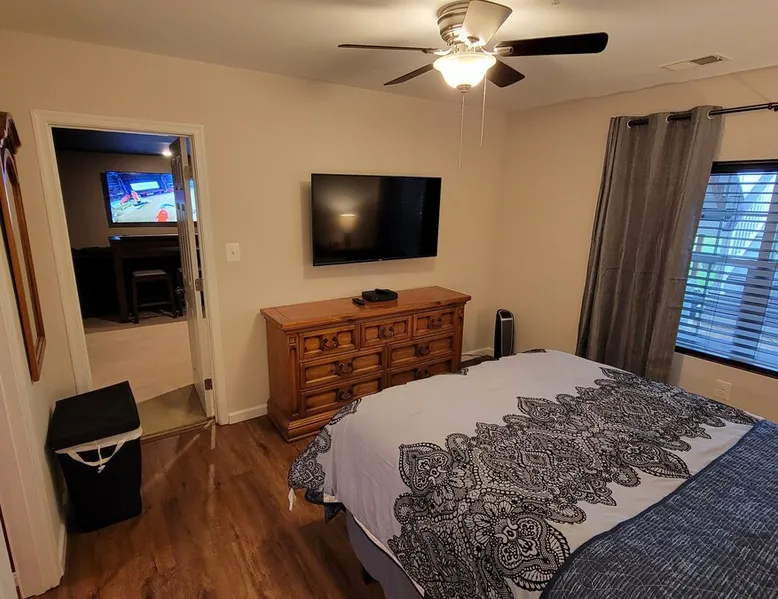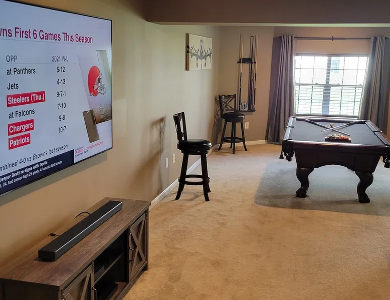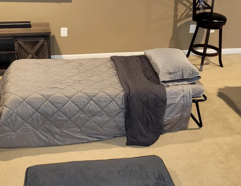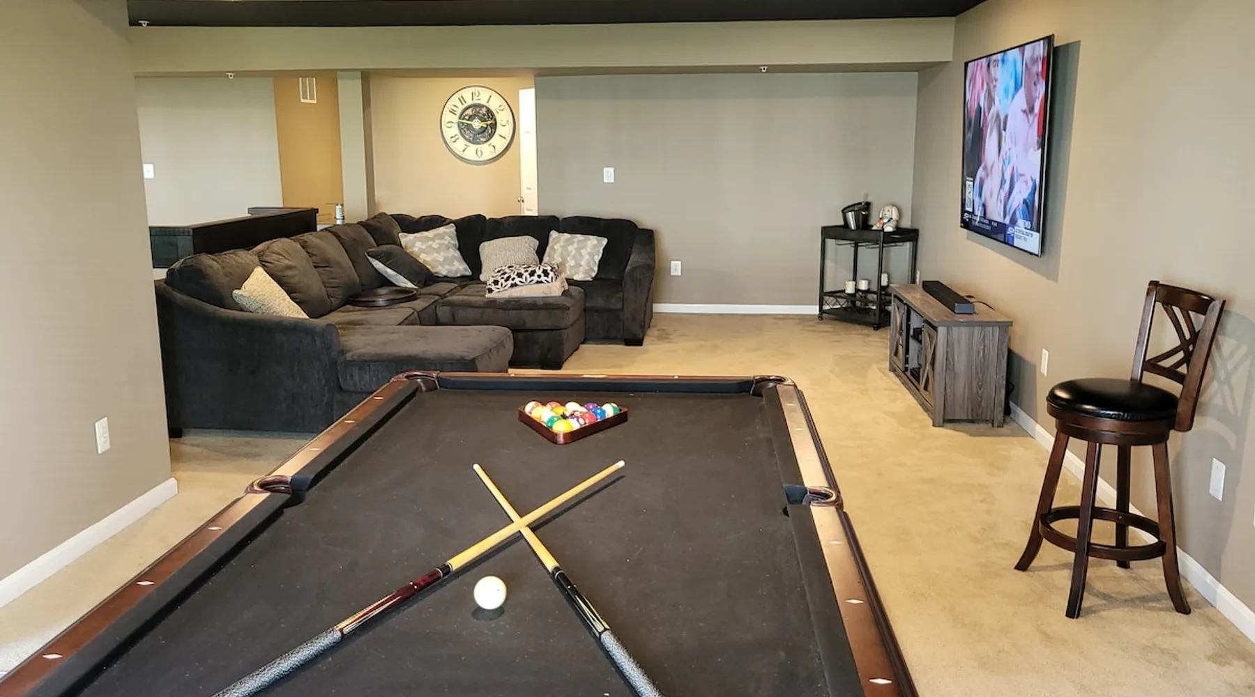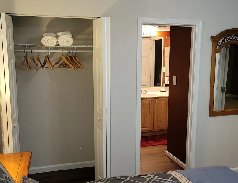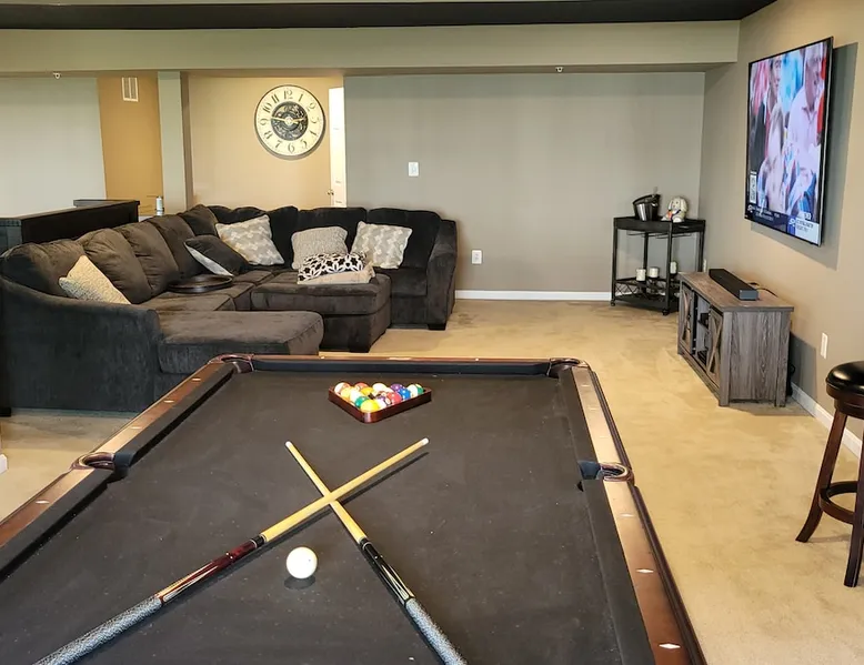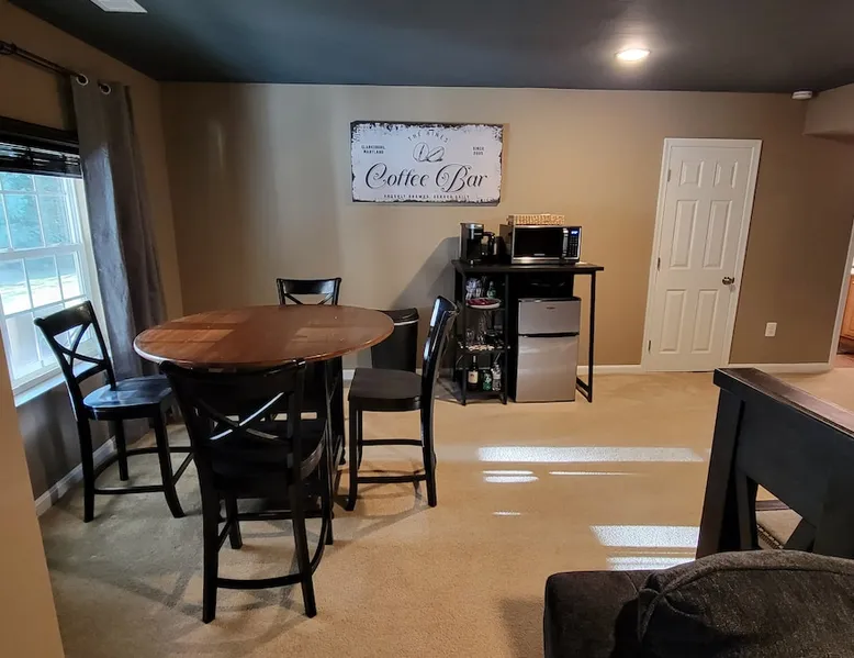 A clean 1 bedroom Clarksburg, MD basement apartment is close by Germantown, Boyds, Damascus and Gaithersburg, MD. 1 queen size bed in the room, and 1 rollaway bed if needed. Perfect for quick personal and business trips or an extended stay. Just 31 miles outside of Washington, DC. Completely private space; there is NO shared space with the rest of house. Separate entrance. My wife and I occupy the upper two levels as our residence. We are quiet and will do our best not disrupt your peace. The space The entertainment room area includes a spacious and very comfortable large sectional couch, 85-inch flat panel smart tv, pool table, coffee maker, small refrigerator and dedicated work desk area. Guest access Guests should enter the walkway on the left side of the house and follow the brick paver walkway to the back. Motion lights will brighten the path at night. A few short steps leads to a shorter walkway that leads to the private entry. A keyless touch pad lock will be programmed to each guest's unique 4-digit code. During your stay I am a text message or phone call away. Other things to note The basement apartment also includes a first-aid kit, fire extinguisher, and smoke and carbon monoxide alarms. A rollaway bed is available as a second bed option.