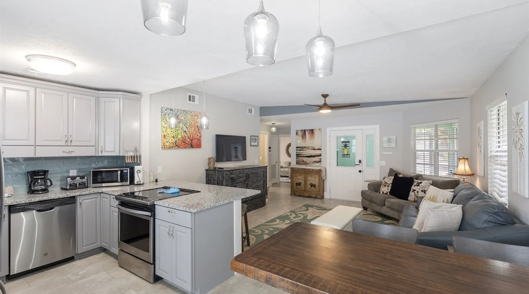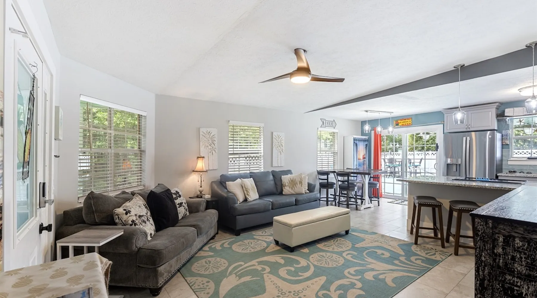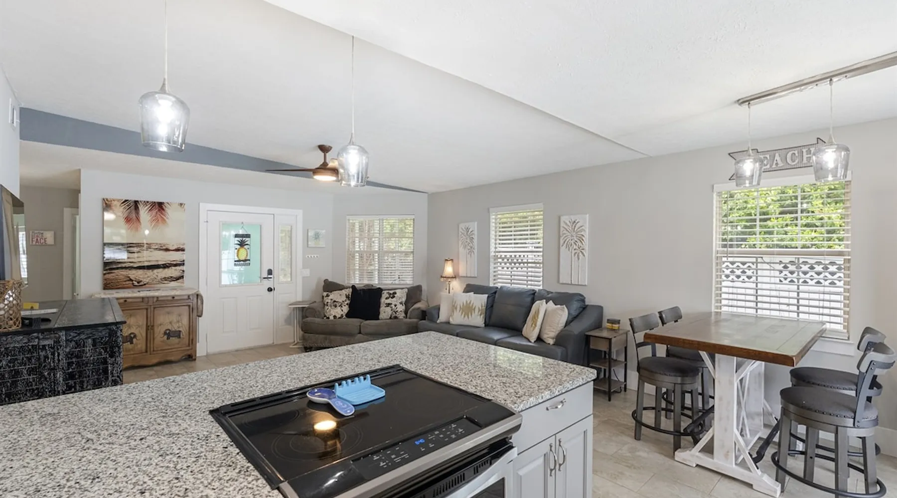 Welcome to Pineapple Paradise! This newly renovated, cute, updated beach house is just a three blocks (5 minute walk) from the beach! And you can hear the glorious waves crashing on the shore. This deceptively spacious beach house is ideal for two small families, one large family, or a girlfriend getaway. Located in the Golf Cart friendly neighborhood of Laguna Beach on the magnificent West End of PCB, Pineapple Paradise is just a few minutes from HWY 30-A to the West & Pier Park to the East. The space Can you hear the sound of the waves crashing on the shore? If you're sitting on the pool deck then the answer is a resounding YES! Welcome to Pineapple Paradise! This newly renovated, cute, updated beach house is just a three blocks (5 minute walk) from the beach! And you can hear the glorious waves crashing on the shore. This deceptively spacious beach house is ideal for two small families, one large family, or a girlfriend getaway. Located in the Golf Cart friendly neighborhood of Laguna Beach on the magnificent West End of PCB, Pineapple Paradise is just a few minutes from HWY 30-A to the West & Pier Park to the East. We’ve just completed a renovation that includes new tile floor, new kitchen with bar and new furnishings. Our beach house features 3 bedrooms. Bedroom 1 offers king sized bed, en suite bathroom, dresser, wall mirror, small seating area, and door to pool deck. The hall closet may be used for hanging clothes. Bedroom 2 offers king sized bed, large closet, dresser, and wall mirror. Bedroom 3, the "kid's room" has a chair and sofa, both of which let out into sleepers, offering room for 3. Also includes a dresser, closet, and large TV. The house has an open living room/dining area/kitchen with murphy bed, and large pool with deck offering lounge chairs, dining table and covered seating. Amenities include free wifi, private pool with fenced back yard, and full size washer/dryer. All rooms include extra electrical outlets and USB ports. Large flat screen televisions are located in living room and the "kid's room". The kitchen is fully stocked with pots, pans, small appliances and large appliances, cooking utensils, shatterproof and glass cups, plates, and bowls, and silverware. BONUS: Guests receive 1 free daily admission to some of our favorite local attractions through our partnership with Xplorie. All perks are valid for stays up to 27 days and are subject to change and availability. BONUS PERKS INCLUDED WITH YOUR STAY (for stays beginning February 15, 2025): *1 FREE Round of Golf Each Day - Bay Point Golf *1 FREE Ticket to Sky Wheel Panama City Beach: Combo Flight Admission & Mini Golf *1 FREE ticket to Shipwreck Island Waterpark *1 FREE ticket to Island Time Sailing - Shell Island Snorkeling & Sailing Cruise (March-Oct) Pineapple Paradise is conveniently located within walking distance to the white sand beaches of Panama City Beach and more. Parking is available for three cars (includes garage). Monthly winter rates available upon request. We have a second refrigerator in the garage. All rooms offer towels hooks on doors, and the showers have swimsuit hooks. Pet Friendly - up to 2 pets allowed. Non-refundable pet fee per pet applies. INITIAL SUPPLIES - UPON ARRIVAL Florida Panhandle Property Management furnishes a few essential items for guests to utilize until they can get to the store. Initial Supplies include: Dishwasher soap, small washing machine powder, each bathroom has starter amenities shampoo, conditioner, soap bar. One roll of toilet paper in each bathroom & one paper towel roll in the kitchen. All bed linens & towels are provided, as well as beach towels and black makeup washcloths. IMPORTANT INFORMATION IN ORDER TO ENJOY YOUR STAY This house sleeps up to 9 people. NO smoking (cigarettes, marijuana, cigars) or vaping allowed inside. If smoking on the pool deck, please be cautious to not drop hot ashes on the cushions. Check-in is at 4:00 pm, and check-out is at 10:00 am. Primary renter must be 25 years of age and remain on property for the duration of the stay. In accordance with Florida State Statute 509.41, reservations made under false pretense are null and void, and check-in will not be allowed, or guests will be asked to vacate the residence without refund. Quiet time hours & disturbances: Quiet Hours: 10:00 PM – 10:00 AM. Be mindful of neighbors and keep noise levels to a minimum at all times. Please be advised that while we do offer free Wi-Fi, service in the area can be spotty regardless of provider. Should you require stable internet service for work or pleasure; please bring an ethernet cord to plug into the router or bring access to a hotspot with you. Limited tech support. No refunds for any interruption in Wi-Fi or Cable television service during your stay, NO exceptions. Signature of Rental Agreement by Primary Renter required. No parties or unregistered guests. Lack of adherence to any of the above will result in immediate eviction and no refunds of any kind. Neither Owners nor Management are responsible for accidents or injuries. This property is managed by Florida Panhandle Property Management. Guest access Access instructions are provided in my welcome email approximately 1 week prior to check-in. If you booked within a week of check-in, I'll send that welcome information over just as quickly as I possibly can! Other things to note Our beach house features 3 bedrooms. Bedroom 1 offers king sized bed, en suite bathroom, dresser, wall mirror, small seating area, and door to pool deck. The hall closet may be used for hanging clothes. Bedroom 2 offers king sized bed, large closet, dresser, and wall mirror. Bedroom 3, the "kid's room" has a chair and sofa, both of which let out into sleepers, offering room for 3. Also includes a dresser, closet, and large TV. The house has an open living room/dining area/kitchen with murphy bed, and large pool with deck offering lounge chairs, dining table and covered seating. Amenities include free wifi, private