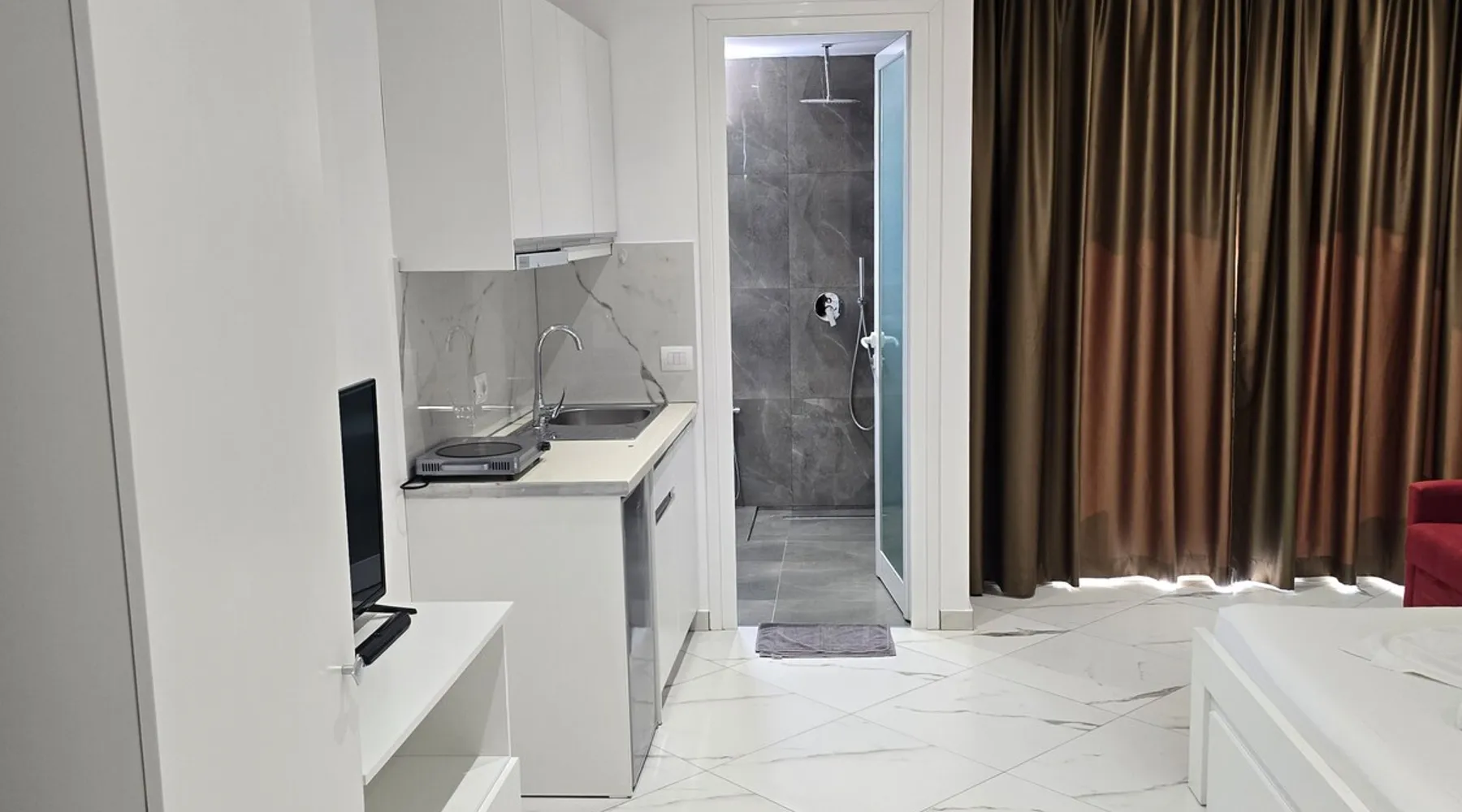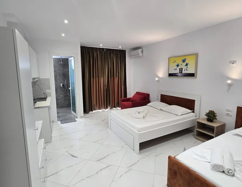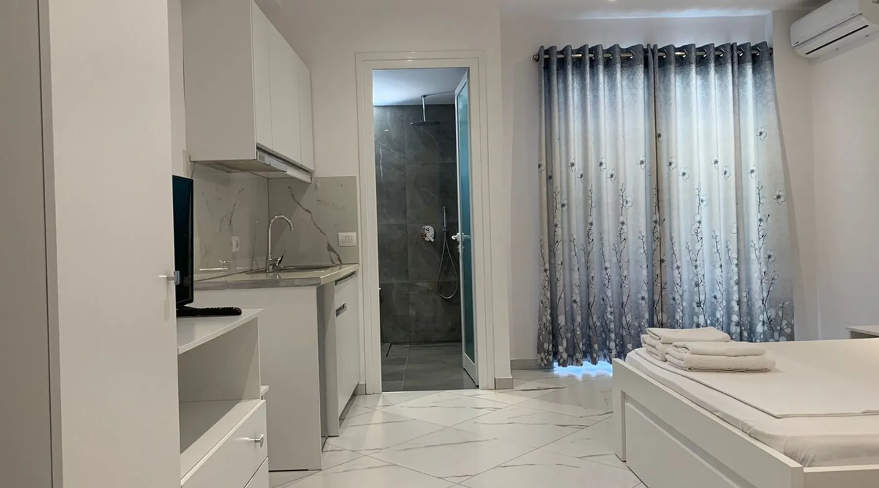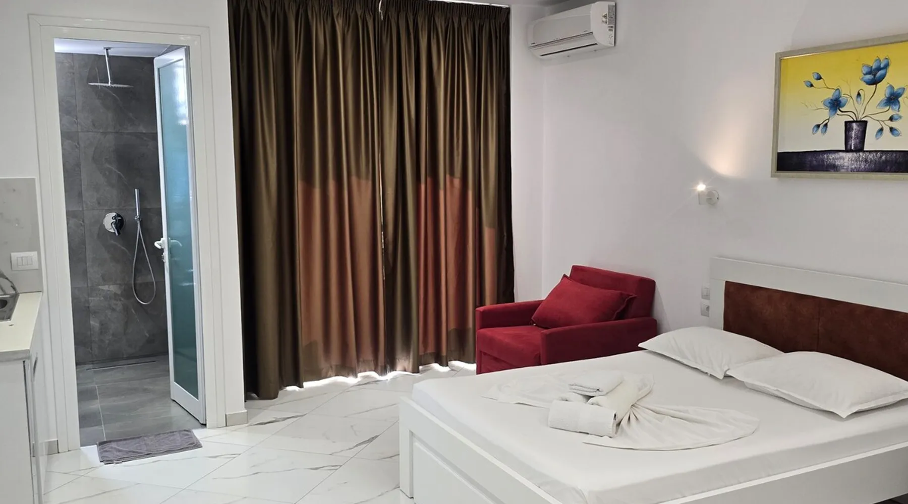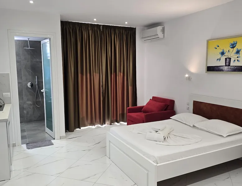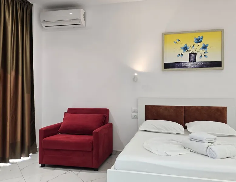 Our brand new suite, very close to the beach.Suitable for 4 people. Equipped with a kitchen, 1 double bed, one single bed and a retractable single bed. Inside you can find a well equipped kitchen, a smart TV, free WiFi, air-conditioner, hair dryer. There is a barbecue outside and a laundry room.