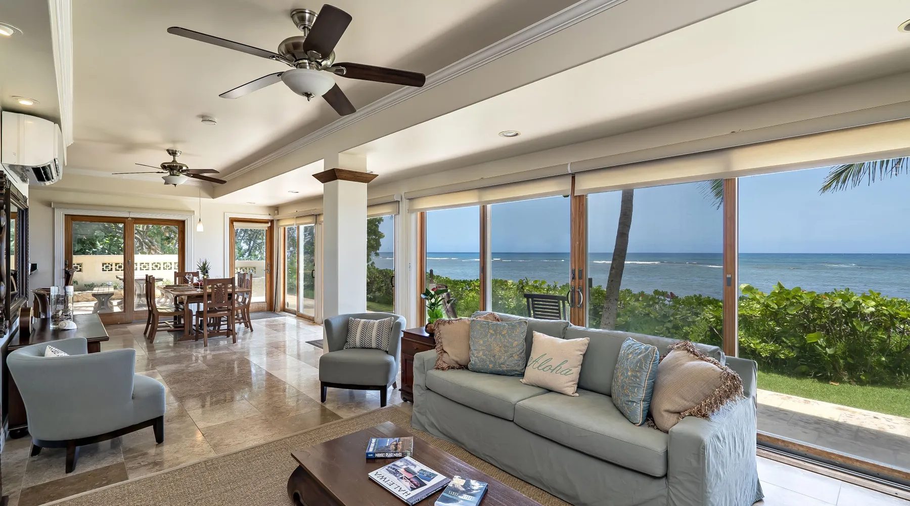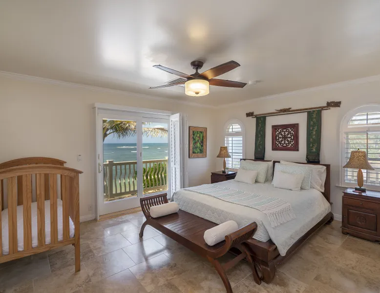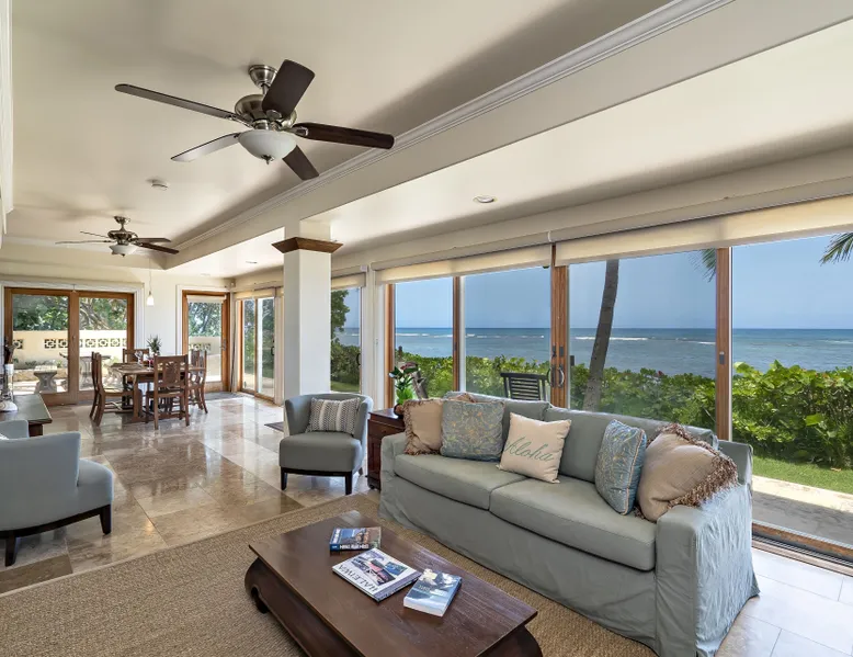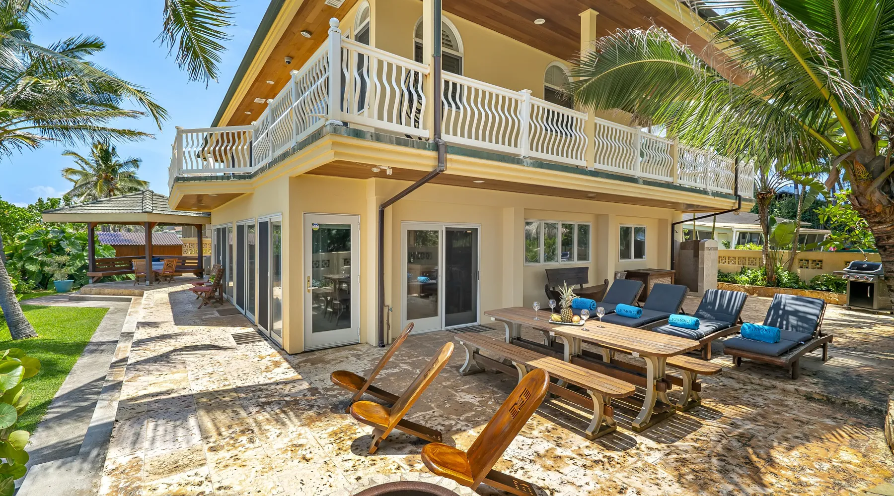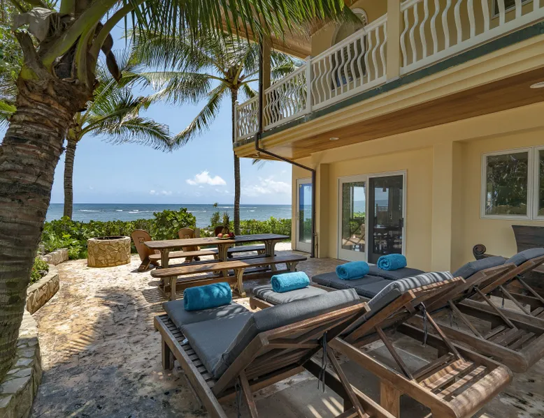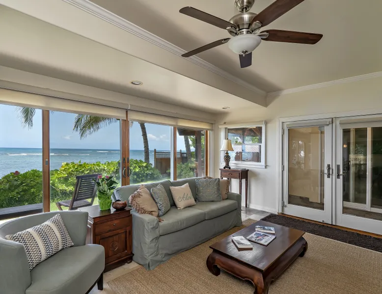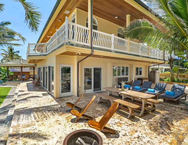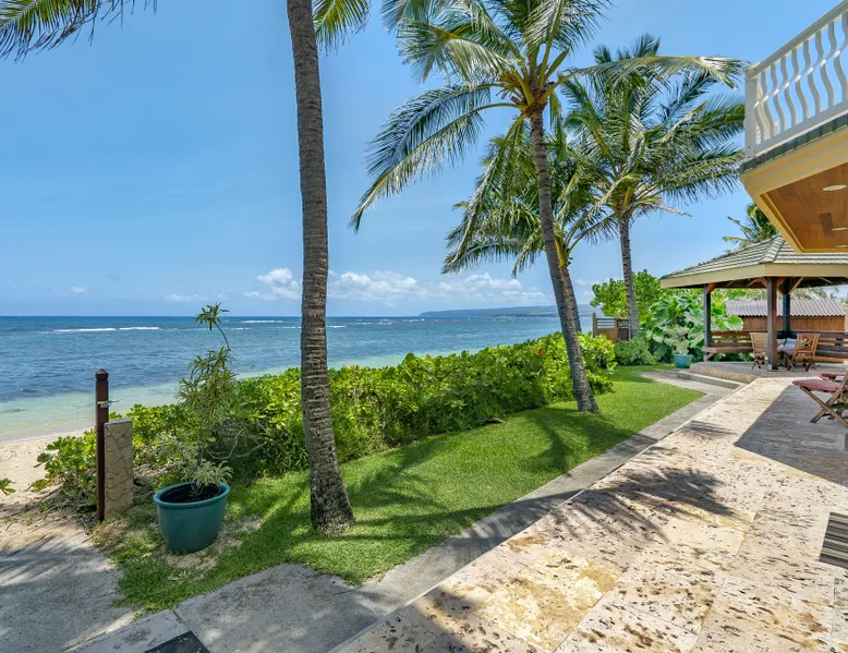 Leimoku is a large and accommodating, beautifully updated, and modern Hawaii home on Oahu's famous North Shore. Located on the "quiet side" of the North Shore, away from all the crowds, this 3000 sq.ft. home is comfortable and luxurious, with three of the four large bedrooms boasting en-suite baths. Featuring a large wrap around second-story lanai, and another large outdoor oceanfront lanai with loungers, BBQ, hot/cold outside shower, and dining table, the glorious ocean and mountain views won't disappoint as you use the ample space to enjoy your surroundings! Step down from the lanai directly onto a gorgeous white-sandy beach and into the lagoon-like tropical waters. Ocean views abound from three of the four bedrooms, kitchen, and both living rooms. With room-controlled Air Conditioning throughout the home and in every bedroom, the choice is up to you, ocean breezes or A/C temp of your choosing in your own room. The upstairs master bedroom has a king sized bed, walk in closet and the attached bathroom has a large soaking tub and separate shower. The remaining two upstairs bedrooms each have queen sized beds and full bathrooms. The downstairs bedroom also has a queen-sized bed, with the full sized bathroom in the hallway next to it. The attached cottage is perfect for kids or teens, and with 3 twin beds and a shower, it comfortably sleeps up to 3 people, though not as luxurious as the rest of the bedrooms. The home boasts a large, fully equipped kitchen with everything you need to create a fabulous meal away from home. Keurig machine and pods provided for your pleasure. There is also an upstairs bar in the oceanfront living area that can be the center of many fun cocktail hours! Haleiwa town, the surfing capitol of the world, a quaint and popular beach town with grocery, bakery, boutiques, fine-dining, ocean sport rental gear, and surf shops is only two minutes away. Beach Gear: Please note, post Covid, we are supplying beach chairs and beach towels only. Please use Hawaii Beach Time dot com to arrange for additional desired gear (snorkels/masks/boards) to be delivered to your rental or use one of the many gear shops in Haleiwa such as Surf n Sea. At Leimoku, you will enjoy luxury, privacy, and beautiful beaches, all with easy access to the conveniences of our town. Come and make your best family memories with us at Leimoku!!! *** This home will require a mid stay clean*** *No Weddings *No Gatherings/Parties *No Exceptions!!! TA#117-207-9616-01 ** Currently Renting in accordance with the City and County ordinance restricting to one rental per 30 day time period. Questions contact manager. ** InstaBook bookings are still subject to owner approval. If approval not obtained, guest will be asked to cancel their Instabook reservation within 24hrs of making reservation. No check-ins allowed on major Holidays: Christmas, New Years Day, Easter, Thanksgiving Hawaii Life Rentals is a locally owned, licensed real estate company with rentals on Kauai, Maui, Oahu, and Hawaii. We offer on-island personal assistance and Concierge services. Rates do not include taxes, cleaning and applicable fees. Hawaii Life/VRBO bookings: Guests must sign a rental contract within 48 hours of booking to confirm the reservation. TA-117-207-9616-0 In compliance with the Ordinances of the City & County of Honolulu, the Property will be made available to you for your use and occupancy for a minimum period of thirty (30) days.