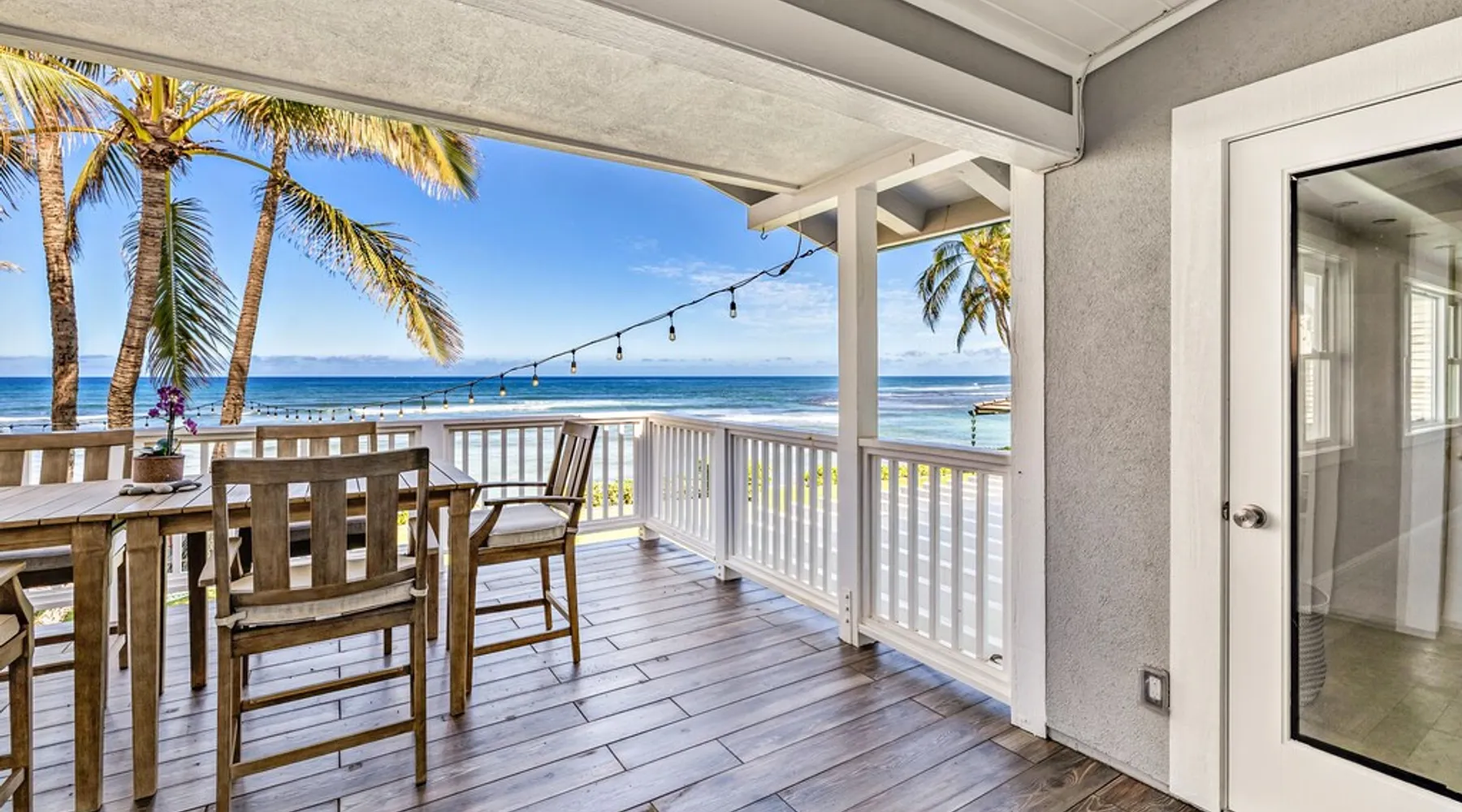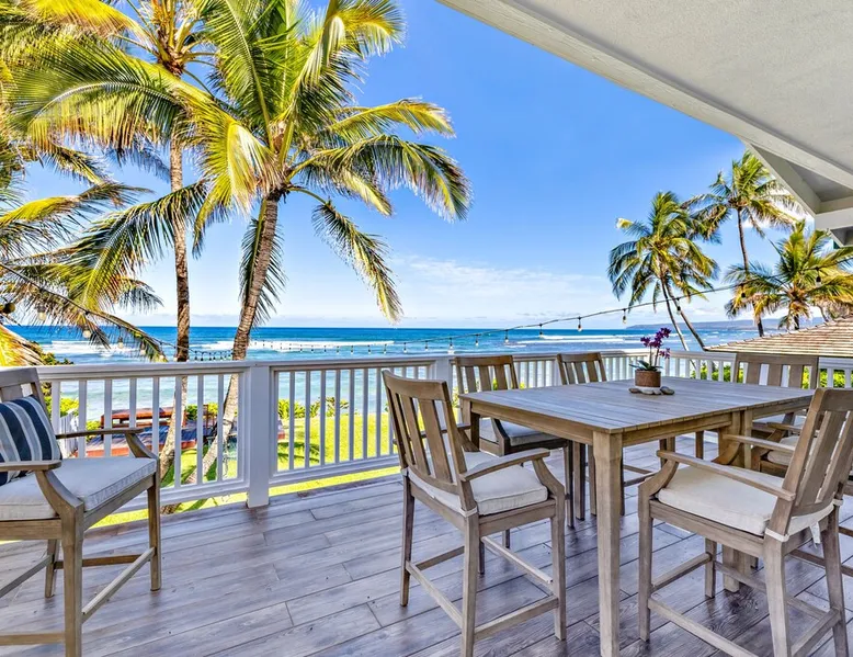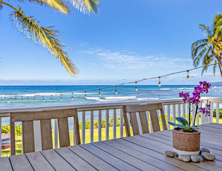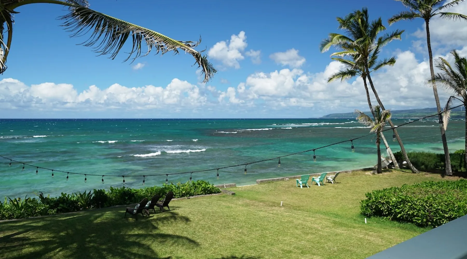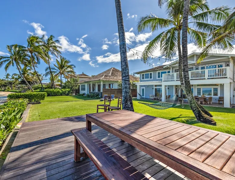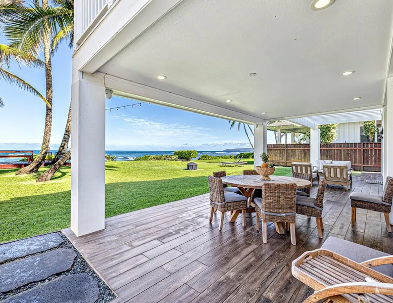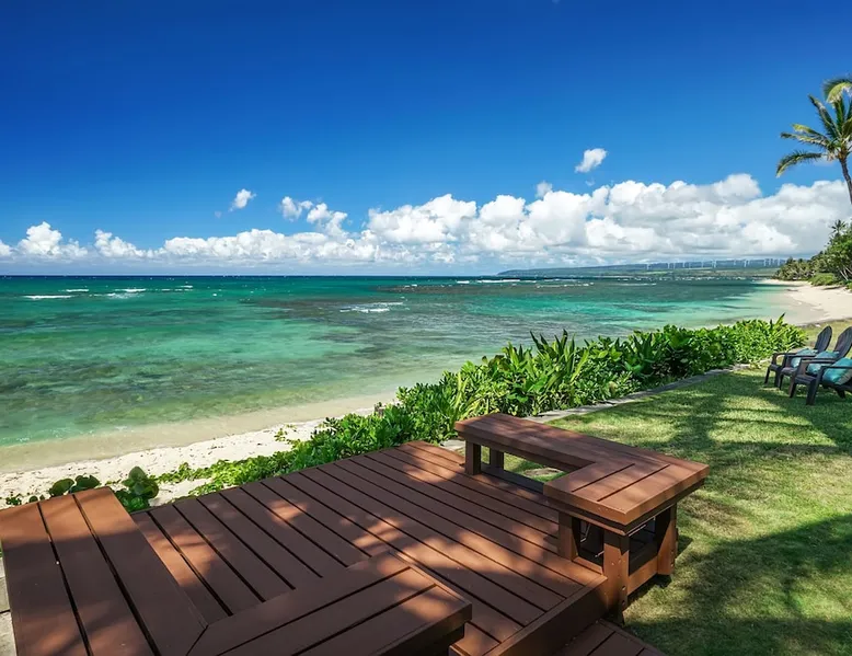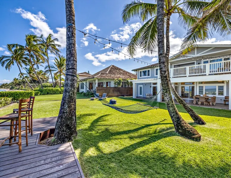 *A/C in all bedrooms, in addition to all living areas. Please inquire regarding up-to date monthly rates. Short term rates differ from Long Term rates for terms 6 months or longer. Hale of peacefulness, tranquility, and serenity. The perfect Hawaiian name for this perfectly relaxing North Shore getaway. Located directly on a warm sandy beach, on the quiet side of Oahu's famed North Shore, this modern and luxurious home has everything you need to relax into your Hawaii vacation. Boasting an up-to-date remodel (late summer 2016), complete with all new high-end furnishings, linens, decor, and appliances, the feel is boutique luxury hotel with the added perks and better value of a vacation home. Hale Maluhia is a 3 bedroom home that truly feels much over 3,800 sq ft of living area (large for Hawaii standards), plus 2 additional sleeper sofas and 2 Pune'es (Hawaiian Day beds) throughout the home, extra guests can be comfortably accommodated here for an additional fee. The two separate kitchen and dining areas, one on each level, and three separate living areas (2 with flat screen TV), make the home ideal for multi-generational family vacations, or even a couple's trip. The large layout creates inviting nooks great for privacy when traveling with other couples or large families. Make your morning coffee or enjoy an ocean view breakfast before joining your travel-mates for the day. The large grassy beachfront yard is ideal for lounging by the sea; hangout in the hammock, have a picnic on the dining table, or enjoy your evening cocktails on the beach-deck. The gorgeous and often empty beach out front is family and kid-friendly, as the shoreline is protected by a large reef. Snorkel, surf, play and swim right outside your back door any time of year. Beach Gear: Please note, post Covid, we are supplying beach chairs and beach towels only. Please use Hawaii Beach Time dot com to arrange for additional desired gear (snorkels/masks/boards) to be delivered to your rental or use one of the many gear shops in Haleiwa such as Surf n Sea. Bedroom Layout: The large master suite is located upstairs, overlooking the ocean, with King Bed, large master bath, walk-in closet, vanity, flat screen TV, foyer entry with seating, and its own private lanai with seating. An additional queen guest bedroom is also upstairs, with flat screen TV, large closet, and an additional Punee, perfect for the couple traveling with small children. Full bath in hall. The third guest bedroom is located on the first floor, with a queen bed with en suite bath and flat screen TV. This beautiful area known as Mokuleia has an outer-island feel, but sits just two miles from the quaint shopping and dining of Haleiwa town, surf capitol of the world. Come experience all that Oahu has to offer, you will be very happy with your choice to stay at Hale Maluhia. *** This home will require a mid stay clean*** No weddings, No gatherings, no exceptions! TATAvailability subject to change until payment is received and booking is confirmed. Instant Booking Requests are still subject to owner approval. If approval cannot be obtained, guest will be asked to cancel their booking online within the first 24 hours of making said booking. Rates do not include taxes, cleaning and applicable fees. In compliance with the Ordinances of the City & County of Honolulu, the Property will be made available to you for your use and occupancy for a minimum period of thirty (30) days.