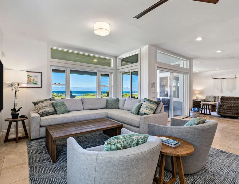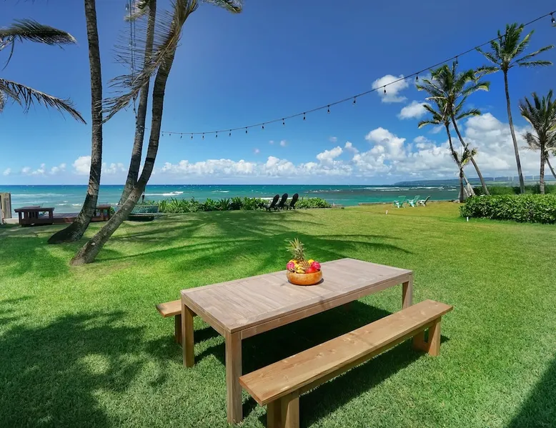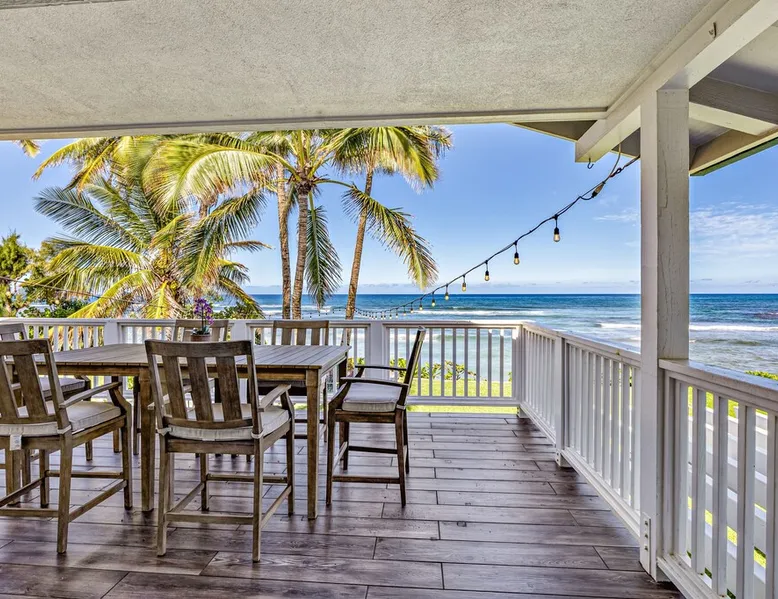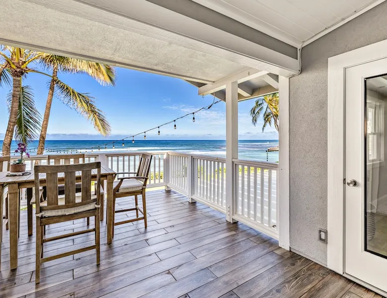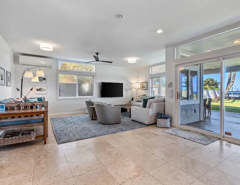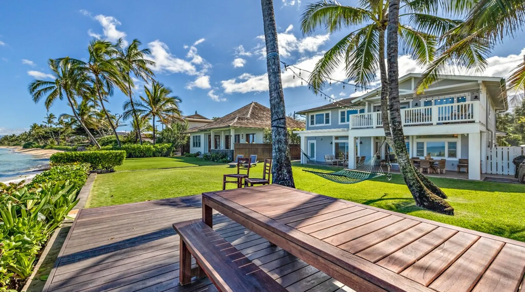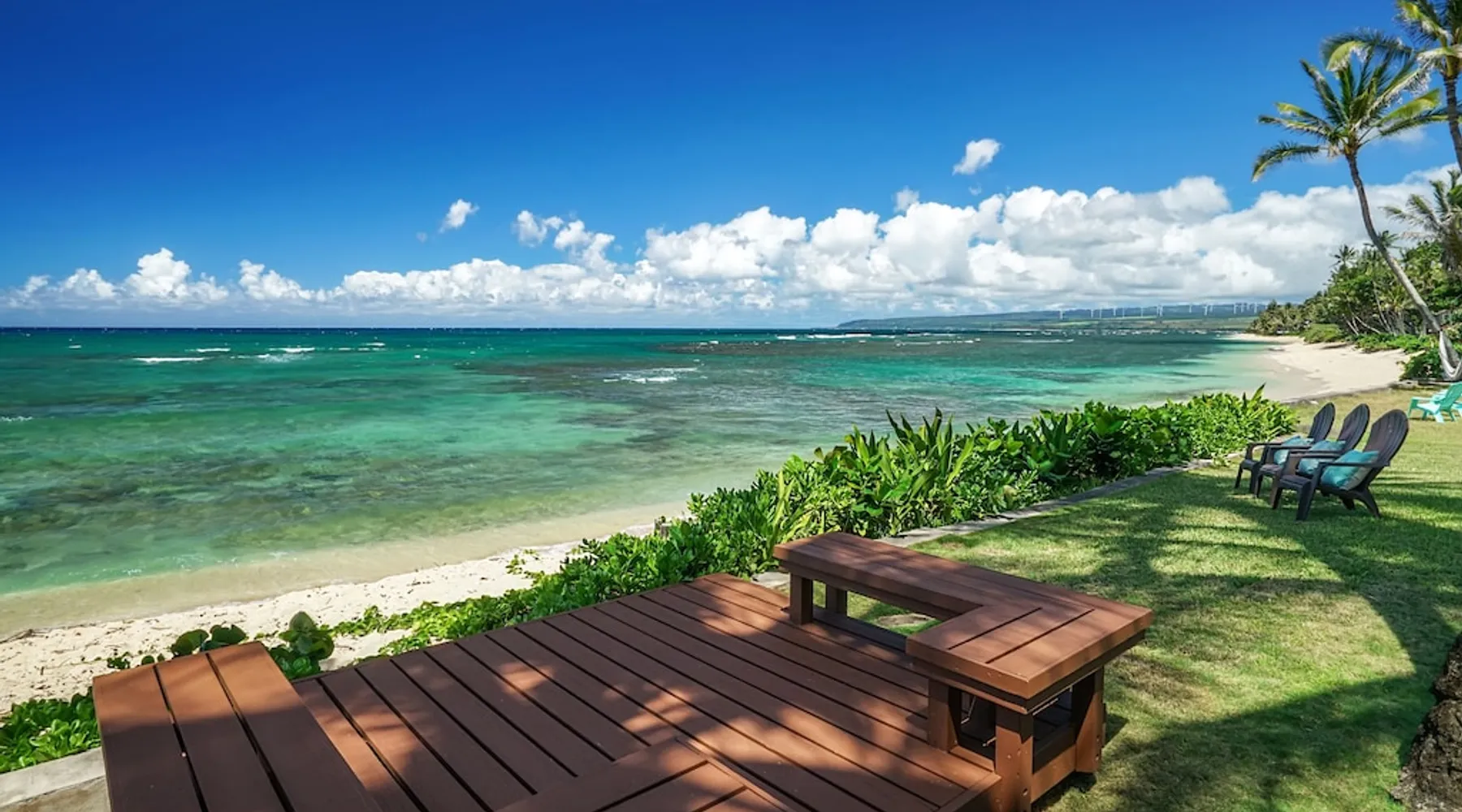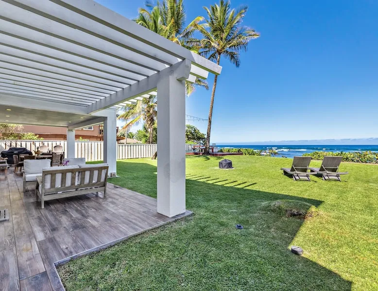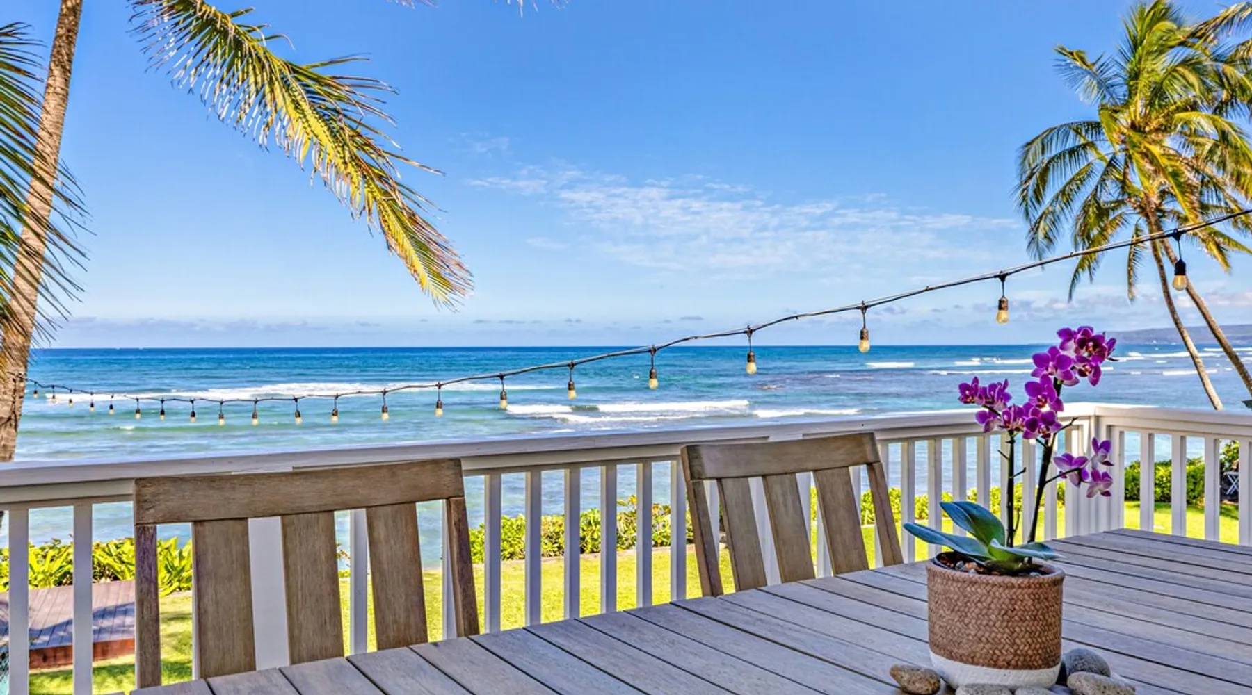 *A/C in all bedrooms, in addition to all living areas. Please inquire regarding up-to date monthly rates. Short term rates differ from Long Term rates for terms 6 months or longer. Hale of peacefulness, tranquility, and serenity. The perfect Hawaiian name for this perfectly relaxing North Shore getaway. Located directly on a warm sandy beach, on the quiet side of Oahu's famed North Shore, this modern and luxurious home has everything you need to relax into your Hawaii vacation. Boasting an up-to-date remodel (late summer 2016), complete with all new high-end furnishings, linens, decor, and appliances, the feel is boutique luxury hotel with the added perks and better value of a vacation home. Hale Maluhia is a 3 bedroom home that truly feels much over 3,800 sq ft of living area (large for Hawaii standards), plus 2 additional sleeper sofas and 2 Pune'es (Hawaiian Day beds) throughout the home, extra guests can be comfortably accommodated here for an additional fee. The two separate kitchen and dining areas, one on each level, and three separate living areas (2 with flat screen TV), make the home ideal for multi-generational family vacations, or even a couple's trip. The large layout creates inviting nooks great for privacy when traveling with other couples or large families. Make your morning coffee or enjoy an ocean view breakfast before joining your travel-mates for the day. The large grassy beachfront yard is ideal for lounging by the sea; hangout in the hammock, have a picnic on the dining table, or enjoy your evening cocktails on the beach-deck. The gorgeous and often empty beach out front is family and kid-friendly, as the shoreline is protected by a large reef. Snorkel, surf, play and swim right outside your back door any time of year. Beach Gear: Please note, post Covid, we are supplying beach chairs and beach towels only. Please use Hawaii Beach Time dot com to arrange for additional desired gear (snorkels/masks/boards) to be delivered to your rental or use one of the many gear shops in Haleiwa such as Surf n Sea. Bedroom Layout: The large master suite is located upstairs, overlooking the ocean, with King Bed, large master bath, walk-in closet, vanity, flat screen TV, foyer entry with seating, and its own private lanai with seating. An additional queen guest bedroom is also upstairs, with flat screen TV, large closet, and an additional Punee, perfect for the couple traveling with small children. Full bath in hall. The third guest bedroom is located on the first floor, with a queen bed with en suite bath and flat screen TV. This beautiful area known as Mokuleia has an outer-island feel, but sits just two miles from the quaint shopping and dining of Haleiwa town, surf capitol of the world. Come experience all that Oahu has to offer, you will be very happy with your choice to stay at Hale Maluhia. *** This home will require a mid stay clean*** No weddings, No gatherings, no exceptions! TATAvailability subject to change until payment is received and booking is confirmed. Instant Booking Requests are still subject to owner approval. If approval cannot be obtained, guest will be asked to cancel their booking online within the first 24 hours of making said booking. Rates do not include taxes, cleaning and applicable fees. In compliance with the Ordinances of the City & County of Honolulu, the Property will be made available to you for your use and occupancy for a minimum period of thirty (30) days.
