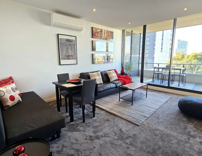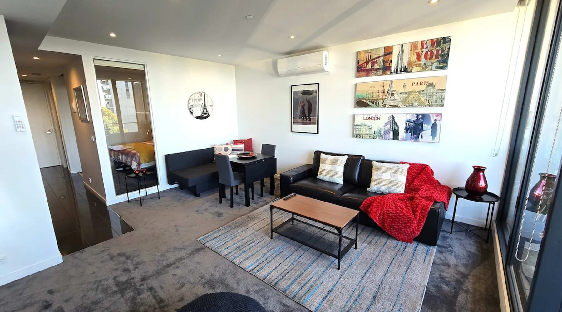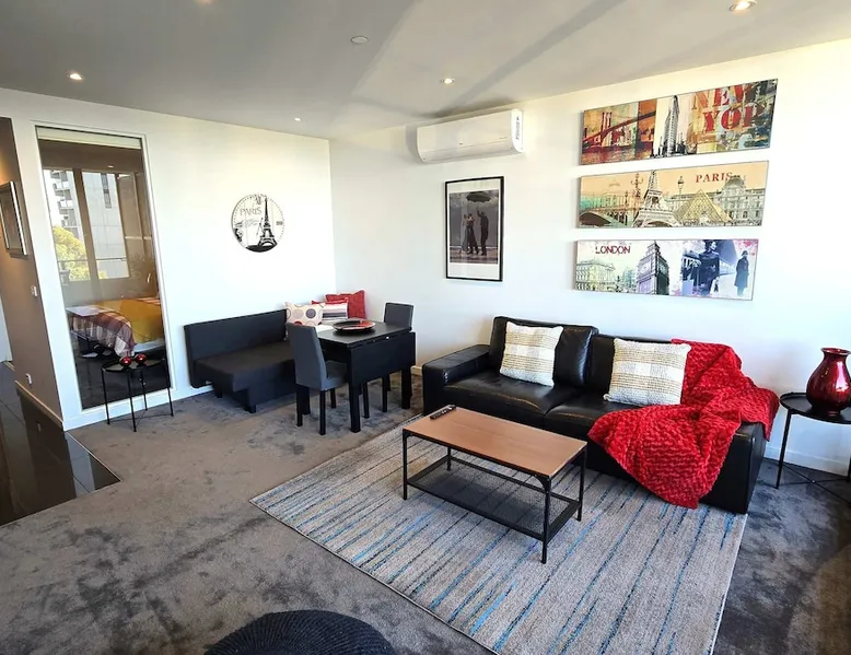 Located in a stylish new development right on St Kilda Road, this is a bright and airy one-bedroom apartment with a king bed and a double sofa bed. Less than 10 mins walk from central St Kilda, allocated parking for one car, and tram stops right outside the building, this is a great base to experience St Kilda and Melbourne at its best. Please read the full listing below before booking to ensure you have all the important information to give you the best possible stay. The space This one bedroom apartment is located on level 5 looking towards South Yarra and the City skylines with far-ranging views making the living room a great place to relax and watch the clouds float past. In the living room is a double-size sofa bed which also serves as additional seating for the dining table if needed. Bedding is provided for the sofa bed when a booking for 3 or more people is made. The internal bedroom has a window through the living room to let in light during the day and there is a privacy blind when needed in the evening. The bedroom features a large king bed which comes with fitted sheet, flat sheet, four pillows and an all-season doona/quilt. One large, allocated parking space is available for guest use in the secure underground car park. Please note there is a strict height limit of 2.1m for car park access. Right outside the building is the bustling St Kilda Road where you will find tram stops that will take you into the heart of Melbourne. For city-dwellers, the sound from the road will be pretty standard for you but for those living in the country, please be aware you may notice vehicle and tram noise more than usual. On the ground floor of the building, accessed from outside, is Dear Liza, one of the best breakfast and lunch spots in the area open from 8.30am to 2.30pm on weekdays and 9am to 3pm on weekends. You won't have far to go for a relaxed and delicious brunch when staying here! Please note if your stay is to include the nights of Christmas or New Year's Eve a 3 night minimum stay is required. We're a kind, honest, hard-working team that genuinely wants to deliver 5 star guest stays. During your stay please reach out if we can help you in any way; we can only help if we know and we're dedicated to making your visit a happy one. This property is managed by Holiday Rentals Australia, a professional and licenced dedicated holiday rental agency. By choosing to book with professionals, you can be assured your stay is in the best possible hands. All guests are urged to read the House Rules prior to completing their booking, these can be found on the final booking page along with Airbnb's Terms and Conditions. Guest access You have access to the whole apartment for your stay and no internal space is shared. Other things to note All the apartments we manage come with a welcome letter and detailed information so you know how everything works to ensure you can get the most out of your stay. There is also a local map with some highlights such as the local supermarket and train station plus maps of Melbourne for those not familiar with the area. All bedding and towels are included for 2-4 people as booked (note one bath towel per person) along with beginner basics such as tea, coffee, sugar, milk, shampoo, bodywash and toilet paper to get you through the first few days. Prior to arrival, we ask all guests to quickly fill in some contact information and tell therm a little bit more about how we hope they'll look after the apartment. Please note as we continue to improve the property over time the furniture and furnishings may change from those shown in the photos.
