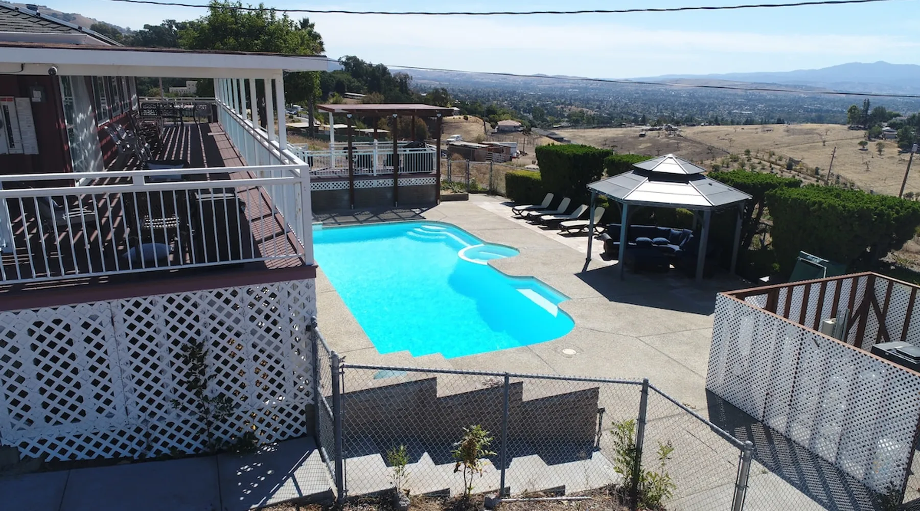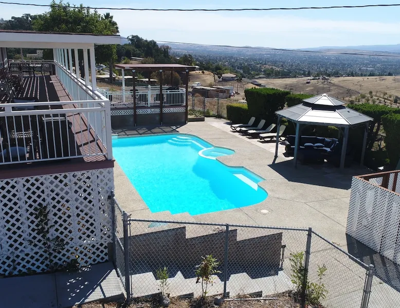 A seasonal Swimming Pool is not available, but Hottub is available at this time Villa on top of San Jose. Enter via a private road to a peaceful retreat. 5 flat-screen TV with high-speed internet . Each bathroom has a bidet. Pets allowed. Plenty of parking. Commercial ice maker Facility professionally managed call if you have any problems. Seasonal pool. No parties or events. Vending machine onsite. Masseuse on call The space Outside of the property is protected by video cameras and Ring door bill, Quiet time is 9PM to 8 AM Other things to note House Rules: • No smoking inside the house. Cigarette butts must be disposed of in the ashtray provided in the backyard of the property. • Quiet time after 10 p.m. • • No eating or drinking in bedrooms. Please enjoy your meal in the dining room. • Dispose of the garbage in the trash bin. Keep a close eye on your kids while being on the balcony. • Report any damages and/or breakages in a reasonably timely manner. Damages exceeding the security deposit amount must be paid by guests and will be reported to Airbnb. • Wash the dishes, and throw out the garbage before checkout • Clean up after pets • Don’t touch pool equipment • If you need anything or have questions call • Most of all enjoy your stay with us. No parties or events. Groundskeepers take care of surrounding area and pool from time to time between hours of 9 and 5.