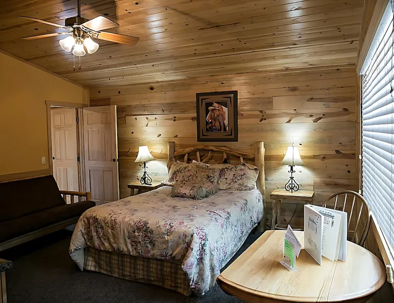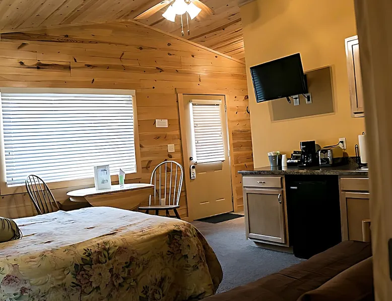 This charming duplex 1-bedroom cabin is conveniently located just 1.5 miles from Keystone and 4.5 miles from Mt. Rushmore, offering easy access to the region's premier attractions. Guests can explore the renowned Crazy Horse Memorial, the picturesque Custer State Park, and the stunning Badlands, all within close proximity to this cozy retreat. The space This luxurious one-bedroom duplex cabin features a queen bed and queen futon, perfect for a comfortable stay. Equipped with a microwave, refrigerator, and coffee maker, you can enjoy all the conveniences of home. The bathroom includes a shower for your convenience. Additionally, this cabin has a unique feature - a door that can open up to cabin 18, transforming it into a spacious three-bedroom, two-bathroom retreat. Experience the ultimate in flexibility and comfort during your stay in this versatile cabin.