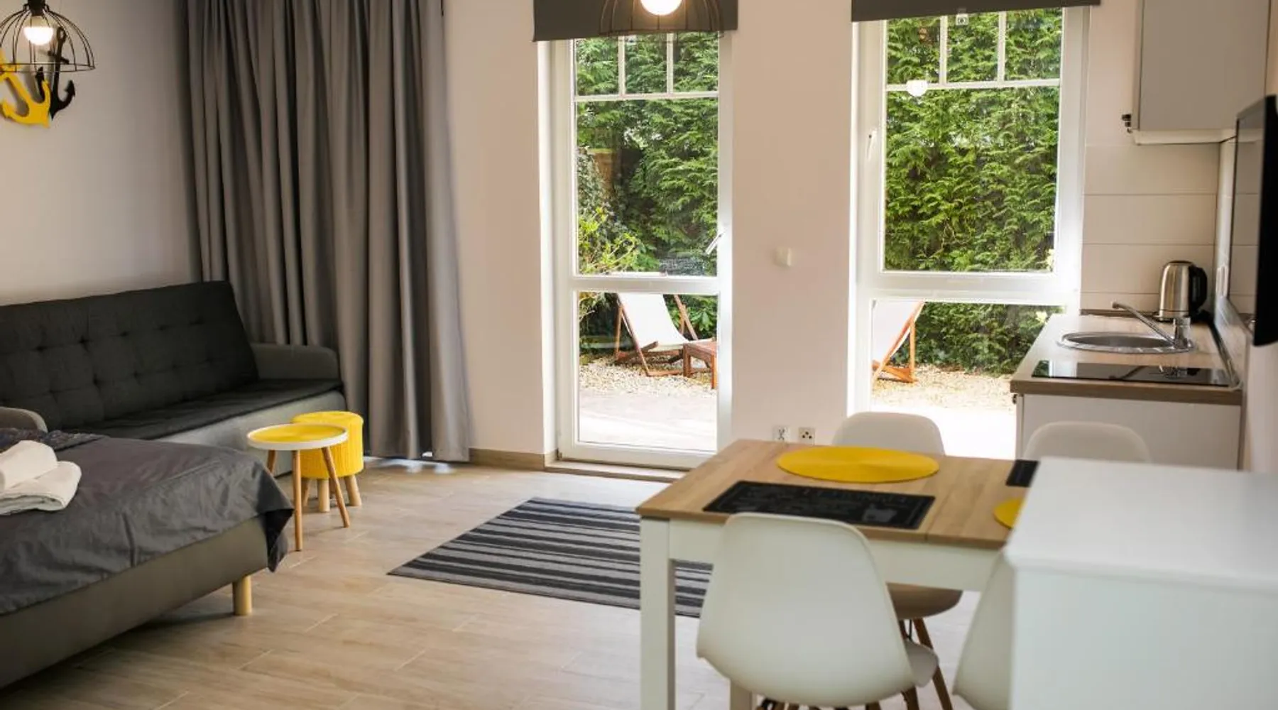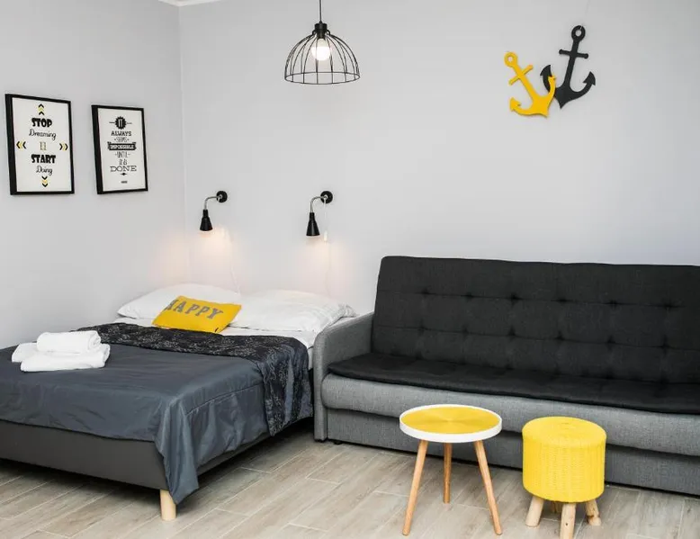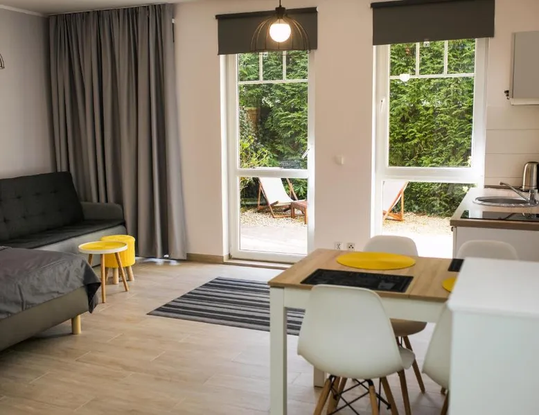Comfortable Accommodations: Baltic Vip Apartamenty Marino in Rewal offers family rooms with private bathrooms. Each apartment includes a sofa bed, refrigerator, TV, electric kettle, kitchenware, wardrobe, stovetop, terrace, hot tub, kitchenette, balcony, spa bath, washing machine, and garden views. Convenient Facilities: Guests can enjoy a children's playground and paid on-site private parking. Additional amenities include a dining area, work desk, and outdoor furniture. Local Attractions: Rewal Beach is a 4-minute walk away. Nearby attractions include Kolobrzeg Old Town Hall (30 mi), Kołobrzeg Railway Station (30 mi), Kolberg Pier (30 mi), Kołobrzeg Lighthouse (30 mi), Miedzyzdroje Walk of Fame (29 mi), Amber Baltic Golf Club (21 mi), Polish Arms Museum (29 mi), Stadium Kolobrzeg (29 mi), St. Mary's Basilica (29 mi), and Kolberg Fortress (30 mi). Activities: Guests can enjoy cycling and relax in the hot tub. Boasting 1 bedroom and 1 bathroom with a shower, this apartment has a well-fitted kitchenette and a terrace. The well-fitted kitchenette has a stovetop, a refrigerator, kitchenware and an electric kettle. The apartment offers a flat-screen TV, a wardrobe, a sofa, a tiled floor as well as garden views. The unit offers 2 beds.