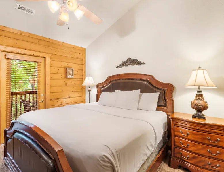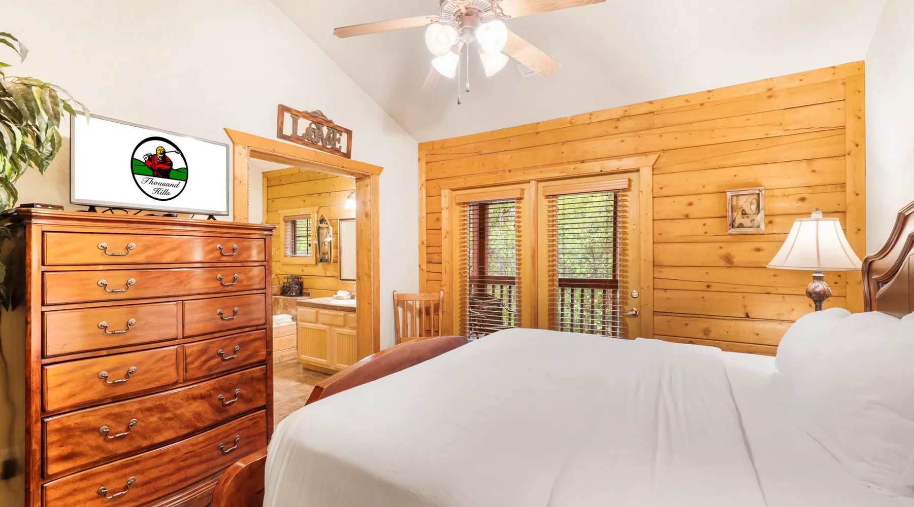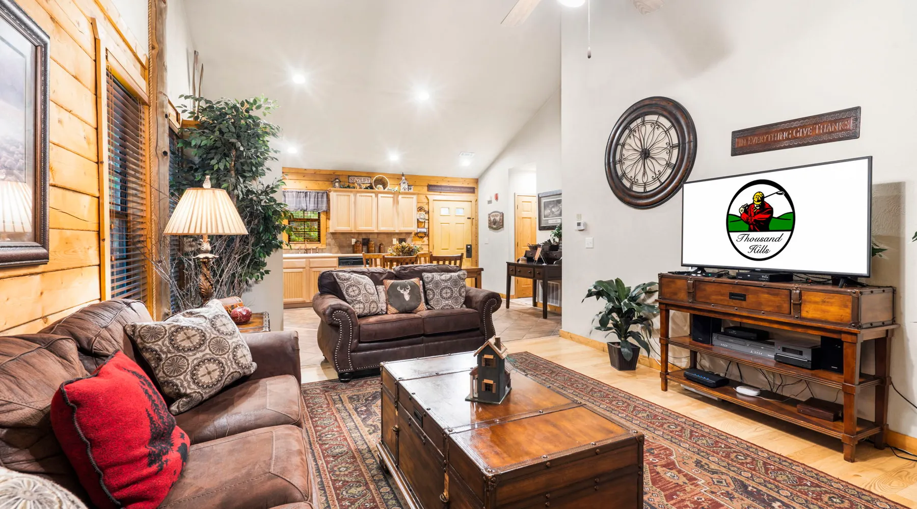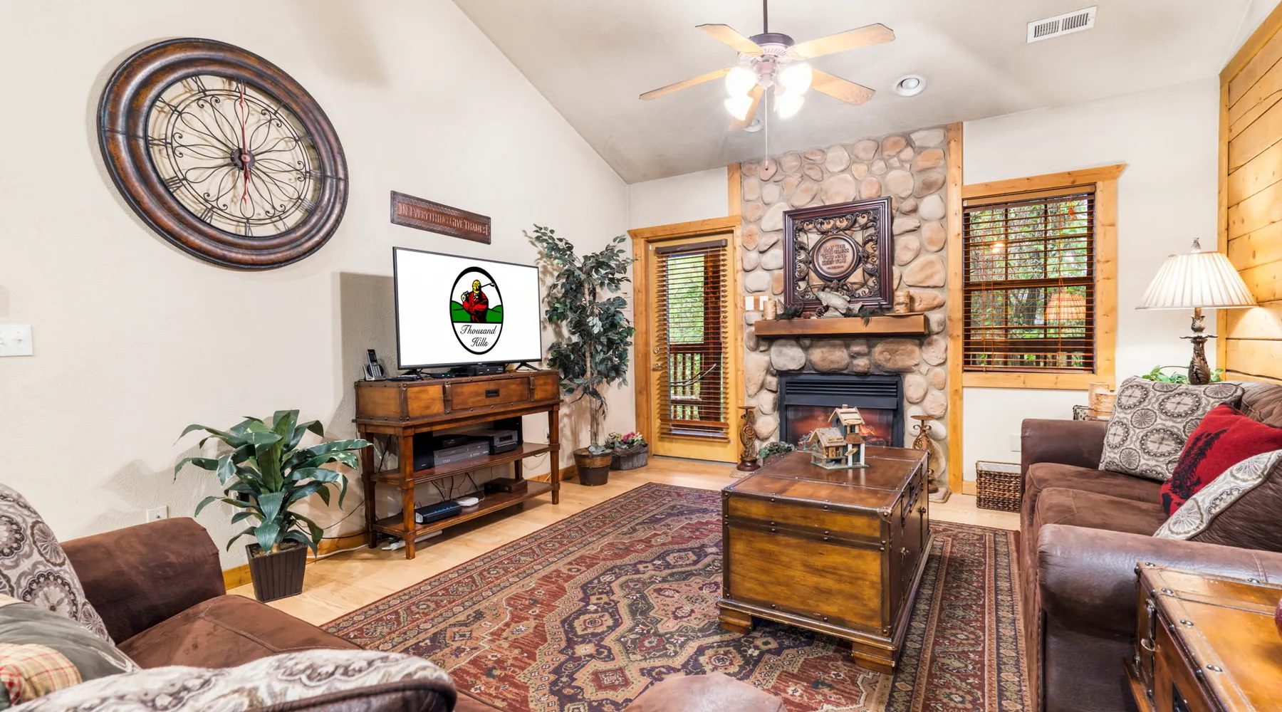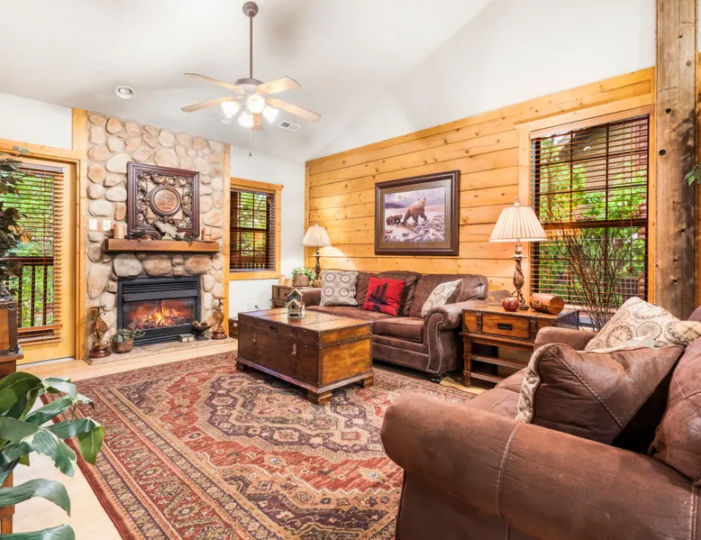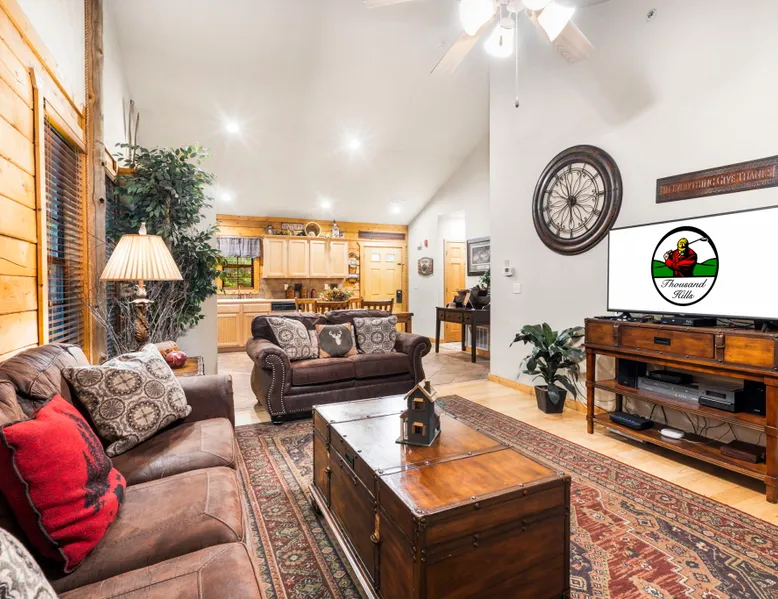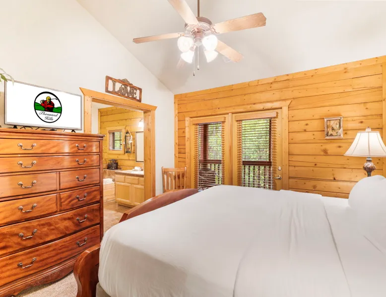 Enjoy exclusive savings on popular Branson shows and attractions just for booking with us! See details below! A rustic vibe meets comfortable elegance in this two-bedroom, two-bathroom cedar log cabin in the heart of Branson. Perfect for a family getaway, it has everything you need to relax and enjoy the beauty of the Ozarks while remaining only a few minutes from the city's shopping and entertainment. Each king bedroom has a private bath - one with a jacuzzi tub and the other with a double shower. The living room features a cozy fireplace, a queen-sized sofa bed, and cable TV/DVD. A fully-equipped kitchen with a dining room and an in-unit washer and dryer make this cabin perfect for longer stays. Enjoy free wireless internet and seasonal outdoor pool access. Get 4 show or attraction tickets at deeply discounted prices when you book with us! Choose from over 30 of the hottest entertainment options the Live Entertainment Capital of the World has to offer! Just follow two easy steps: Complete the booking process. Send us a message to let us know you want the best savings in town! We beat all prices on Branson tickets - guaranteed!Shows and attractions sell out quickly, so we highly recommend that you contact us in advance of your stay to ensure the best seats! **Offer exclusive to guests of Thousand Hills Vacations. Activities are subject to availability and partners' participation is subject to change at any time.** Accommodations: Dryer, Meal delivery, Other Services Concierge, Other Services Private Chef, Tumble dryer, Wifi Amenities: Air Conditioning, Bed Linens, Cable/satellite TV, Clothing storage, Dryer, Essentials, Extra Pillows And Blankets, Fireplace, Free Wifi, Hair Dryer, Hangers, Heating, Internet, Internet Access, Iron, Iron Board, Linens provided, Parking, Parking space, Parking space Accessible, Private Entrance, Shampoo, Smart TV, TV, Towels, Towels provided, Washer Attractions: Autumn Foliage, Theme Parks, Water Parks Entertainment: Satellite or Cable Entertainment Options: Wi-Fi Kitchen and Dining: Baking sheet, Blender, Coffee, Coffee Maker, Cooking Basics, Dining Area, Dining table, Dishes Utensils, Dishwasher, Freezer, Fridge, Kitchen, Microwave, Oven, Refrigerator, Stove, Toaster, Wine glasses Leisure: Antiquing, Bird Watching, Boating, Bowling, Horse riding nearby, Miniature Golf, Outlet Shopping, Paddle Boating, Shopping, Water Sports, Wildlife Viewing Local Features: ATM Bank, Fitness Center, Groceries, Hospital, Laundromat, Resort access Outdoor: Balcony/Terrace, Grill Outdoor Amenities: Boat Access Nearby, Marina Nearby, Recreational Parks Nearby Pool/Spa: Outdoor pool shared Safety Features: Carbon Monoxide Detector, Fire Extinguisher, Outdoor Lighting, Smoke Detector Sports and Adventure: Cycling, Cycling trips, Fishing nearby, Golf, Golf Optional, Hiking, Hiking trips, Hot Air Ballooning, Jet Skiing, Kayaking, Parasailing, Sailing, Scuba or Snorkeling, Skiing Water, Snorkeling, Snorkeling / Diving, Swimming, Tennis courts nearby, Tubing Water, Watersports nearby Suitability: Air Conditioning, Children Welcome, Fireplace, Free Parking Vacation Rental Pool/Spa: Community Outdoor Pool