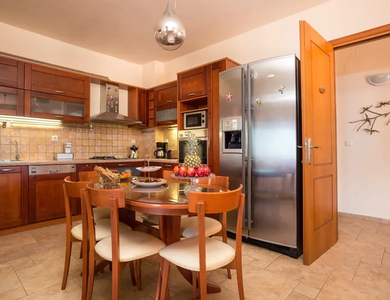 Acorn Villa is approved by Greek Tourism Organisation & managed by "etouri vacation rental management". Acorn Villa is a single-story 200 sq.m. residence with high-quality finishes throughout, offering spectacular views of the sea and mountains! It is situated on a private 12-acre plot on the outskirts of Rethymno city, adjacent to the villages of Gallos and Atsipopoulo. The space Acorn Villa Furnished with stylish, romantic touches, Acorn Villa comfortably accommodates 10 guests across 4 beautifully designed bedrooms. Nestled amidst an oak forest, the villa offers the perfect balance of seclusion and accessibility, just 6.5 km from the organized sandy beach of Rethymno and boasting stunning views of the Cretan Sea. Indoor Layout - Spacious and cozy living room with a large sofa, 55” Smart TV (Netflix), - PlayStation 3, and a fireplace. - Open-plan dining space adjacent to the kitchen, ideal for family meals. - Fully equipped with top-quality fixtures and appliances for a self-catered holiday. - A dedicated workspace for those needing to catch up on tasks. - Gym Area including fitness equipment such as a treadmill, steps, and ABS machines, along with a table tennis and football table. Bedrooms: - Master Bedroom 1: King-size bed, en-suite bathroom with shower, balcony access with sea views. - Master Bedroom 2: King-size bed, en-suite bathroom with shower, balcony access with mountain and sea views. - Bedroom 3: Three single beds, shared bathroom with Jacuzzi tub, balcony access. - Bedroom 4: Three single beds (attic level), shared bathroom with modern shower. All bedrooms have air conditioning, TV, closet space, and access to the outdoor areas. Outdoor Area -Swimming Pool: 40 sq.m pool with a small water slide, gated for children's safety with an alarm system. - Fully independent barbecue house with a charcoal BBQ, wood oven, kitchenette, refrigerator, dining area, and outdoor shower. - Kids' playground shaded by oak trees. - Table tennis, table football, bicycles, and a small basketball court. - Multiple furnished spots with sunbeds, umbrellas, and seating around the villa’s garden and veranda. - Vegetable and fruit garden with seasonal produce. - Privacy: Fully fenced property offering 100% privacy with a private garage. **Accommodation cost excludes Climate Resilience Tax. The amount for the accommodation type is set at €15 per night from April to October and €4 per night from November to March, payable upon check in. Guest access Guests will have access and full privacy to all areas indoor and outdoor! Other things to note This villa is under “etouri vacation rental management” which means: - We organised the villa down to every detail and check it annually. - Quick booking process and support in every step of your holidays. - A personal holiday advisor at your disposal for holiday organisation (free concierge service before and during stay). - Assistance in booking services and excursions. - Pre arrival service with detailed information of the area of the villa. Special events are allowed upon request for up to 50 guests, additional charges apply. SERVICES : Our services included in the price: - Welcome Basket - Cleaning every 3 days - Linen and towel change every 3 days - Pool towels provided - Pool and garden maintenance every day - Cleaning and pool maintenance 2 or 3 times a week (depends on the weather). Services upon request (extra charge): Doctor on call - Massage - Beauty treatments - Yoga and/or Pilates mat sessions - Daily cleaning - Baby sitting - Daily excursions - Diving - Car or Bicycle rent - Photographer - Delivery of traditional Cretan food to your place - Airport transfer - Cook (Chef) in your villa. Please tell us your wish and we will try to make it reality! Registration details 1041K91003233301