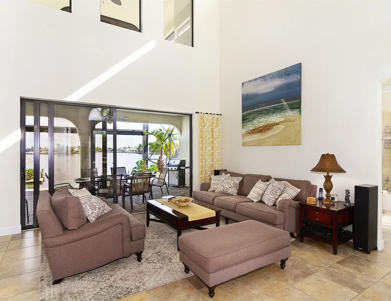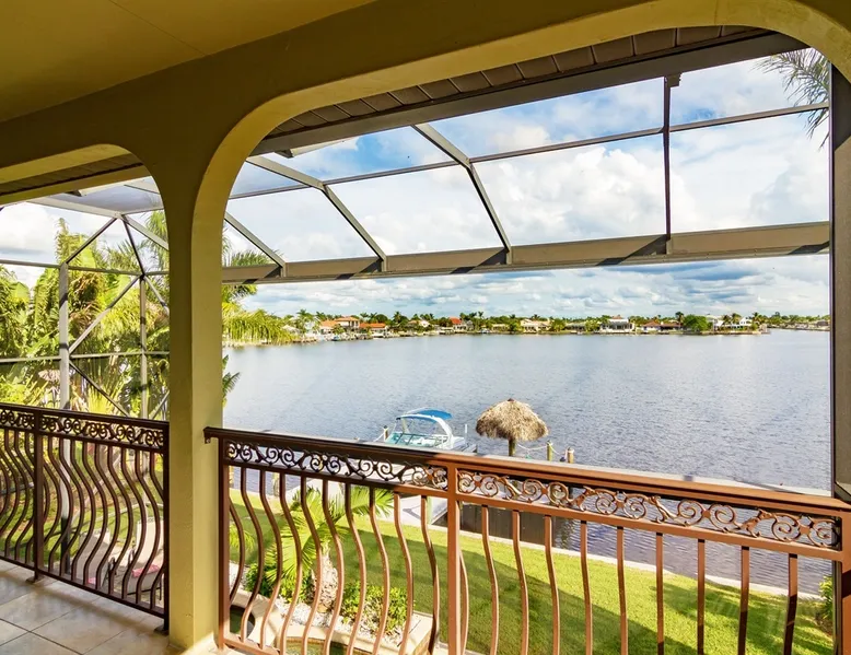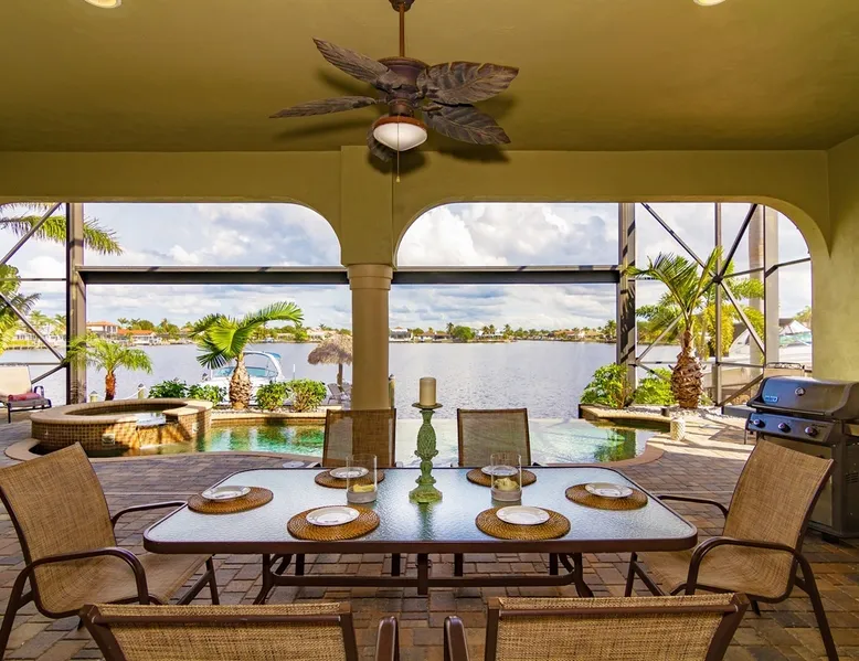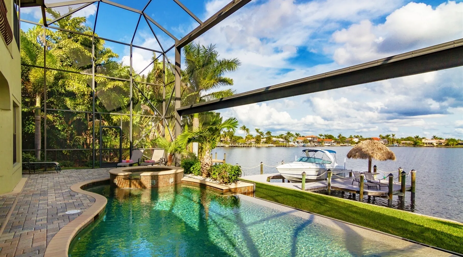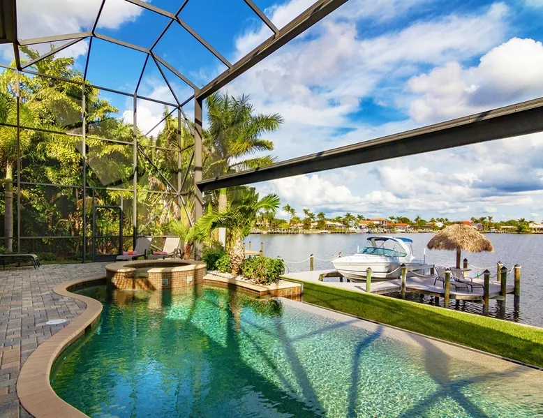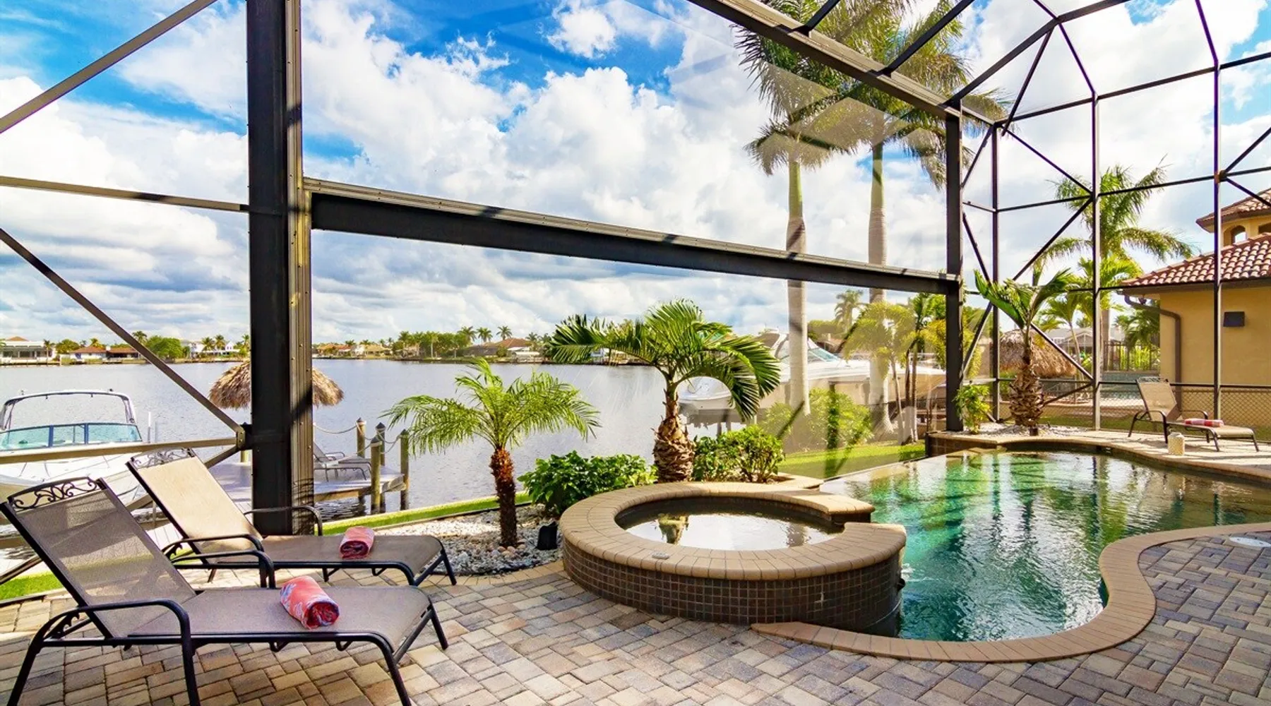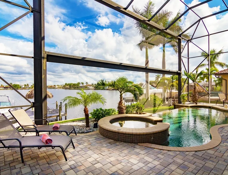 Tropical Waterfront Paradise with Gulf Access. Heated infinity pool and spa. The space Stylish, spacious villa for 10 people in a prime location on Britannia Lake, dream view. This high standard 5 bedrooms (two king-size, three queen-size), 4-bathroom villa offers everything for a memorable holiday. Enjoy the expansive, breathtaking views of the water from the large sun deck with a heated infinity pool and spa, or from the inviting veranda on the 2nd floor. The master suite as well as the second living room are upstairs on the second floor so you'll have plenty of space for yourself. Relax under the tiki hat on the boat dock for happy hour and watch the fish and dolphins. Early risers will be rewarded with unique sunrises over the lake. By boat you can reach the river in 20 minutes (without lock), the marina, restaurants, and supermarkets are in the immediate vicinity. The same applies to a large selection of golf courses and the tropical islands of Sanibel and Captiva. The house has full entertainment electronics including free wireless internet access, each bedroom is equipped with a TV. You will be required to sign a rental agreement and credit card authorization form, which can be done electronically. You must be at least 25 years old to rent this property. Access to the home will be restricted if requirements are not completed. This property requires an energy contribution payment of $0.22 per KWh plus tax. Please note it when making your reservation. Short Description Stylish, spacious villa for 10 people in a prime location on Britannia Lake, dream view. This high standard 5 bedrooms (two king-size, three queen-size), 4-bathroom villa offers everything for a memorable holiday. Enjoy the breathtaking views of the water from the large sun deck with a heated infinity pool and spa, or from the inviting veranda on the 2nd floor. The Space Relax under the tiki hat on the boat dock for happy hour and watch the fish and dolphins. Early risers will be rewarded with unique sunrises over the lake. By boat you can reach the river in 20 minutes (without lock), the marina, restaurants, and supermarkets are in the immediate vicinity. The same applies to a large selection of golf courses and the tropical islands of Sanibel and Captiva. The house has full entertainment electronics including free wireless internet access, each bedroom is equipped with a TV. On the terrace is a large Weber grill available. Features Description You will be required to sign a rental agreement and credit card authorization form, which can be done electronically. The minimum age to place a reservation is 25 years. Access to the home can be restricted if requirements are not completed. This property requires an energy contribution payment of $0.22 per KWh plus tax. A hold of $15 per day is required and will be placed on your card prior to your arrival. The actual amount will be charged after your stay based on your energy consumption.