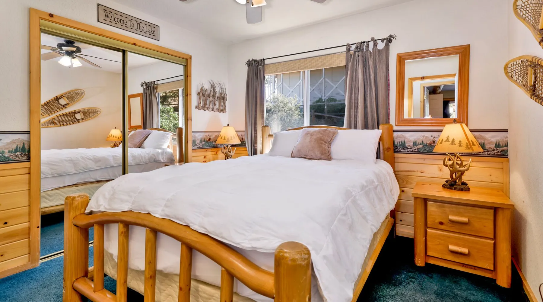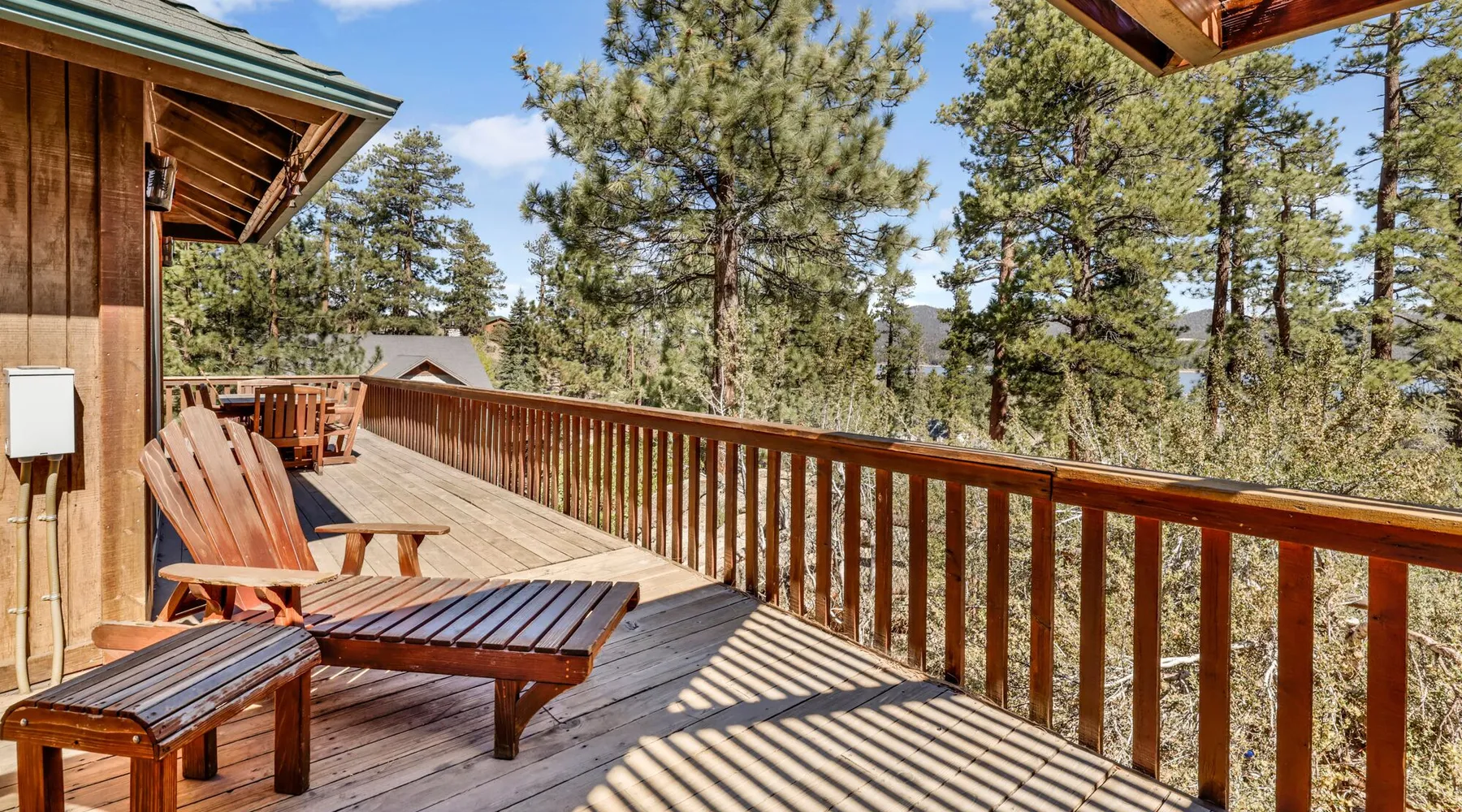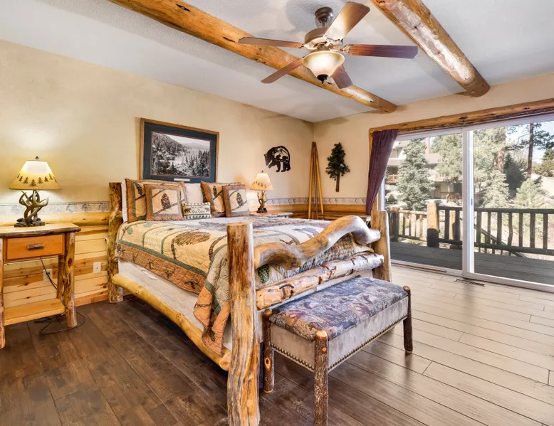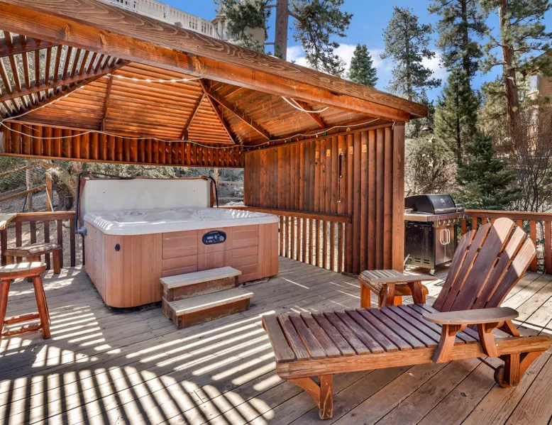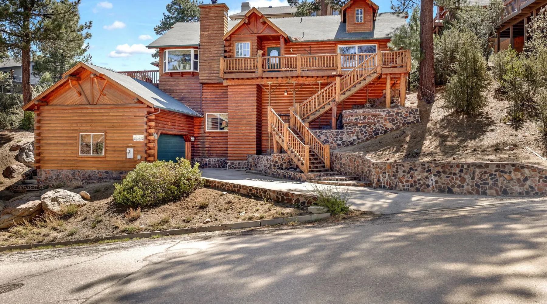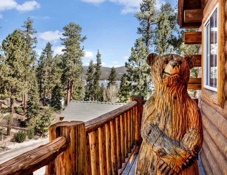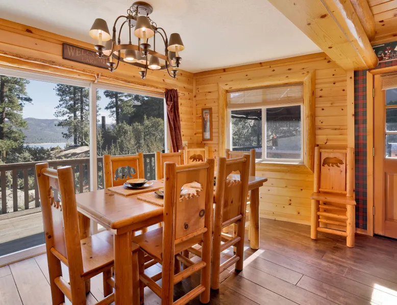 Alpine Lodge Cozy Cabin w/ Hot Tub Alpine Lodge is the perfect getaway log cabin for those looking to enjoy the best of Big Bear at their fingertips. Our charming lake-view home sits just above the Village and lake, featuring the essentials for a perfect mountain vacation in the trees, and the best walkable location in town year round. Boasting central forced heat, cathedral pine beamed ceilings, a packed game room guest apartment above the garage, and your own private hot tub under the stars on the sun deck, your group will be comfortable and cozy no matter the season! After climbing the stairs you will enter into your cozy and comfortable living room area which boasts custom mountain furnishings and décor, wonderful mountain views, and breathtaking floor to ceiling windows for you to enjoy the views or snow falling outside. Snuggle up on the plush couches and chairs as you warm up around the toasty river rock wood burning fireplace or enjoy a movie night or Game Day on the mounted flat screen TV with complimentary Cable and hi speed WIFI provided for your enjoyment. Enjoy direct access here out to your gorgeous sun deck with ample patio furnishings and a propane BBQ for your enjoyment. Soak up your day of adventures on the lake here in your own private hot tub under the stars in the evenings. The chef of your group will love the equipped open floor-plan kitchen and dining room areas, complete with massive windows overlooking the gorgeous lake and valley, you will love enjoying your meals here at the custom log dining table! The beautiful kitchen offers pine cabinets stocked with cooking essentials and appliances including a dishwasher to whip up your home-cooked meals. This main level boasts a separate laundry room area with a washer and dryer for those wet snow clothes and long term stays while you can enjoy direct deck access to the wonderful sun deck here. Being a single level chalet you will have easy and convenient access to your main house bedrooms and bathrooms each of which is made up for your group with warm linens, blankets, pillows, and fresh shower towels when you arrive for your vacation. Head outside and down the stairs through the 2 car garage to gain access to your SEPARATE game room and 4th bedroom guest apartment. This private escape offers a comfy Sleeper Sofa and half bath paired with a full size pool table, toasty gas faux log fireplace, and an added TV with Cable available. This is the perfect separation for the teens or a couple vacationing along that deserves a little bit more privacy while still being able to enjoy the mountain together. Alpine Lodge truly has it all- pairing the necessities from home with all that you would need in your next vacation home along with a prime downtown location, your group will be sure to make the best memories here! Hop in the car and you are at either ski resort or the grocery store in under ten minutes! Sleeping Arrangements: Bedroom 1: Queen Bed, TV w/Cable, Private Open Bath, Private Balcony Bedroom 2: Queen Bed Bedroom 3: Full/Twin Bunk Separate Apartment Above Garage- Queen Sofa Sleeper, Pool Table, TV w/ Cable, Half Bath Bathroom Arrangements Private Full Bath- Bedroom 1- Hallway Full Bath- Half Bath- Apartment Above Garage -Sleeps 9 -3 Car Parking | Driveway (2) + Garage (1) -2 Pets Welcome w/ Additional Fee -2,204 Square Feet City Permit # VRR-2024-2380