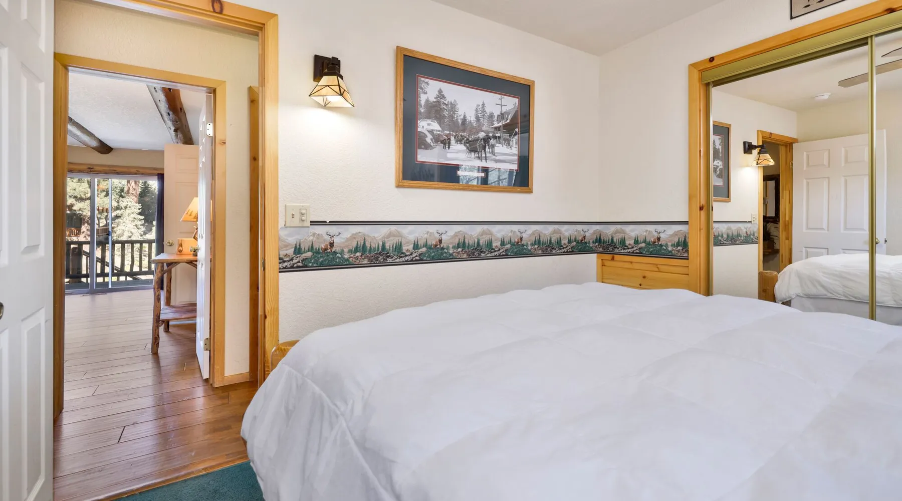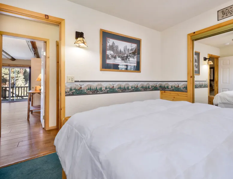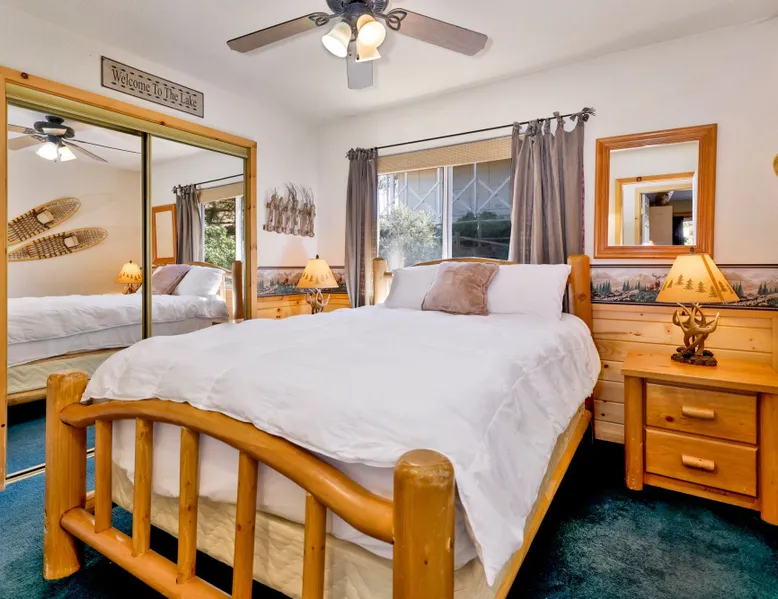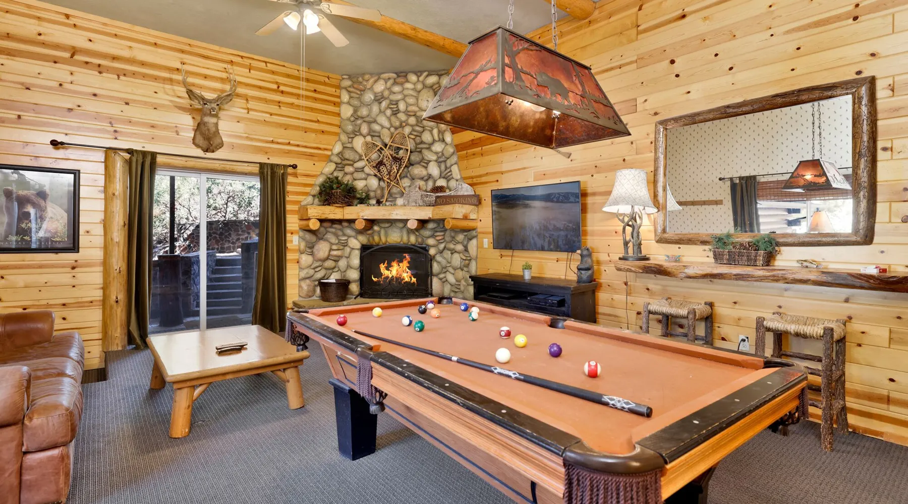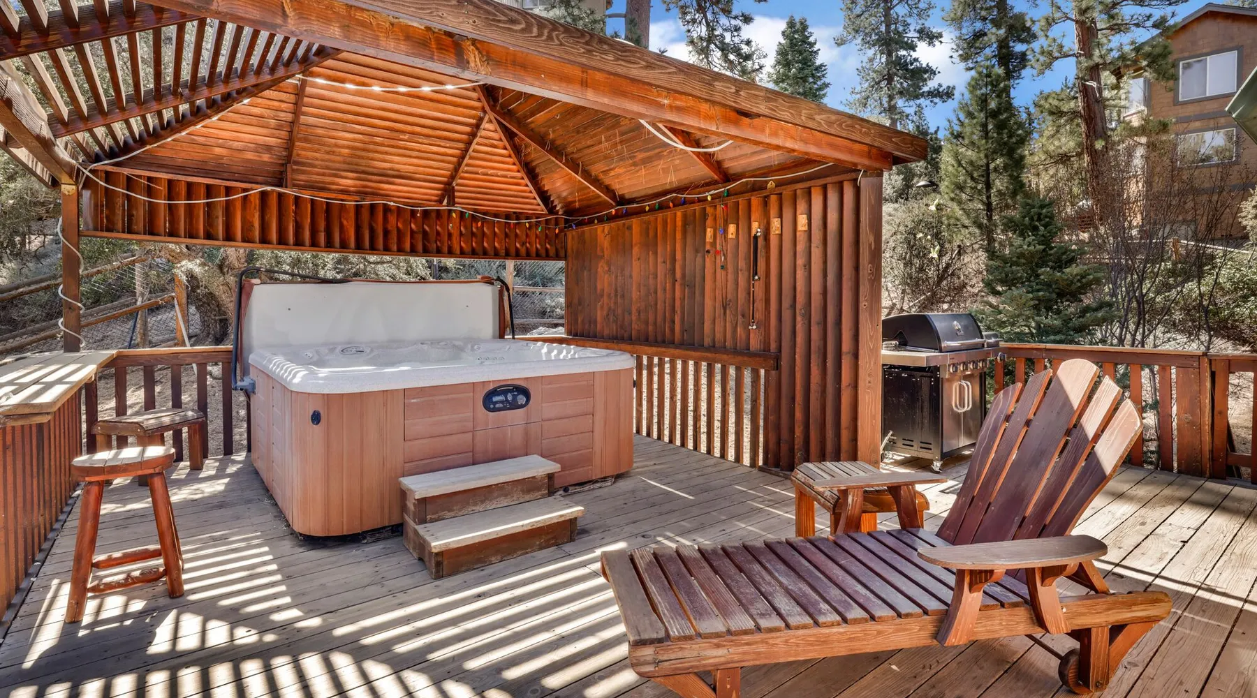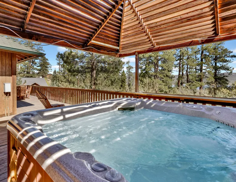 Alpine Lodge Cozy Cabin w/ Hot Tub Alpine Lodge is the perfect getaway log cabin for those looking to enjoy the best of Big Bear at their fingertips. Our charming lake-view home sits just above the Village and lake, featuring the essentials for a perfect mountain vacation in the trees, and the best walkable location in town year round. Boasting central forced heat, cathedral pine beamed ceilings, a packed game room guest apartment above the garage, and your own private hot tub under the stars on the sun deck, your group will be comfortable and cozy no matter the season! After climbing the stairs you will enter into your cozy and comfortable living room area which boasts custom mountain furnishings and décor, wonderful mountain views, and breathtaking floor to ceiling windows for you to enjoy the views or snow falling outside. Snuggle up on the plush couches and chairs as you warm up around the toasty river rock wood burning fireplace or enjoy a movie night or Game Day on the mounted flat screen TV with complimentary Cable and hi speed WIFI provided for your enjoyment. Enjoy direct access here out to your gorgeous sun deck with ample patio furnishings and a propane BBQ for your enjoyment. Soak up your day of adventures on the lake here in your own private hot tub under the stars in the evenings. The chef of your group will love the equipped open floor-plan kitchen and dining room areas, complete with massive windows overlooking the gorgeous lake and valley, you will love enjoying your meals here at the custom log dining table! The beautiful kitchen offers pine cabinets stocked with cooking essentials and appliances including a dishwasher to whip up your home-cooked meals. This main level boasts a separate laundry room area with a washer and dryer for those wet snow clothes and long term stays while you can enjoy direct deck access to the wonderful sun deck here. Being a single level chalet you will have easy and convenient access to your main house bedrooms and bathrooms each of which is made up for your group with warm linens, blankets, pillows, and fresh shower towels when you arrive for your vacation. Head outside and down the stairs through the 2 car garage to gain access to your SEPARATE game room and 4th bedroom guest apartment. This private escape offers a comfy Sleeper Sofa and half bath paired with a full size pool table, toasty gas faux log fireplace, and an added TV with Cable available. This is the perfect separation for the teens or a couple vacationing along that deserves a little bit more privacy while still being able to enjoy the mountain together. Alpine Lodge truly has it all- pairing the necessities from home with all that you would need in your next vacation home along with a prime downtown location, your group will be sure to make the best memories here! Hop in the car and you are at either ski resort or the grocery store in under ten minutes! Sleeping Arrangements: Bedroom 1: Queen Bed, TV w/Cable, Private Open Bath, Private Balcony Bedroom 2: Queen Bed Bedroom 3: Full/Twin Bunk Separate Apartment Above Garage- Queen Sofa Sleeper, Pool Table, TV w/ Cable, Half Bath Bathroom Arrangements Private Full Bath- Bedroom 1- Hallway Full Bath- Half Bath- Apartment Above Garage -Sleeps 9 -3 Car Parking | Driveway (2) + Garage (1) -2 Pets Welcome w/ Additional Fee -2,204 Square Feet City Permit # VRR-2024-2380