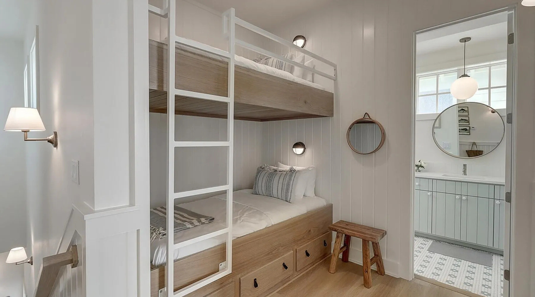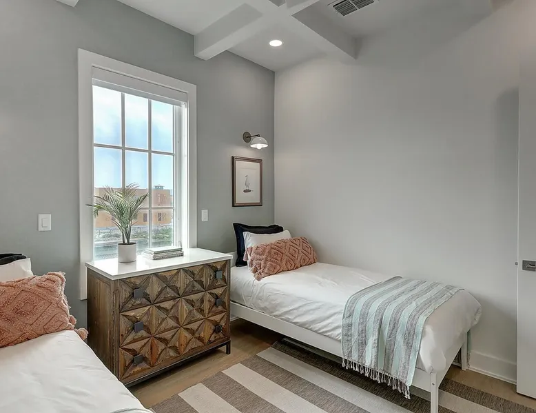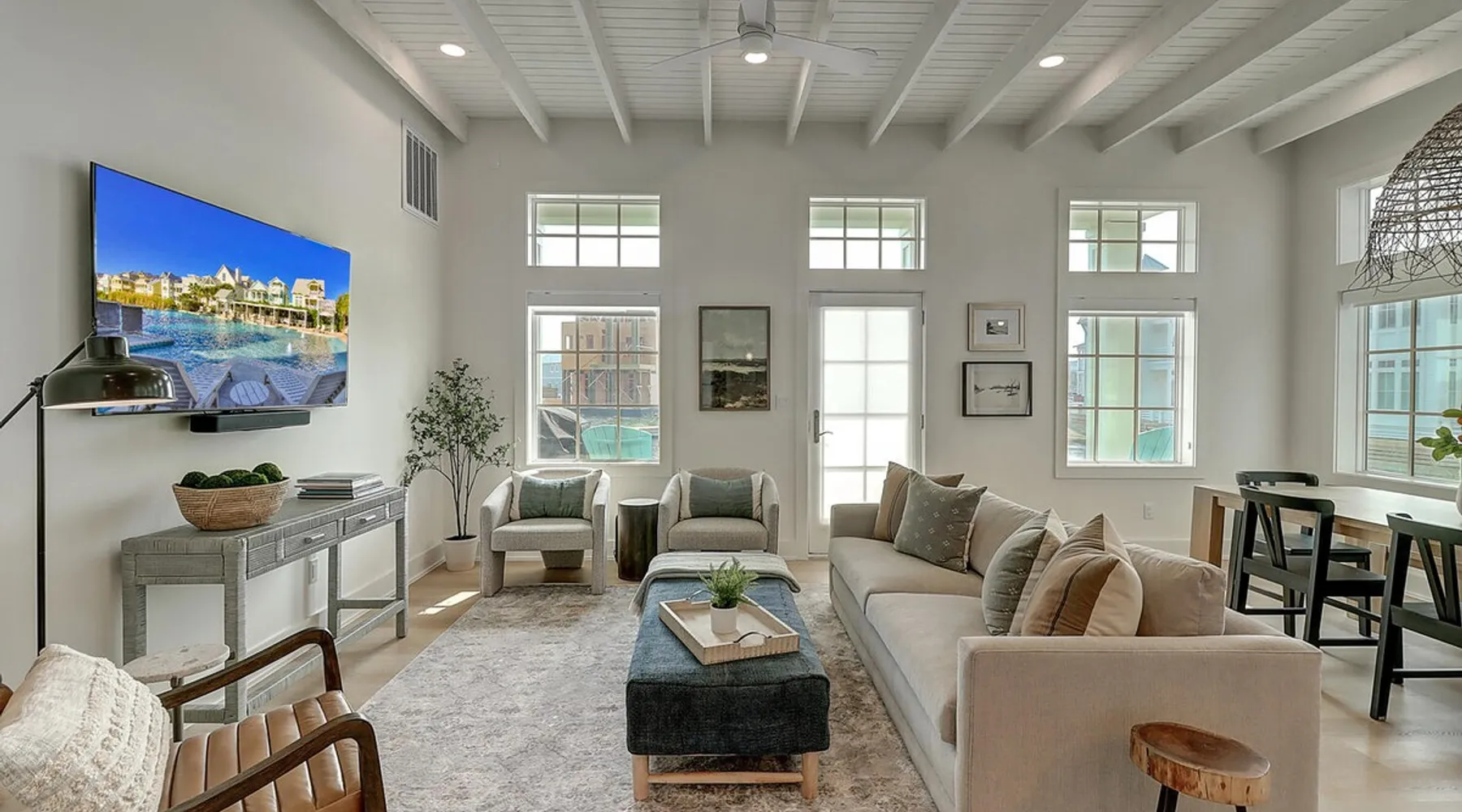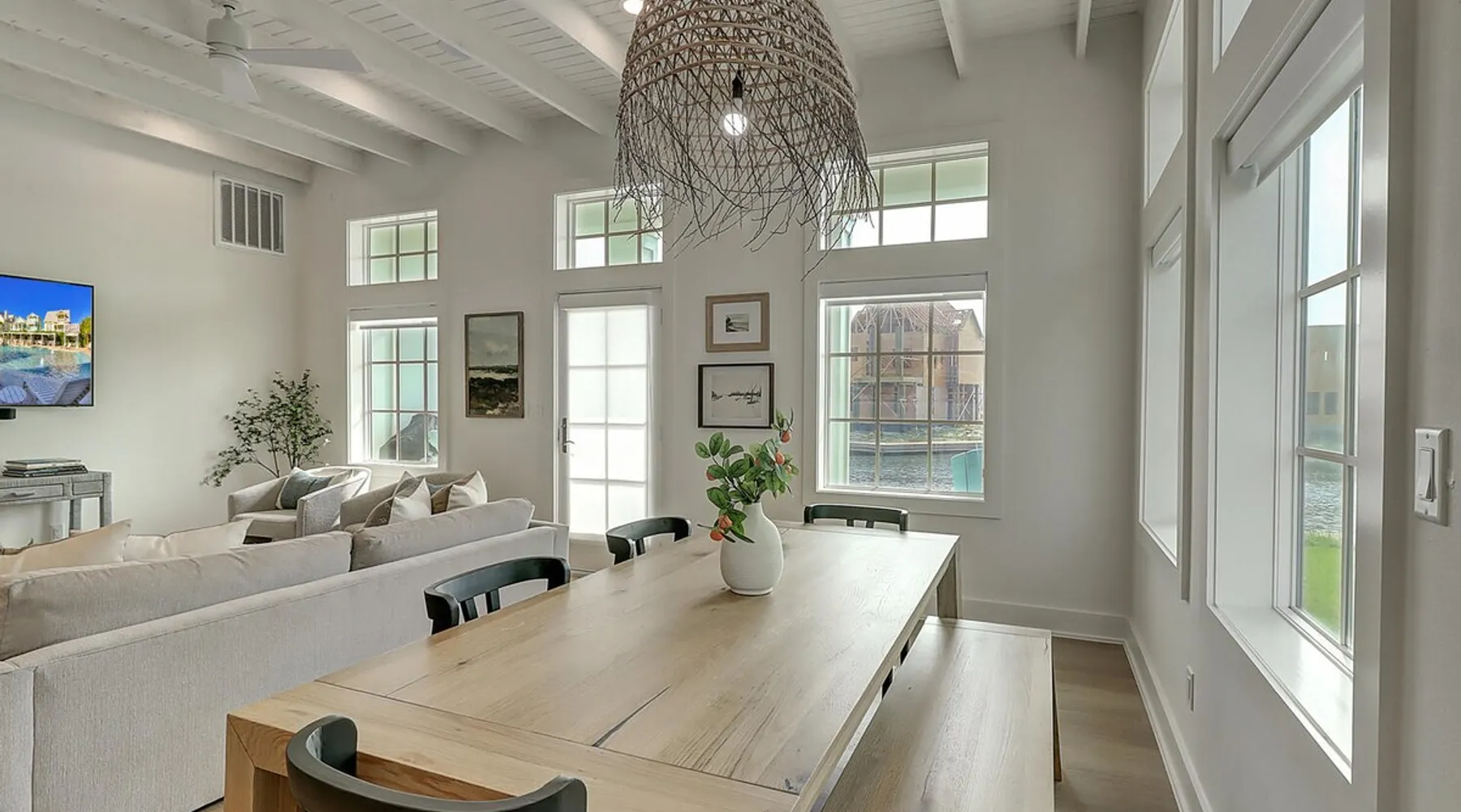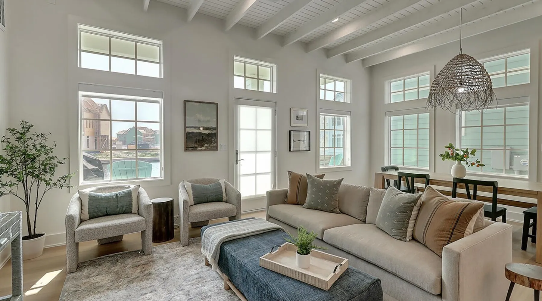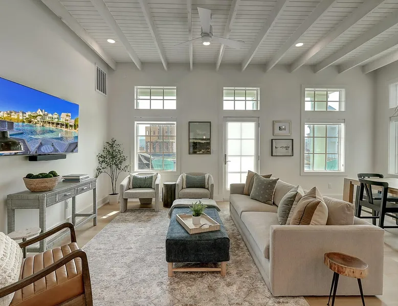 This three-bedroom beauty backs up to the lake at Cinnamon Shore South! You’ll have easy access to the lake boardwalk, the community’s stunning, new, cabana-lined pool, and, of course, the dune crossover that leads to the beach! Relax amid coastal contemporary interiors and enjoy the extra bunk area that extends the sleeping quarters. Don’t forget: When you stay at South, you also have access to three more pools and on-site dining at Cinnamon Shore North—just one mile up the beach! The space AMENITIES: At South, enjoy resort-style amenities such as the Cabana Pool with infinity edge; the new Splish Splash Family Pool with infinity edge and splash pad; Tailwind Park, Coastline Fire Lounge and other parks; serene lakes and ponds; a community pier; overlook pavilions and playscape. You also can access amenities at Cinnamon Shore North: pools, lakes, fitness center, on-site restaurants, and Town Center fun. MAIN LIVING SPACE: A classic, coastal exterior opens to the home’s main living space on the first floor, combining comfortable family room, a great dining area seating 6, and a handsome, contemporary kitchen with gas range and stainless appliances. Stool seating at the island adds three spots for chatting with the cook or morning cereal for the kids. A powder room serves this gathering place. You’ll love the details, like vintage coastal artwork, wispy, wicker shades on light fixtures, and exposed rafters along the ceiling for cottage appeal. Sit back and enjoy the lake view through the multiple windows. SLEEPING QUARTERS: On the first floor, an open bunk offers an extra-large twin-over-twin bunk. Upstairs, the primary king suite feels spacious under the gabled roofline, and the bathroom offers dual vanities and a glass-front shower. A second master suite on this level also has a private bath, but with a tub/shower combo. Finally, a third bedroom presents a pair of extra-large twin beds, along with an area in the adjacent hallway offering another pair of extra-large twin bunks. A hallway bathroom serves all four of the bunkmates who can stay on this floor. GREAT FEATURES: Clean lines on furnishings and a mix of wood tones throughout create an eclectic look with a mid-century modern vibe. Simple, coastal artwork and details like a wooden, port hole-shaped mirror nod to the coast with the elegance of minimalism. An outdoor shower washes sand away when coming back from the beach, and a washer/dryer keeps beach towels and resort wear in order. The Salted Cottage combines the best of lakeside living and beach life! Enjoy the home’s stylish flair, made for relaxing times with family and friends. Book today! *Please be advised there is construction beside this property. Construction is limited to normal business hours 8am-6pm Monday-Saturday. Please call the office for more information. **Driving 1.5 miles is necessary from Cinnamon Shore South to access Cinnamon Shore North's amenities. ***NO PETS ALLOWED*** IF A PET IS SEEN ENTERING A NON-PET-FRIENDLY HOME, THE GUEST WILL BE CHARGED A PENALTY AND/OR EVICTED. The Salted Cottage is a non-pet friendly property, if a pet is seen entering The Salted Cottage the homeowner and/or Cinnamon Shore Vacation Rentals has the right to immediately evict the renter with no refunds, regardless of the time of day or night. An automatic non-refundable penalty fee of $1000 will be added to the reservation, as well as any additional charges related to cleaning fees and/or damage in the home. Please review all policies at: *Please be advised there is construction at the Cinnamon Shore South property. Construction is limited to normal business hours 8 am-6 pm Monday-Saturday. Please call the office for more information. **Driving 1.5 miles is necessary from Cinnamon Shore South to access Cinnamon Shore North's amenities. *Smart TV and Live TV capabilities available, no direct cable STRR#572518
