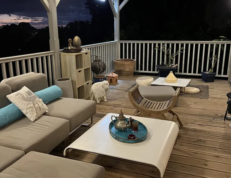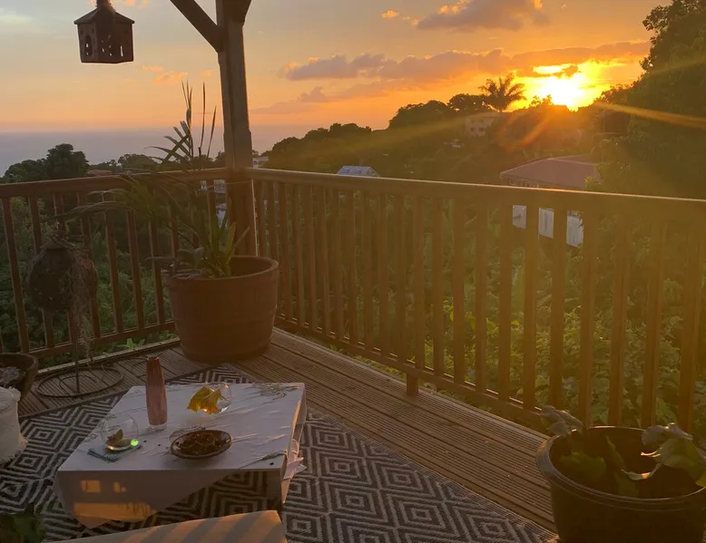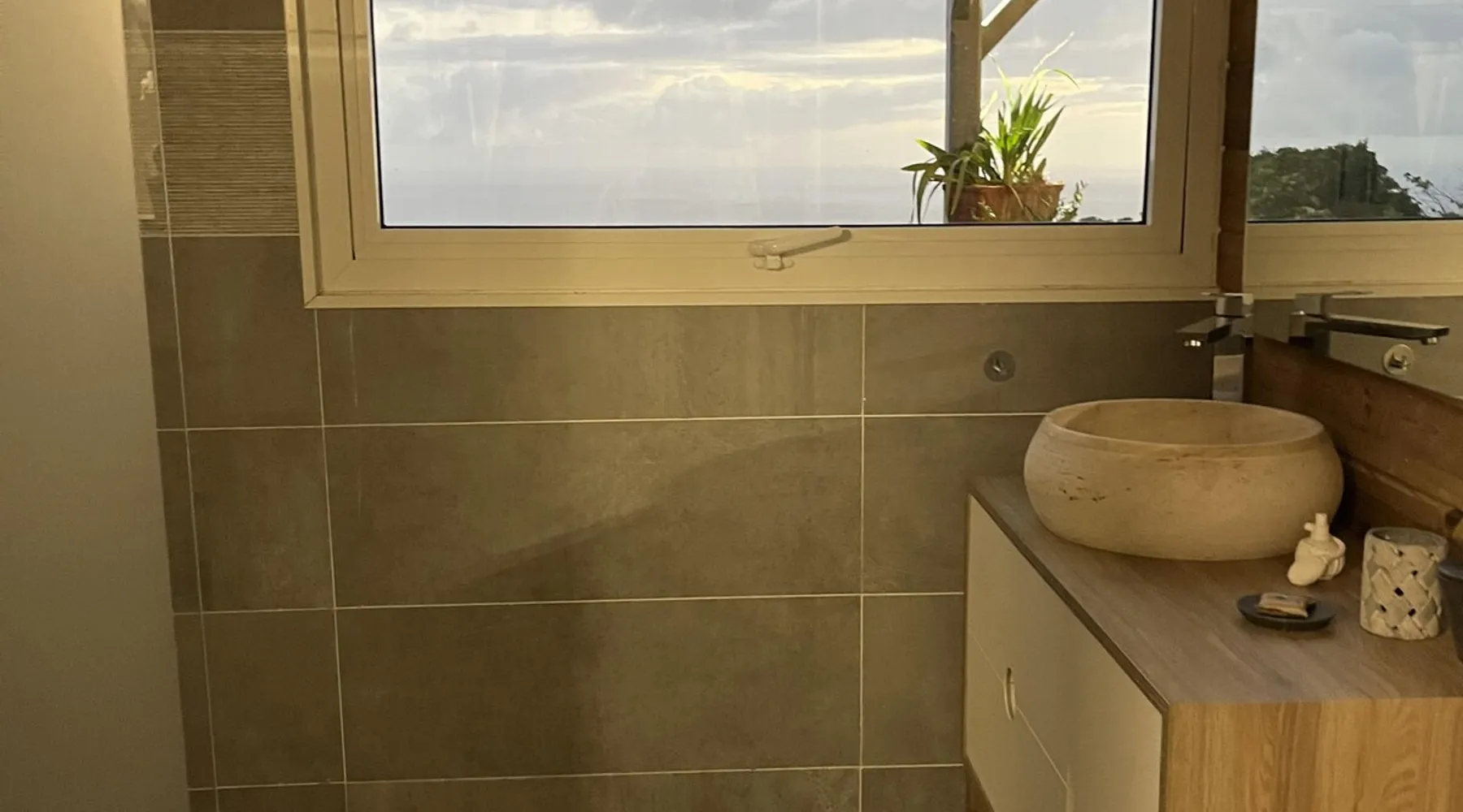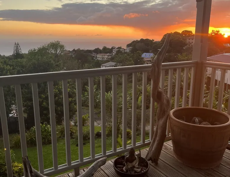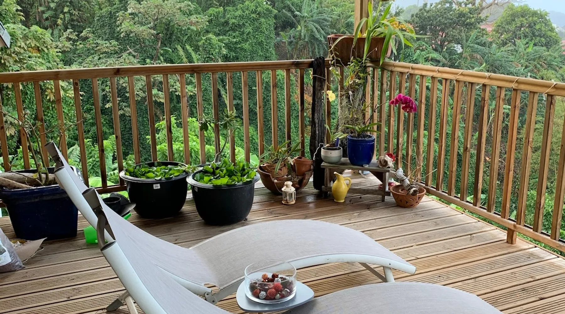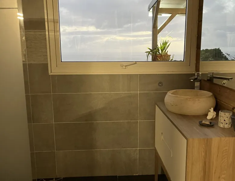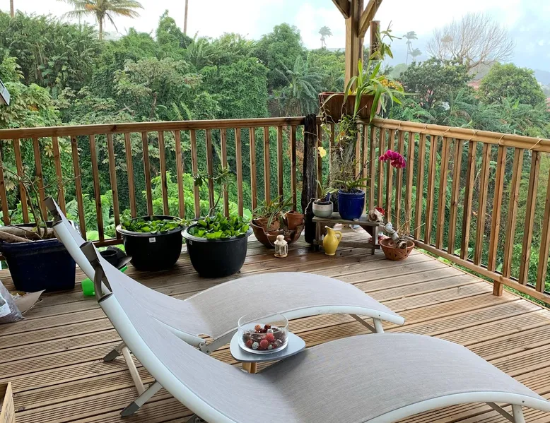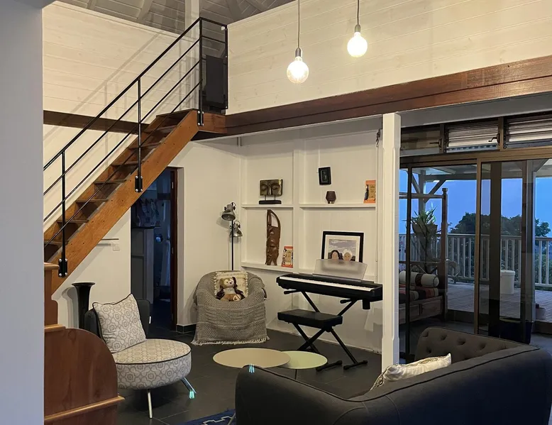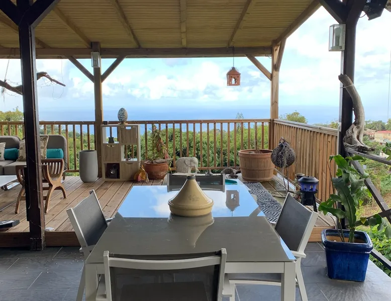 Superb house, close to the soufrière, in the middle of a tropical garden in edge of river. You have a comfortable accommodation, widely opened on the outside. The environment is calm, while being close to the amenities of the town of Saint Claude. The space Superb house, near the soufrière, in the middle of a tropical garden in edge of river. In this green setting you will have two double bedrooms with shower room, toilet and large closet, A fully equipped kitchen (dishwasher, fridge freezer, induction and gas hob, electric oven, juicer, Nespresso..... coffee maker). A large living room largely open to the outside giving access to the large suspended terrace allowing you to enjoy a panoramic view of the Caribbean Sea and its sunsets. The terrace has tables, chairs, an outdoor bed, a lounge and two deckchairs to enjoy the panorama. Upstairs is the mezzanine with its reading corner, the sofa to enjoy the television (Netflix) and a desk facing the same view as the terrace. The house is equipped with a washing machine, an iron and an ironing board, and a wifi connection.