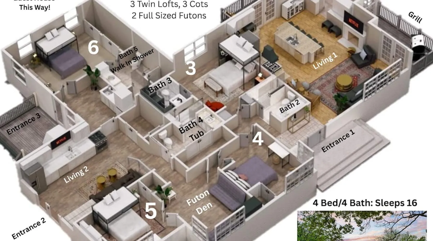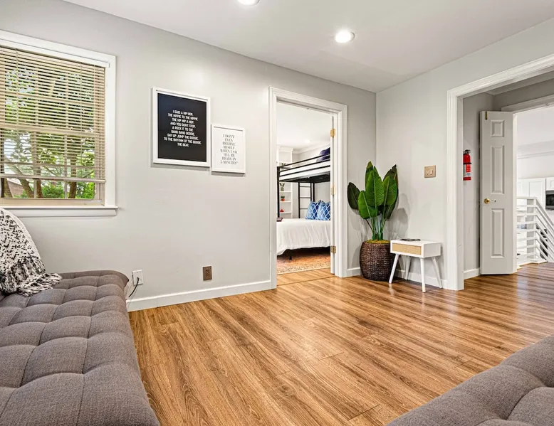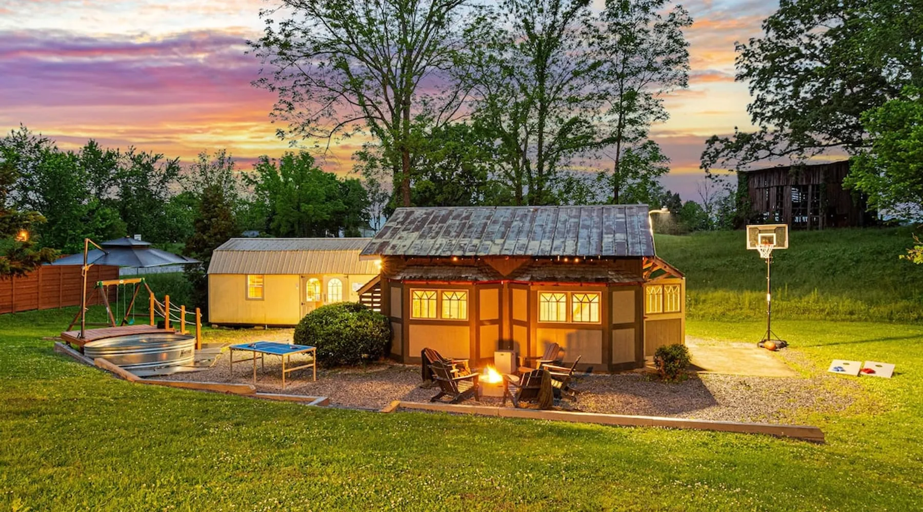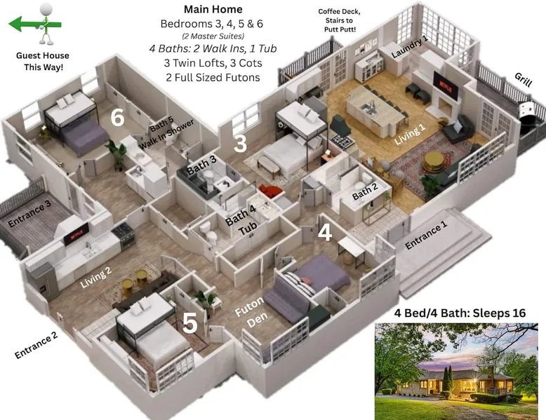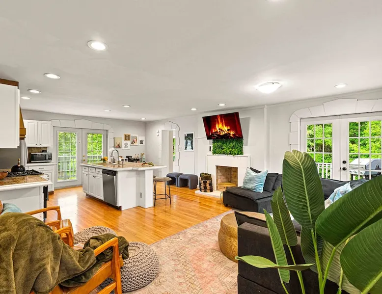 Imagine sipping a cocktail in the plunge pool or hot tub while the kids play ping pong, putt putt & basketball nearby. Imagine gathering around the fire pit under the stars after a big family meal in the boathouse. Imagine each family having their own space — and then coming together for movie night in the game shed. Create forever memories in a home where Grandma, Sister, Brother & all the grandkids have something to enjoy! The space Built for multi-generational families, our home lets you gather together while still having your own space and privacy. Nestled in the peaceful Tennessee countryside just 25 minutes from Broadway, it’s the best of both worlds. The property is built to welcome everyone—from toddlers to grandparents to pets—with minimal steps, zero-step entries, and ENDLESS games and sports for the kiddos. With 3 full kitchens, family events are a breeze. What's it like to communicate with Stephanie and Rachel? We’re some of the most caring, responsive hosts you’ll ever meet—just read the reviews! We consider it an honor when families like yours choose our home to make memories and we’re here to make your stay unforgettable. OUTDOOR AMENITIES 1. Hot Tub (New Nov/22) 2. Gas Fire Pit & Fireplace 3. Swing Set (Durango Heavy Duty) 4. In Ground Putting Green! 5. Basketball Hoop, Cornhole, Ping Pong+ 6. Game Shed (100" Projector Screen) 7. The Boathouse Outdoor Living Room (The one with the plants!) 8. 2 Private Acres 9. 2 Gas Grills for BBQ! 10. Filtered Plunge Pool (Mid April to Mid Oct, Inquire for Dates) 11. HUGE community park with playground and walking track just a 10 min walk through the neighborhood. Take our provided stroller and get the kids some exercise! INDOOR SPACES (Main home & Guest House) 6 Bdrms w/ Queen memory foam mattresses 2 Master Bedrooms (Bdrm 1 & 5) 1 Sleeping Den: 2 Full Sized Futons 3 WELL EQUIPPED Kitchens + 1 Kitchenette 4 Separate Entrances/Dwellings 3 Living Rooms 2 Laundry Areas (main house & guest house) 4.5 Bathrooms 1 bath tub w/ jets for the kiddos 3 walk in showers for the grandparents : ) SLEEPING SPACES 6 Queens w/ 12 Inch Memory Foam Mattresses 3 Twin Lofts 2 Full Size Futons (Sleeping Den) 1 Twin Futon (In Bedroom 6) 4 Cots with Mattresses CAPACITY GUIDELINES All singles? ~10 A few couples? Mix of adults and kids? ~15 5-6 adult couples and their littles? ~20-22 This home very comfortably fits 15 people and will be snug at 20. Some sleeping spaces are twin bed lofts (<225lb weight limit), futons & cots with mattresses. *Check floor plan photos for details* STEP FREE ACCESS (Check Listing Photos for Photo Guide) (For Bookings with Mobility Challenged Guests) Main Home Front Door: 3 steps Main Home Side Door: 1 step Main Home Side Door (2): 3 Steps Guest Barn Front Door: 0 steps Steps Inside the Main Home: 4 Total Steps Inside Guest House: Spiral Staircase accessing 1 bedroom. (Check floor plans & Photo Guide in the listing photos!) SAFETY: We have 4 Ring security cameras on property: 1. Front door of the main home 2. Back door of the main home 3. Front door of guest house 4. Back of the Boathouse facing the back line of our property. -All cameras are on the exterior of the home and in plain sight of the guest. -None of our cameras capture the hot tub/pool area. -Booking party will be asked to sign a waiver/home agreement as we have many unique features on our property. This is required by our insurance. LOCATION: BNA Airport: 31 miles, 29 min Downtown: 27 miles, 25 min Grand Ole Opry: 28 miles, 30 min Clarksville: 20 miles, 25 min Vanderbilt University: 27 miles, 25 min Cumberland River Bicentennial Trail: 17 Min WEDDING VENUES: Livery Stables: 1 mile, 3 min The Cedars at Carr Farm: 8 miles, 13 min Cumberland River Farm: 11 miles, 19 min Riverhouse at Southern Light: 17 miles, 24 min Ashland City Farms: 6 miles, 11 min Chappell Acres: 5 miles, 9 min Hidden Creek Farm: 10 miles, 19 min The Barn at Murphey Farm: 4 miles, 7 min WINTER BOOKINGS: In Tennessee, pipes are traditionally under the home not fully protected from the elements and this is true with our as well. If temperatures are consistently below freezing during your trip, we will ask that you drip the faucets to prevent freezing pipes. This will likely only apply to select December, January and February bookings. It typically occurs once per year in Tennessee. While it is unlikely, it's possible. Please do not book if you are not willing and able to assist! GROCERIES/HIKING/GOLF Groceries/Liquor: 1.5 miles, 4 min Target: 21 miles, 21 min Eastland Golf Course: 9 miles, 13 min Bicentennial Cumberland River Trail: 20 min (7 Mile Trail on the River!) Pleasant View Community Park: Large walking track, short nature trail, kids play ground: 10 min walk through the neighborhood! Guest access Guests will have access to all areas of the property including the yard, play shed and luxury outdoor boathouse. Guests access the home through door codes. Other things to note PETS This is a pet friendly listing! We work hard to do meticulous cleanings in between guest stays. However, if you are extremely allergic, this may not be the best stay for you. We ask for a $125 pet fee + $75 dollars per additional pet for the convenience of having your fur baby with you at our home and for the extra clean up of waste and fur. We do not have a limit on the number of pets, but please let us know how many you plan to bring. We provide 'doggy bags' & dog waste receptacles. Rover/Boarding costs anywhere from 25-50 dollars per night in our area if you prefer to have a vacation without your pup. EARLY/LATE CHECK IN: We schedule our cleaning team & pre arrival inspection team immediately upon your booking. If you would like to check in early or leave late, they have to reschedule their crew and request a fee for this. The fee is $30/hr for extra hours to compensate our crews for rearranging schedules and working different hours. DINING: Living room 1 in the main home is the largest gathering area and c