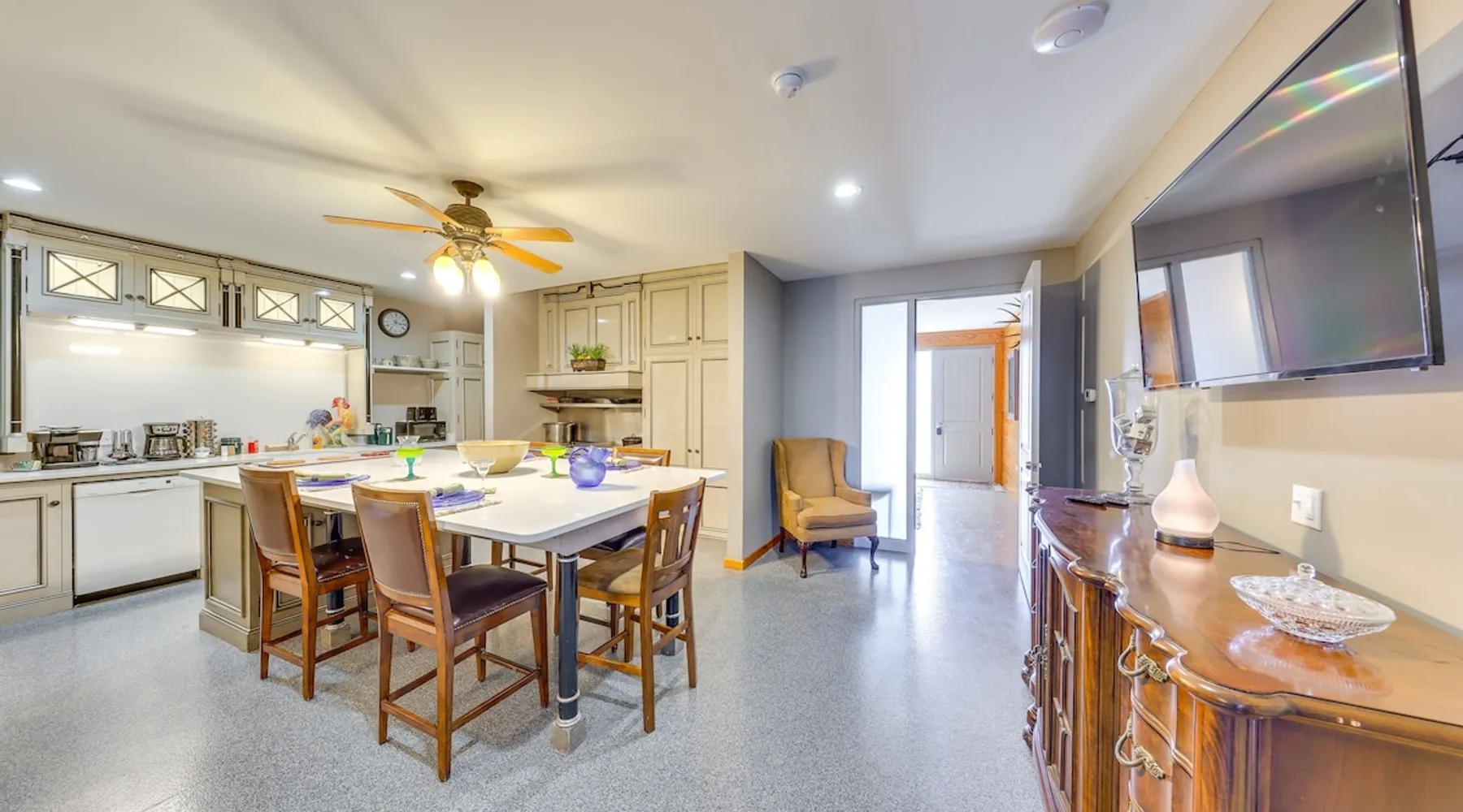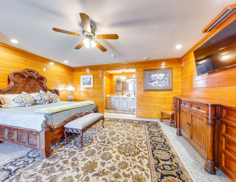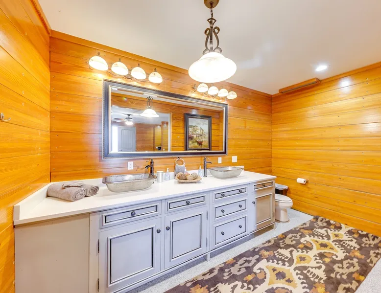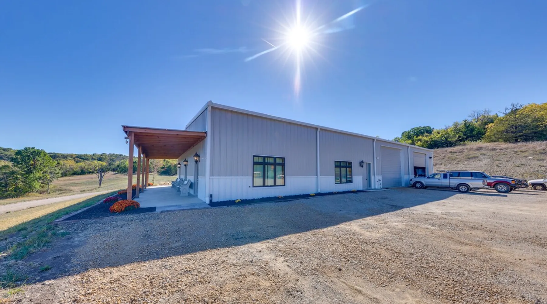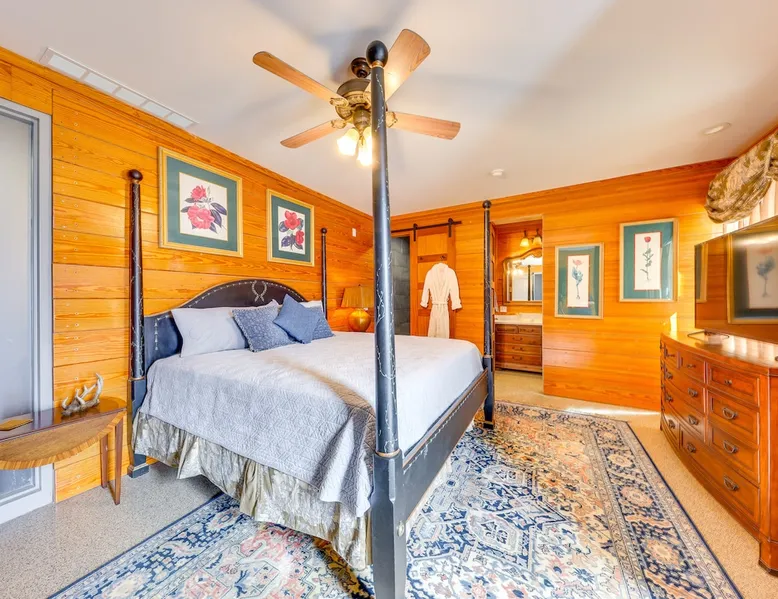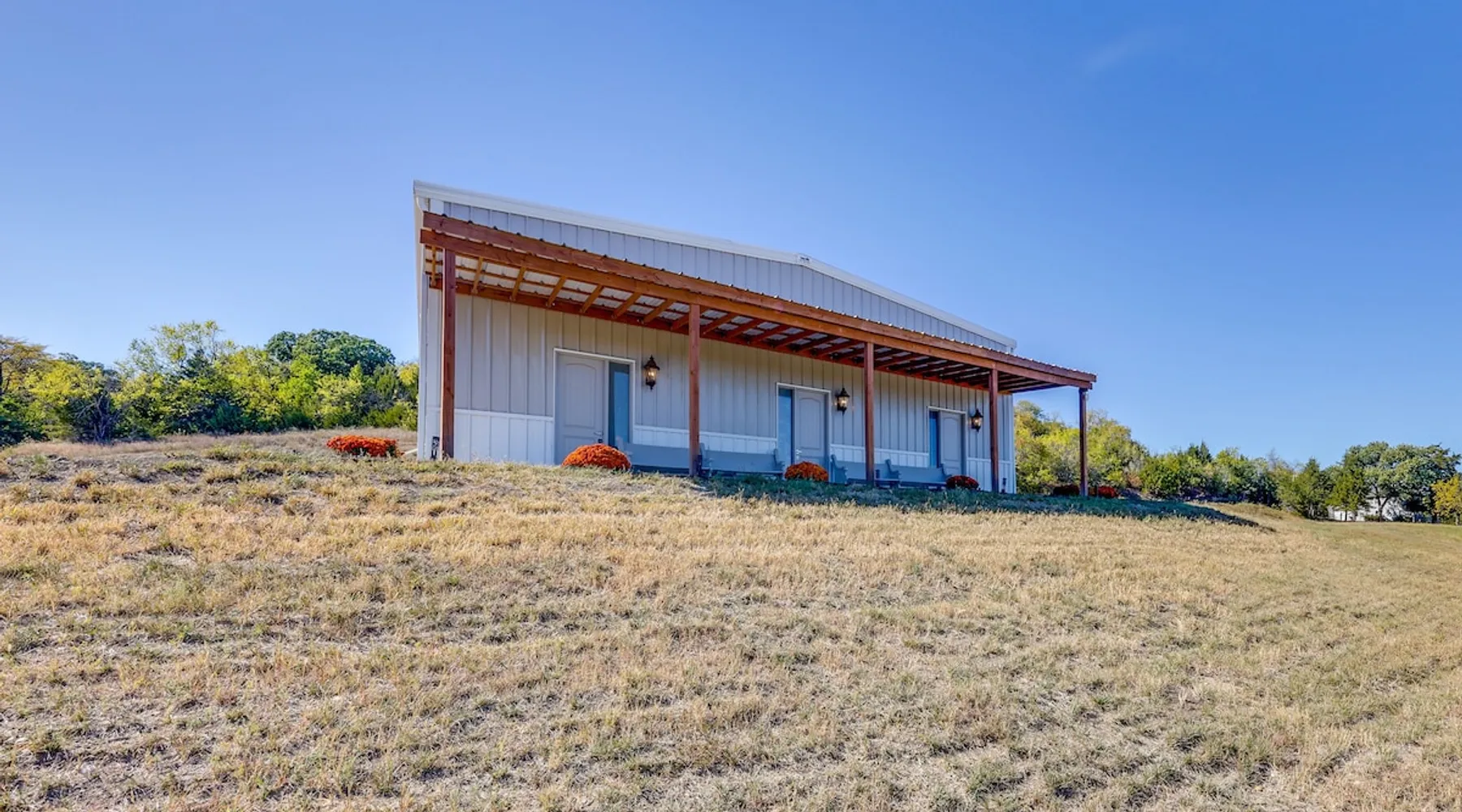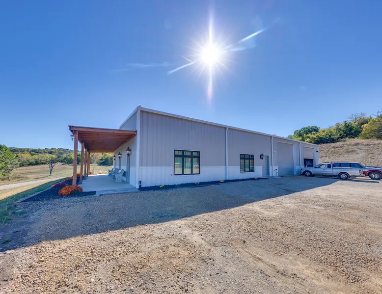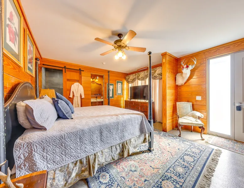 With pastoral views and peace and quiet galore, this serene 5-bedroom, 5-bathroom Tonganoxie vacation rental house will provide the perfect cure to any of your 9-to-5 stresses. Enjoy a meal in the well-stocked kitchen, unwind on the front porch overlooking the 160-acre property or go fishing at one of the stocked fishing ponds on-site. For more outdoor activity, spend the day at Perry Lake at Perry State Park or take a day trip to Kansas City to get fast and furious at the Kansas Speedway. The space Constructed w/ Recycled & Reclaimed Materials | Located on 160-Acre Property | 55” Smart TV in Each Bedroom | Kids’ Supplies (Available Upon Request) Bedroom 1 (Cherry Blossom): King Bed | Bedroom 2 (Oak): King Bed | Bedroom 3 (Redbud): King Bed | Bedroom 4 (Dogwood): King Bed | Bedroom 5 (Pine): King Bed | Additional Sleeping: Pack ‘n Play SHARED AMENITIES: 2 stocked fishing ponds, hiking trails, wildlife OUTDOOR LIVING: Covered front porch w/ seating, vista views, lawn chairs & fishing poles (available upon request) INDOOR LIVING: Interior walls (recycled high school gymnasium bleachers), 6 Smart TVs, dining table, vanity, 2,500 sq ft KITCHEN: Dishwasher, fridge, oven w/ 4-burner stovetop, microwave, island, Keurig & drip coffee makers, complimentary coffee pods, coffee grinder, blender, Crockpot, toaster, toaster oven, cooking basics, dishware & flatware GENERAL: Central heating & A/C, ceiling fans, linens/towels, complimentary toiletries, hair dryer, hangers, high chair, changing table, trash bags/paper towels FAQ: 1 exterior security camera (facing out), step-free access, windows cannot be opened, no WiFi, no living room area PARKING: Driveway (3 vehicles) ADDT’L ACCOMMODATIONS: An additional 3-bedroom property for 6 guests is available on-site with a separate nightly rate. If you would like to reserve both rentals, please inquire for more information prior to booking Guest access Guests will have access to the entire property via keyless entry Other things to note - No smoking - No pets allowed - No events, parties, or large gatherings - Must be at least 25 years old to book - Additional fees and taxes may apply - Photo ID may be required at check-in - NOTE: There is another bookable vacation rental on-site; other travelers may be present during your stay - NOTE: Kids' supplies, lawn chairs, and fishing poles are available upon request. Please reach out to the Guest Contact before your arrival if you would like to use these items - NOTE: There is a wedding venue on-site which may be in use during your stay - NOTE: Your safety matters. This property features 1 Ring Doorbell device with an exterior security camera facing the front outdoor entry. The camera faces outward and does not look into interior spaces. The camera records video and sound when activated by motion and will be on during the duration of your stay - NOTE: There is no WiFi available at the property - NOTE: There is not a living room area at this property