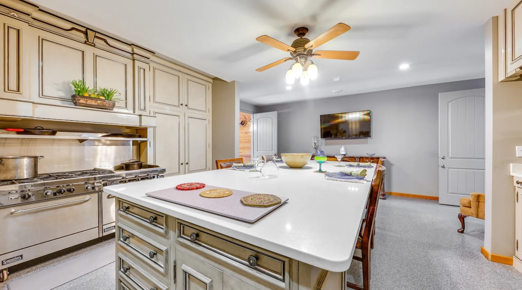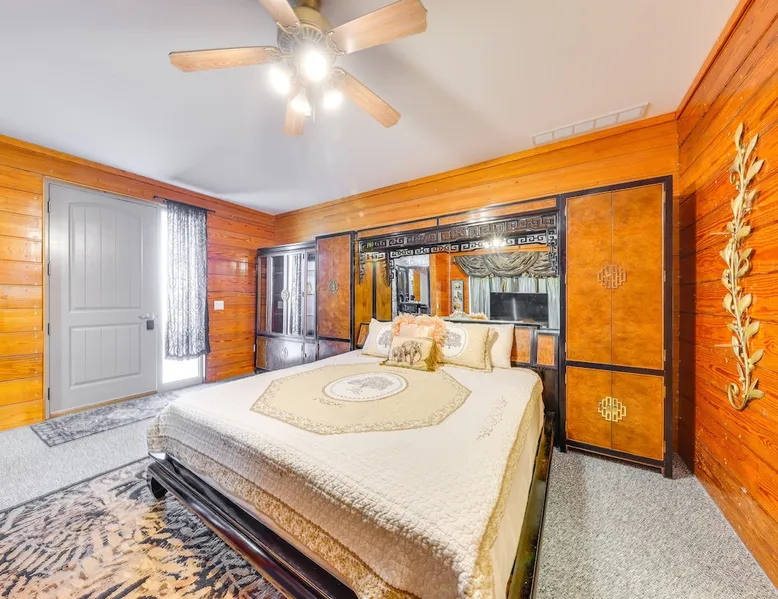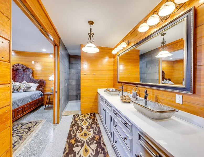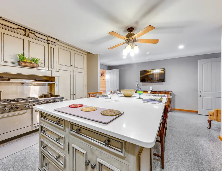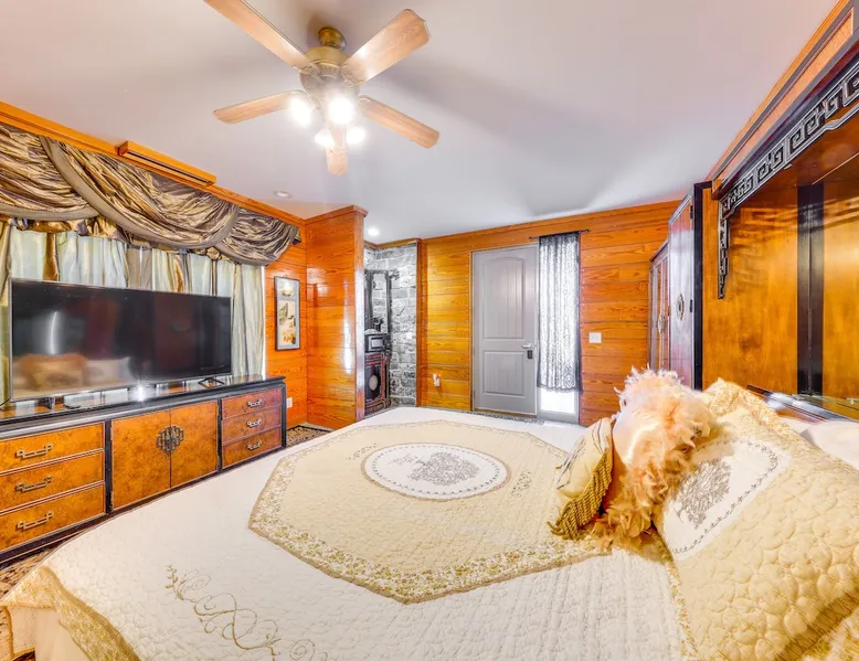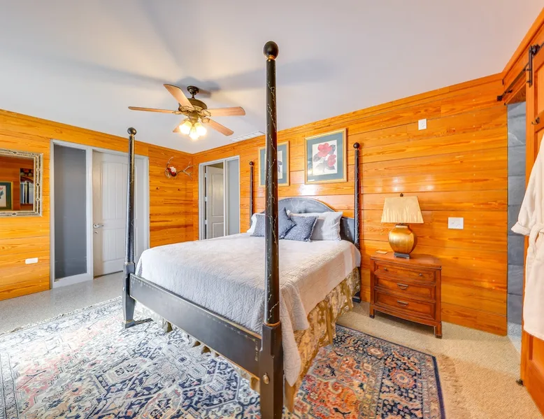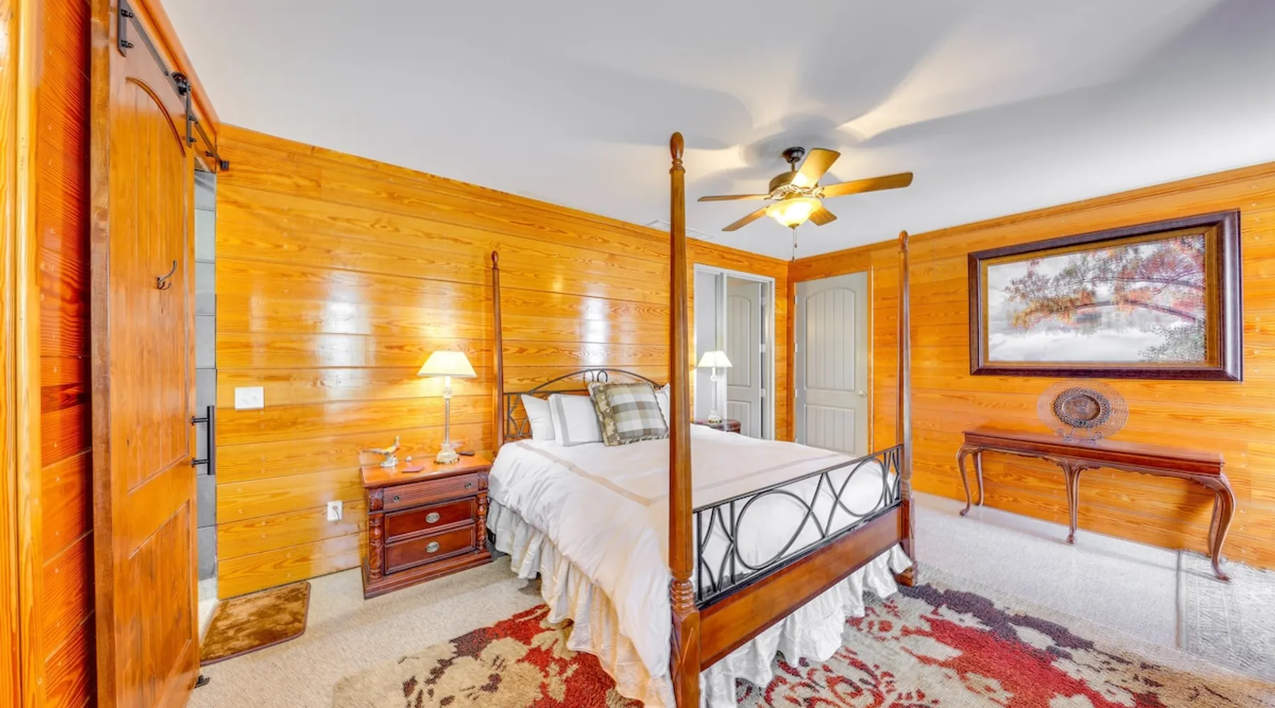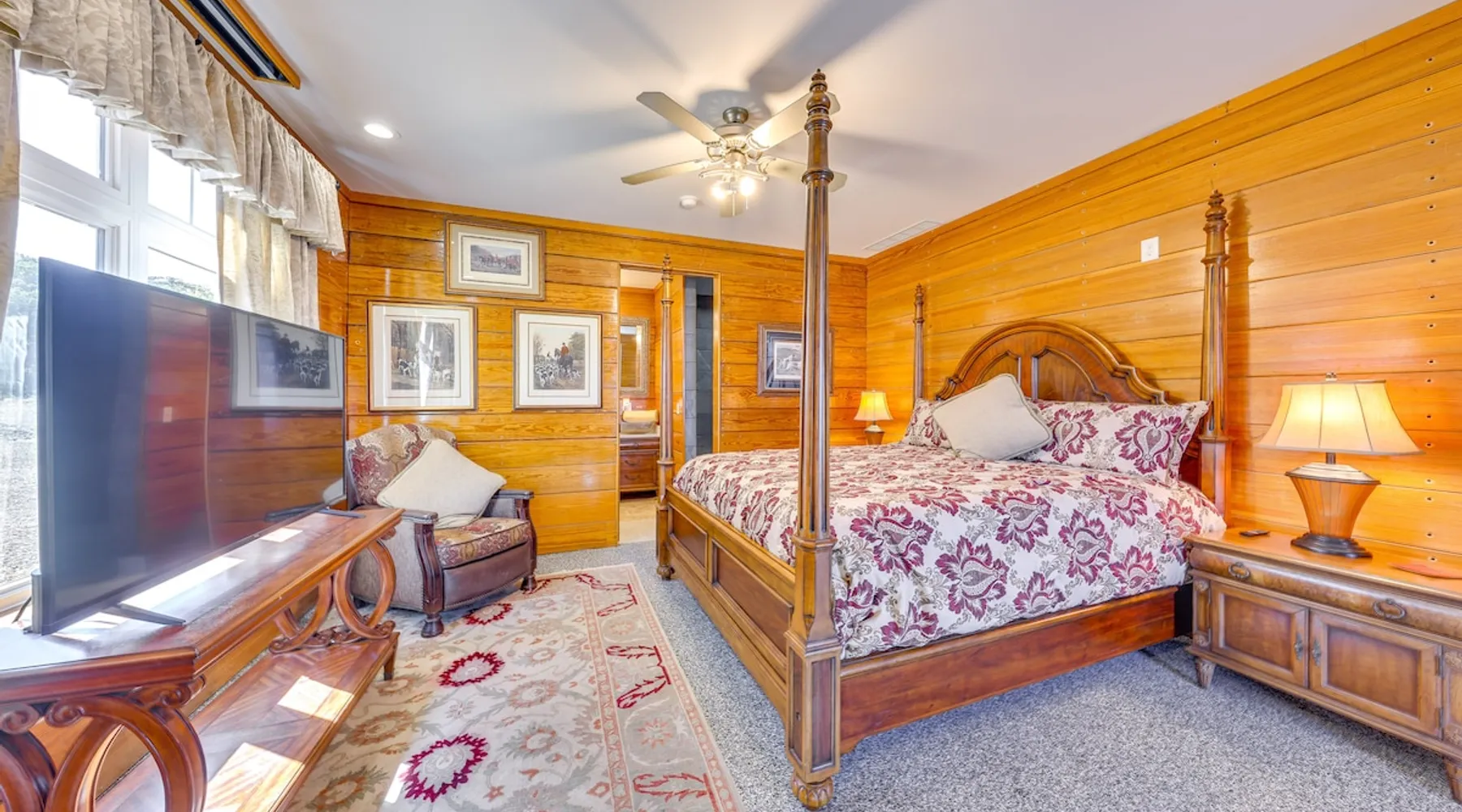 With pastoral views and peace and quiet galore, this serene 5-bedroom, 5-bathroom Tonganoxie vacation rental house will provide the perfect cure to any of your 9-to-5 stresses. Enjoy a meal in the well-stocked kitchen, unwind on the front porch overlooking the 160-acre property or go fishing at one of the stocked fishing ponds on-site. For more outdoor activity, spend the day at Perry Lake at Perry State Park or take a day trip to Kansas City to get fast and furious at the Kansas Speedway. The space Constructed w/ Recycled & Reclaimed Materials | Located on 160-Acre Property | 55” Smart TV in Each Bedroom | Kids’ Supplies (Available Upon Request) Bedroom 1 (Cherry Blossom): King Bed | Bedroom 2 (Oak): King Bed | Bedroom 3 (Redbud): King Bed | Bedroom 4 (Dogwood): King Bed | Bedroom 5 (Pine): King Bed | Additional Sleeping: Pack ‘n Play SHARED AMENITIES: 2 stocked fishing ponds, hiking trails, wildlife OUTDOOR LIVING: Covered front porch w/ seating, vista views, lawn chairs & fishing poles (available upon request) INDOOR LIVING: Interior walls (recycled high school gymnasium bleachers), 6 Smart TVs, dining table, vanity, 2,500 sq ft KITCHEN: Dishwasher, fridge, oven w/ 4-burner stovetop, microwave, island, Keurig & drip coffee makers, complimentary coffee pods, coffee grinder, blender, Crockpot, toaster, toaster oven, cooking basics, dishware & flatware GENERAL: Central heating & A/C, ceiling fans, linens/towels, complimentary toiletries, hair dryer, hangers, high chair, changing table, trash bags/paper towels FAQ: 1 exterior security camera (facing out), step-free access, windows cannot be opened, no WiFi, no living room area PARKING: Driveway (3 vehicles) ADDT’L ACCOMMODATIONS: An additional 3-bedroom property for 6 guests is available on-site with a separate nightly rate. If you would like to reserve both rentals, please inquire for more information prior to booking Guest access Guests will have access to the entire property via keyless entry Other things to note - No smoking - No pets allowed - No events, parties, or large gatherings - Must be at least 25 years old to book - Additional fees and taxes may apply - Photo ID may be required at check-in - NOTE: There is another bookable vacation rental on-site; other travelers may be present during your stay - NOTE: Kids' supplies, lawn chairs, and fishing poles are available upon request. Please reach out to the Guest Contact before your arrival if you would like to use these items - NOTE: There is a wedding venue on-site which may be in use during your stay - NOTE: Your safety matters. This property features 1 Ring Doorbell device with an exterior security camera facing the front outdoor entry. The camera faces outward and does not look into interior spaces. The camera records video and sound when activated by motion and will be on during the duration of your stay - NOTE: There is no WiFi available at the property - NOTE: There is not a living room area at this property