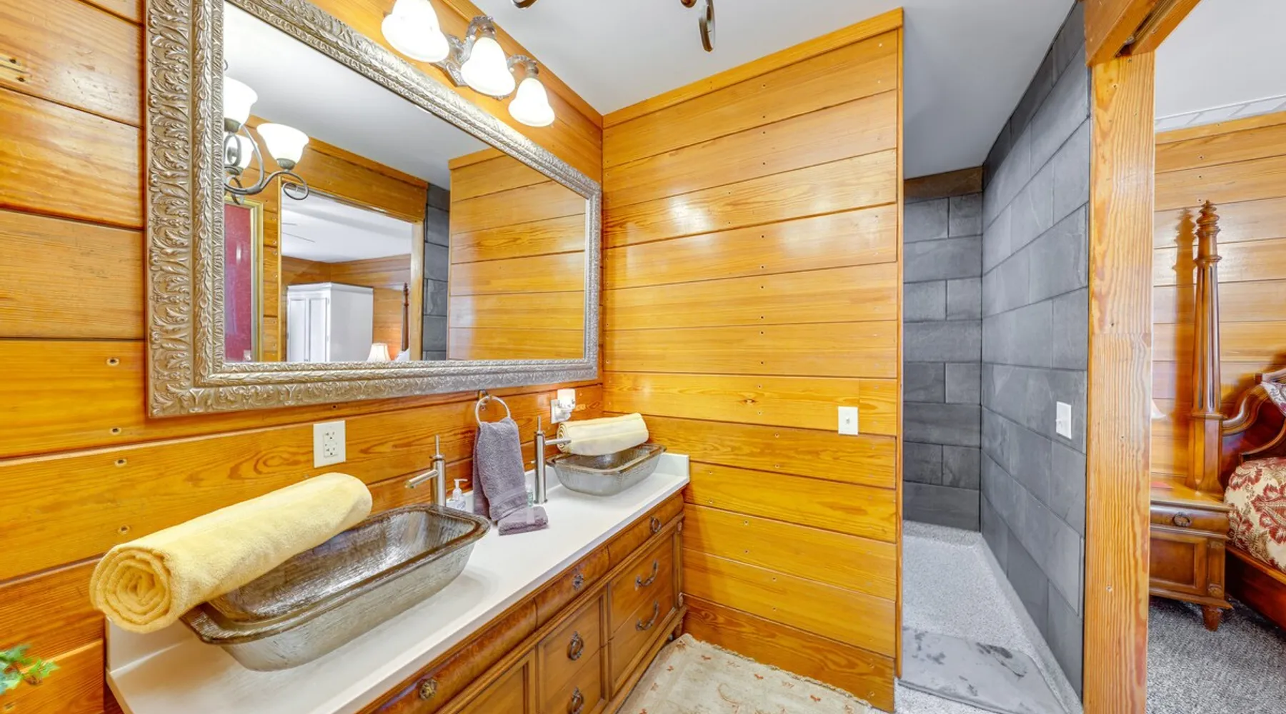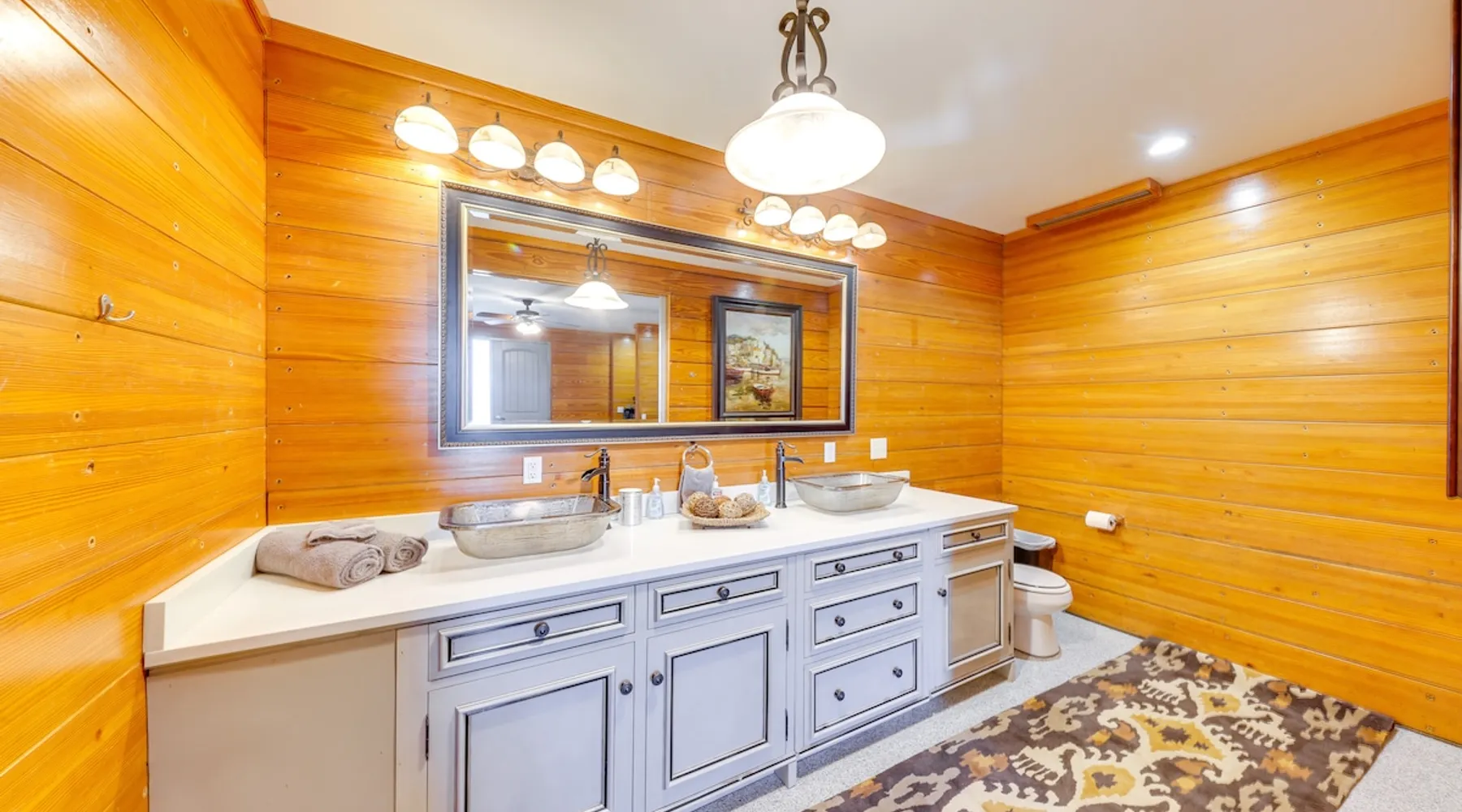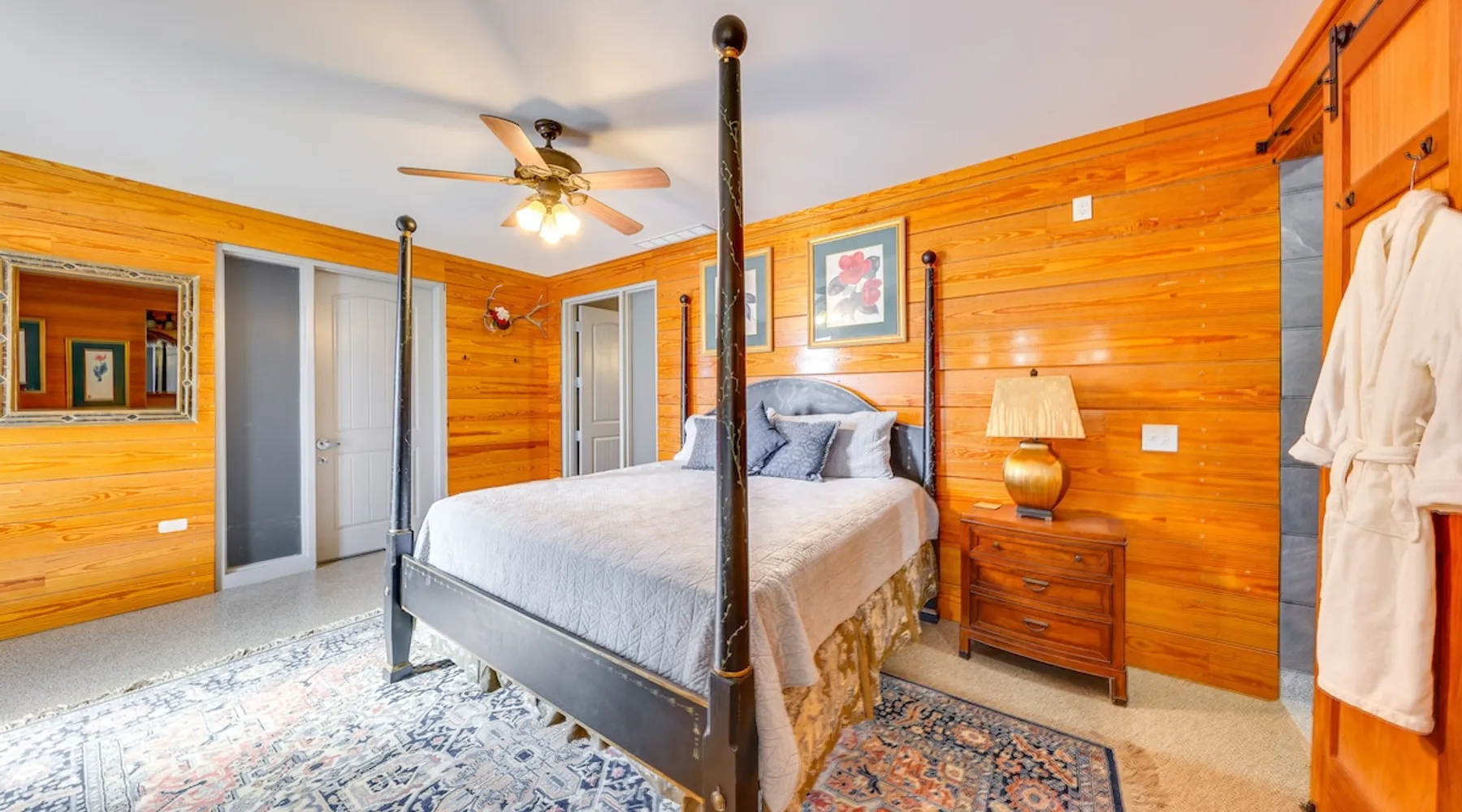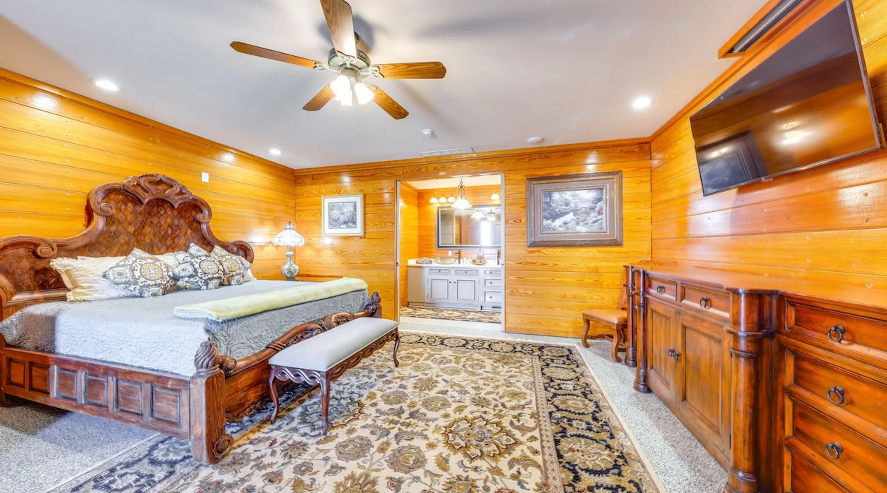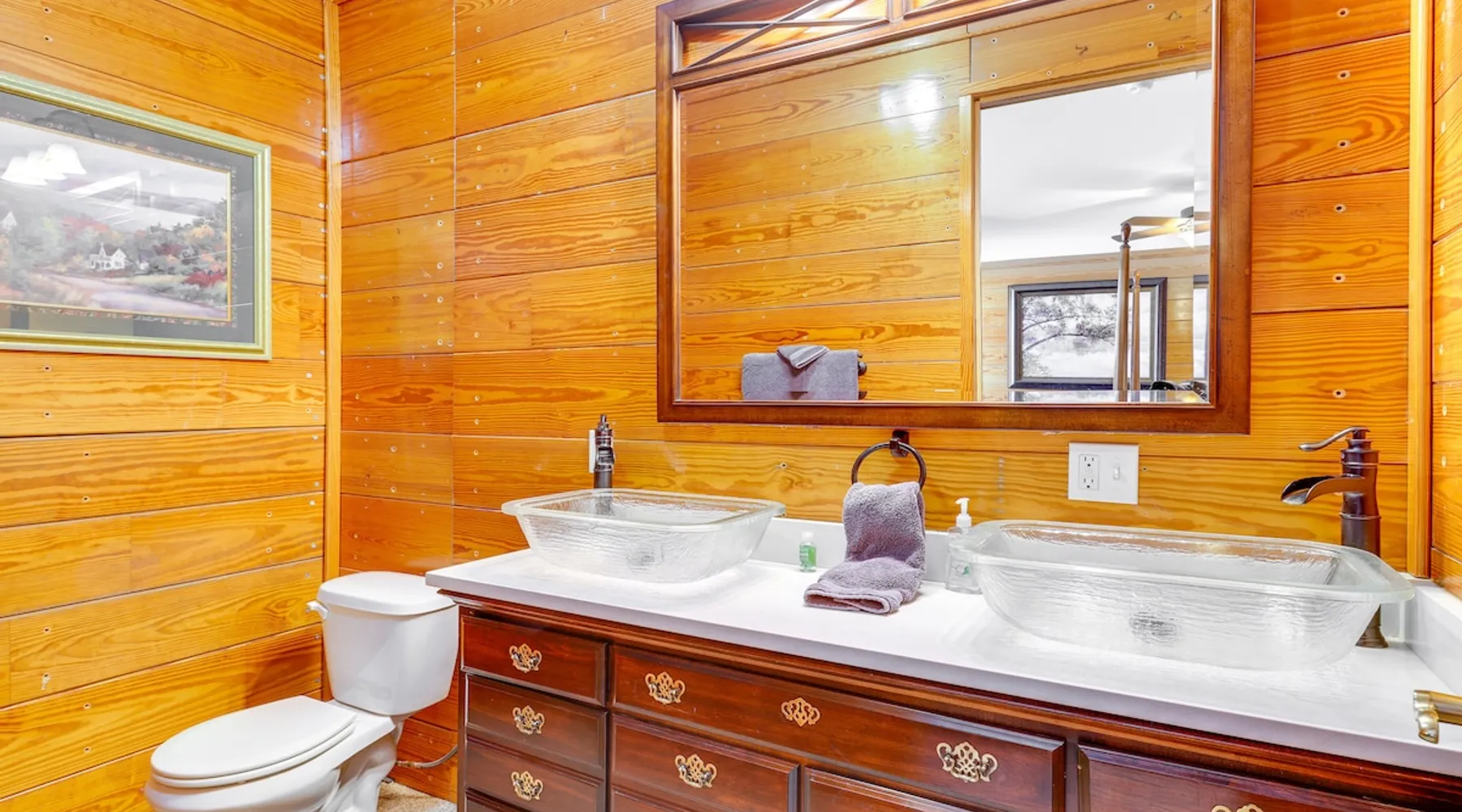 With pastoral views and peace and quiet galore, this serene 5-bedroom, 5-bathroom Tonganoxie vacation rental house will provide the perfect cure to any of your 9-to-5 stresses. Enjoy a meal in the well-stocked kitchen, unwind on the front porch overlooking the 160-acre property or go fishing at one of the stocked fishing ponds on-site. For more outdoor activity, spend the day at Perry Lake at Perry State Park or take a day trip to Kansas City to get fast and furious at the Kansas Speedway. The space Constructed w/ Recycled & Reclaimed Materials | Located on 160-Acre Property | 55” Smart TV in Each Bedroom | Kids’ Supplies (Available Upon Request) Bedroom 1 (Cherry Blossom): King Bed | Bedroom 2 (Oak): King Bed | Bedroom 3 (Redbud): King Bed | Bedroom 4 (Dogwood): King Bed | Bedroom 5 (Pine): King Bed | Additional Sleeping: Pack ‘n Play SHARED AMENITIES: 2 stocked fishing ponds, hiking trails, wildlife OUTDOOR LIVING: Covered front porch w/ seating, vista views, lawn chairs & fishing poles (available upon request) INDOOR LIVING: Interior walls (recycled high school gymnasium bleachers), 6 Smart TVs, dining table, vanity, 2,500 sq ft KITCHEN: Dishwasher, fridge, oven w/ 4-burner stovetop, microwave, island, Keurig & drip coffee makers, complimentary coffee pods, coffee grinder, blender, Crockpot, toaster, toaster oven, cooking basics, dishware & flatware GENERAL: Central heating & A/C, ceiling fans, linens/towels, complimentary toiletries, hair dryer, hangers, high chair, changing table, trash bags/paper towels FAQ: 1 exterior security camera (facing out), step-free access, windows cannot be opened, no WiFi, no living room area PARKING: Driveway (3 vehicles) ADDT’L ACCOMMODATIONS: An additional 3-bedroom property for 6 guests is available on-site with a separate nightly rate. If you would like to reserve both rentals, please inquire for more information prior to booking Guest access Guests will have access to the entire property via keyless entry Other things to note - No smoking - No pets allowed - No events, parties, or large gatherings - Must be at least 25 years old to book - Additional fees and taxes may apply - Photo ID may be required at check-in - NOTE: There is another bookable vacation rental on-site; other travelers may be present during your stay - NOTE: Kids' supplies, lawn chairs, and fishing poles are available upon request. Please reach out to the Guest Contact before your arrival if you would like to use these items - NOTE: There is a wedding venue on-site which may be in use during your stay - NOTE: Your safety matters. This property features 1 Ring Doorbell device with an exterior security camera facing the front outdoor entry. The camera faces outward and does not look into interior spaces. The camera records video and sound when activated by motion and will be on during the duration of your stay - NOTE: There is no WiFi available at the property - NOTE: There is not a living room area at this property
