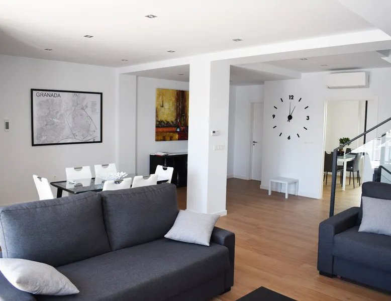 Spectacular tourist house with a refreshing private pool, 3 bedrooms, 3 bathrooms, a spacious living room, a kitchen, and a private garage for 3 cars. Located in one of the city's most exclusive neighborhoods, it offers an experience in a safe, noise-free, pollution-free urban area, ideal for families. Not suitable for youth groups. A 10-minute drive from the historic center and the Alhambra, 30 minutes from the Sierra Nevada ski resort, and 50 minutes from the Costa Tropical. The space The ideal house for families is not suitable for groups of young people or for parties, as they are located within the quiet residential area of Granada and noise regulations must be strictly complied with (B.O.P. No. 92, Granada, Tuesday, May 15, 2007). It is located in a quiet and strategic urban setting of Granada, by car, 5 minutes from the Serrallo Plaza Shopping Center, and 10 minutes from the City Center and the Alhambra, but at the same time in a natural setting, away from noise and environmental pollution, with magnificent views of Sierra Nevada and the City. Minimalist house with functional and comfortable spaces, it has a semi-basement floor with a garage for 3 vehicles, on the ground floor there is a large fully equipped kitchen, connected to the main living room of more than 60 m² and a bathroom. The first floor consists of three bedrooms and two bathrooms. Two bedrooms have single beds and are equipped with built-in closets. The master bedroom has a queen bed, walk in closet and in suite bathroom. All bedrooms have a TV. Outside, large terraces overlooking the private pool (not heated) of 3x5m and the city, with garden equipment. In addition, it has its own garage for the exclusive use of the house. All main rooms have air conditioning with a heat pump, TV, and Wi-Fi. As well as a stock of pillows of different firmness, sheets, blankets and bath towels. The kitchen is equipped with an oven, microwave, refrigerator, dishwasher, toaster, juicer, coffee maker, iron and kitchenware. There is no washing machine, but there is a self-service laundry called La Colada, which is a 5-minute drive away, at Av. de Cervantes, 23, 18008 Granada Guest access The house has its own garage. It is not possible to park on the access streets to the house. An 8-minute walk away is the stop for Bus No. 9, which offers a direct connection to the city center and a peri-urban park ideal for walking. There is also a trail at the end of the street that connects with the Sierra Nevada National Park. Other things to note The house is located in one of the city's most exclusive neighborhoods, which is mainly residential, so it lacks leisure or cultural activities. This uniqueness guarantees our guests' rest, offering a space away from the city's annoying noise and the problems of high levels of environmental pollution. For this reason, the house is not recommended for groups of young people or families who wish to be in areas of greater festive or leisure activity. Registration Details Spain - National registration number ESFCTU0000180190008403240000000000000000VUT/GR/045267