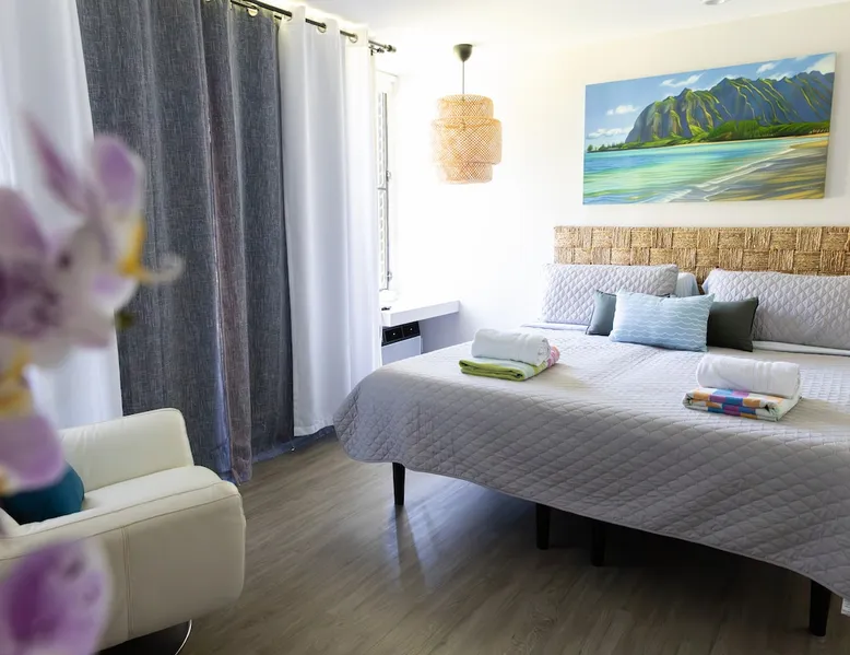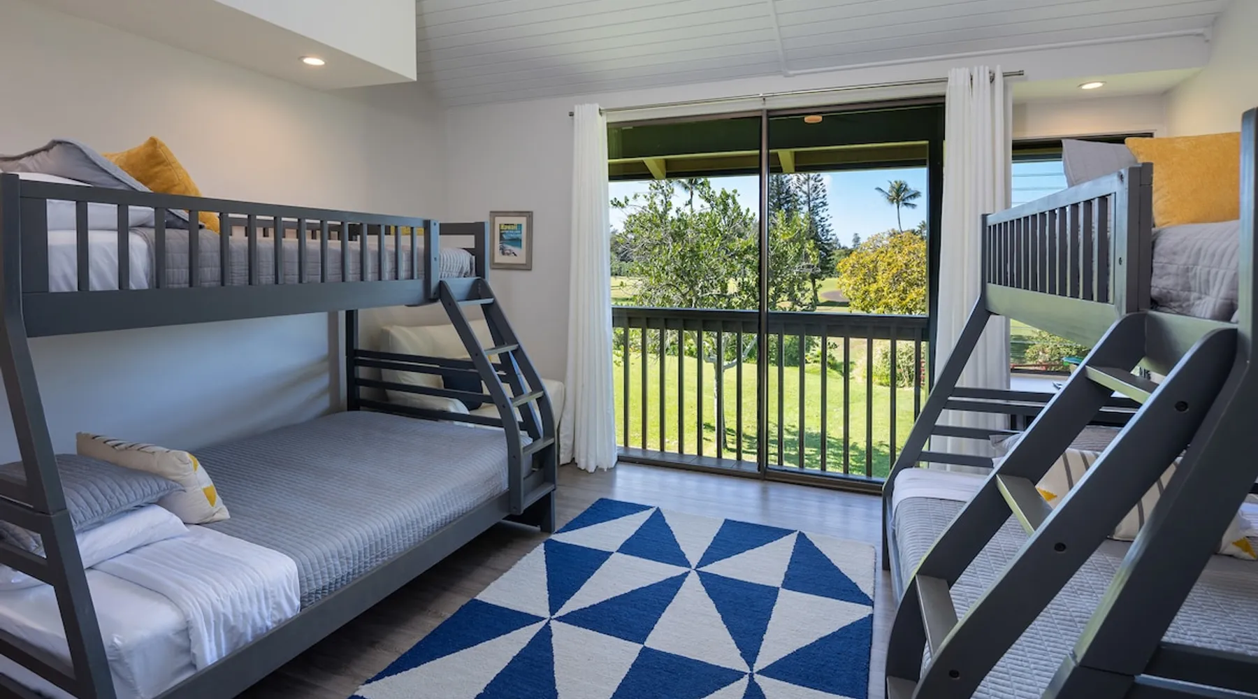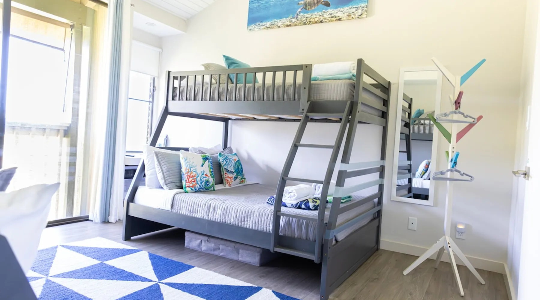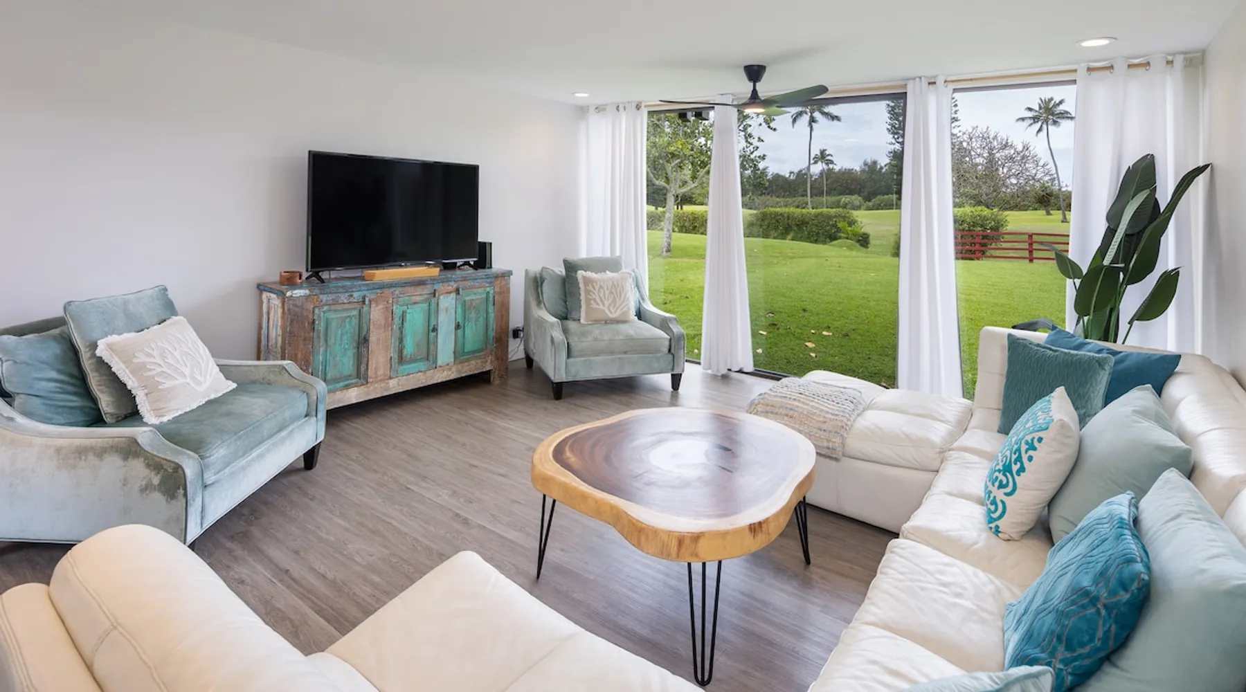 Our bright and breezy Kuilima West condo is located steps away from Turtle Bay Resort, Lei Lei's restaurant, walking trails, golf, and the beautiful beaches of Oahu's North Shore. With two Tempur-Pedic king beds and AC in all bedrooms and the living room, you can enjoy your time inside as much as out. Our space is family-friendly with a beach-modern vibe, decorated with pieces by local artists. We are excited to share our home with you - it truly is the best place to stay on the North Shore! The space Discover the beauty of Oahu's North Shore, from the miles of sparkling coastline to the serene sunsets over the ocean. This is Hale Kuilima, your island home away from home. Haiku fans and AC keep you cool when the island breeze isn't blowing; room-darkening curtains and white noise machines in every bedroom make it easy to snooze after the day's adventures. Upstairs, away from the hustle and bustle of the living room/kitchen is a Tempur-Pedic king-sized bed in one room; two sets of bunk beds (the kid's room) with full-sized mattresses on the bottom in the other room; and a full bathroom. The downstairs bedroom has another Tempur-Pedic split king bed with a power base for getting comfy while reading or watching a movie. A queen-sized bed and a custom-made monkeypod desk are in the den for those who need to check in on the office or just escape to surf the web. The kitchen comes fully-equipped with new appliances and cookware, so you can cook delicious family meals when you aren't enjoying one of the many restaurants onsite or nearby. We also have a coffee machine and Keurig so you can catch the sunrise on the beach with a coffee in hand. The living room has a large sofa and armchairs, and is stocked with board games and Hawaii-themed movies - perfect for enjoying an evening in... or fire up the barbecue and gather on the private patio to enjoy the warm tropical evenings. Feel free to use our beach chairs and toys for the keiki - we even have a wagon to bring it all with you! When it's time to come home, rinse off salt and sand in the refreshing hot/cold outdoor shower. Pools and tennis are steps away and free for guests. Best of all, you are away from the city and free to enjoy the miles of beaches, lovely golf course views, and Turtle Bay resort life. * We have many baby items on hand and available free of charge. Please let us know at the time of booking if you would like a highchair, booster, pack n play or bassinet, baby monitor, infant tub, Lovevery play gym for babies, or baby dish drying rack. * Larger groups: please inquire - we have good relationships with many neighbors who have rental listings and we are happy to work with you to coordinate nearby rentals so you and your friends/family can rent close together. Layout: Bedroom 1: Upstairs king bed with mountain views (overlooking the patio). Bedroom 2: Upstairs twin-over-full bunk beds with golf course views. Bedroom 3: Downstairs king bed with television and direct golf course access and view. Den: Workspace (desk) and a queen bed. Short Term Rental Registration #2355 Other things to note There is no smoking anywhere on the property, including the patio area (property rules). Registration Details 570010290007, 7, TA-095-490-2528-01
