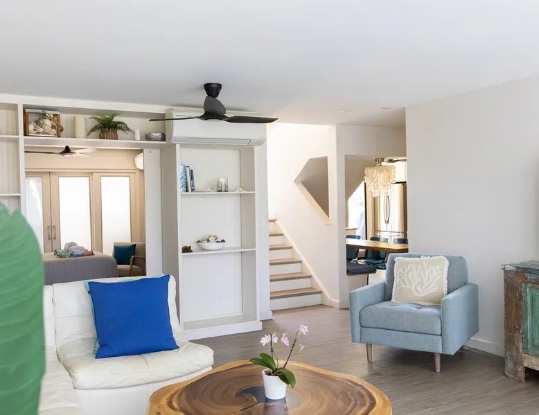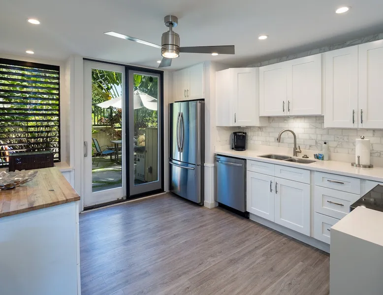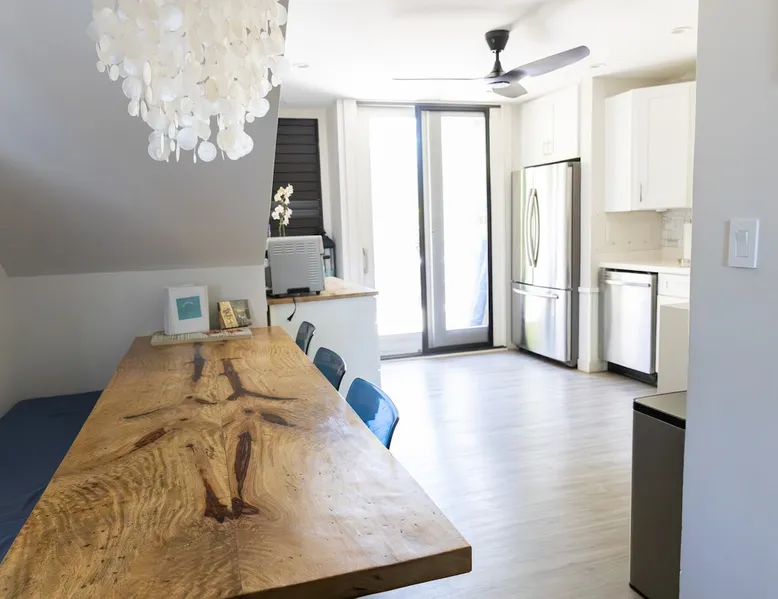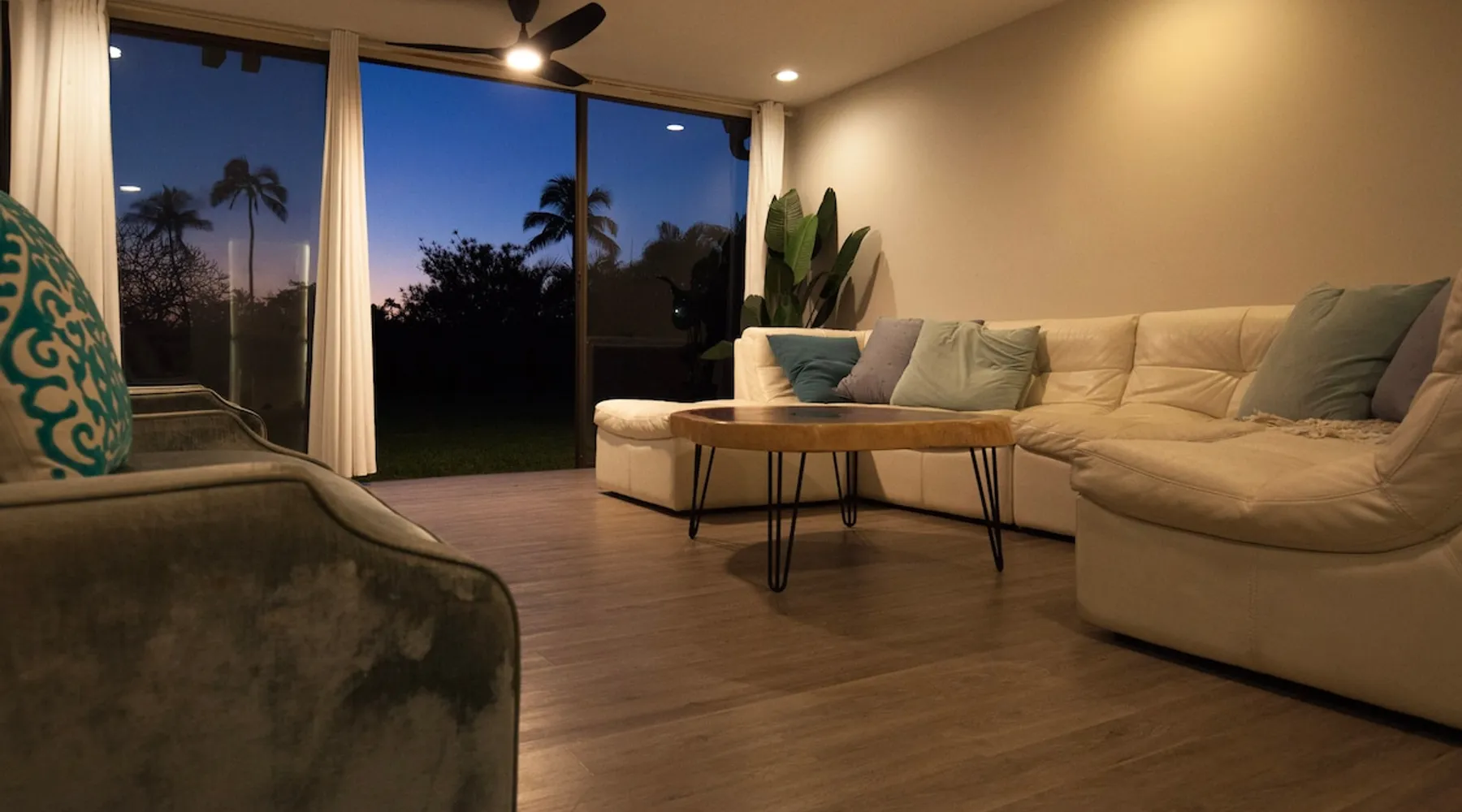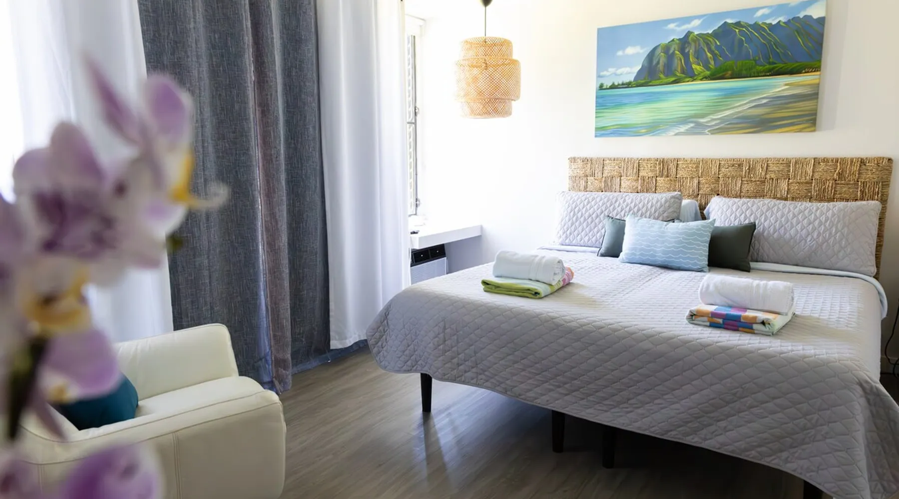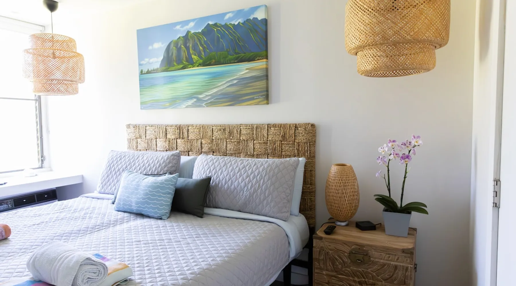 Our bright and breezy Kuilima West condo is located steps away from Turtle Bay Resort, Lei Lei's restaurant, walking trails, golf, and the beautiful beaches of Oahu's North Shore. With two Tempur-Pedic king beds and AC in all bedrooms and the living room, you can enjoy your time inside as much as out. Our space is family-friendly with a beach-modern vibe, decorated with pieces by local artists. We are excited to share our home with you - it truly is the best place to stay on the North Shore! The space Discover the beauty of Oahu's North Shore, from the miles of sparkling coastline to the serene sunsets over the ocean. This is Hale Kuilima, your island home away from home. Haiku fans and AC keep you cool when the island breeze isn't blowing; room-darkening curtains and white noise machines in every bedroom make it easy to snooze after the day's adventures. Upstairs, away from the hustle and bustle of the living room/kitchen is a Tempur-Pedic king-sized bed in one room; two sets of bunk beds (the kid's room) with full-sized mattresses on the bottom in the other room; and a full bathroom. The downstairs bedroom has another Tempur-Pedic split king bed with a power base for getting comfy while reading or watching a movie. A queen-sized bed and a custom-made monkeypod desk are in the den for those who need to check in on the office or just escape to surf the web. The kitchen comes fully-equipped with new appliances and cookware, so you can cook delicious family meals when you aren't enjoying one of the many restaurants onsite or nearby. We also have a coffee machine and Keurig so you can catch the sunrise on the beach with a coffee in hand. The living room has a large sofa and armchairs, and is stocked with board games and Hawaii-themed movies - perfect for enjoying an evening in... or fire up the barbecue and gather on the private patio to enjoy the warm tropical evenings. Feel free to use our beach chairs and toys for the keiki - we even have a wagon to bring it all with you! When it's time to come home, rinse off salt and sand in the refreshing hot/cold outdoor shower. Pools and tennis are steps away and free for guests. Best of all, you are away from the city and free to enjoy the miles of beaches, lovely golf course views, and Turtle Bay resort life. * We have many baby items on hand and available free of charge. Please let us know at the time of booking if you would like a highchair, booster, pack n play or bassinet, baby monitor, infant tub, Lovevery play gym for babies, or baby dish drying rack. * Larger groups: please inquire - we have good relationships with many neighbors who have rental listings and we are happy to work with you to coordinate nearby rentals so you and your friends/family can rent close together. Layout: Bedroom 1: Upstairs king bed with mountain views (overlooking the patio). Bedroom 2: Upstairs twin-over-full bunk beds with golf course views. Bedroom 3: Downstairs king bed with television and direct golf course access and view. Den: Workspace (desk) and a queen bed. Short Term Rental Registration #2355 Other things to note There is no smoking anywhere on the property, including the patio area (property rules). Registration Details 570010290007, 7, TA-095-490-2528-01