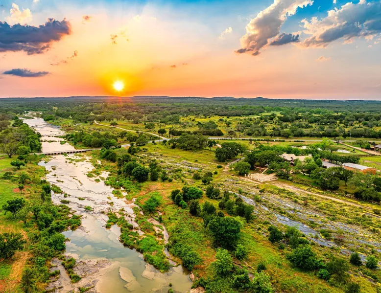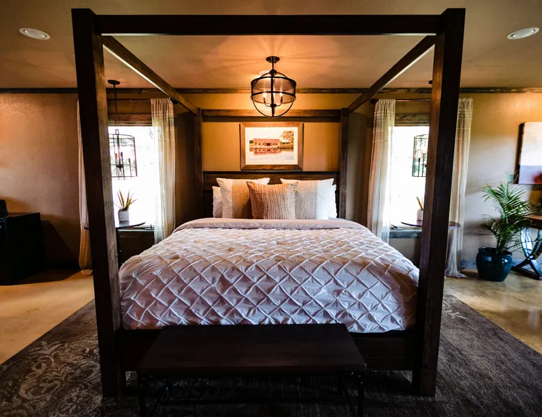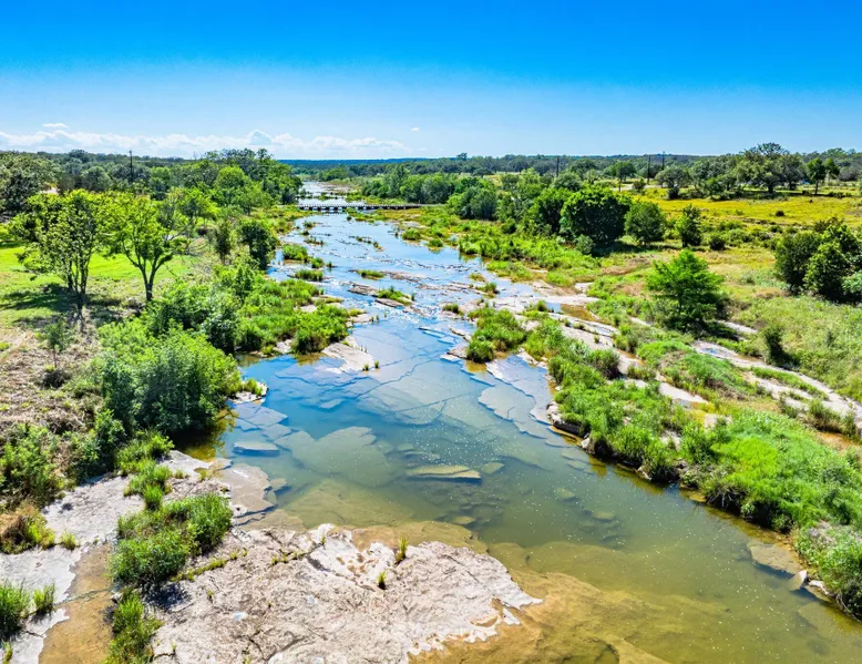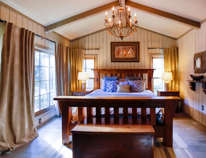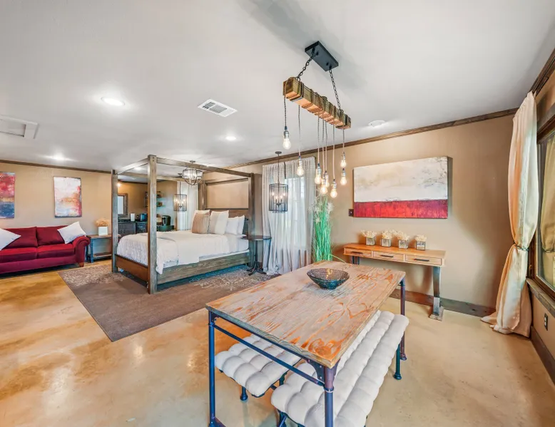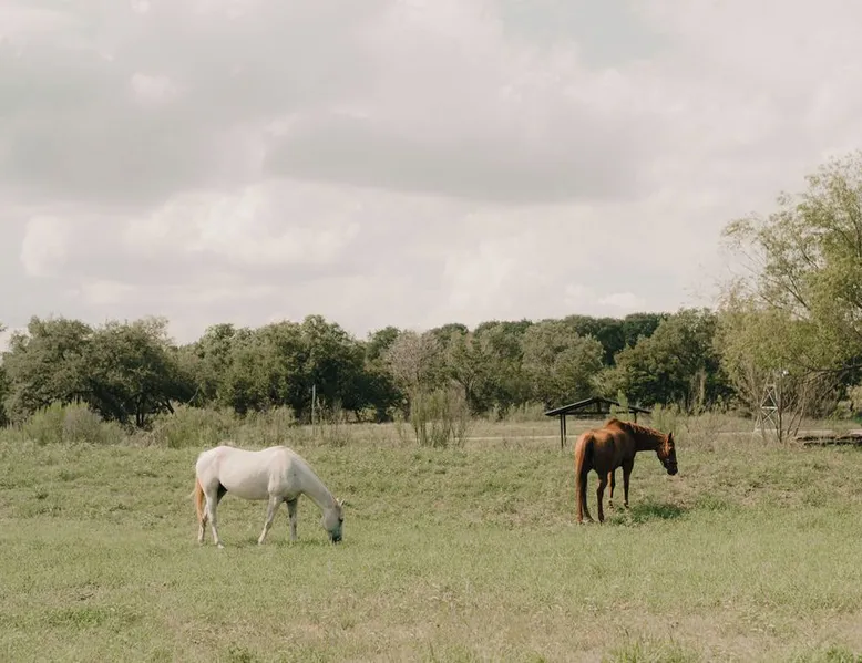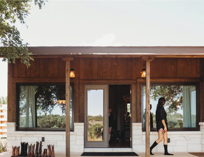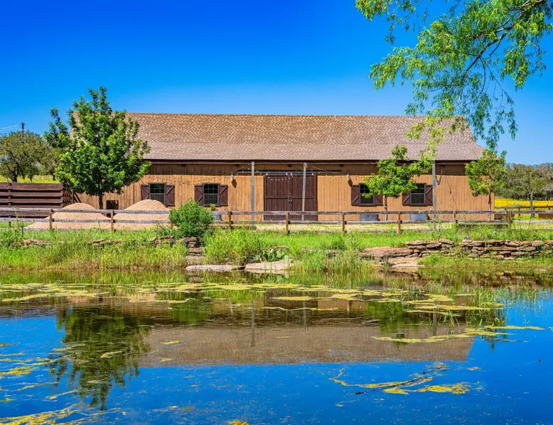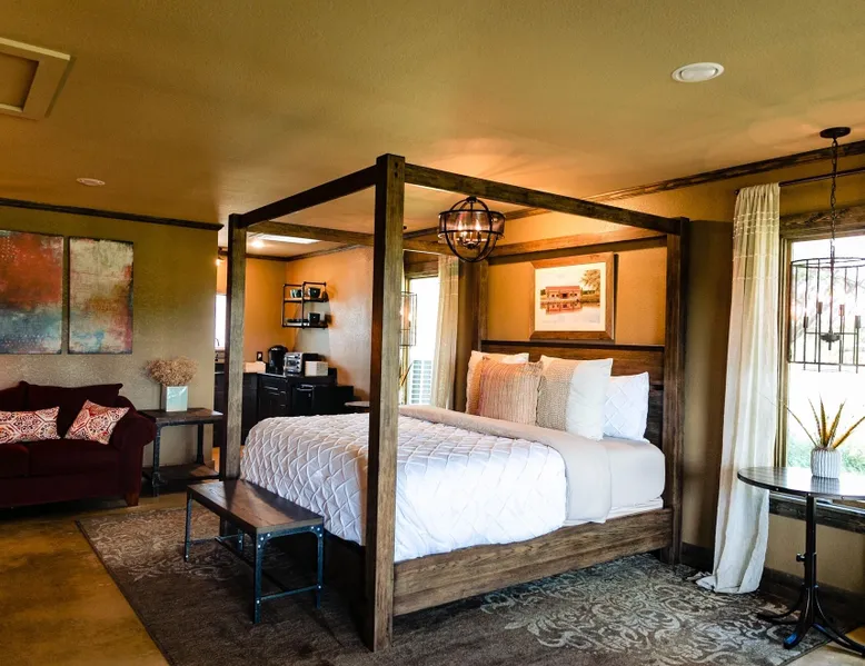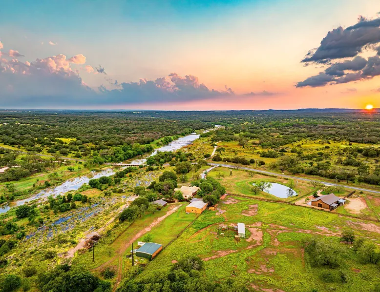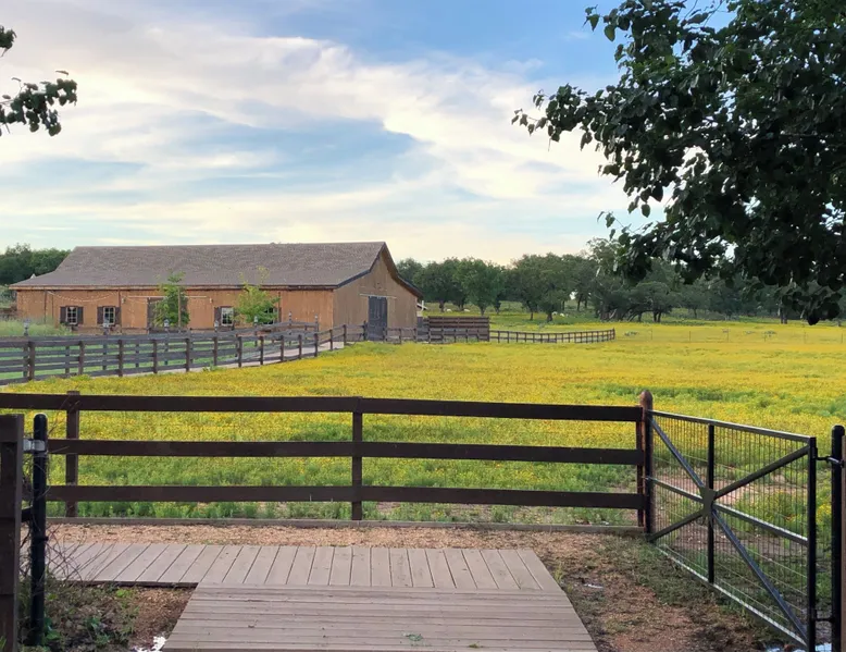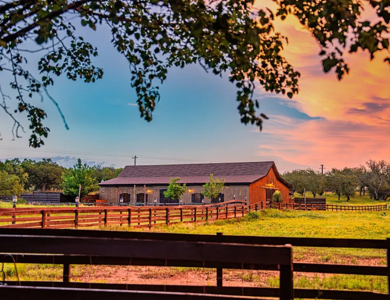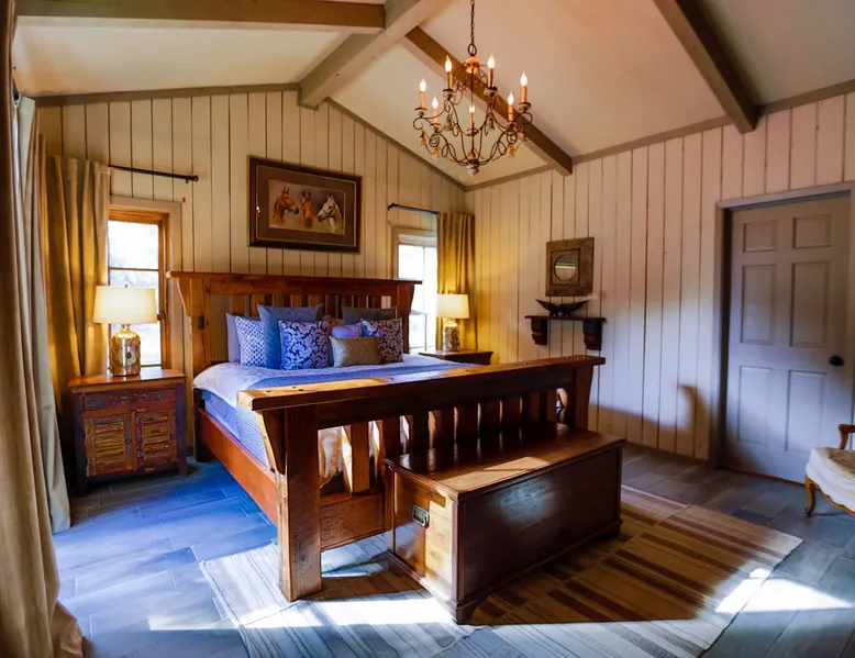 Tucked away in the most heavenly corner of the Texas Hill Country sits King River Ranch, a sprawling 25-acre paradise that offers its guests a perfect blend of private luxury and natural beauty. Upon driving through the gates, the KRR guest is greeted by our exclusive quarter-mile of the Pedernales River to enjoy and explore. The eye never ceases to be dazzled by impossibly charming barns, expansive horse pastures filled with friendly farm animals, the peacefully flowing river, and cinematic views in every direction, all within feet from the front door of this ultimate Hill Country getaway. Just a stone's throw downriver from the Lyndon B. Johnson Family Ranch, KRR is conveniently located 20 minutes from shopping and dining in Fredericksburg, 25 minutes to water sports at Horseshoe Bay, under one-hour to downtown ATX and SATX, and just a skip-and-a-jump to the historic town of Hye, the epicenter of the Hill Country wineries. Being in the heart of the one of the most popular destinations in the entire Lone Star State, there is literally no end to the things to do in the immediate area. The River Cottage is a gorgeous ranch house perched above the river on one side and panoramic views of the magnificent King Barn, horse pastures and fishing pond. The Suite is a generous and luxuriant private space built just for two, with a grand canopy bed from where you can watch deer gently cross the river. The River Cottage and Suite are included in every stay. Ask about your micro-wedding and elopement packages!