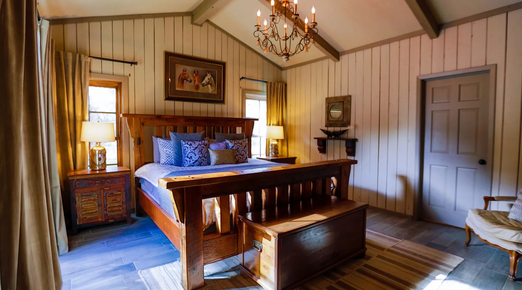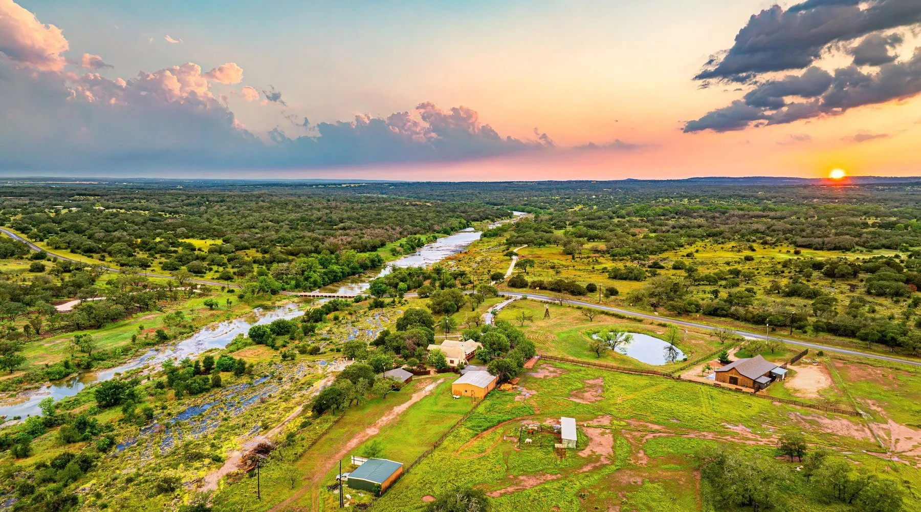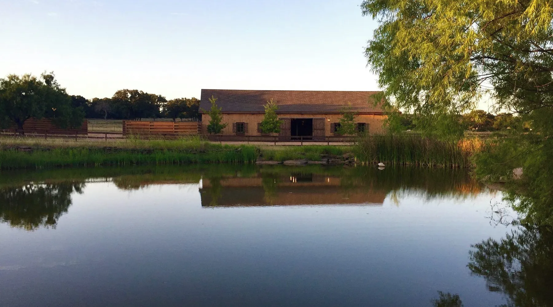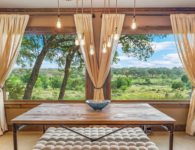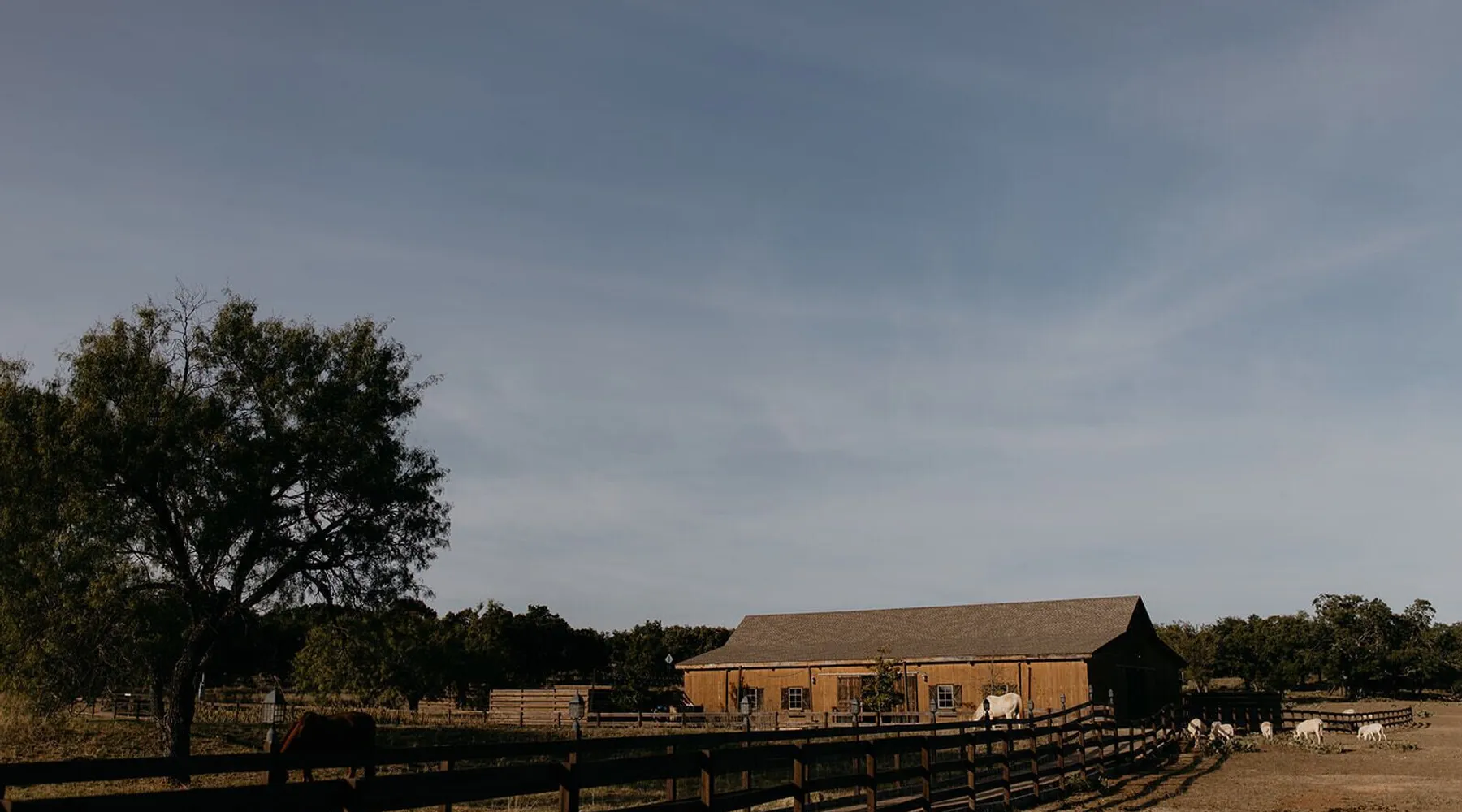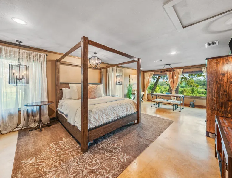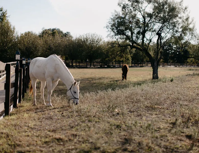 Tucked away in the most heavenly corner of the Texas Hill Country sits King River Ranch, a sprawling 25-acre paradise that offers its guests a perfect blend of private luxury and natural beauty. Upon driving through the gates, the KRR guest is greeted by our exclusive quarter-mile of the Pedernales River to enjoy and explore. The eye never ceases to be dazzled by impossibly charming barns, expansive horse pastures filled with friendly farm animals, the peacefully flowing river, and cinematic views in every direction, all within feet from the front door of this ultimate Hill Country getaway. Just a stone's throw downriver from the Lyndon B. Johnson Family Ranch, KRR is conveniently located 20 minutes from shopping and dining in Fredericksburg, 25 minutes to water sports at Horseshoe Bay, under one-hour to downtown ATX and SATX, and just a skip-and-a-jump to the historic town of Hye, the epicenter of the Hill Country wineries. Being in the heart of the one of the most popular destinations in the entire Lone Star State, there is literally no end to the things to do in the immediate area. The River Cottage is a gorgeous ranch house perched above the river on one side and panoramic views of the magnificent King Barn, horse pastures and fishing pond. The Suite is a generous and luxuriant private space built just for two, with a grand canopy bed from where you can watch deer gently cross the river. The River Cottage and Suite are included in every stay. Ask about your micro-wedding and elopement packages!
