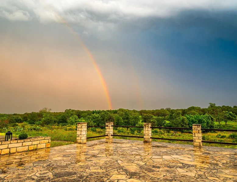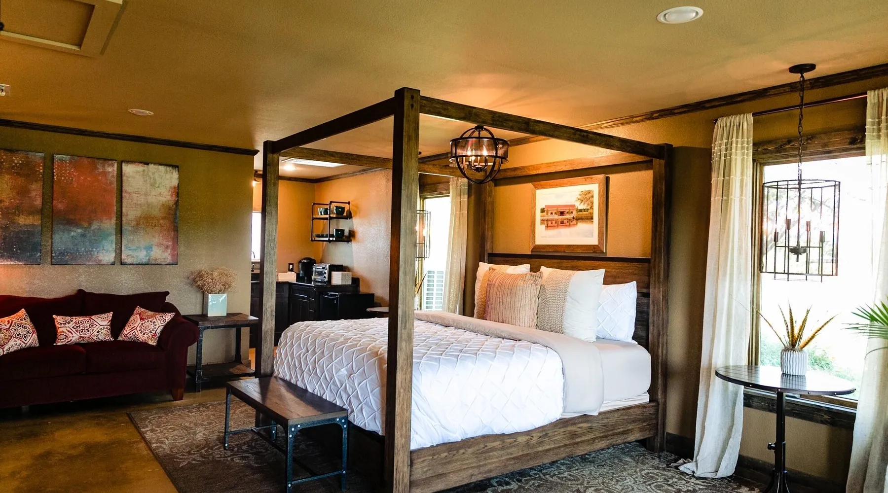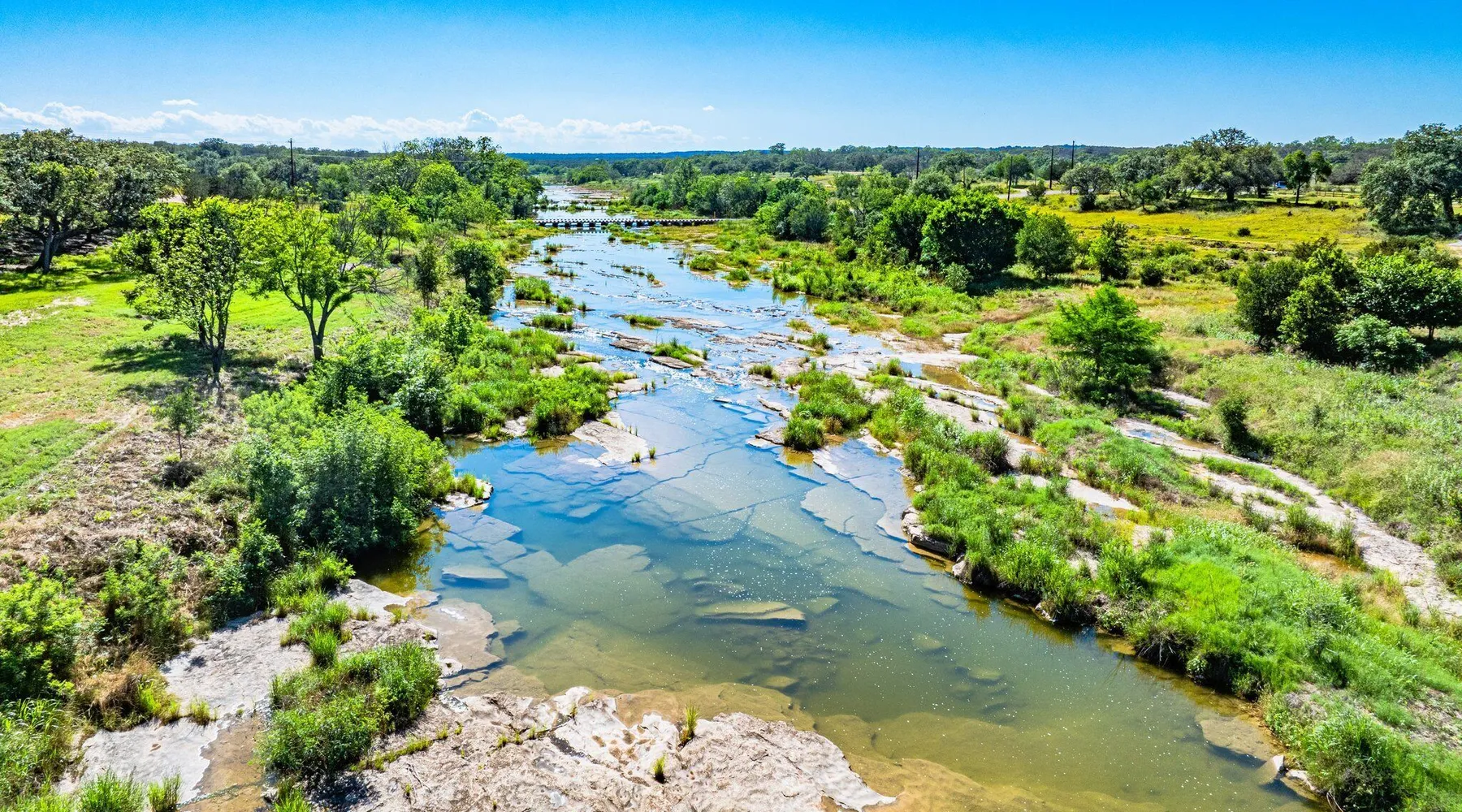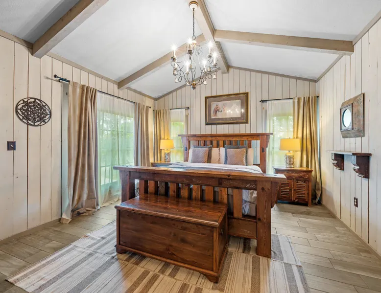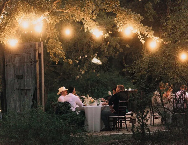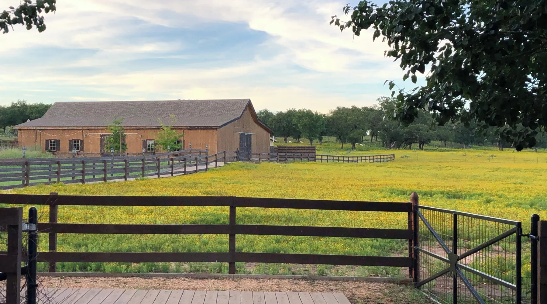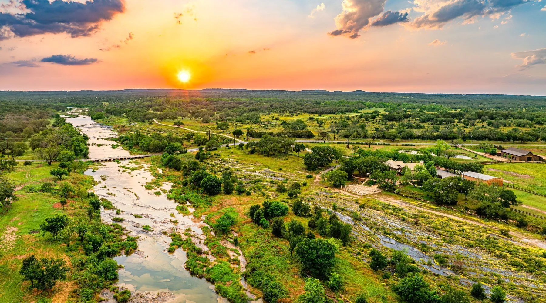 Tucked away in the most heavenly corner of the Texas Hill Country sits King River Ranch, a sprawling 25-acre paradise that offers its guests a perfect blend of private luxury and natural beauty. Upon driving through the gates, the KRR guest is greeted by our exclusive quarter-mile of the Pedernales River to enjoy and explore. The eye never ceases to be dazzled by impossibly charming barns, expansive horse pastures filled with friendly farm animals, the peacefully flowing river, and cinematic views in every direction, all within feet from the front door of this ultimate Hill Country getaway. Just a stone's throw downriver from the Lyndon B. Johnson Family Ranch, KRR is conveniently located 20 minutes from shopping and dining in Fredericksburg, 25 minutes to water sports at Horseshoe Bay, under one-hour to downtown ATX and SATX, and just a skip-and-a-jump to the historic town of Hye, the epicenter of the Hill Country wineries. Being in the heart of the one of the most popular destinations in the entire Lone Star State, there is literally no end to the things to do in the immediate area. The River Cottage is a gorgeous ranch house perched above the river on one side and panoramic views of the magnificent King Barn, horse pastures and fishing pond. The Suite is a generous and luxuriant private space built just for two, with a grand canopy bed from where you can watch deer gently cross the river. The River Cottage and Suite are included in every stay. Ask about your micro-wedding and elopement packages!