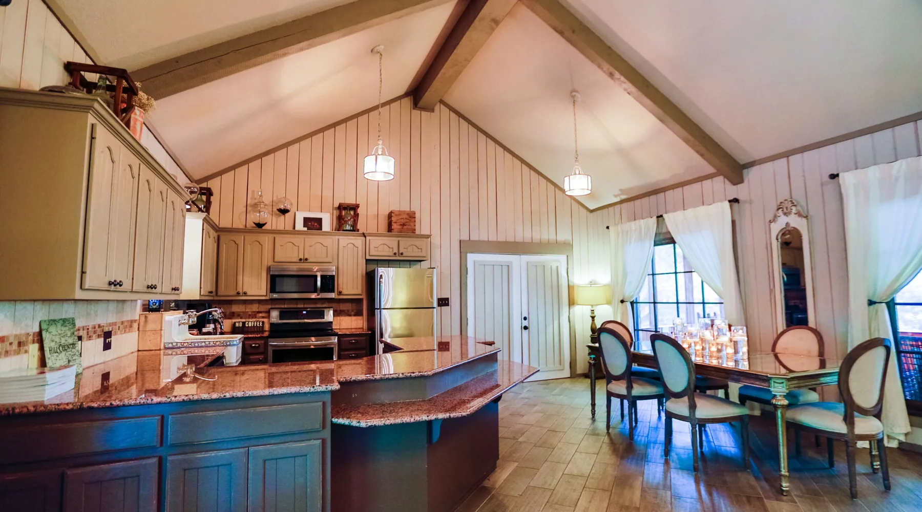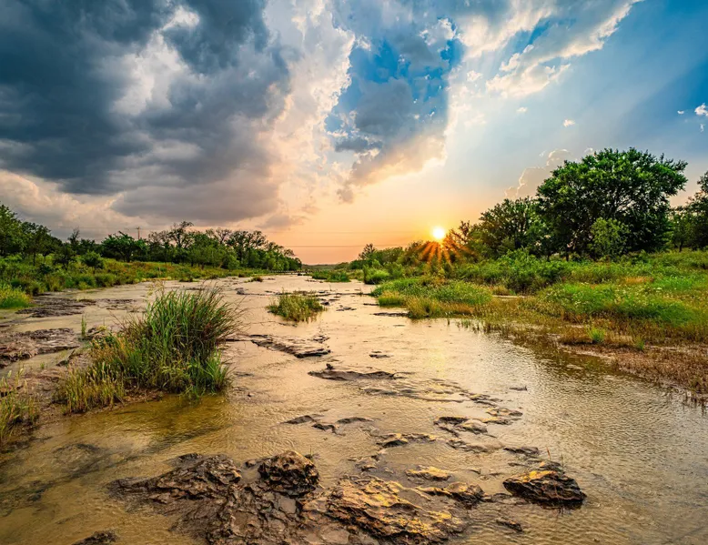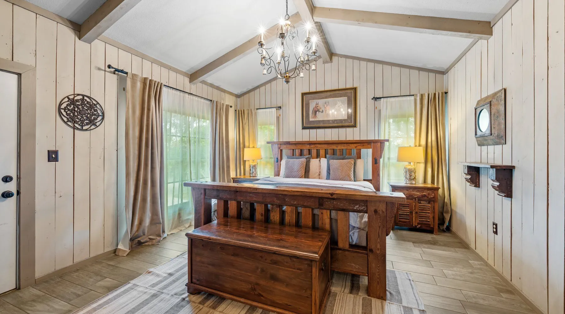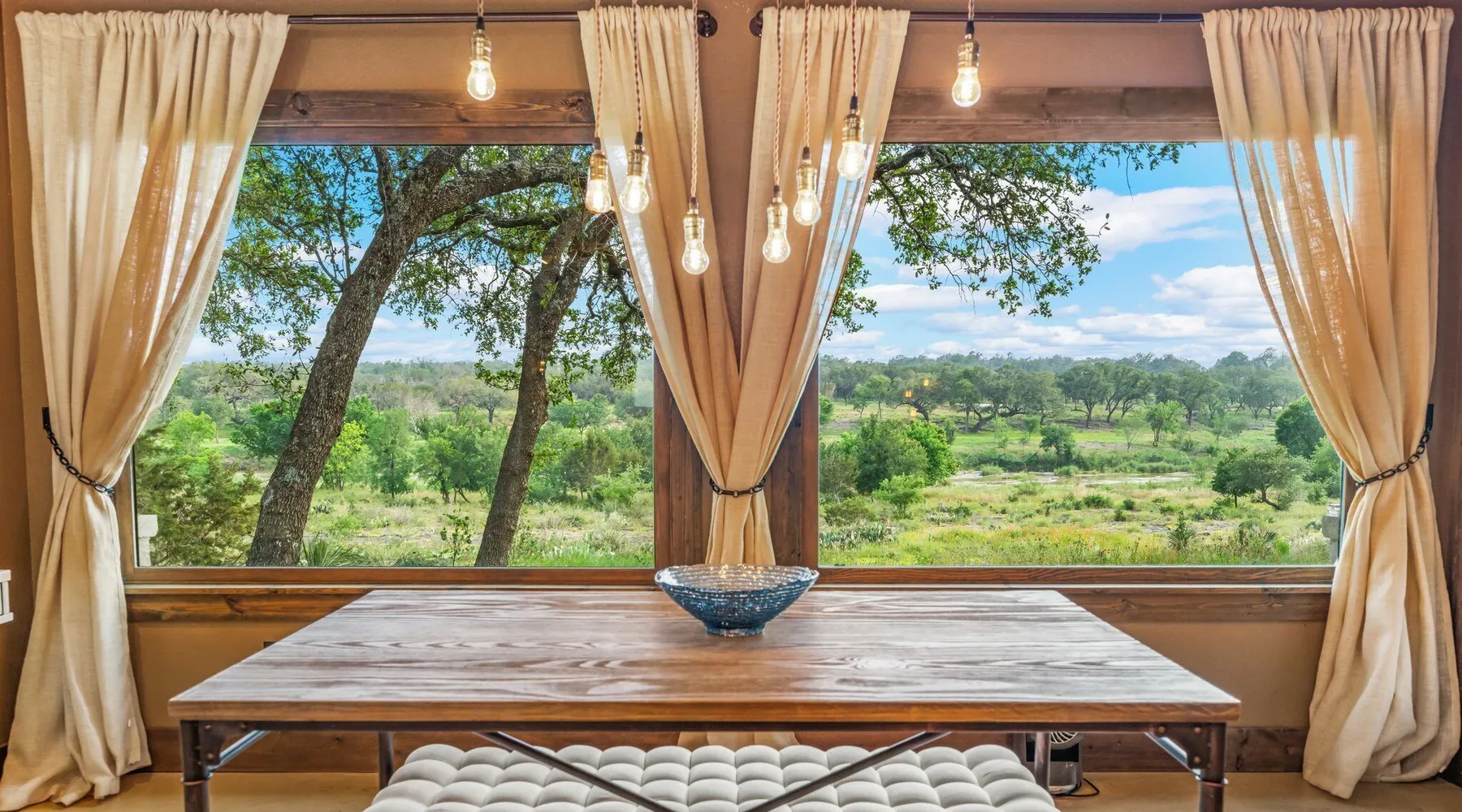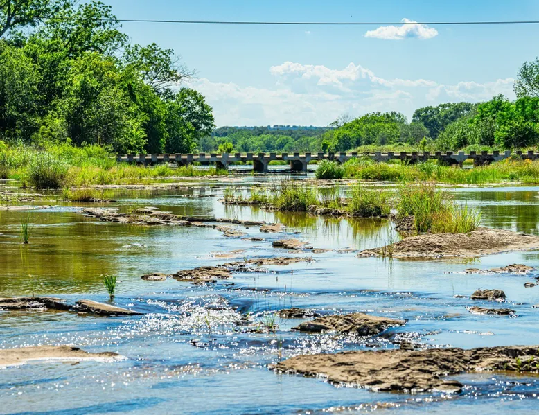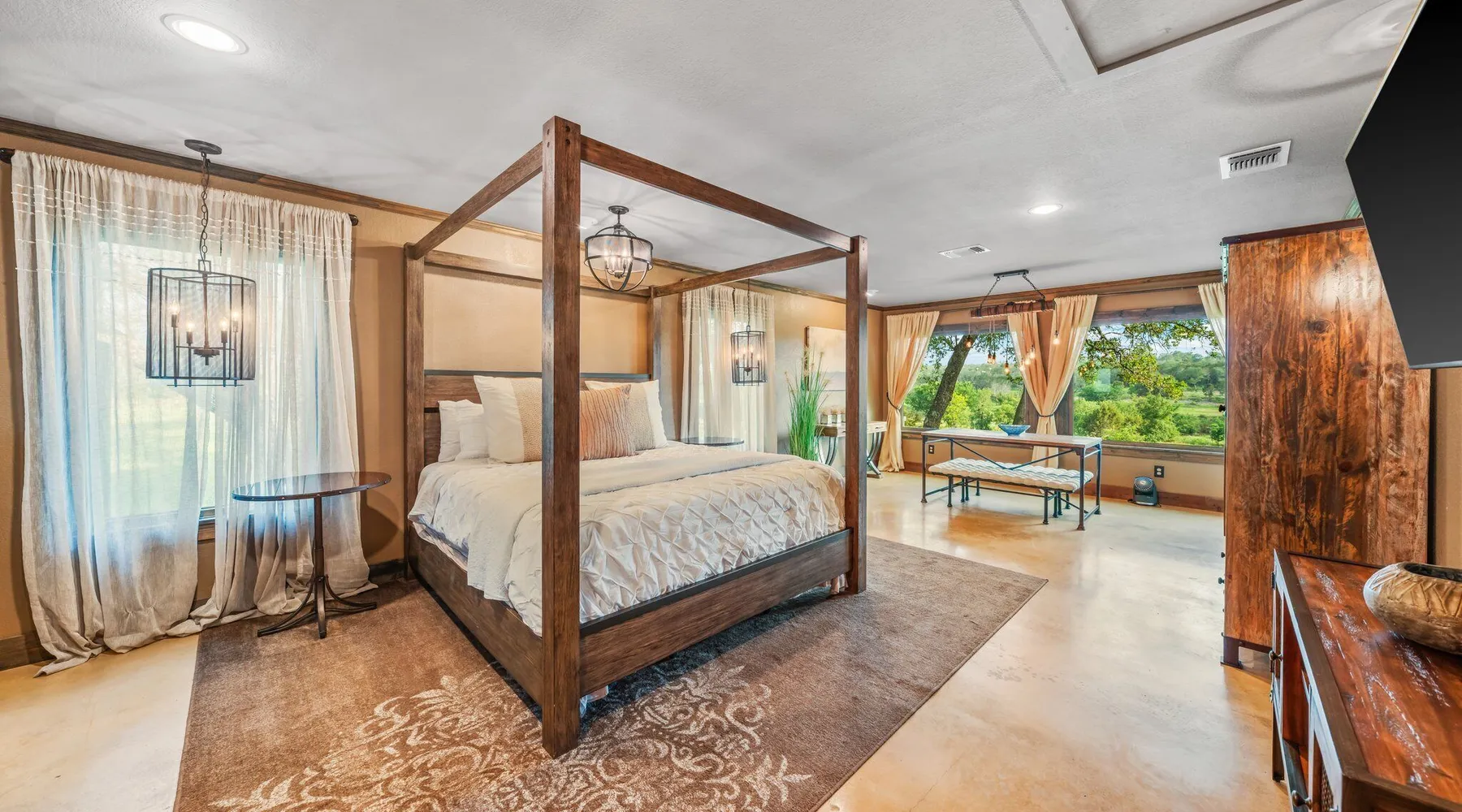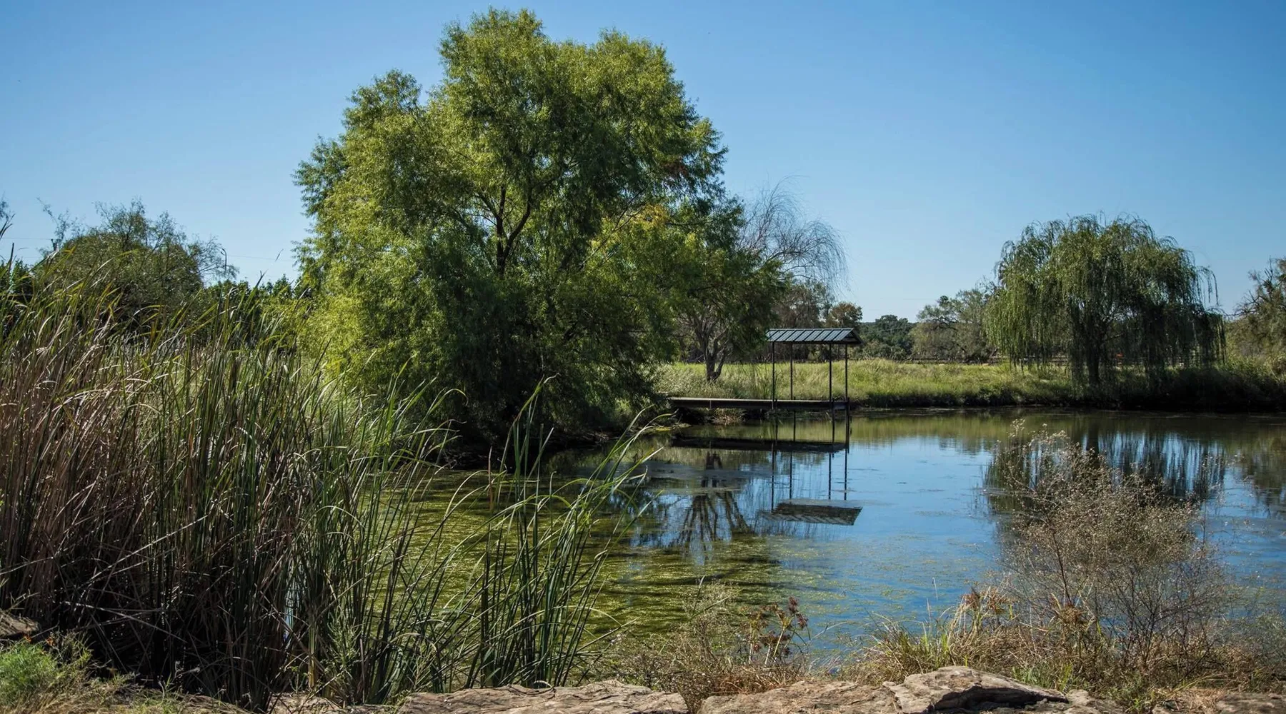 Tucked away in the most heavenly corner of the Texas Hill Country sits King River Ranch, a sprawling 25-acre paradise that offers its guests a perfect blend of private luxury and natural beauty. Upon driving through the gates, the KRR guest is greeted by our exclusive quarter-mile of the Pedernales River to enjoy and explore. The eye never ceases to be dazzled by impossibly charming barns, expansive horse pastures filled with friendly farm animals, the peacefully flowing river, and cinematic views in every direction, all within feet from the front door of this ultimate Hill Country getaway. Just a stone's throw downriver from the Lyndon B. Johnson Family Ranch, KRR is conveniently located 20 minutes from shopping and dining in Fredericksburg, 25 minutes to water sports at Horseshoe Bay, under one-hour to downtown ATX and SATX, and just a skip-and-a-jump to the historic town of Hye, the epicenter of the Hill Country wineries. Being in the heart of the one of the most popular destinations in the entire Lone Star State, there is literally no end to the things to do in the immediate area. The River Cottage is a gorgeous ranch house perched above the river on one side and panoramic views of the magnificent King Barn, horse pastures and fishing pond. The Suite is a generous and luxuriant private space built just for two, with a grand canopy bed from where you can watch deer gently cross the river. The River Cottage and Suite are included in every stay. Ask about your micro-wedding and elopement packages!