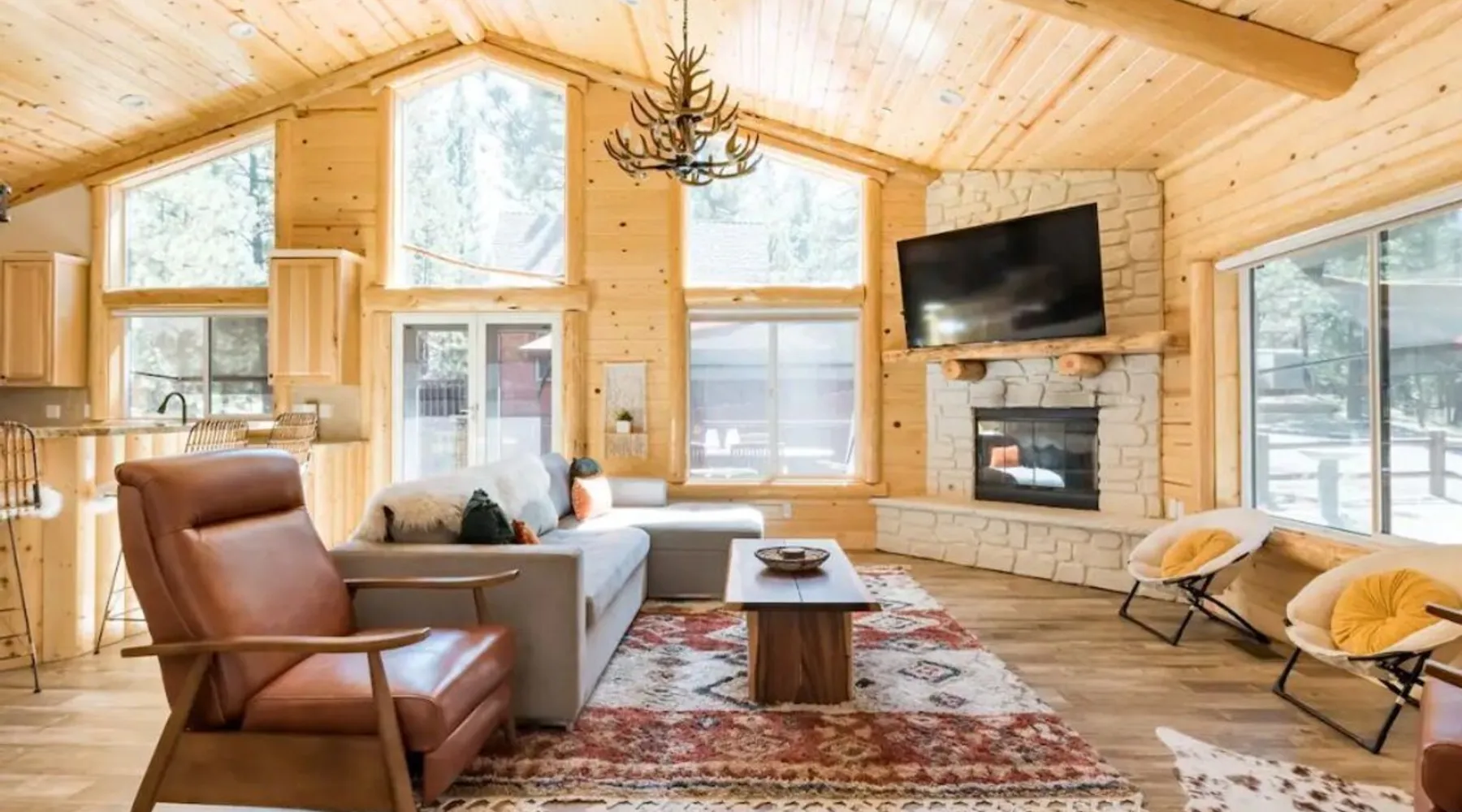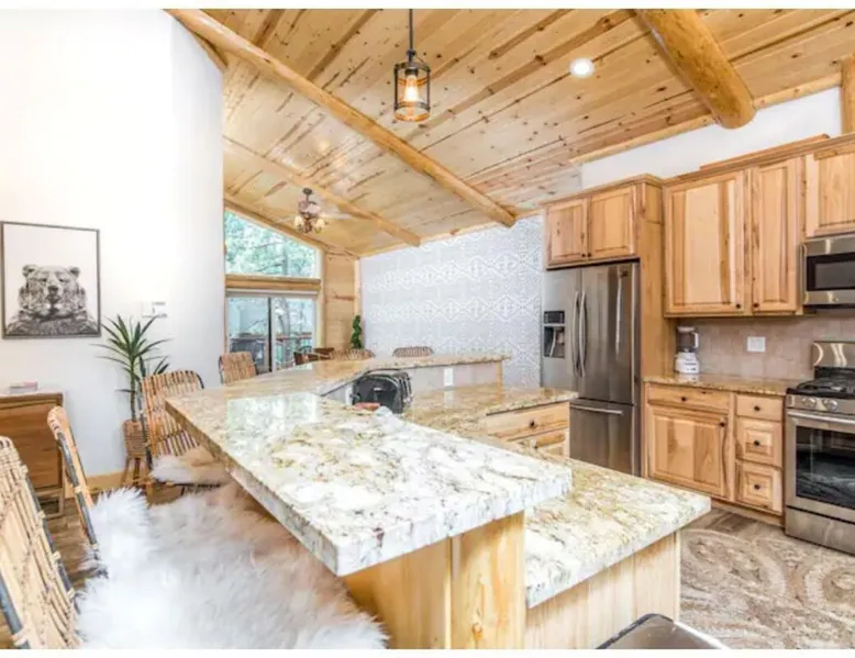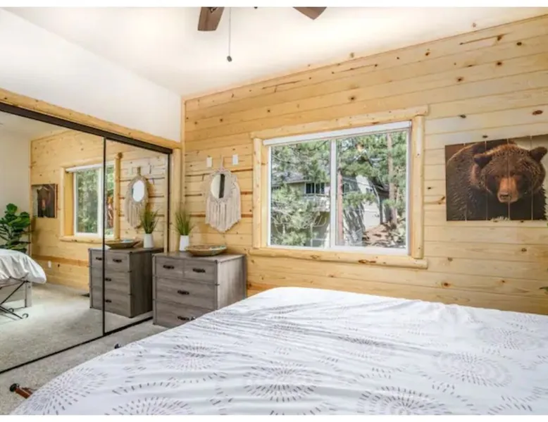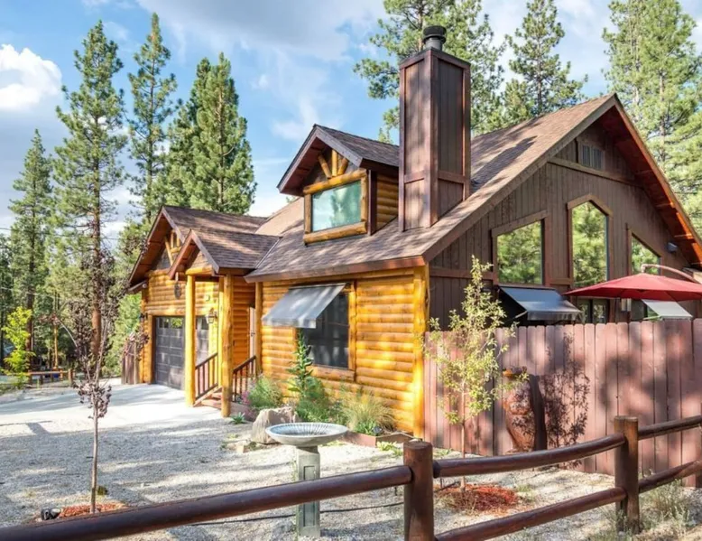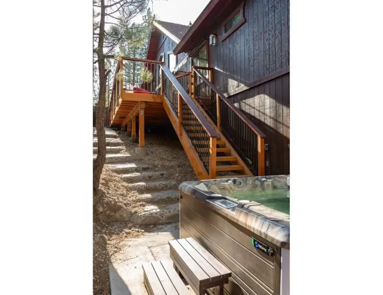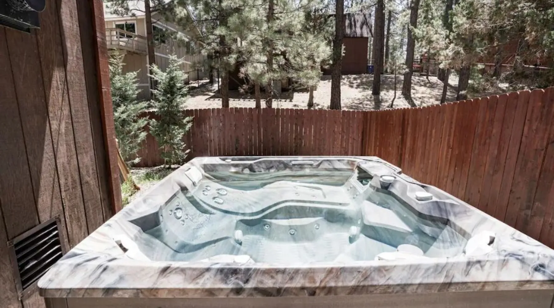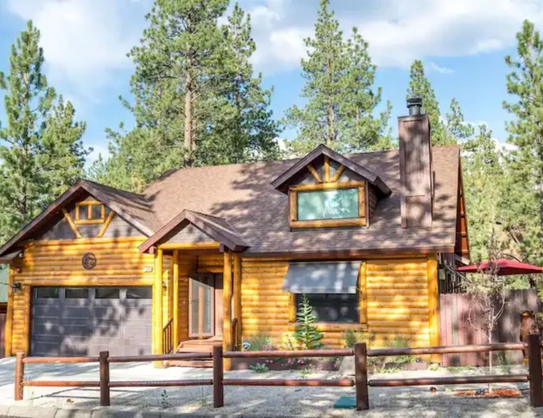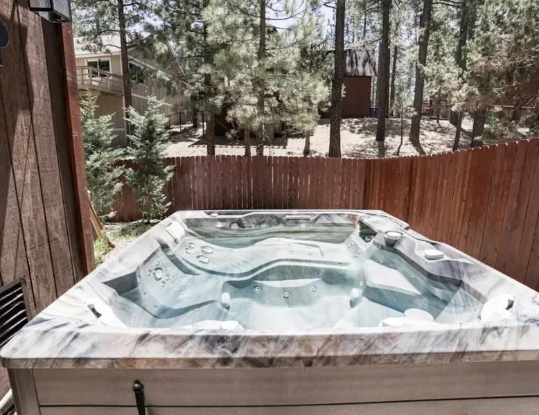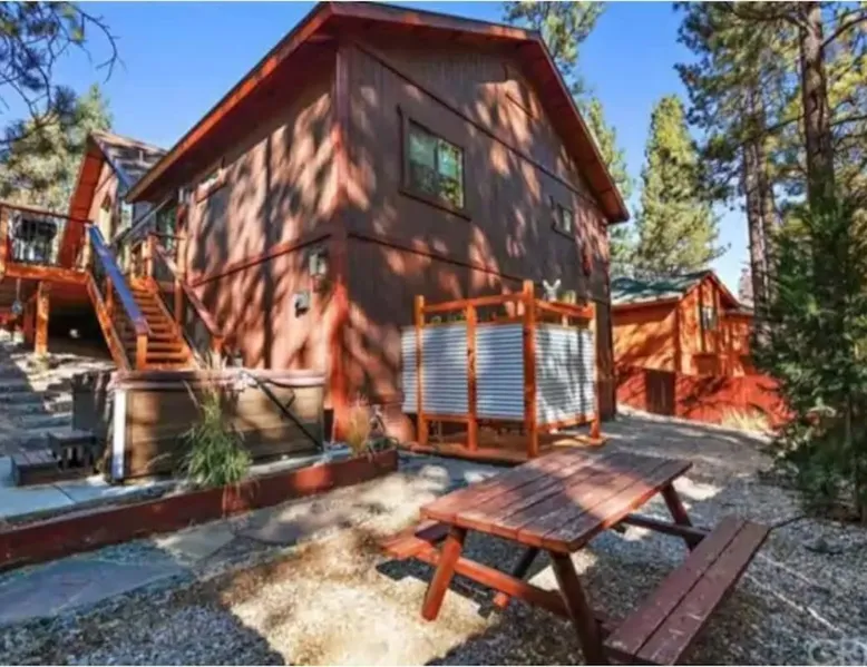 GORGEOUS, SINGLE LEVEL CUSTOM CABIN FENCED YARD-SPA-BBQ-FIRE PIT-CLOSE TO SLOPES New, gorgeous cabin located minutes away from Big Bear Lake and Ski slopes. Built in 2019 and decorated with the finest details throughout, this cozy cabin truly offers the ideal mountain getaway. The perfectly located quaint neighborhood includes multiple routes to slopes, ensuring a quick journey even during days with heavy traffic. Take in the beautiful pine views with two spacious decks including stairs to a modern 6 person salt water spa. The space Open concept great room with living, kitchen, and dining rooms all under a knotty pine vaulted ceiling. Large master with en-suite bath and two secondary bedrooms with a full bath to share. Large fully fenced back yard and two spacious wood patios surrounded by beautiful pines. Guest access Entire home, two patios and fully fenced yard. Languages English, Spanish