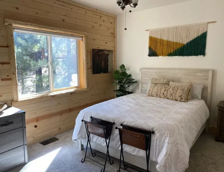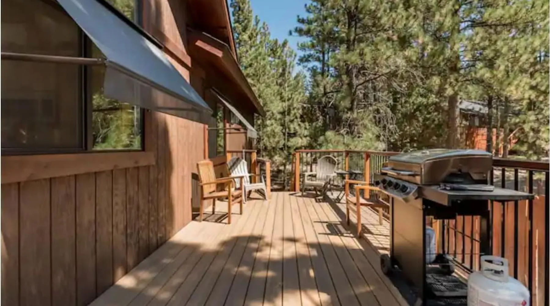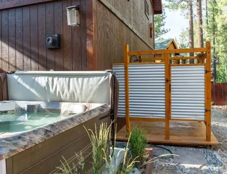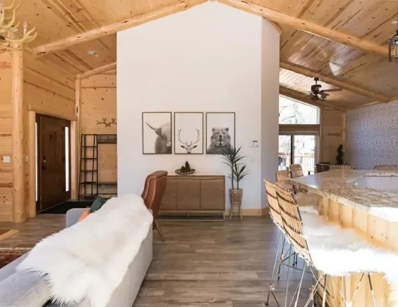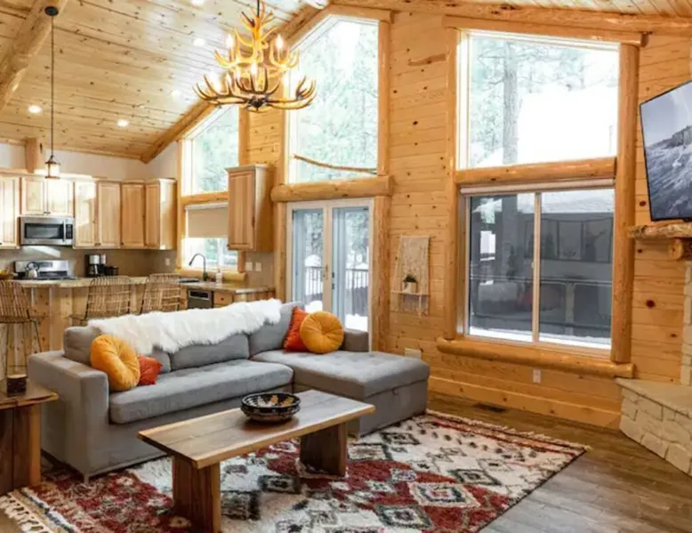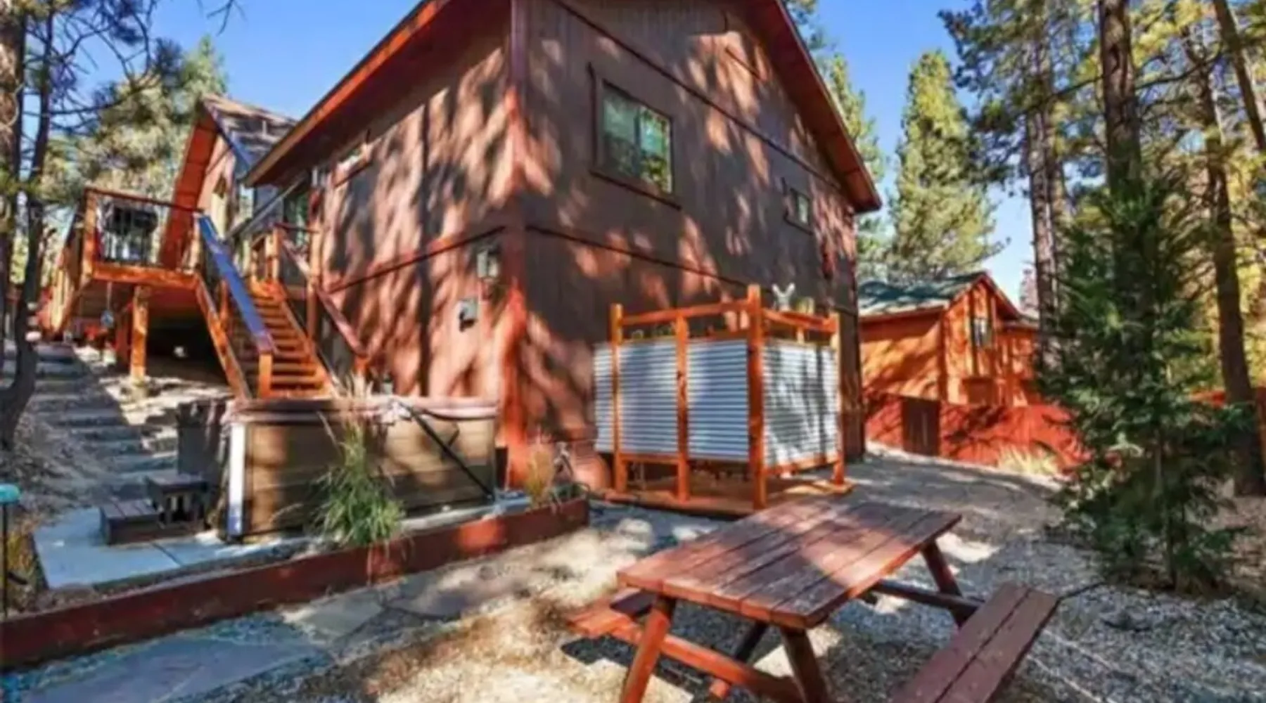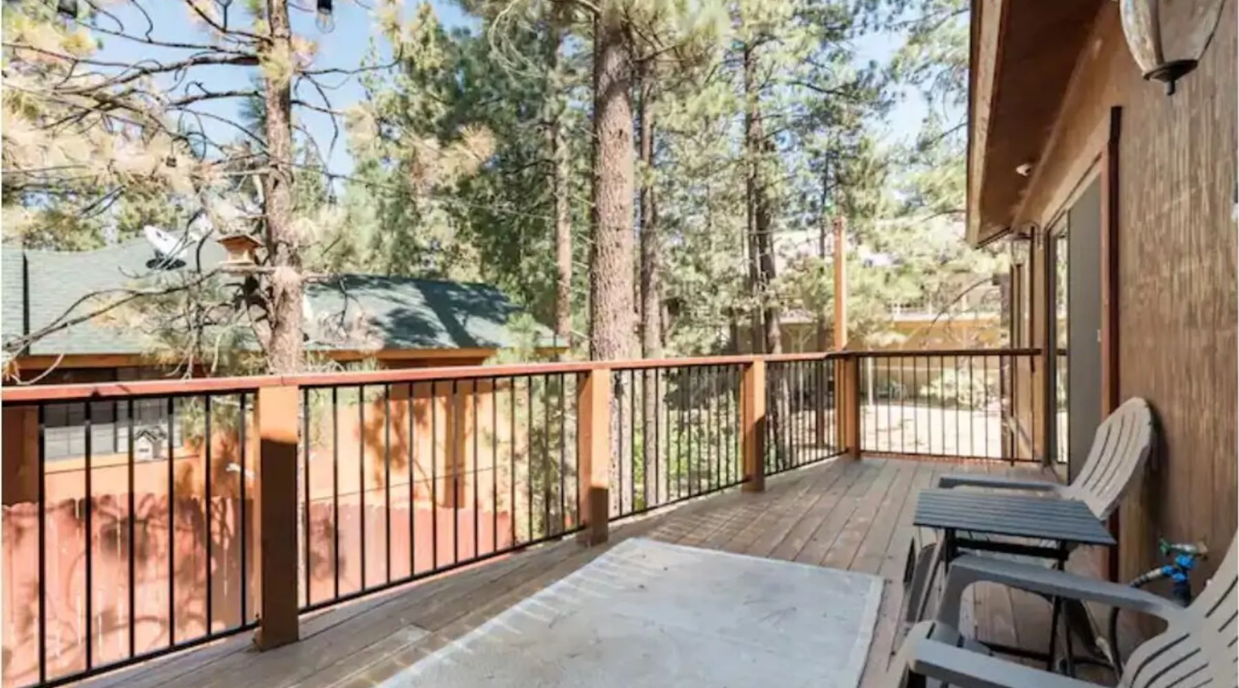 GORGEOUS, SINGLE LEVEL CUSTOM CABIN FENCED YARD-SPA-BBQ-FIRE PIT-CLOSE TO SLOPES New, gorgeous cabin located minutes away from Big Bear Lake and Ski slopes. Built in 2019 and decorated with the finest details throughout, this cozy cabin truly offers the ideal mountain getaway. The perfectly located quaint neighborhood includes multiple routes to slopes, ensuring a quick journey even during days with heavy traffic. Take in the beautiful pine views with two spacious decks including stairs to a modern 6 person salt water spa. The space Open concept great room with living, kitchen, and dining rooms all under a knotty pine vaulted ceiling. Large master with en-suite bath and two secondary bedrooms with a full bath to share. Large fully fenced back yard and two spacious wood patios surrounded by beautiful pines. Guest access Entire home, two patios and fully fenced yard. Languages English, Spanish