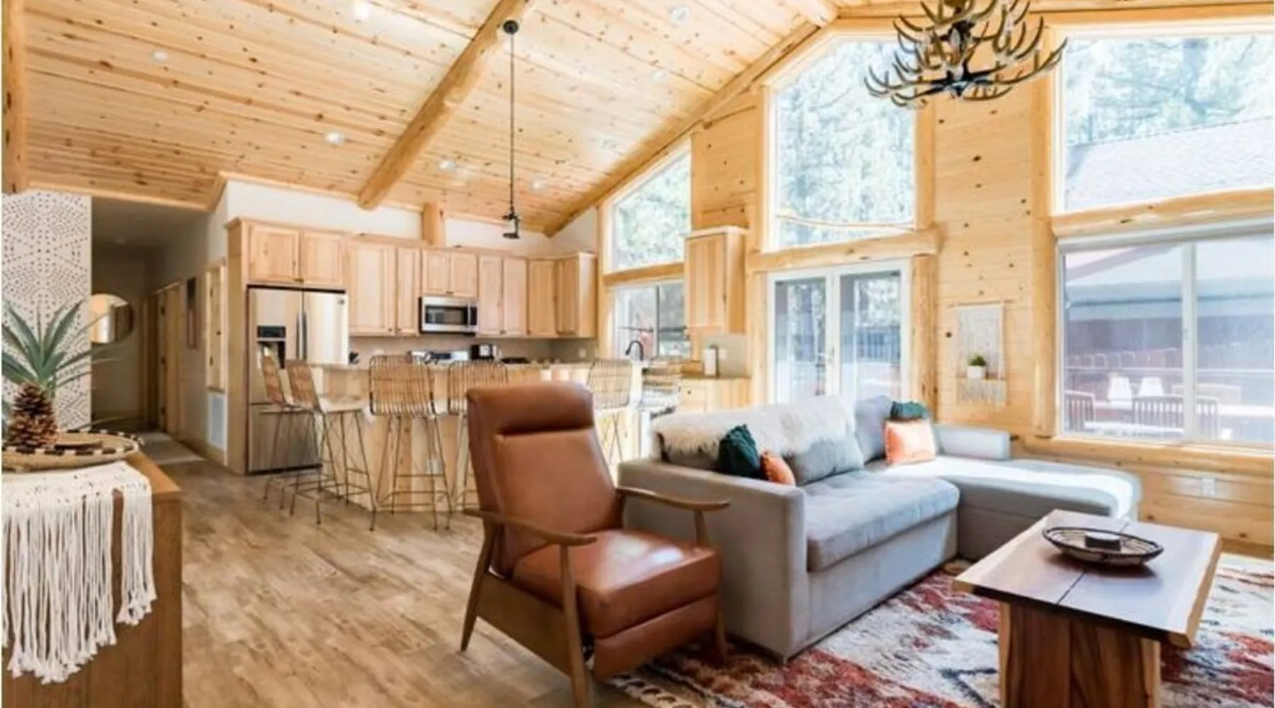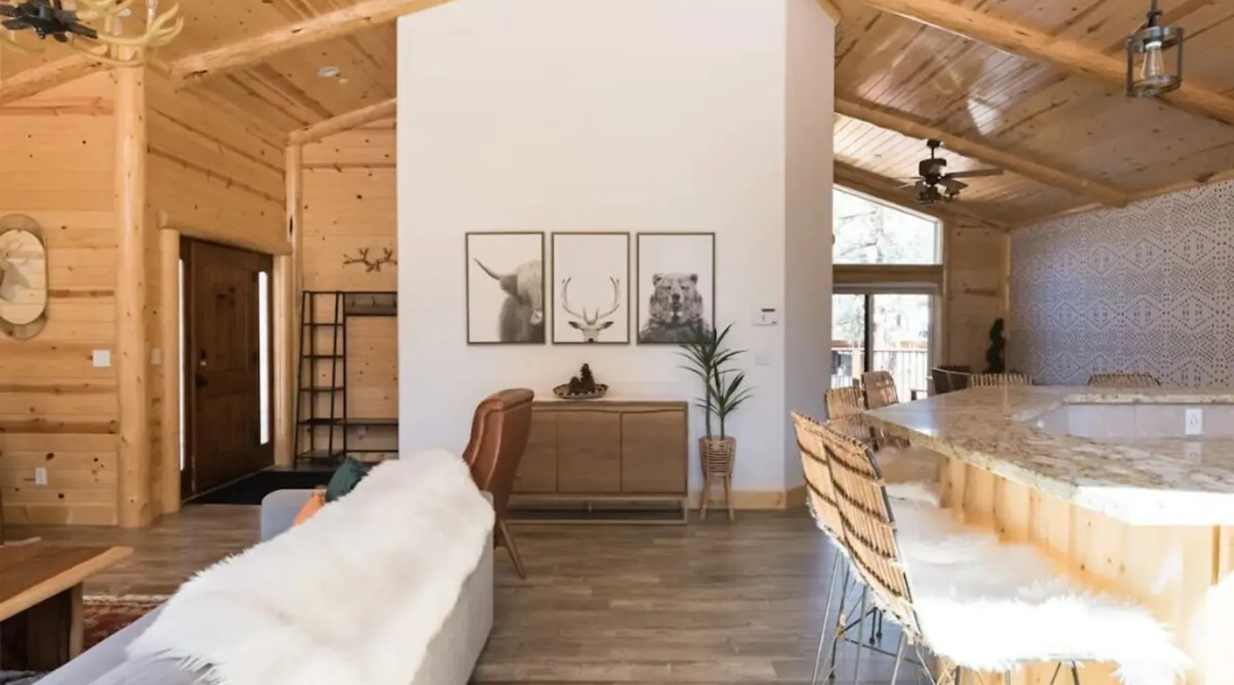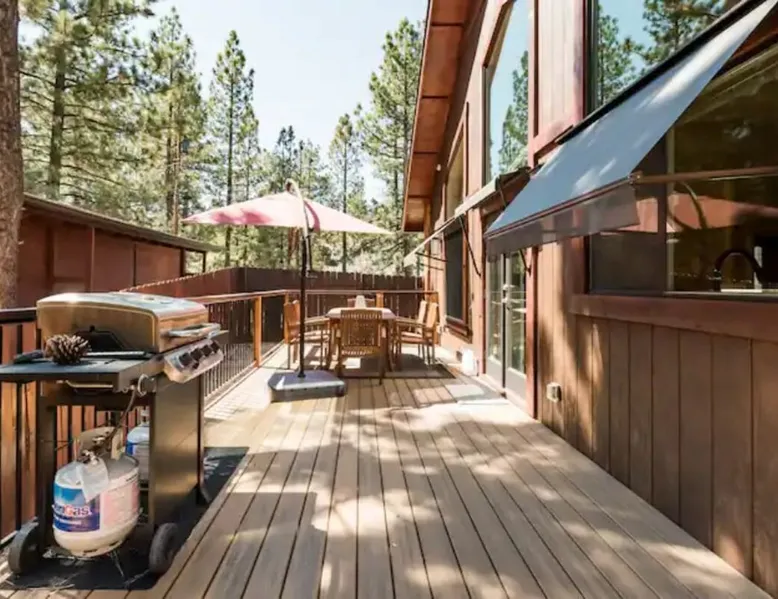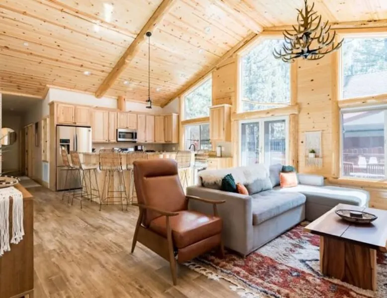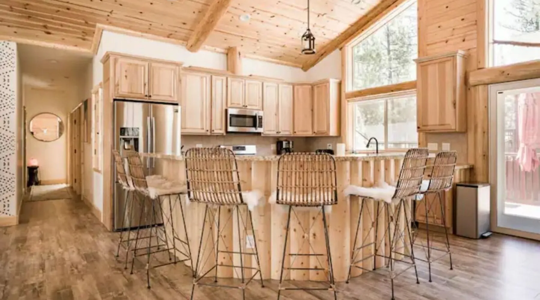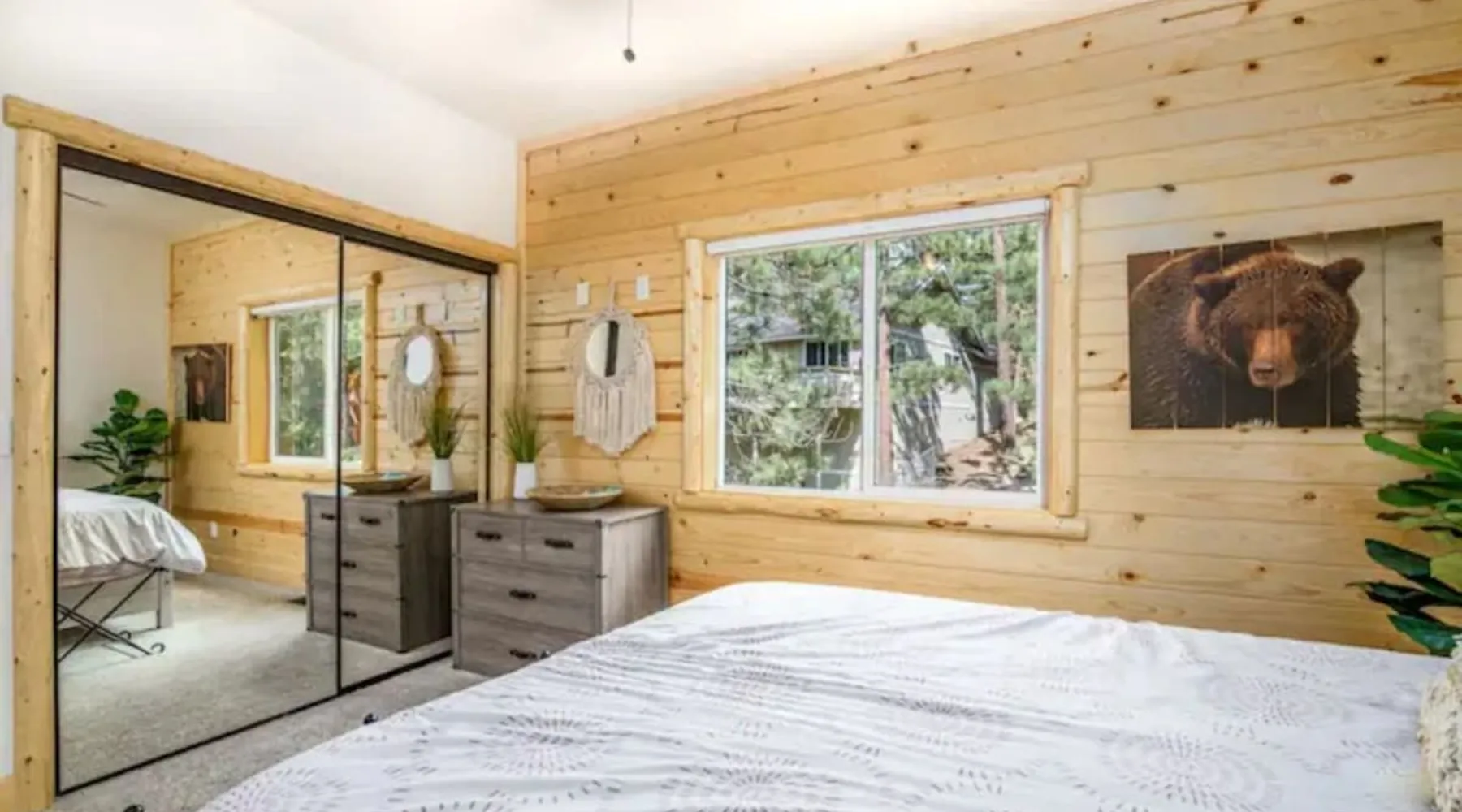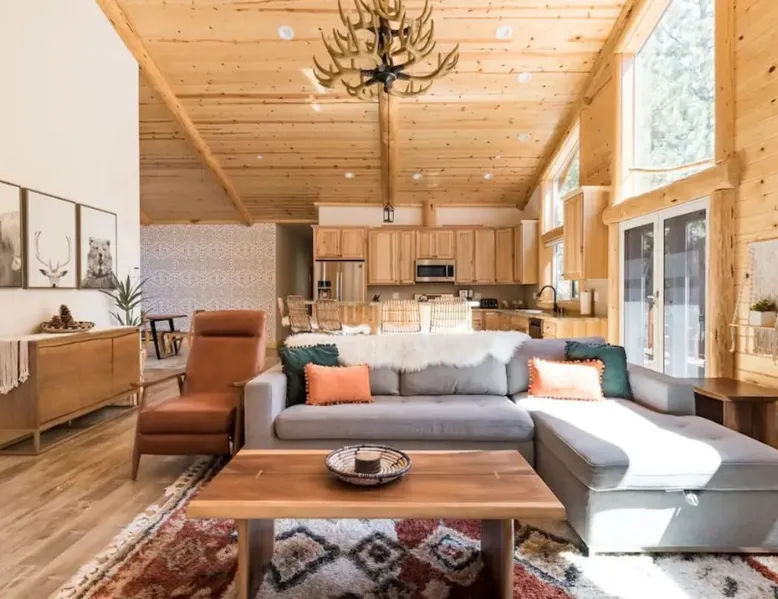 GORGEOUS, SINGLE LEVEL CUSTOM CABIN FENCED YARD-SPA-BBQ-FIRE PIT-CLOSE TO SLOPES New, gorgeous cabin located minutes away from Big Bear Lake and Ski slopes. Built in 2019 and decorated with the finest details throughout, this cozy cabin truly offers the ideal mountain getaway. The perfectly located quaint neighborhood includes multiple routes to slopes, ensuring a quick journey even during days with heavy traffic. Take in the beautiful pine views with two spacious decks including stairs to a modern 6 person salt water spa. The space Open concept great room with living, kitchen, and dining rooms all under a knotty pine vaulted ceiling. Large master with en-suite bath and two secondary bedrooms with a full bath to share. Large fully fenced back yard and two spacious wood patios surrounded by beautiful pines. Guest access Entire home, two patios and fully fenced yard. Languages English, Spanish