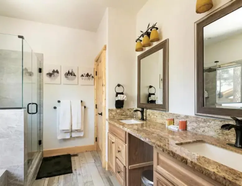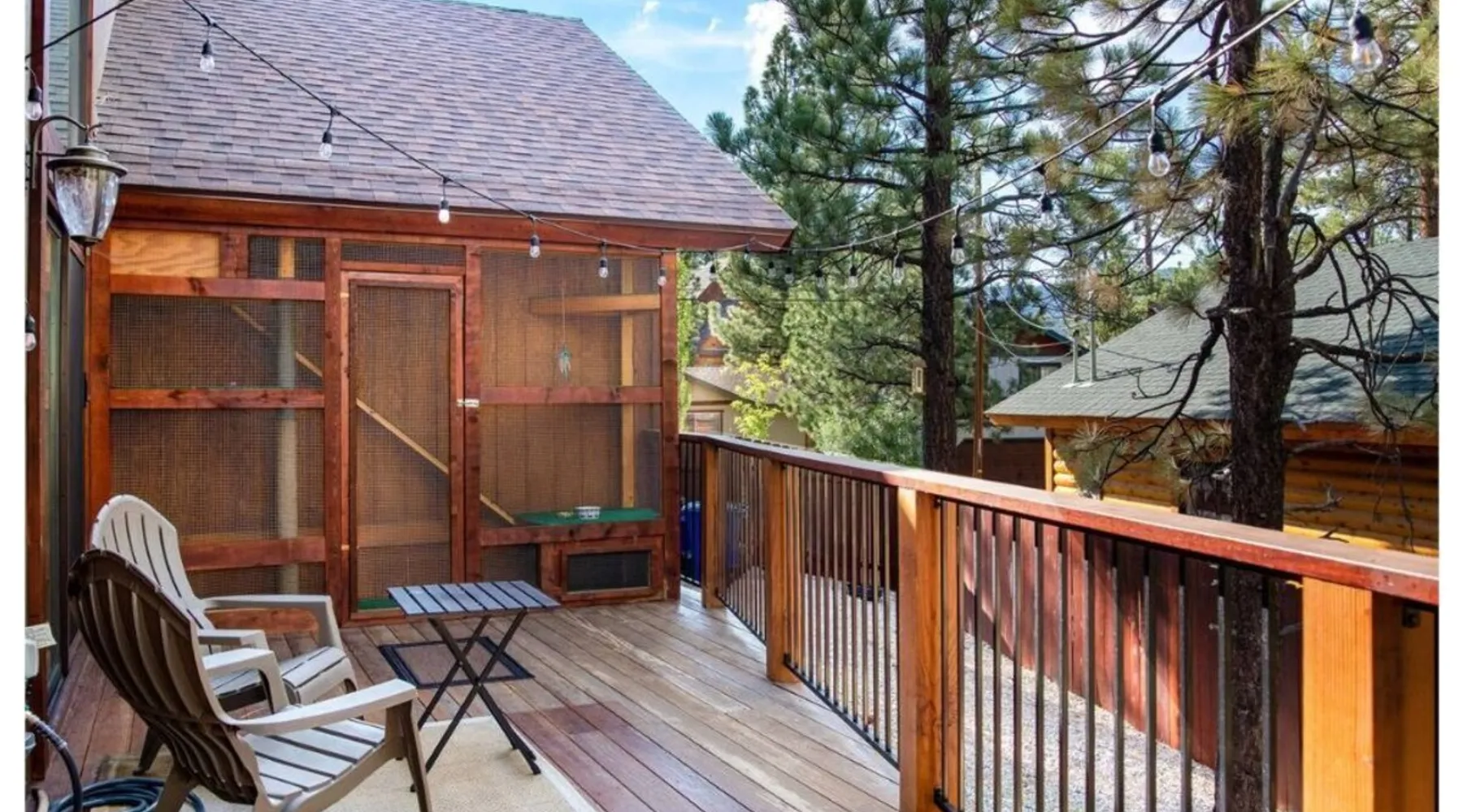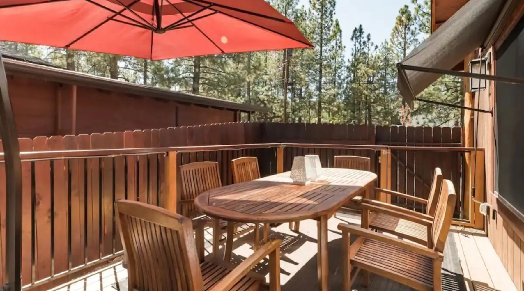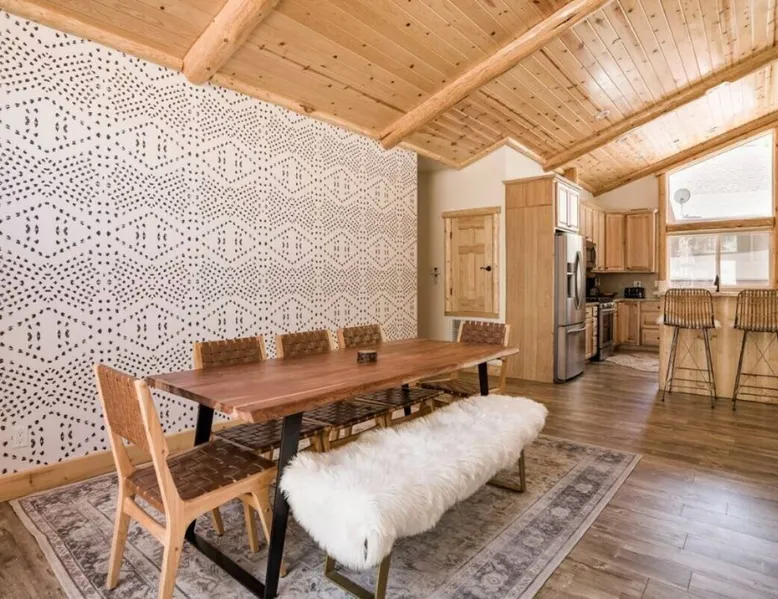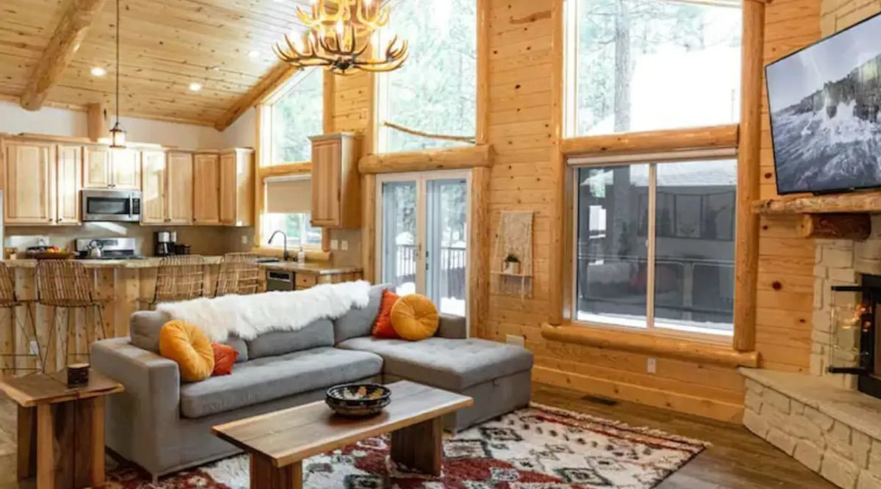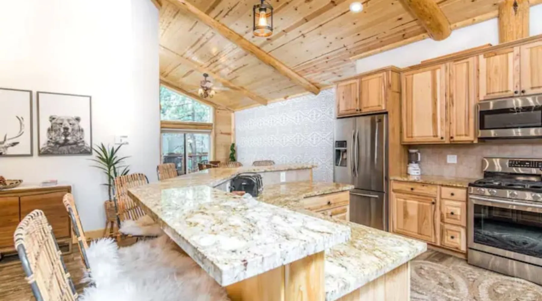 GORGEOUS, SINGLE LEVEL CUSTOM CABIN FENCED YARD-SPA-BBQ-FIRE PIT-CLOSE TO SLOPES New, gorgeous cabin located minutes away from Big Bear Lake and Ski slopes. Built in 2019 and decorated with the finest details throughout, this cozy cabin truly offers the ideal mountain getaway. The perfectly located quaint neighborhood includes multiple routes to slopes, ensuring a quick journey even during days with heavy traffic. Take in the beautiful pine views with two spacious decks including stairs to a modern 6 person salt water spa. The space Open concept great room with living, kitchen, and dining rooms all under a knotty pine vaulted ceiling. Large master with en-suite bath and two secondary bedrooms with a full bath to share. Large fully fenced back yard and two spacious wood patios surrounded by beautiful pines. Guest access Entire home, two patios and fully fenced yard. Languages English, Spanish