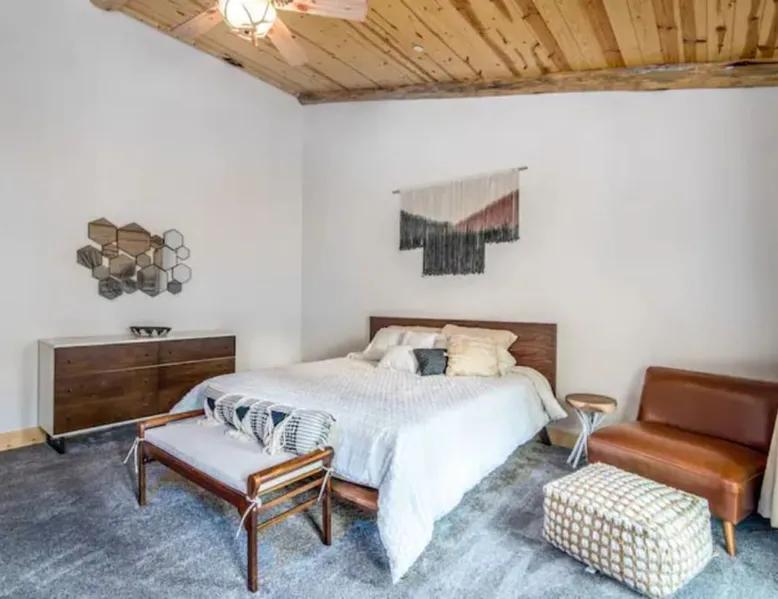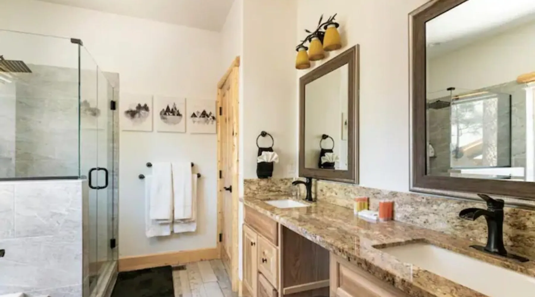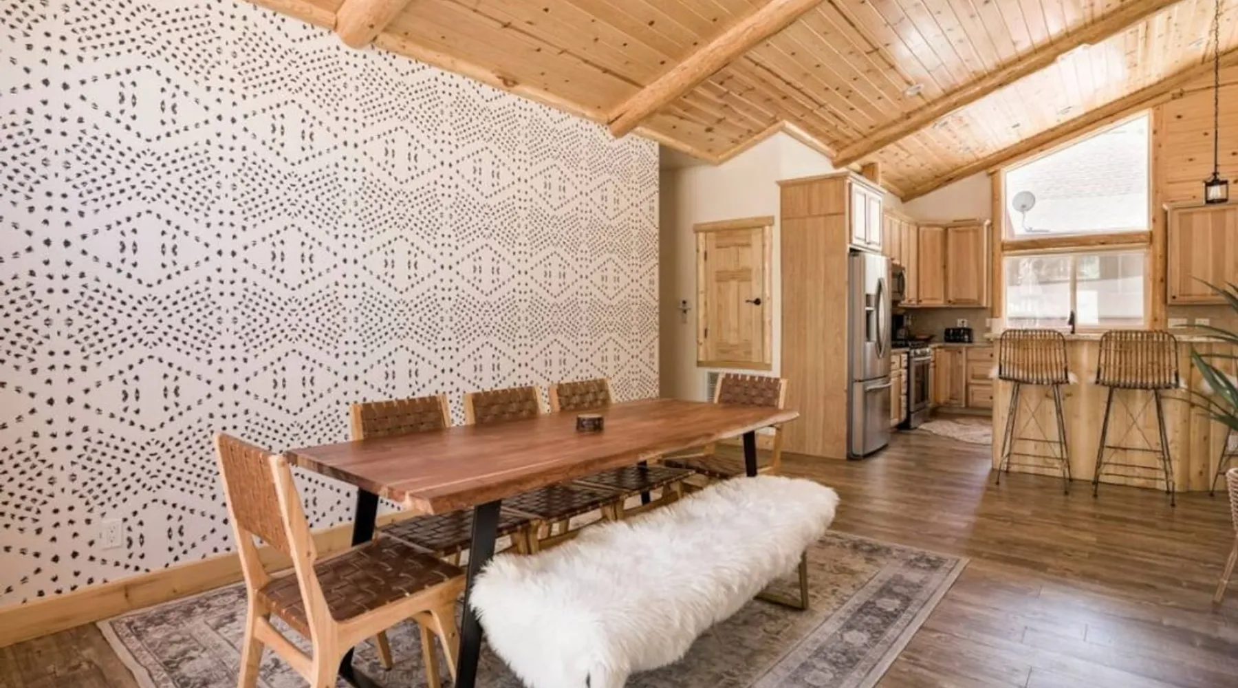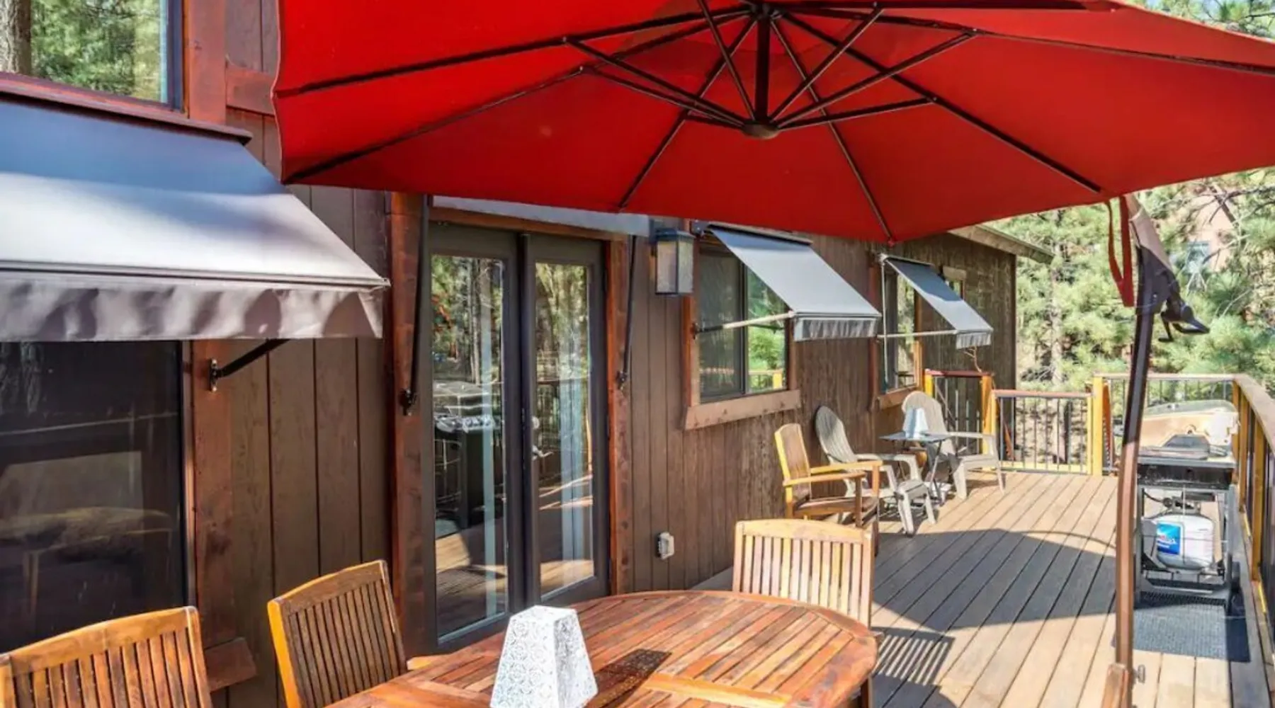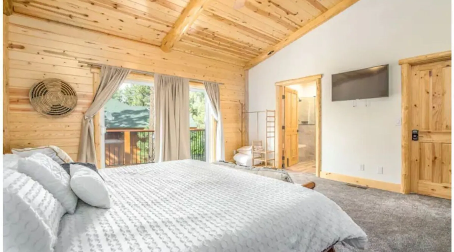 GORGEOUS, SINGLE LEVEL CUSTOM CABIN FENCED YARD-SPA-BBQ-FIRE PIT-CLOSE TO SLOPES New, gorgeous cabin located minutes away from Big Bear Lake and Ski slopes. Built in 2019 and decorated with the finest details throughout, this cozy cabin truly offers the ideal mountain getaway. The perfectly located quaint neighborhood includes multiple routes to slopes, ensuring a quick journey even during days with heavy traffic. Take in the beautiful pine views with two spacious decks including stairs to a modern 6 person salt water spa. The space Open concept great room with living, kitchen, and dining rooms all under a knotty pine vaulted ceiling. Large master with en-suite bath and two secondary bedrooms with a full bath to share. Large fully fenced back yard and two spacious wood patios surrounded by beautiful pines. Guest access Entire home, two patios and fully fenced yard. Languages English, Spanish