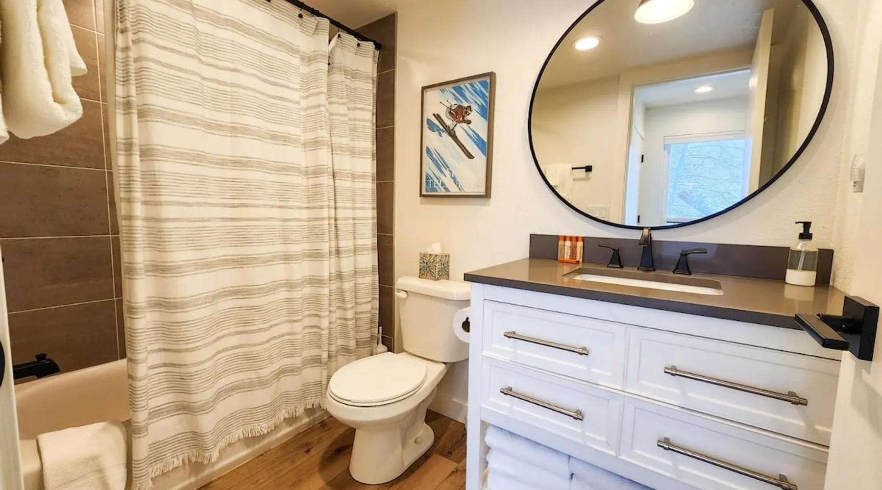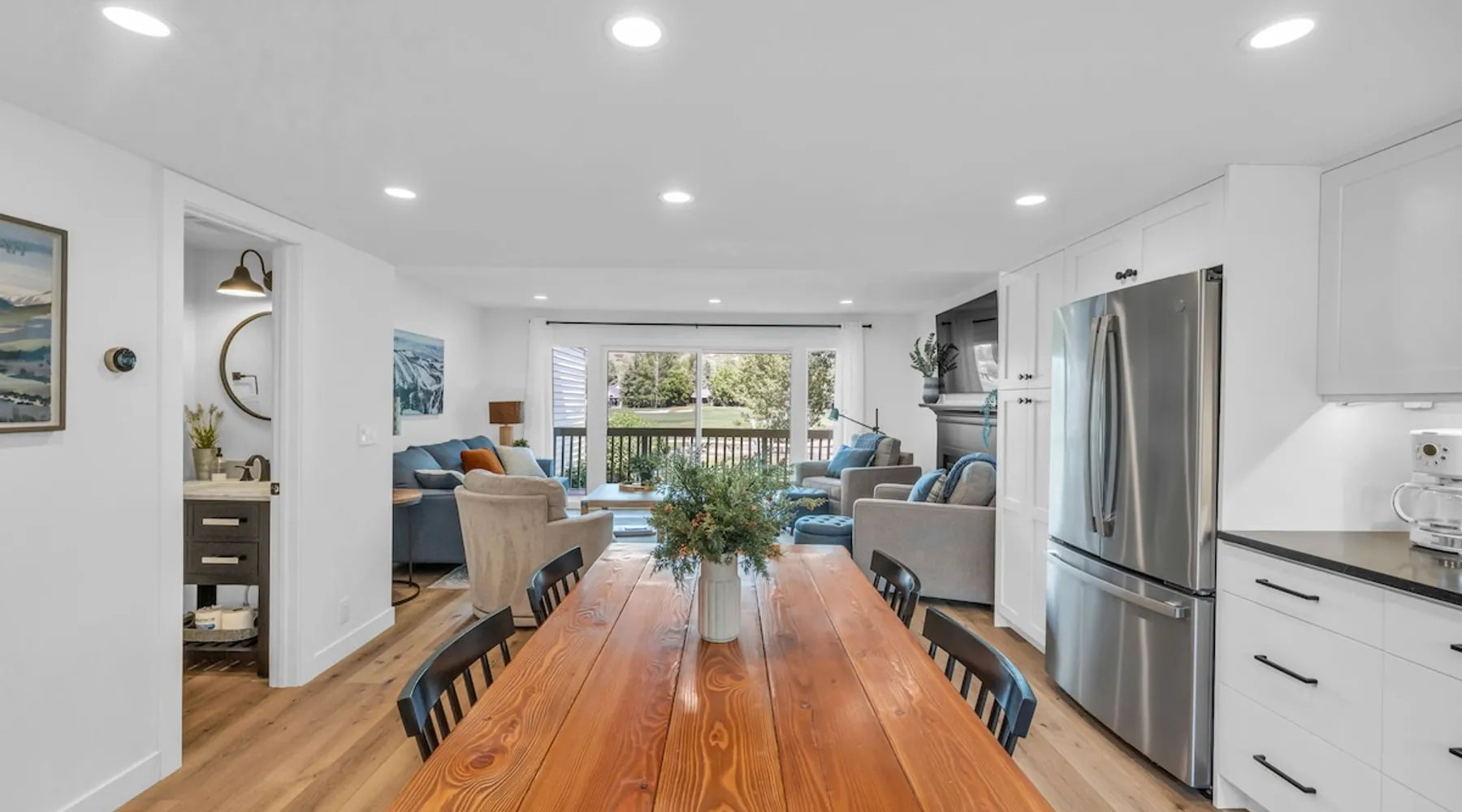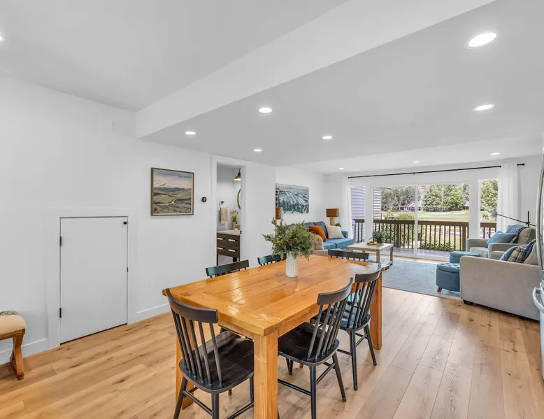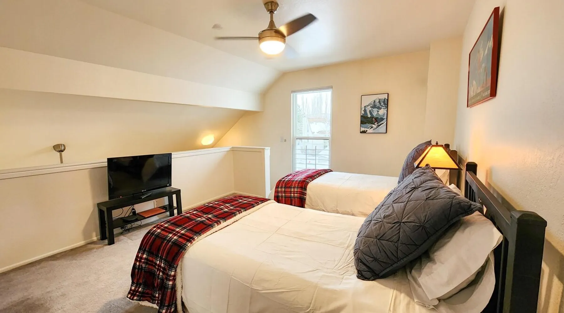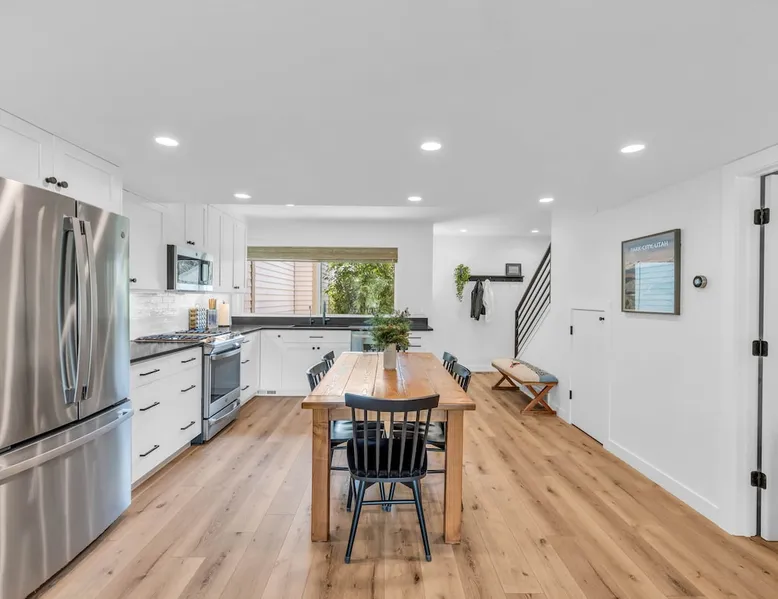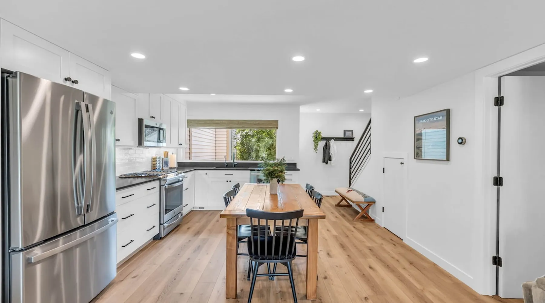 Located in the desirable Park Meadows neighborhood, this modern three-bedroom townhome places you minutes from a world-class ski resort, golf courses, hiking trails, and downtown Park City. The updated townhome is surrounded by serene nature while being only steps from the free city shuttle line at the MARC Stop. Enjoy the best of both sides in this townhome that provides a beautifully decorated quiet space to unwind in an unbeatable location near all the action! The space This beautifully decorated townhome is set up to fulfill all your needs for a comfortable and convenient stay in Park City! Guests will enter the townhome off the front porch, which overlooks a small yard and the surrounding, quiet community. Upon entering the home, take in the bright, updated space as you hang your coats on the large coat rack before making your way into the rest of the home. The ground level of the townhome is set up out with an open-concept floor plan placing the kitchen, dining, and living room all together, creating a thoughtfully designed space for your group to enjoy. Guests will first come to the kitchen, a dazzling space with white cabinets, stainless steel appliances, and a large window above the kitchen sink. The kitchen is fully equipped with everything you may need to make morning pancakes or cook up a delicious dinner. You will find it all in this well-organized space. Combined with the kitchen is the dining space, where you will find a beautiful wooden table with seating for 6. This space is flooded with natural lighting thanks to the sliding glass doors that will take you out to the patio. Just off the dining and kitchen area, a half bathroom is conveniently located for use in the common space and features a single-sink vanity with under-sink storage space and a toilet. Connected to the kitchen/dining area is the living room, a bright space with great views thanks to the sliding glass doors leading out to the patio. The living room is set up with a large couch and three comfortable couch chairs, two of which include footrests for added comfort. Throughout the space, you will also find three side tables and two lamps, as well as one large coffee table. Your group will enjoy warming up by the electric fireplace or catching a movie on the 65” smart TV in this cozy space! From the living room, head out to the private patio via the sliding glass doors and be greeted with beautiful views over the area. The patio includes four patio chairs for you to settle into as you take in the views looking out on the golf course and towards the mountains and the famous Park City hill sign. On the second level of the townhome, you will find three bedrooms, two full bathrooms, and a washing and drying machine. As you come to the top of the stairs, you arrive at an open hallway where you will find the washing and drying machine located in a closet space on the left-hand side. At the end of the hallway located between the master bedroom and first bedroom is the shared bathroom, which features a single-sink vanity, a tiled shower/bathtub combo, and ample below-sink storage space. To the left of the bathroom is the master bedroom. Enjoy a restful night of sleep on the king bed in this spacious room where you will find vaulted ceilings, a large walk-in closet, and a private terrace through a sliding glass door that provides lovely views over the golf course and backyard area. Enjoy the views while still resting in bed, watch a movie on the mounted 39” TV, or enjoy a good book with the conveniently located bedside lamps on the two nightstands. Adding to your comfort is the fully attached master bathroom boasting a modern design complete with a double-sink vanity and a large walk-in shower with a small built-in seat. Directly across from the master bedroom you will find the first guest bedroom, which includes a queen bed, a bedside table and lamp, and sliding glass doors to a balcony that overlooks the front side of the townhome. This charming room has additional touches to make you feel right at home with vaulted ceilings, well-placed decor, and blackout curtains to ensure a restful night of sleep. Additionally, located in this room is a staircase leading up to a loft area, which has been set up as a third bedroom. In this third bedroom, you will find two twin beds, one bedside table with a lamp, a 32” TV, and two closets for guest use. The two rooms offer a great space for families or groups to share while still providing separation of sleeping areas. Guest access Guests will have access to the entire home as well as two parking spots, one community space, and one space in the parking garage. Other things to note This home is located on the 6th hole of Park Meadows Country Club golf course, which is a private golf course and can only be played on with a membership. In the summer months, guests are asked to not go out onto the course located behind the house at any time. Please note, like most homes in Park City, this home does not have A/C. Parking Notes: Guests cannot park their vehicles in front of the garage door. They can be towed by the HOA at the guest's expense. Please keep in mind that if you plan to ski, you are responsible for verifying the ski resorts' opening and closing dates.