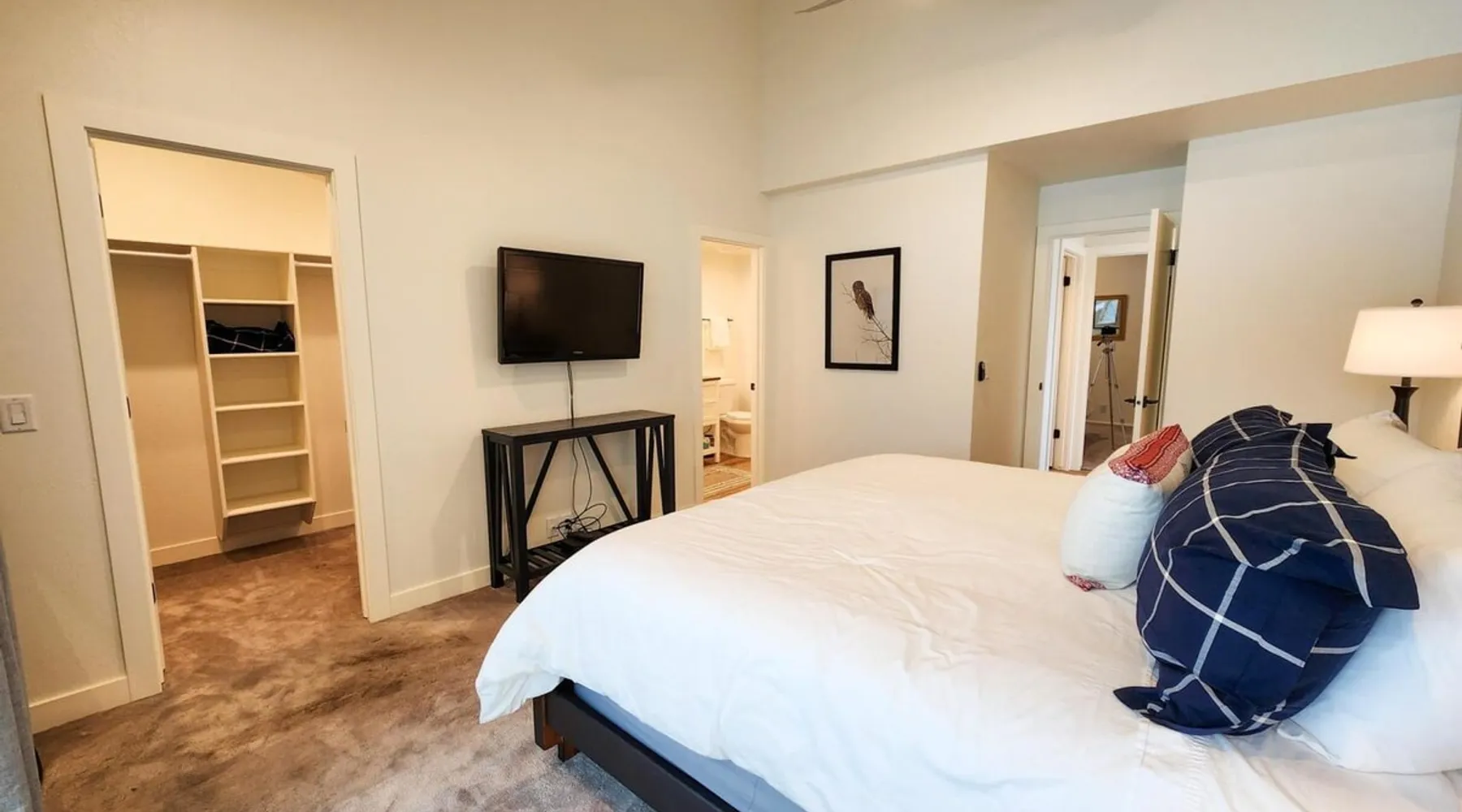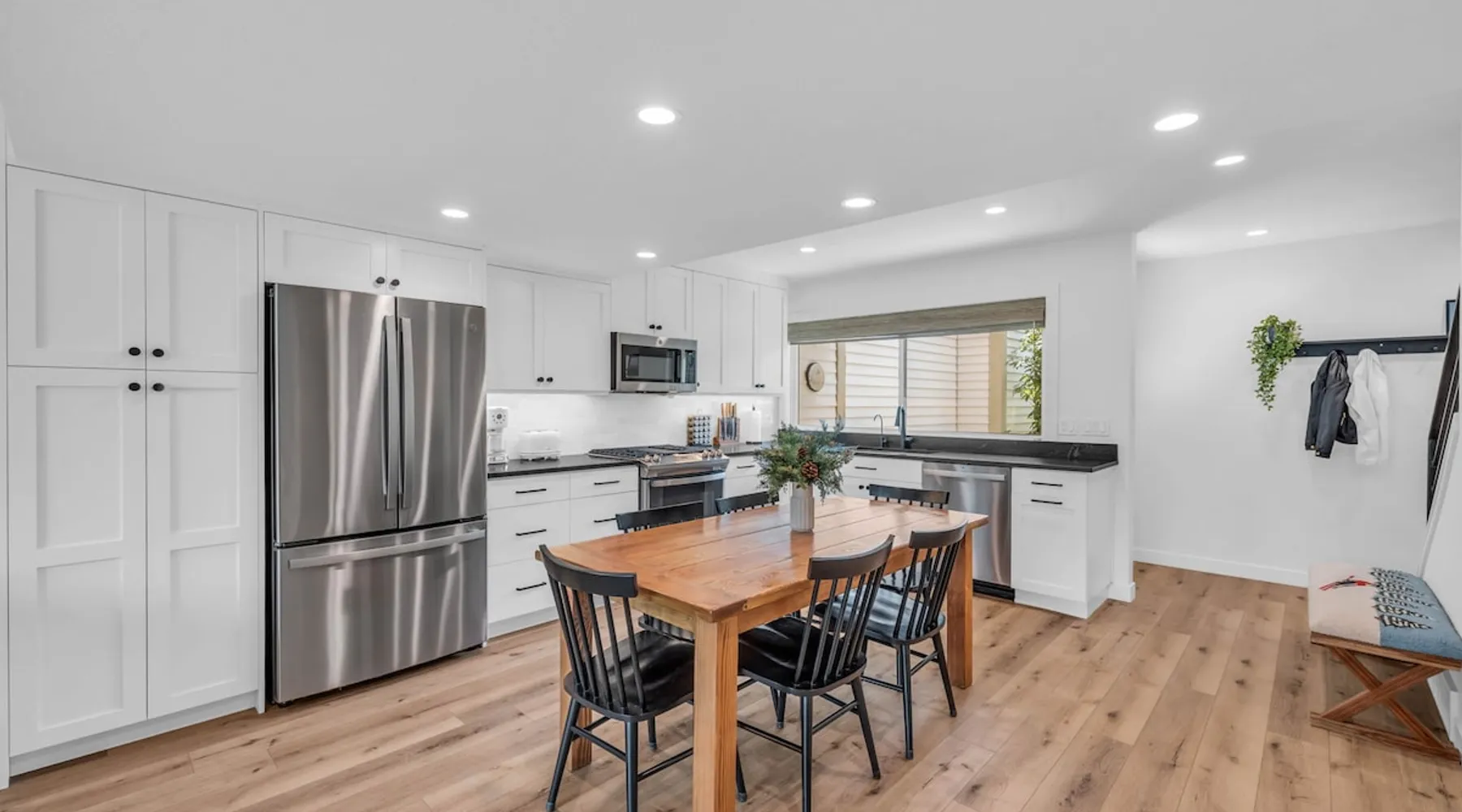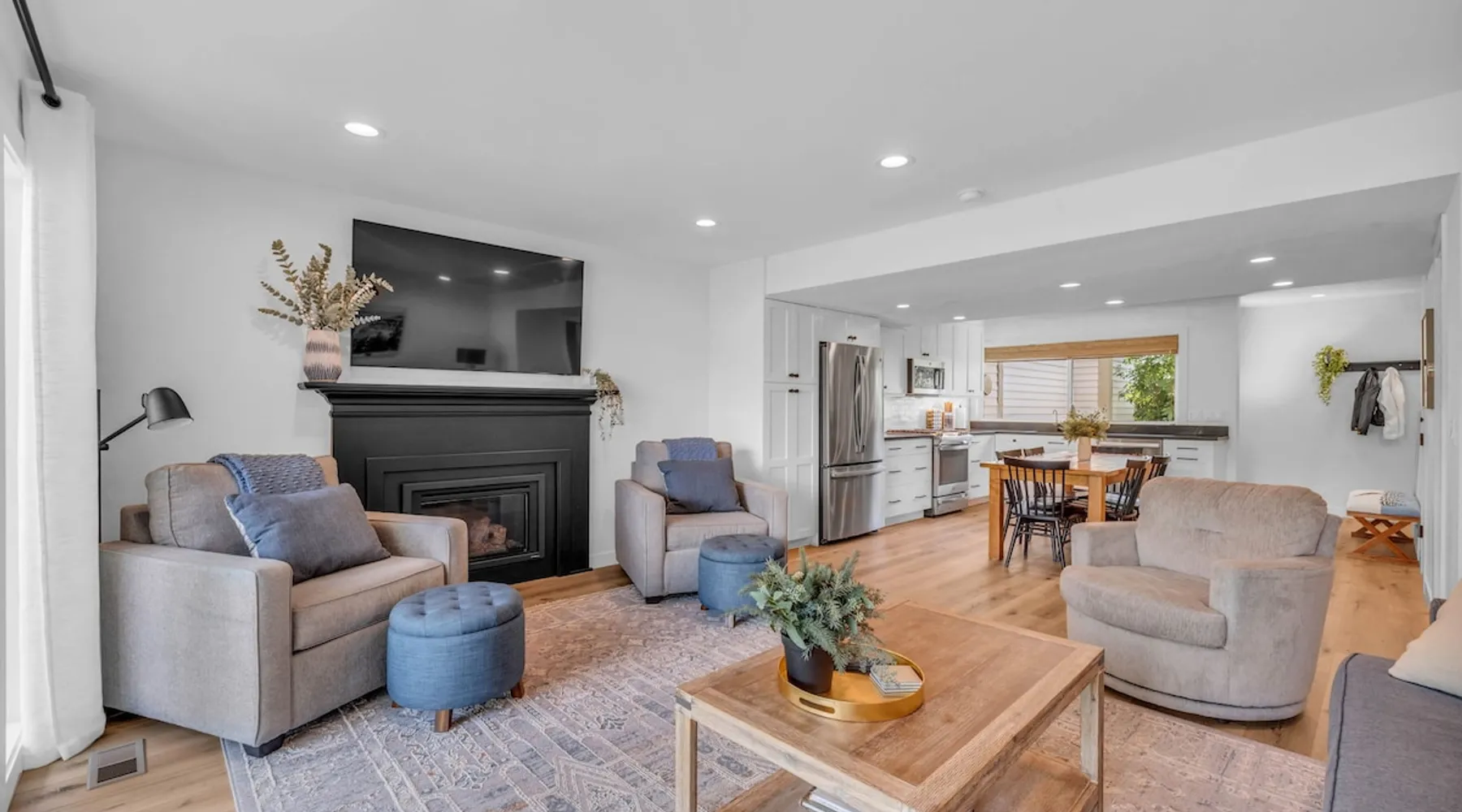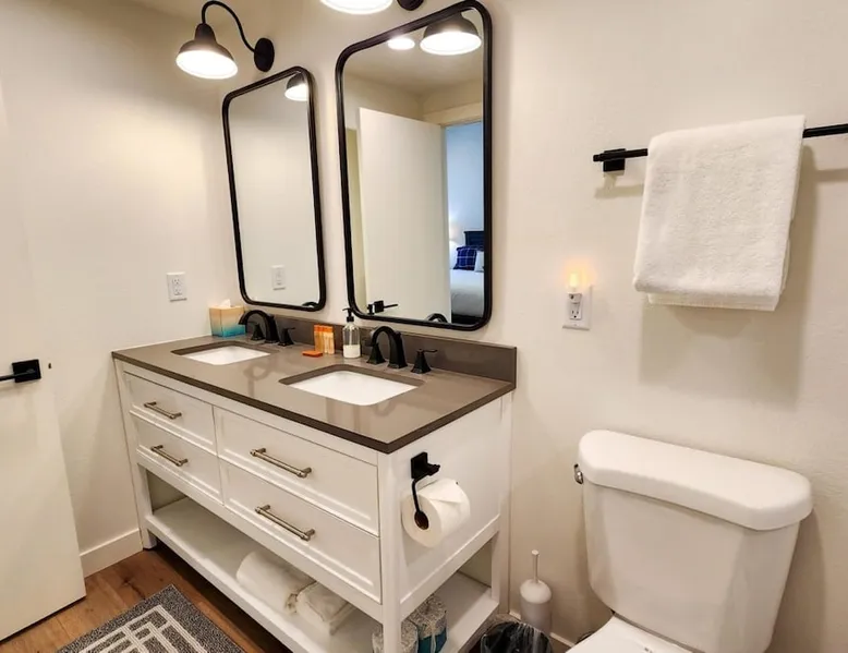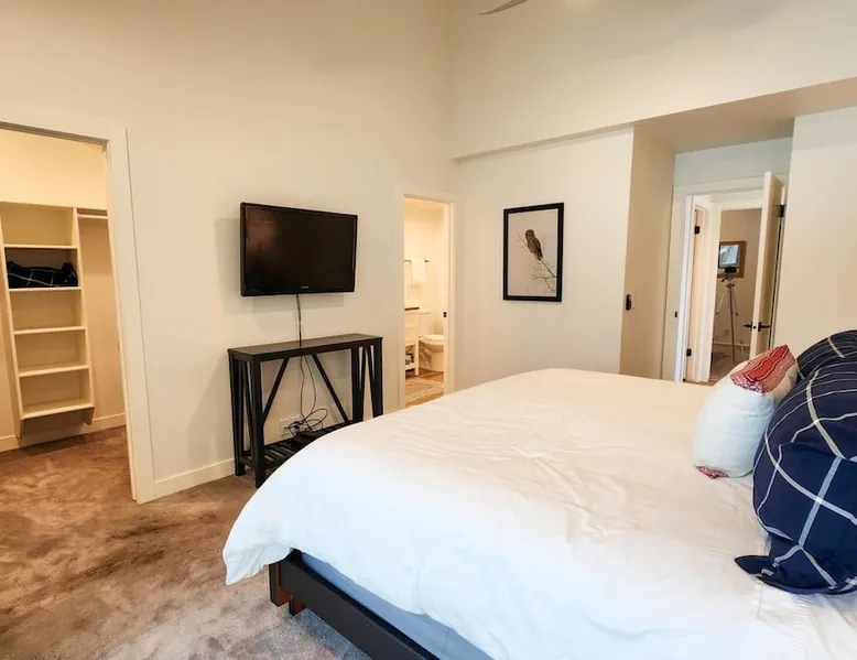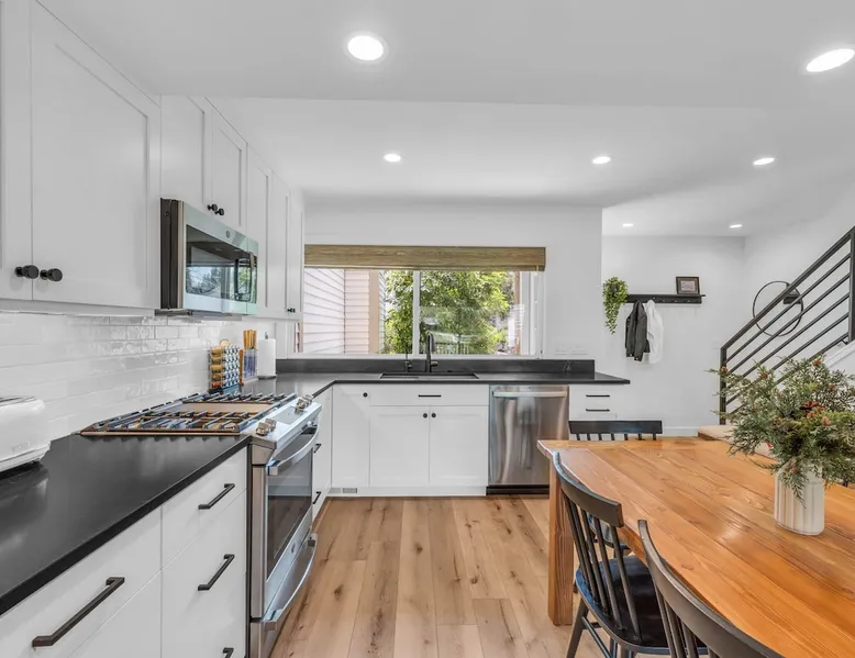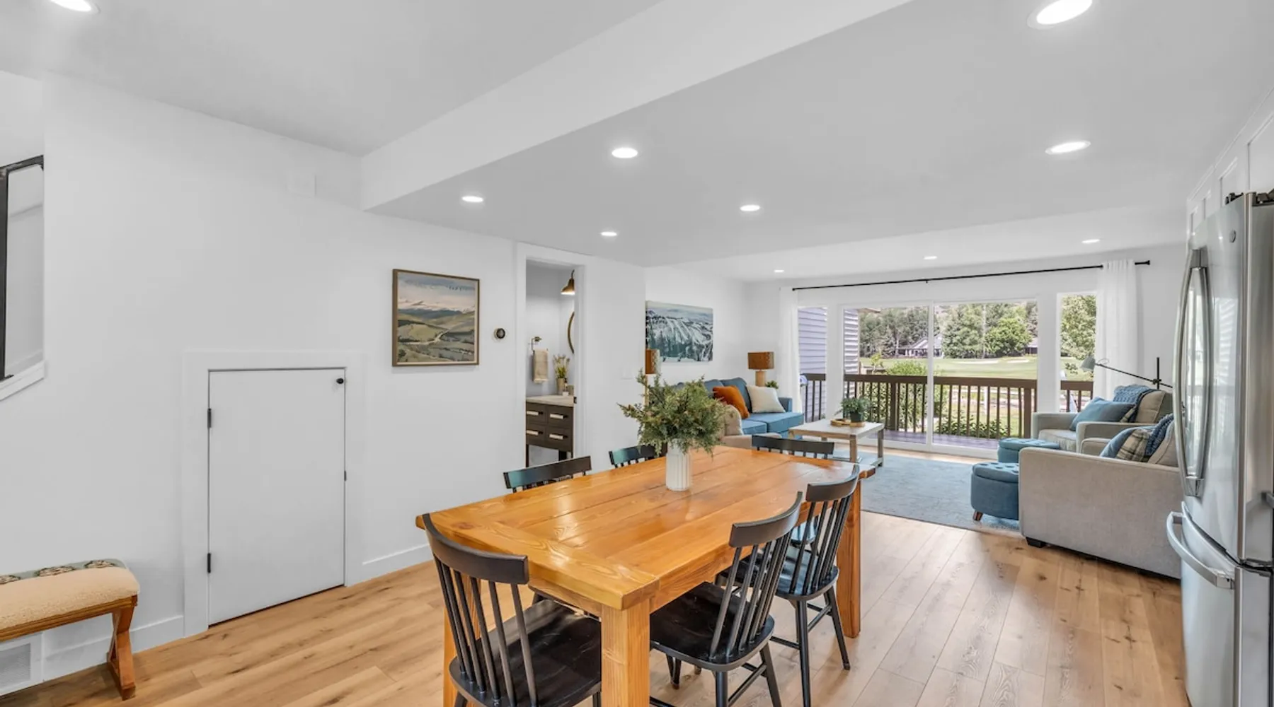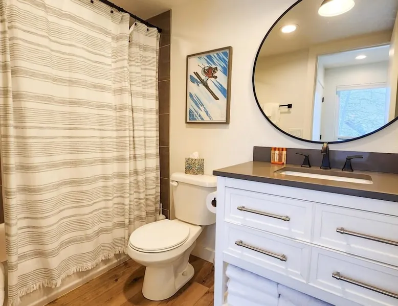 Located in the desirable Park Meadows neighborhood, this modern three-bedroom townhome places you minutes from a world-class ski resort, golf courses, hiking trails, and downtown Park City. The updated townhome is surrounded by serene nature while being only steps from the free city shuttle line at the MARC Stop. Enjoy the best of both sides in this townhome that provides a beautifully decorated quiet space to unwind in an unbeatable location near all the action! The space This beautifully decorated townhome is set up to fulfill all your needs for a comfortable and convenient stay in Park City! Guests will enter the townhome off the front porch, which overlooks a small yard and the surrounding, quiet community. Upon entering the home, take in the bright, updated space as you hang your coats on the large coat rack before making your way into the rest of the home. The ground level of the townhome is set up out with an open-concept floor plan placing the kitchen, dining, and living room all together, creating a thoughtfully designed space for your group to enjoy. Guests will first come to the kitchen, a dazzling space with white cabinets, stainless steel appliances, and a large window above the kitchen sink. The kitchen is fully equipped with everything you may need to make morning pancakes or cook up a delicious dinner. You will find it all in this well-organized space. Combined with the kitchen is the dining space, where you will find a beautiful wooden table with seating for 6. This space is flooded with natural lighting thanks to the sliding glass doors that will take you out to the patio. Just off the dining and kitchen area, a half bathroom is conveniently located for use in the common space and features a single-sink vanity with under-sink storage space and a toilet. Connected to the kitchen/dining area is the living room, a bright space with great views thanks to the sliding glass doors leading out to the patio. The living room is set up with a large couch and three comfortable couch chairs, two of which include footrests for added comfort. Throughout the space, you will also find three side tables and two lamps, as well as one large coffee table. Your group will enjoy warming up by the electric fireplace or catching a movie on the 65” smart TV in this cozy space! From the living room, head out to the private patio via the sliding glass doors and be greeted with beautiful views over the area. The patio includes four patio chairs for you to settle into as you take in the views looking out on the golf course and towards the mountains and the famous Park City hill sign. On the second level of the townhome, you will find three bedrooms, two full bathrooms, and a washing and drying machine. As you come to the top of the stairs, you arrive at an open hallway where you will find the washing and drying machine located in a closet space on the left-hand side. At the end of the hallway located between the master bedroom and first bedroom is the shared bathroom, which features a single-sink vanity, a tiled shower/bathtub combo, and ample below-sink storage space. To the left of the bathroom is the master bedroom. Enjoy a restful night of sleep on the king bed in this spacious room where you will find vaulted ceilings, a large walk-in closet, and a private terrace through a sliding glass door that provides lovely views over the golf course and backyard area. Enjoy the views while still resting in bed, watch a movie on the mounted 39” TV, or enjoy a good book with the conveniently located bedside lamps on the two nightstands. Adding to your comfort is the fully attached master bathroom boasting a modern design complete with a double-sink vanity and a large walk-in shower with a small built-in seat. Directly across from the master bedroom you will find the first guest bedroom, which includes a queen bed, a bedside table and lamp, and sliding glass doors to a balcony that overlooks the front side of the townhome. This charming room has additional touches to make you feel right at home with vaulted ceilings, well-placed decor, and blackout curtains to ensure a restful night of sleep. Additionally, located in this room is a staircase leading up to a loft area, which has been set up as a third bedroom. In this third bedroom, you will find two twin beds, one bedside table with a lamp, a 32” TV, and two closets for guest use. The two rooms offer a great space for families or groups to share while still providing separation of sleeping areas. Guest access Guests will have access to the entire home as well as two parking spots, one community space, and one space in the parking garage. Other things to note This home is located on the 6th hole of Park Meadows Country Club golf course, which is a private golf course and can only be played on with a membership. In the summer months, guests are asked to not go out onto the course located behind the house at any time. Please note, like most homes in Park City, this home does not have A/C. Parking Notes: Guests cannot park their vehicles in front of the garage door. They can be towed by the HOA at the guest's expense. Please keep in mind that if you plan to ski, you are responsible for verifying the ski resorts' opening and closing dates.