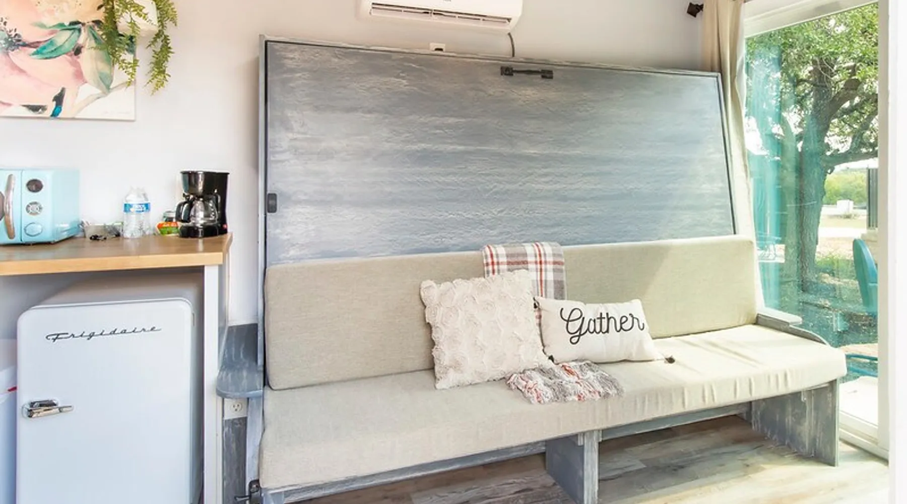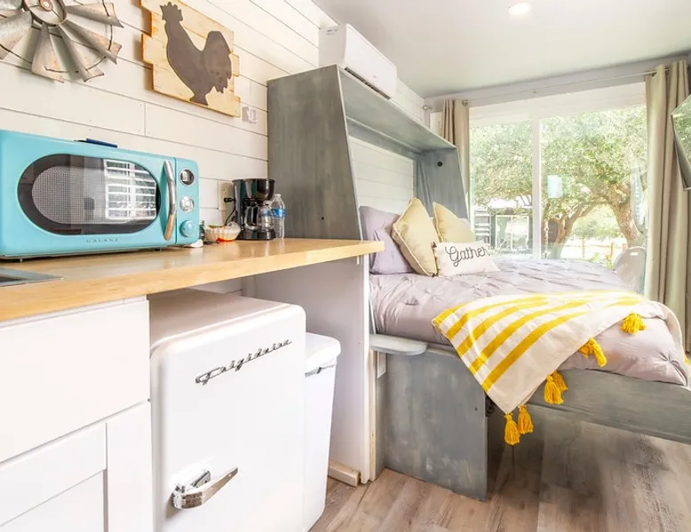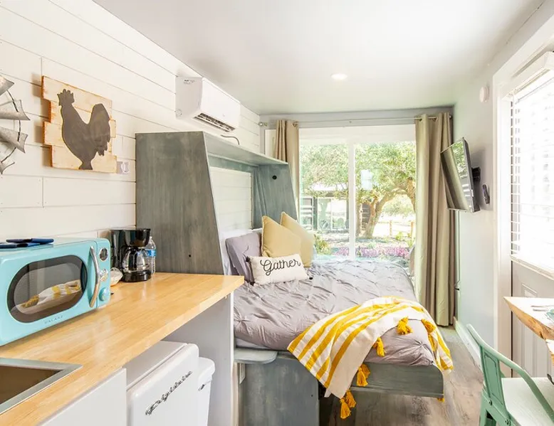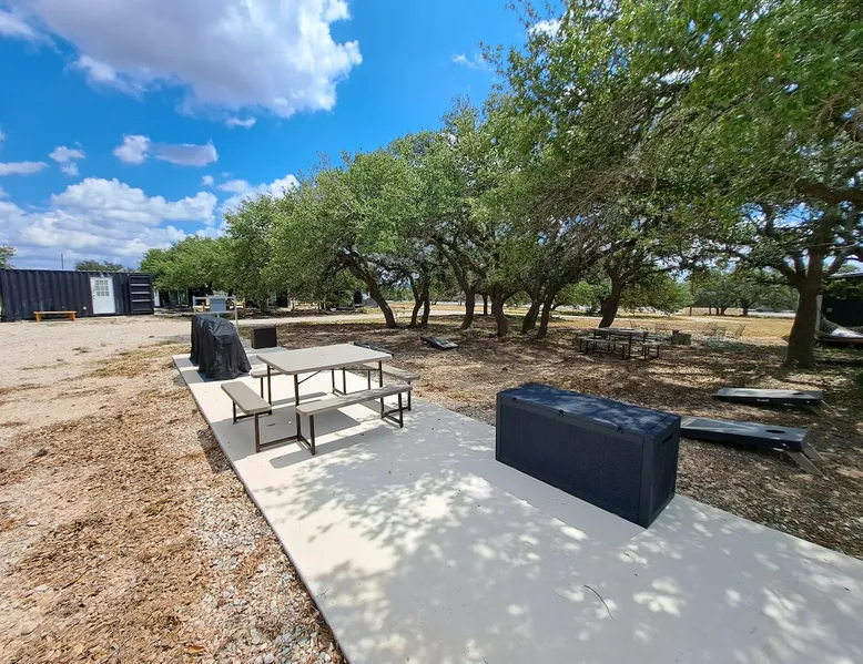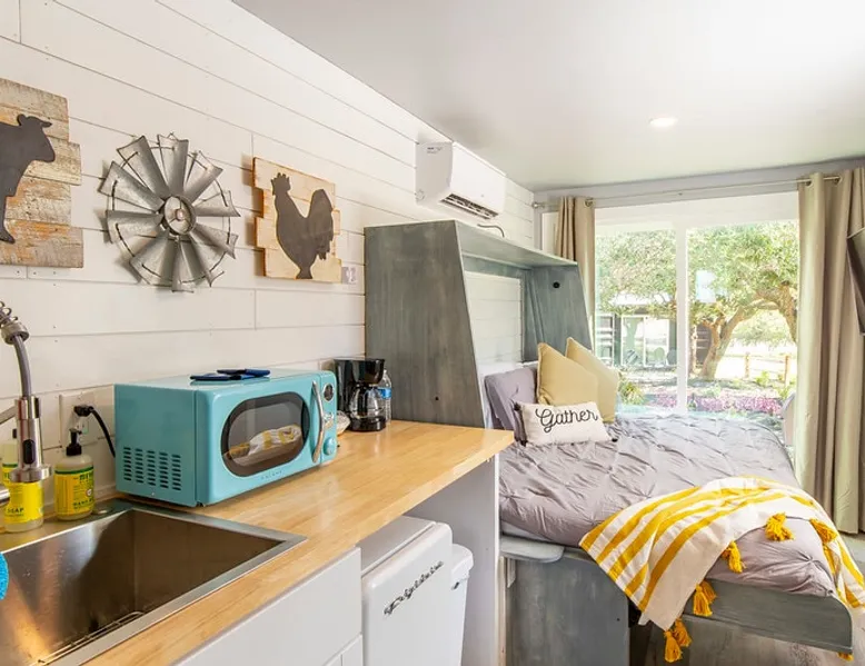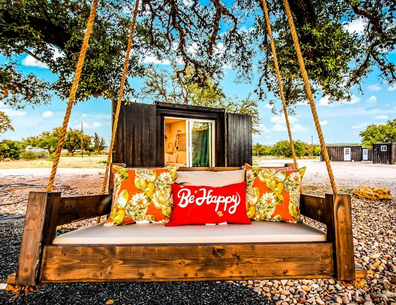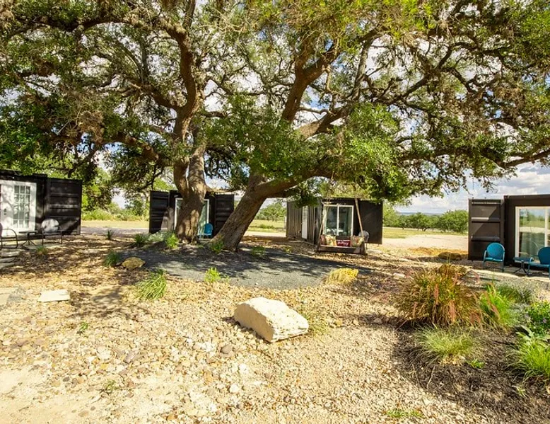 Welcome to The Container Retreat @ 290 Wine Trail! The perfect place to stay as you explore the beautiful Texas Hill Country and it's amazing wineries, parks, shops and people. We are happy to share our special getaway with you and truly hope you enjoy it as much as we do. The space This unit is a 20' shipping container that has been converted into a tiny home in the heart of the Texas Hill Country complete with a full bath with walk-in shower, kitchenette with mini fridge and microwave, dining counter and Queen-sized Murphy bed in the living room. It is a tiny home with just under 160 square feet but has everything you need for a comfortable night's sleep. The peace and tranquility is amazing and we are right in the middle of over 50 Texas Hill Country wineries. We have three within walking distance that you can begin to enjoy as you settle in: Blue Lotus Winery and Silver Dollar Winery to the east and Untamed to the west. So whether you are looking for a quick getaway or a home base while you attend one of the many festivals and events in the surrounding areas, we are the right choice. Guest access Our containers are arranged in pods of five surrounding majestic oak trees and lush landscaping with just enough ambient lighting to make it relaxing and comfortable. If you want to hang out, just walk over to the common area where you will find open space, chairs, a hammock, picnic tables, grills, giant beer pong, wooden tower game, ring games and our custom Container Retreat cornhole boards. Since we want to preserve our beautiful oak trees, we do not currently offer a fire pit. Other things to note Our mattresses were custom handmade locally from Cantwell Mattress in San Antonio. These mattresses are made in Texas with 100% All-Natural Cotton sourced in Texas. Our shampoo, conditioner and body wash are made with 100% Pure Morocco Argan Oil and are 100% Vegan & Cruelty-Free. In addition, our hand soap is made with essential oils, aloe vera, olive oil, and without parabens, phthalates or artificial colors. We have provided everything you need in our kitchenette, including a corkscrew and wine pourer to enjoy your Texas Hill Country wine. Couples getaway, check! Girls weekend, check! Bachelor or Bachelorette parties, check! Whatever the occasion, we are the right choice. We have twelve other listings that can accommodate up to thirty two. Photos are representative of Containers Two - Eight and décor may vary, but the layout is the same. If you need to book larger parties, we have a total of ten 20' containers available that can accommodate up to 20 adults.