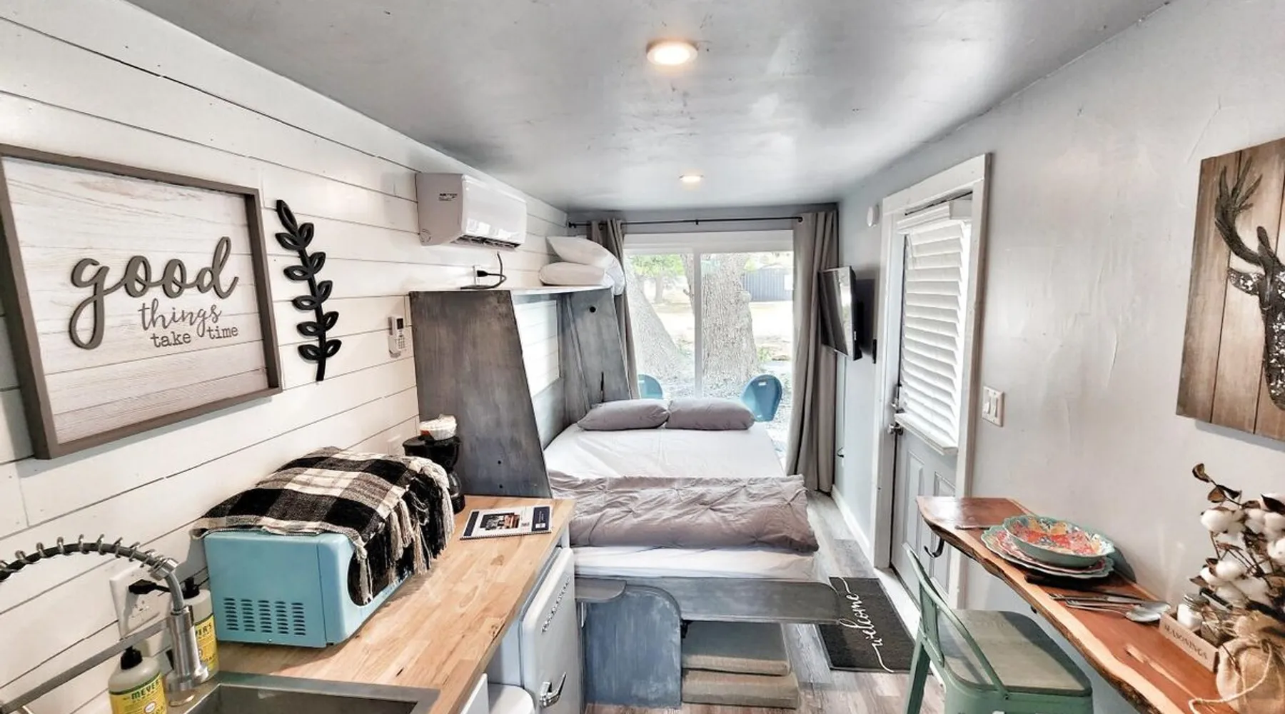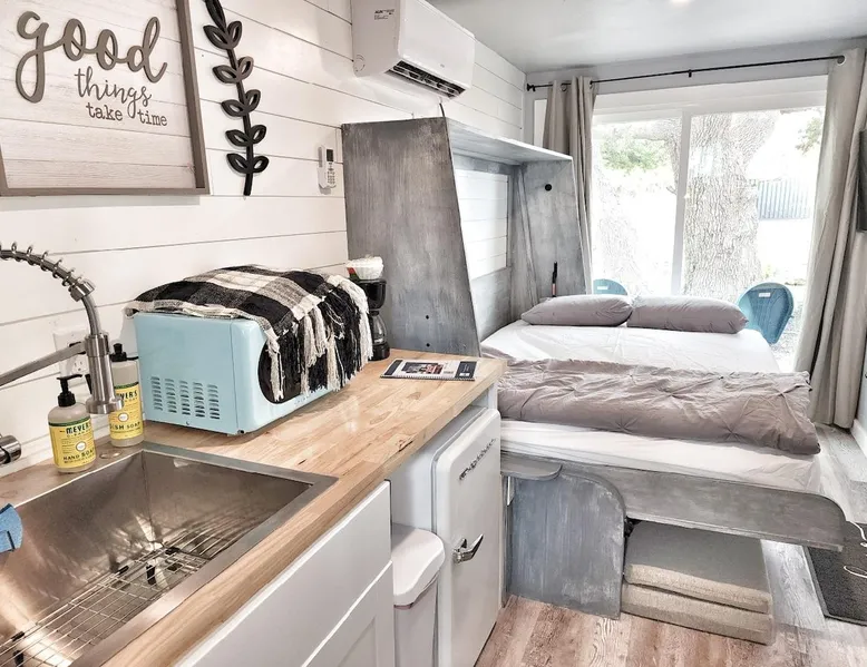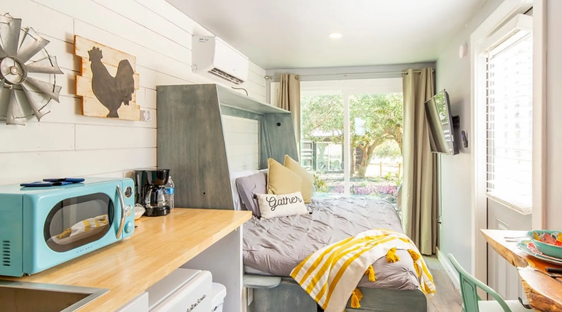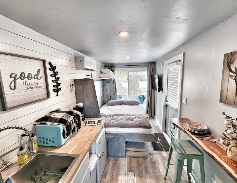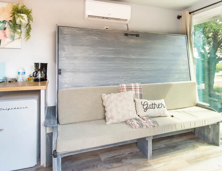 Welcome to The Container Retreat @ 290 Wine Trail! The perfect place to stay as you explore the beautiful Texas Hill Country and it's amazing wineries, parks, shops and people. We are happy to share our special getaway with you and truly hope you enjoy it as much as we do. The space This unit is a 20' shipping container that has been converted into a tiny home in the heart of the Texas Hill Country complete with a full bath with walk-in shower, kitchenette with mini fridge and microwave, dining counter and Queen-sized Murphy bed in the living room. It is a tiny home with just under 160 square feet but has everything you need for a comfortable night's sleep. The peace and tranquility is amazing and we are right in the middle of over 50 Texas Hill Country wineries. We have three within walking distance that you can begin to enjoy as you settle in: Blue Lotus Winery and Silver Dollar Winery to the east and Untamed to the west. So whether you are looking for a quick getaway or a home base while you attend one of the many festivals and events in the surrounding areas, we are the right choice. Guest access Our containers are arranged in pods of five surrounding majestic oak trees and lush landscaping with just enough ambient lighting to make it relaxing and comfortable. If you want to hang out, just walk over to the common area where you will find open space, chairs, a hammock, picnic tables, grills, giant beer pong, wooden tower game, ring games and our custom Container Retreat cornhole boards. Since we want to preserve our beautiful oak trees, we do not currently offer a fire pit. Other things to note Our mattresses were custom handmade locally from Cantwell Mattress in San Antonio. These mattresses are made in Texas with 100% All-Natural Cotton sourced in Texas. Our shampoo, conditioner and body wash are made with 100% Pure Morocco Argan Oil and are 100% Vegan & Cruelty-Free. In addition, our hand soap is made with essential oils, aloe vera, olive oil, and without parabens, phthalates or artificial colors. We have provided everything you need in our kitchenette, including a corkscrew and wine pourer to enjoy your Texas Hill Country wine. Couples getaway, check! Girls weekend, check! Bachelor or Bachelorette parties, check! Whatever the occasion, we are the right choice. We have twelve other listings that can accommodate up to thirty two. Photos are representative of Containers Two - Eight and décor may vary, but the layout is the same. If you need to book larger parties, we have a total of ten 20' containers available that can accommodate up to 20 adults.