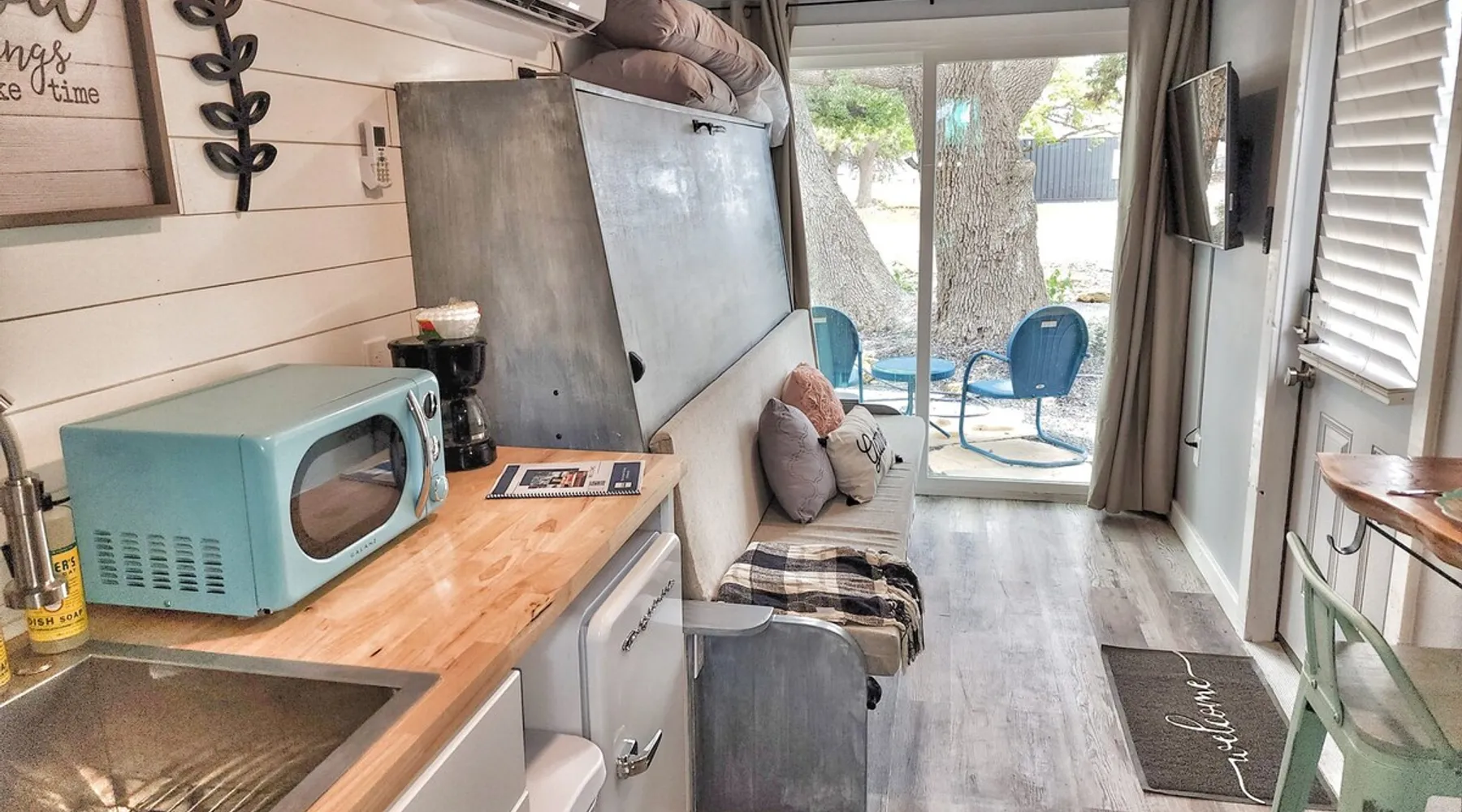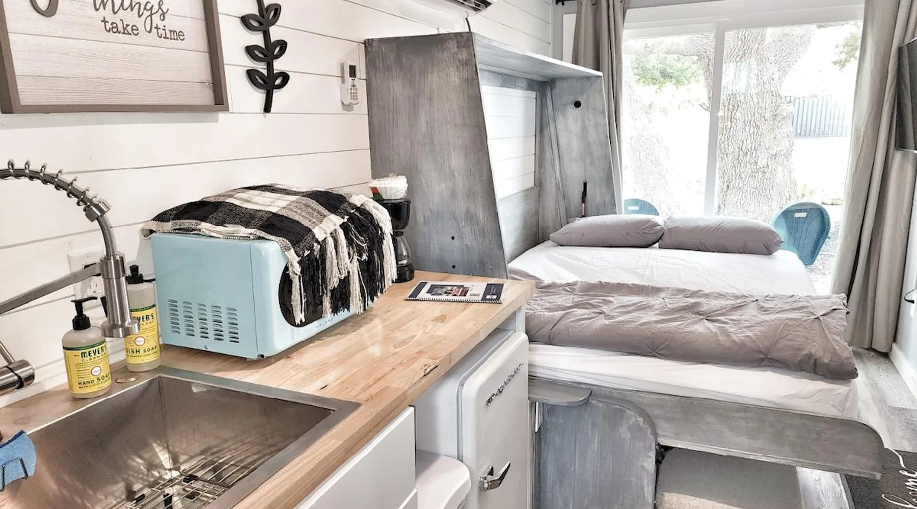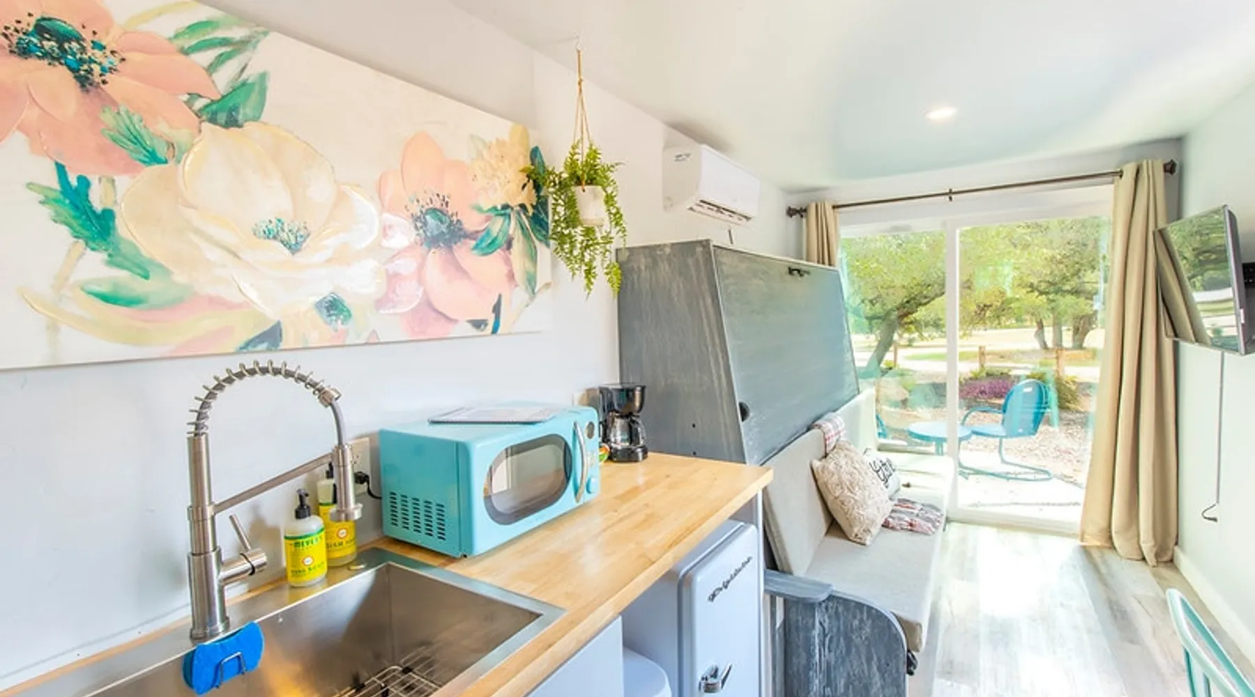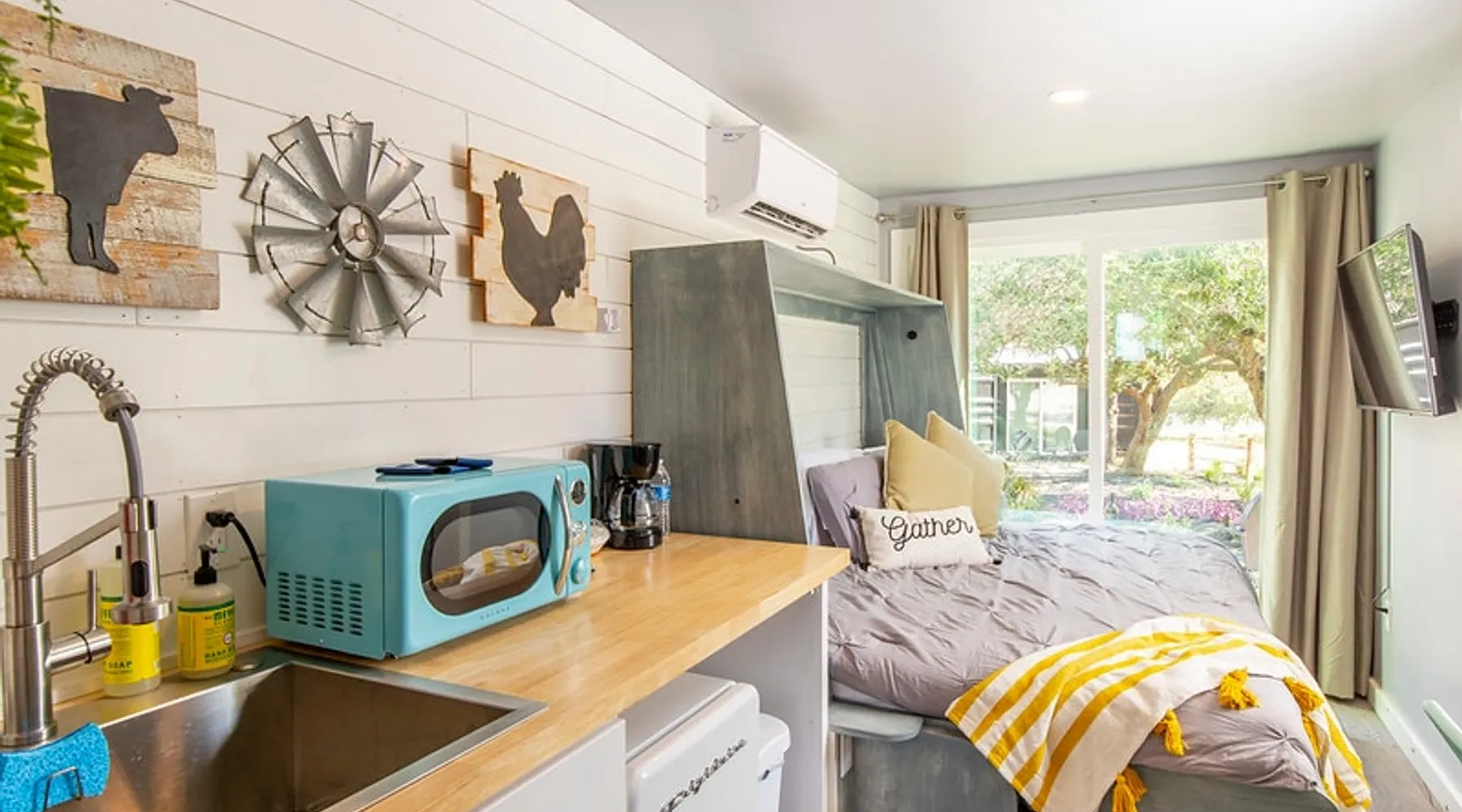 Welcome to The Container Retreat @ 290 Wine Trail! The perfect place to stay as you explore the beautiful Texas Hill Country and it's amazing wineries, parks, shops and people. We are happy to share our special getaway with you and truly hope you enjoy it as much as we do. The space This unit is a 20' shipping container that has been converted into a tiny home in the heart of the Texas Hill Country complete with a full bath with walk-in shower, kitchenette with mini fridge and microwave, dining counter and Queen-sized Murphy bed in the living room. It is a tiny home with just under 160 square feet but has everything you need for a comfortable night's sleep. The peace and tranquility is amazing and we are right in the middle of over 50 Texas Hill Country wineries. We have three within walking distance that you can begin to enjoy as you settle in: Blue Lotus Winery and Silver Dollar Winery to the east and Untamed to the west. So whether you are looking for a quick getaway or a home base while you attend one of the many festivals and events in the surrounding areas, we are the right choice. Guest access Our containers are arranged in pods of five surrounding majestic oak trees and lush landscaping with just enough ambient lighting to make it relaxing and comfortable. If you want to hang out, just walk over to the common area where you will find open space, chairs, a hammock, picnic tables, grills, giant beer pong, wooden tower game, ring games and our custom Container Retreat cornhole boards. Since we want to preserve our beautiful oak trees, we do not currently offer a fire pit. Other things to note Our mattresses were custom handmade locally from Cantwell Mattress in San Antonio. These mattresses are made in Texas with 100% All-Natural Cotton sourced in Texas. Our shampoo, conditioner and body wash are made with 100% Pure Morocco Argan Oil and are 100% Vegan & Cruelty-Free. In addition, our hand soap is made with essential oils, aloe vera, olive oil, and without parabens, phthalates or artificial colors. We have provided everything you need in our kitchenette, including a corkscrew and wine pourer to enjoy your Texas Hill Country wine. Couples getaway, check! Girls weekend, check! Bachelor or Bachelorette parties, check! Whatever the occasion, we are the right choice. We have twelve other listings that can accommodate up to thirty two. Photos are representative of Containers Two - Eight and décor may vary, but the layout is the same. If you need to book larger parties, we have a total of ten 20' containers available that can accommodate up to 20 adults.